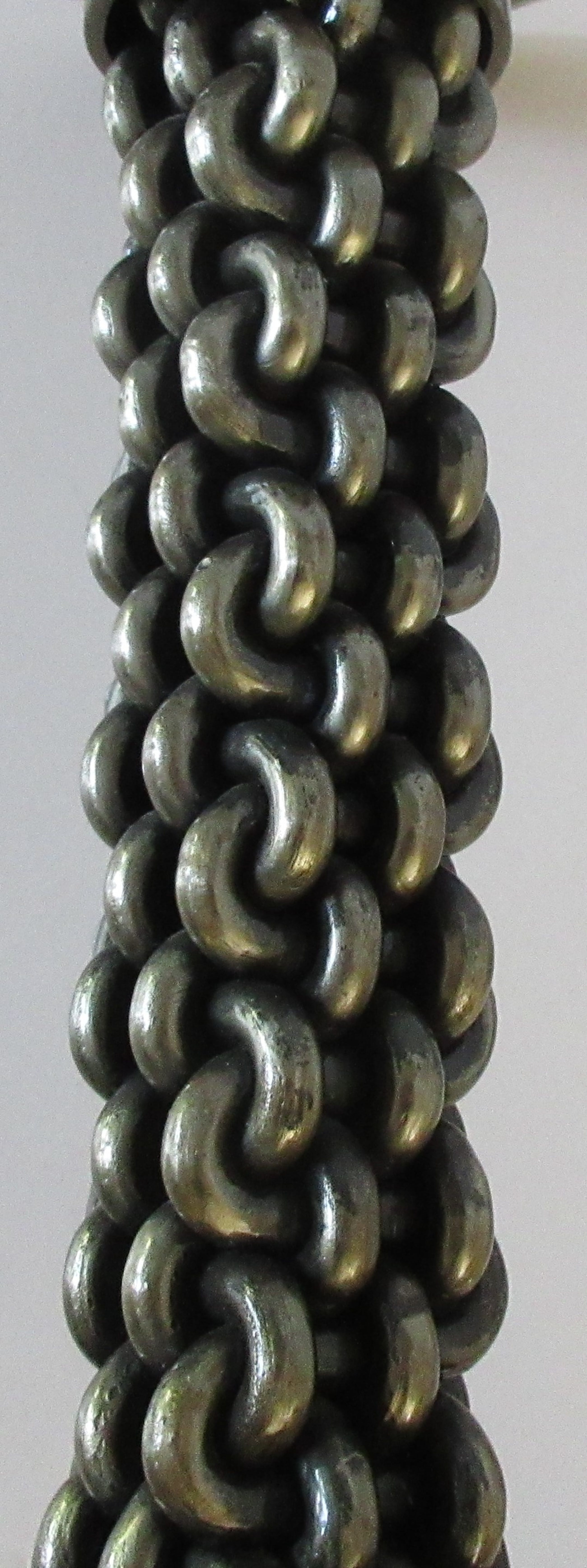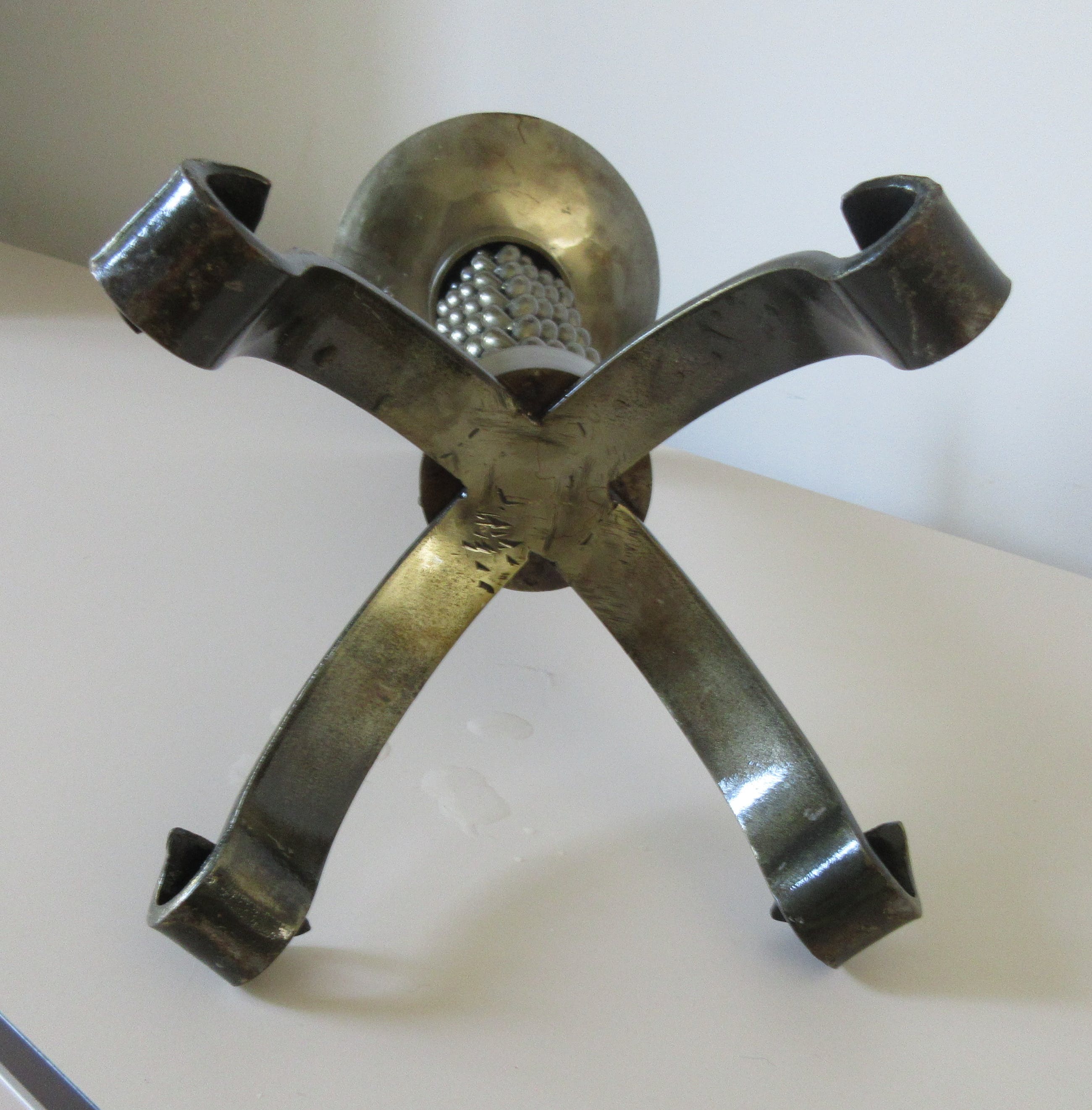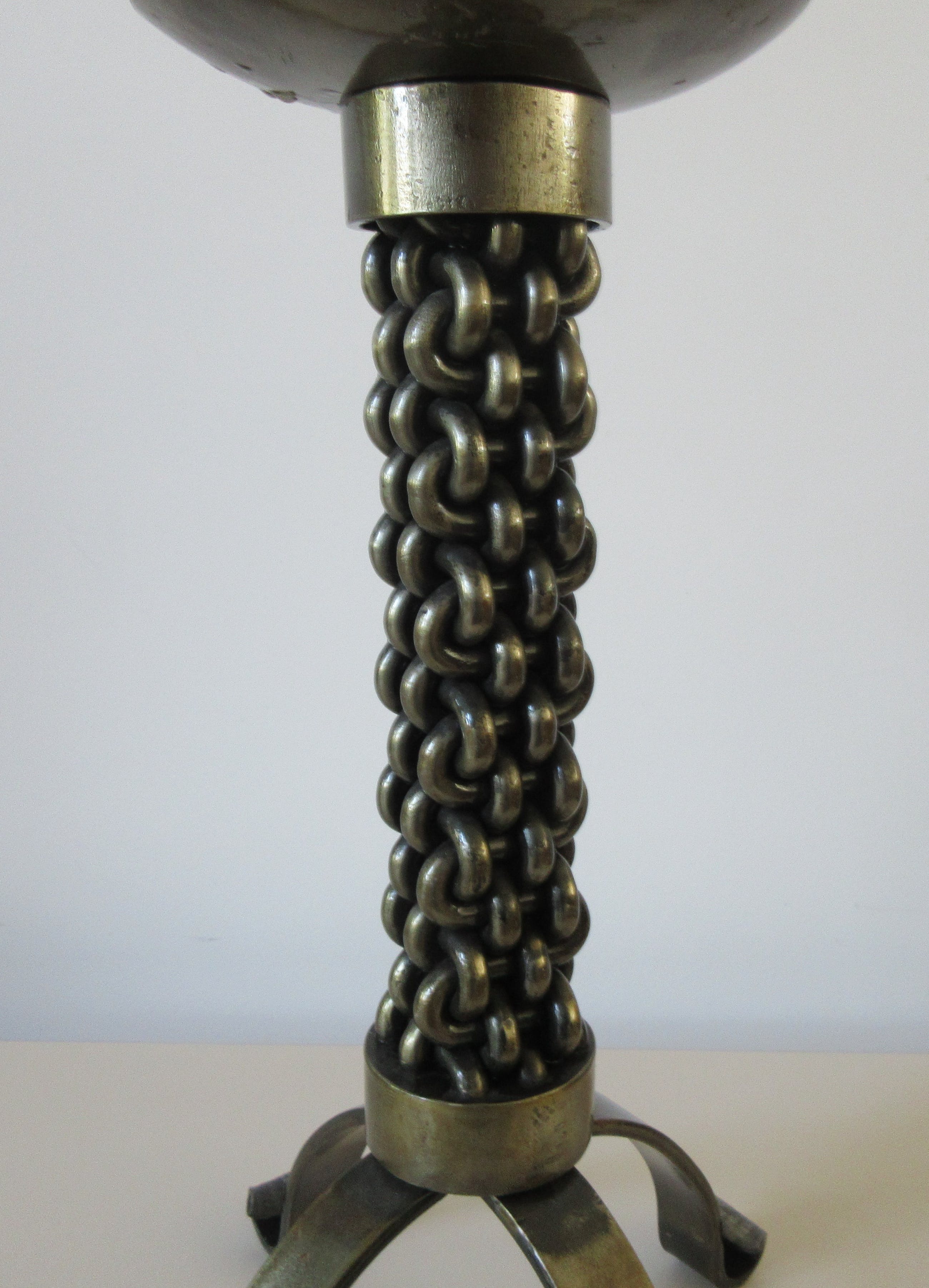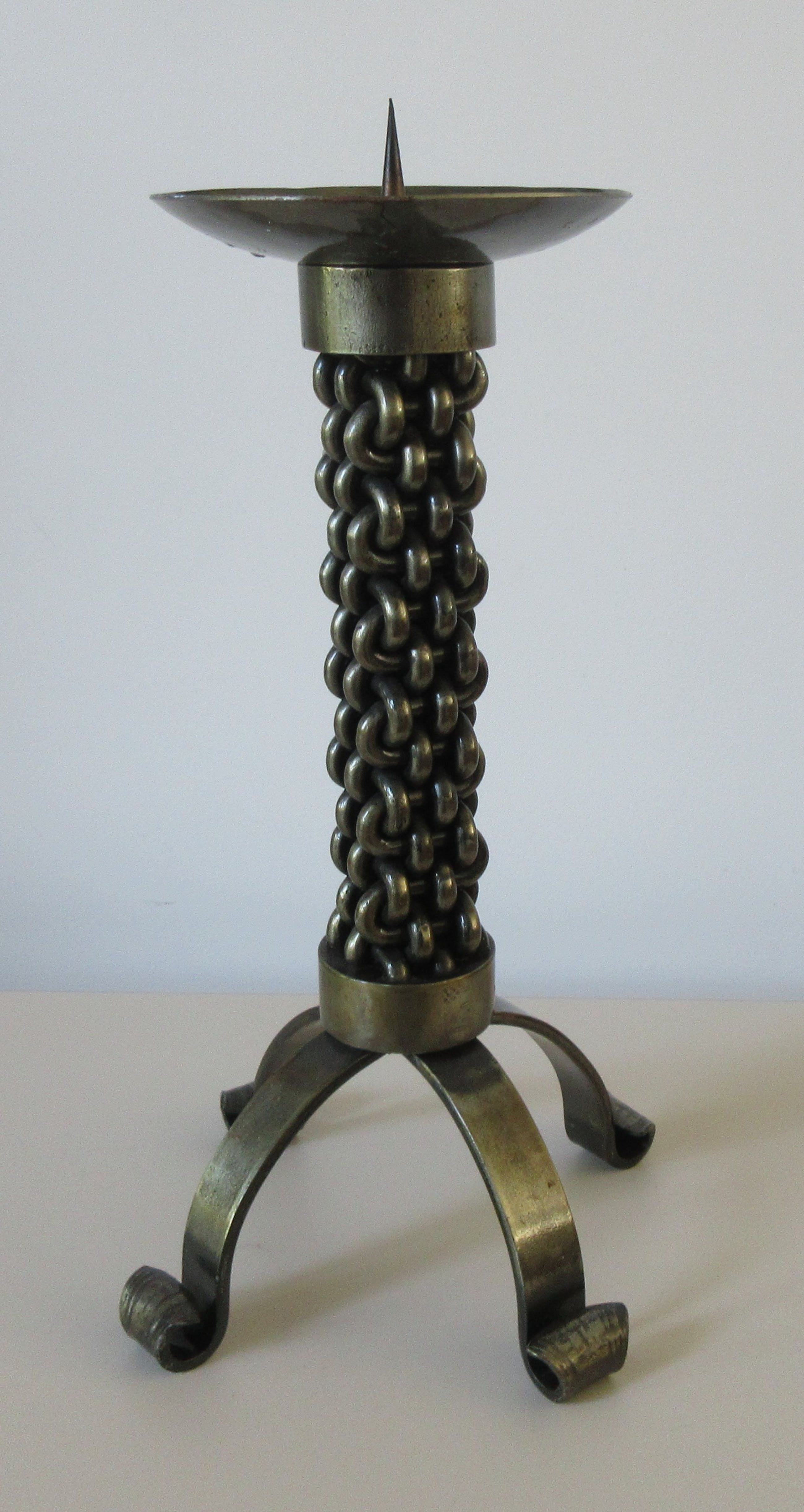 Handgemaakte metalen Brutalistische puntkandelaar waarvan het middenstuk gevlochten metalen kettingen zijn. In zeer geode gebruikte conditie, alleen het deel waar de kaars op wordt gezet heeft wat gebruikskrasjes en een klein roestplekje. Niet gemerkt of gesigneerd, maar in Nederland vervaardigd.