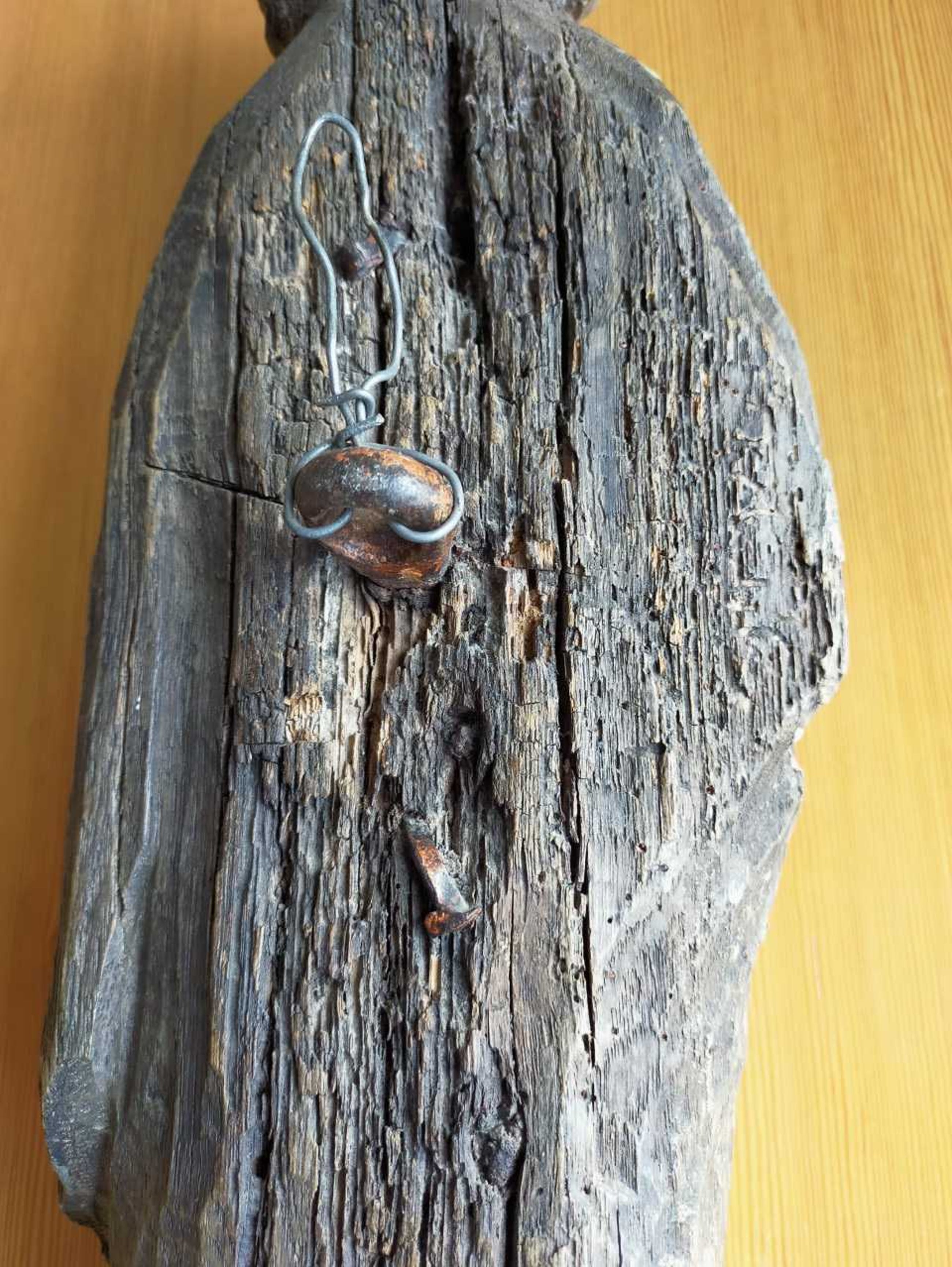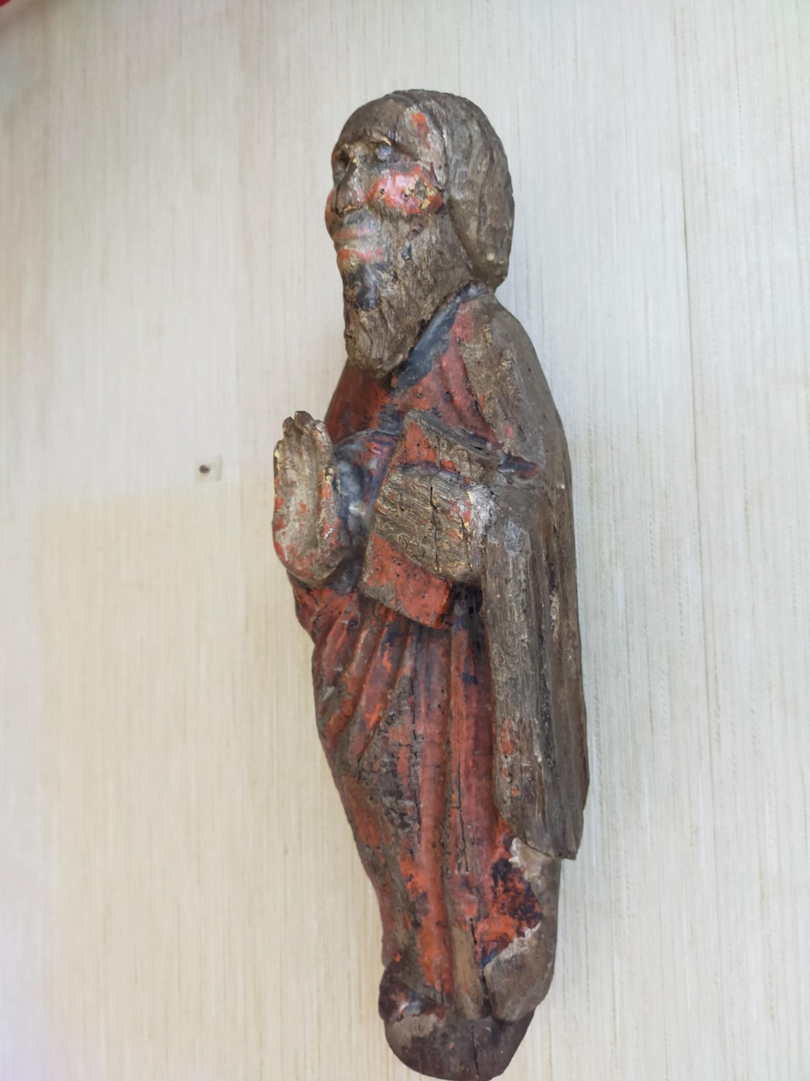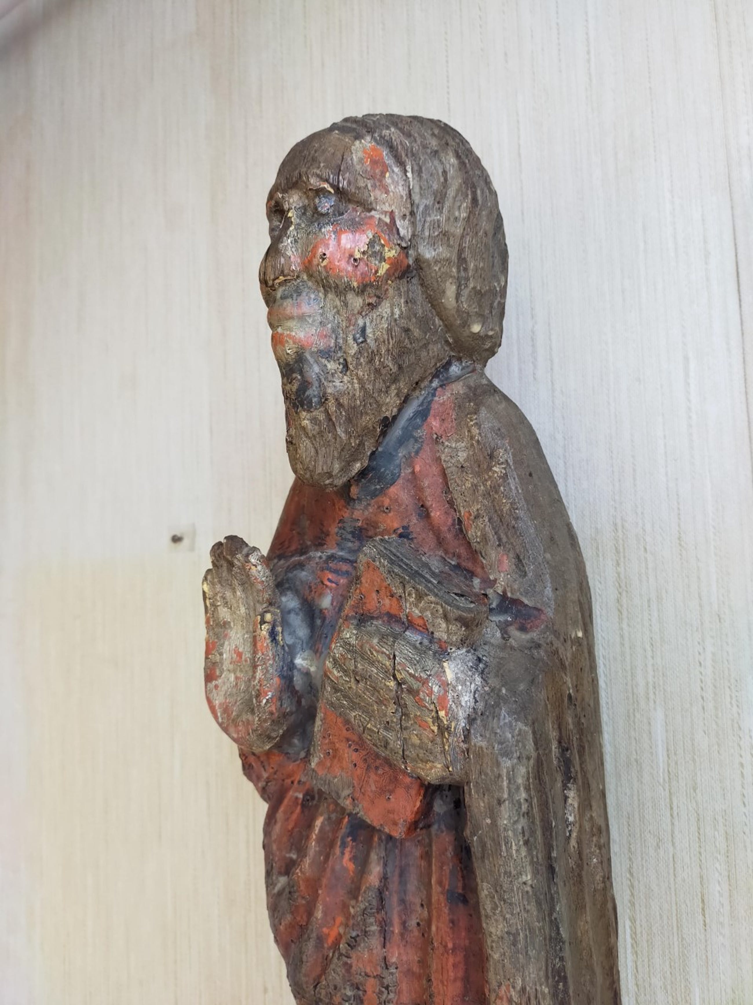 Onbekende heiligenfiguur, eikenhout met restant beschildering - wormgaten, maar stabiel en solide. Fraai en aantrekkelijk primitief stuk..