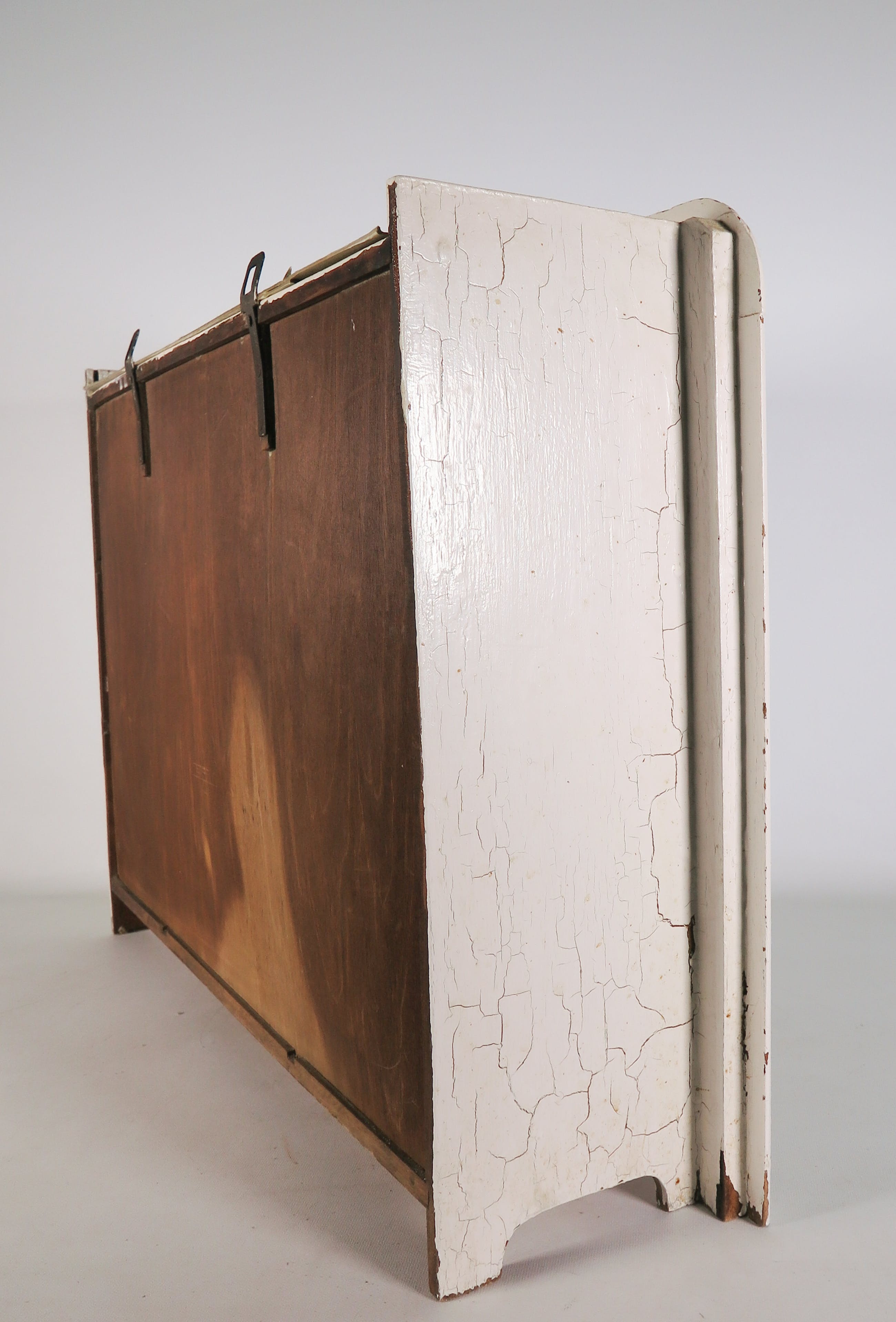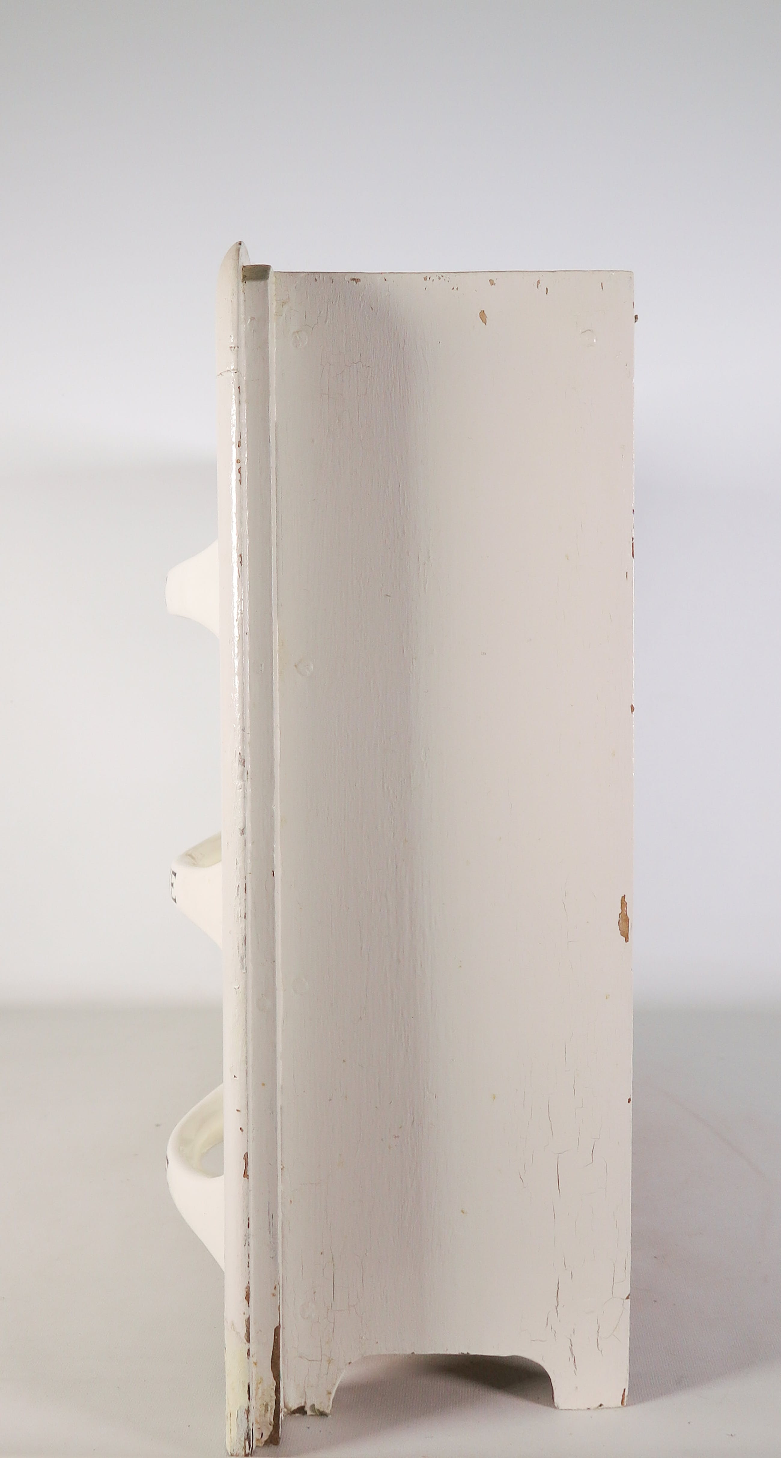 | Goede maar gebruikte staat. Het verf is gebarsten/geschilderd en het kastje is wat vuil. De lades zijn vrijwel allemaal in zeer goede staat, op wat craquelé/haarlijntjes in het glazuur na. De suiker-lade heeft een barst in de hoek rechtsboven en het peper-laatje heeft ook wat verkleuring aan de binnenzijde. | |