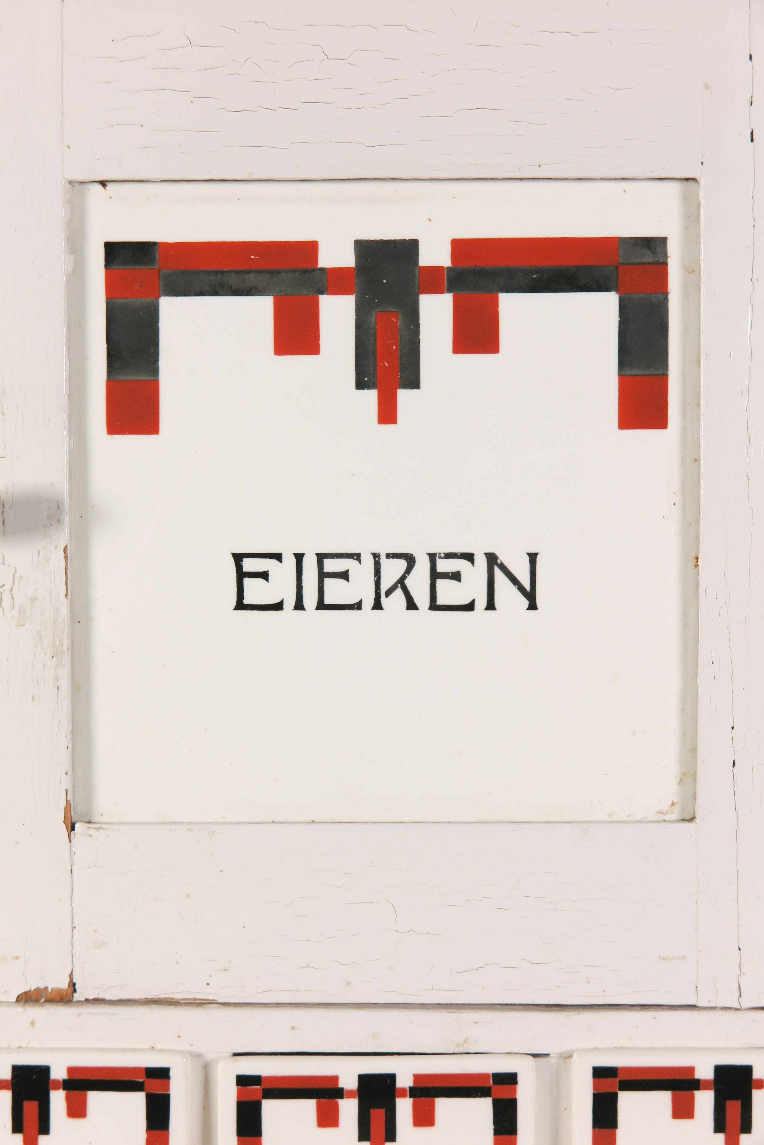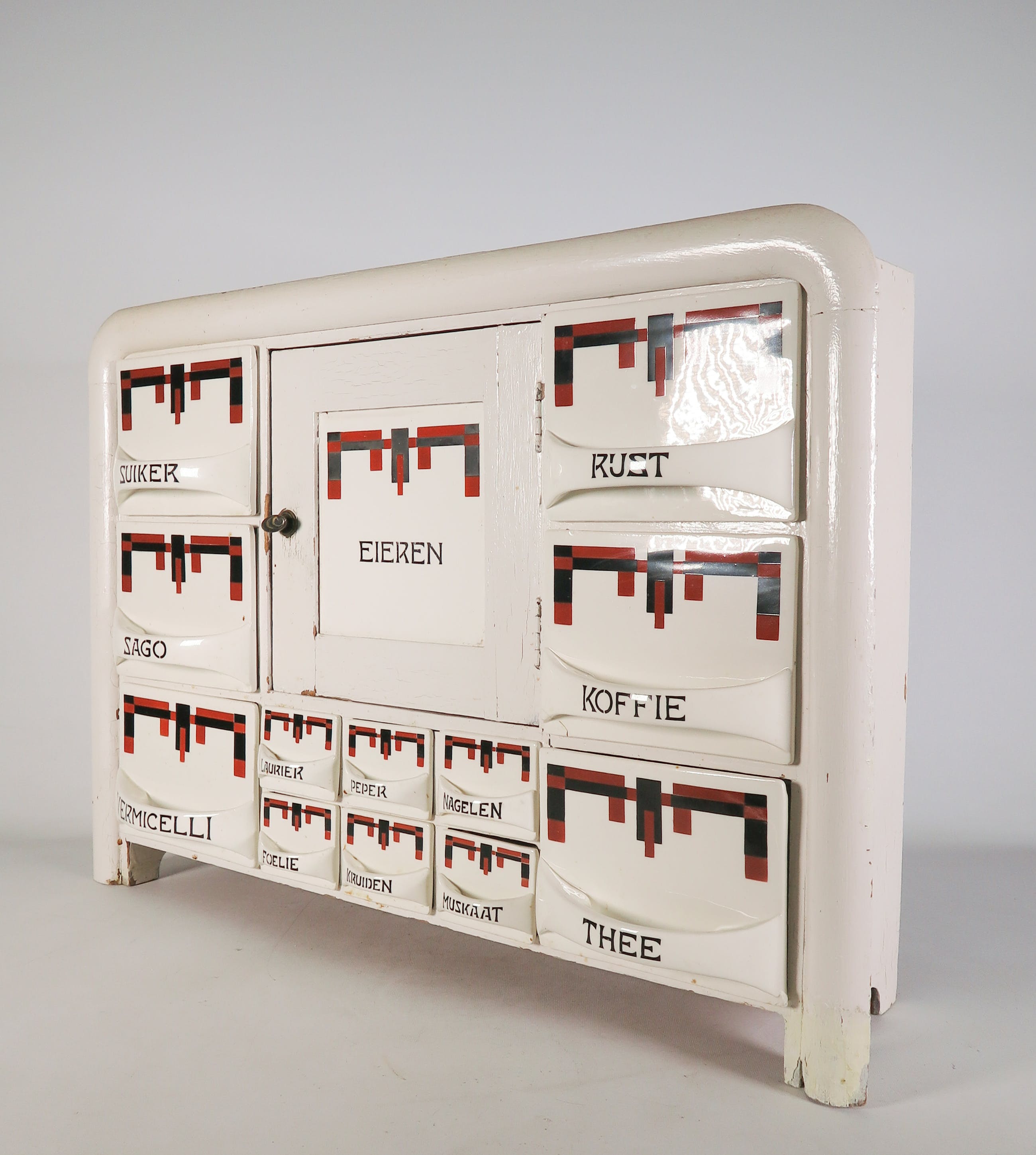 Nederlands kruiden/keukenkastje met 12 porseleinen lades voor specerijen en een vakje voor eieren met inzet voor 16 eieren.