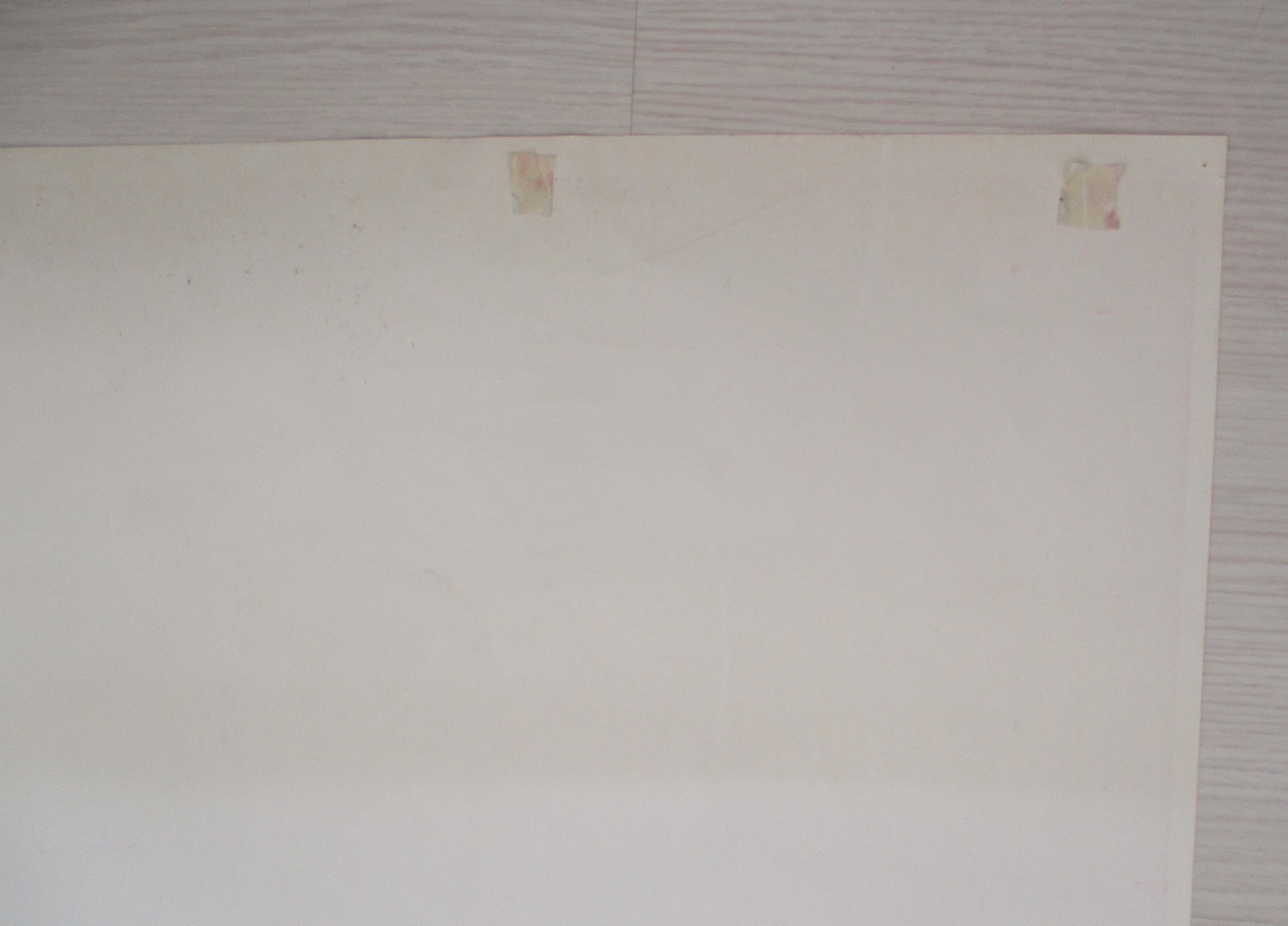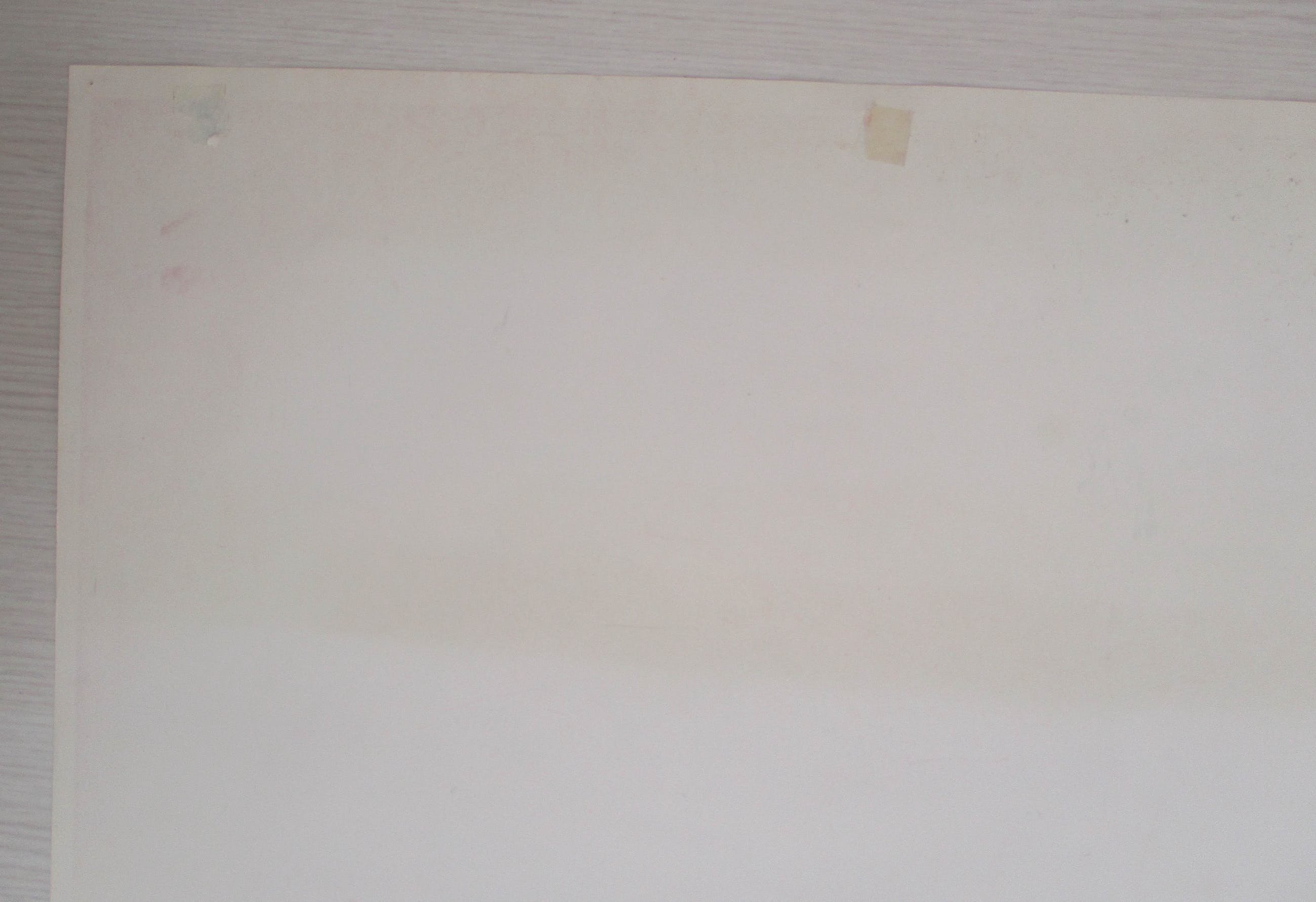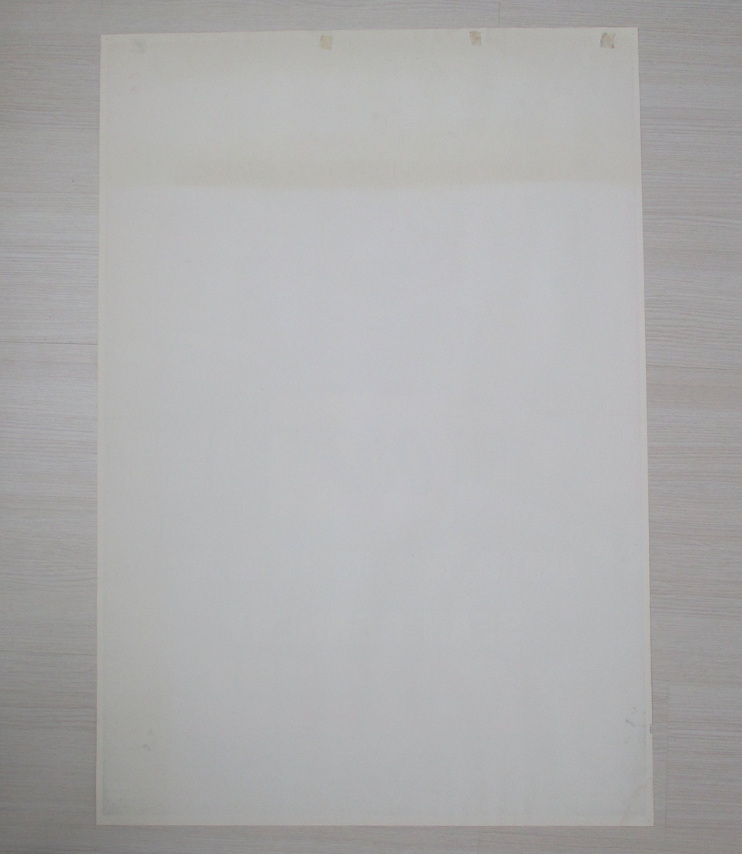 Goed tot zeer goed gezien de leeftijd van de poster. Lichte verkleuring. Kleine beschadiging aan de linkerzijde van 1 cm (in de marge). Enkele kleine krasjes in de afbeelding. Punaise gaatjes in de hoeken. Plakband restjes achter op de poster.