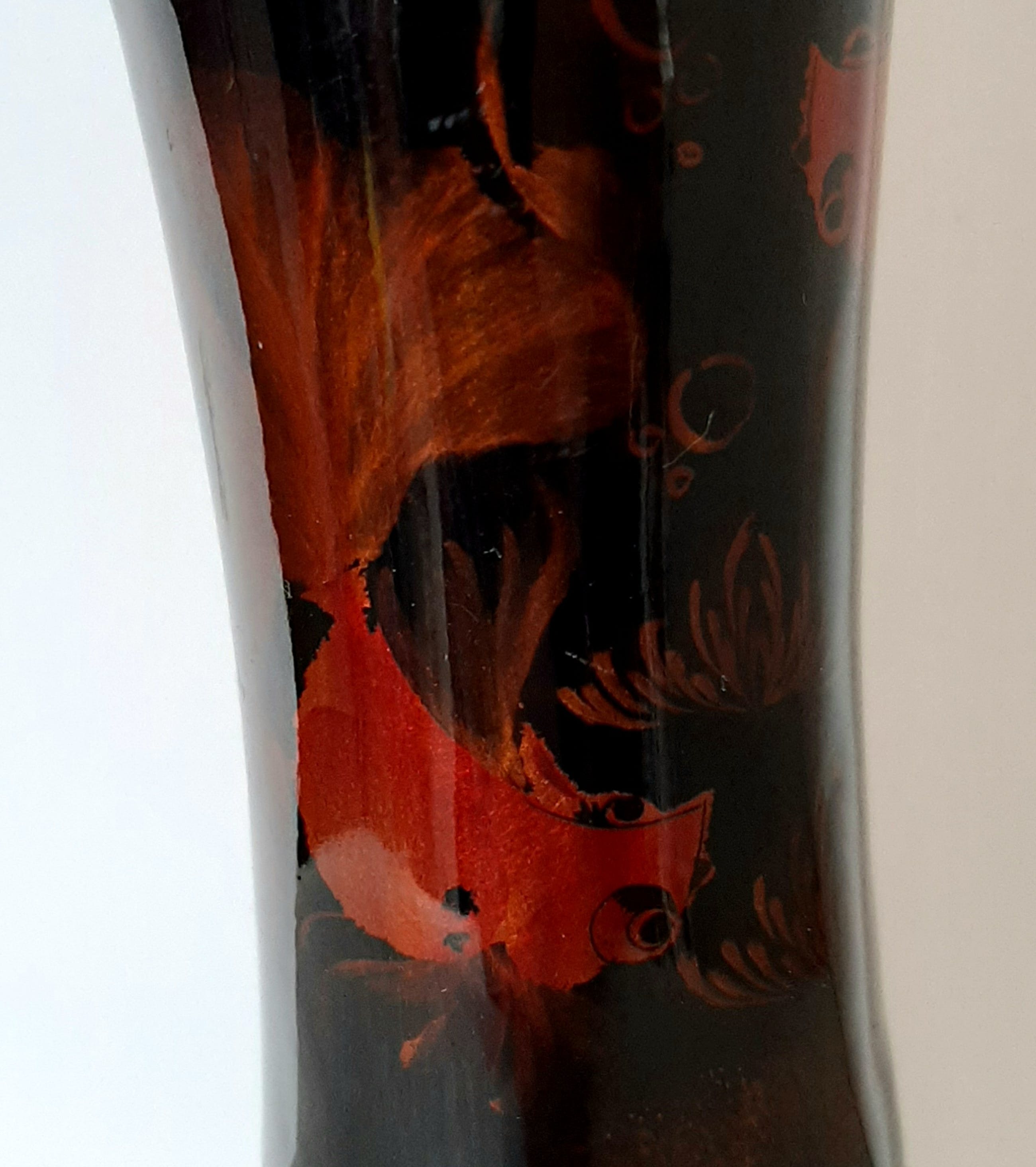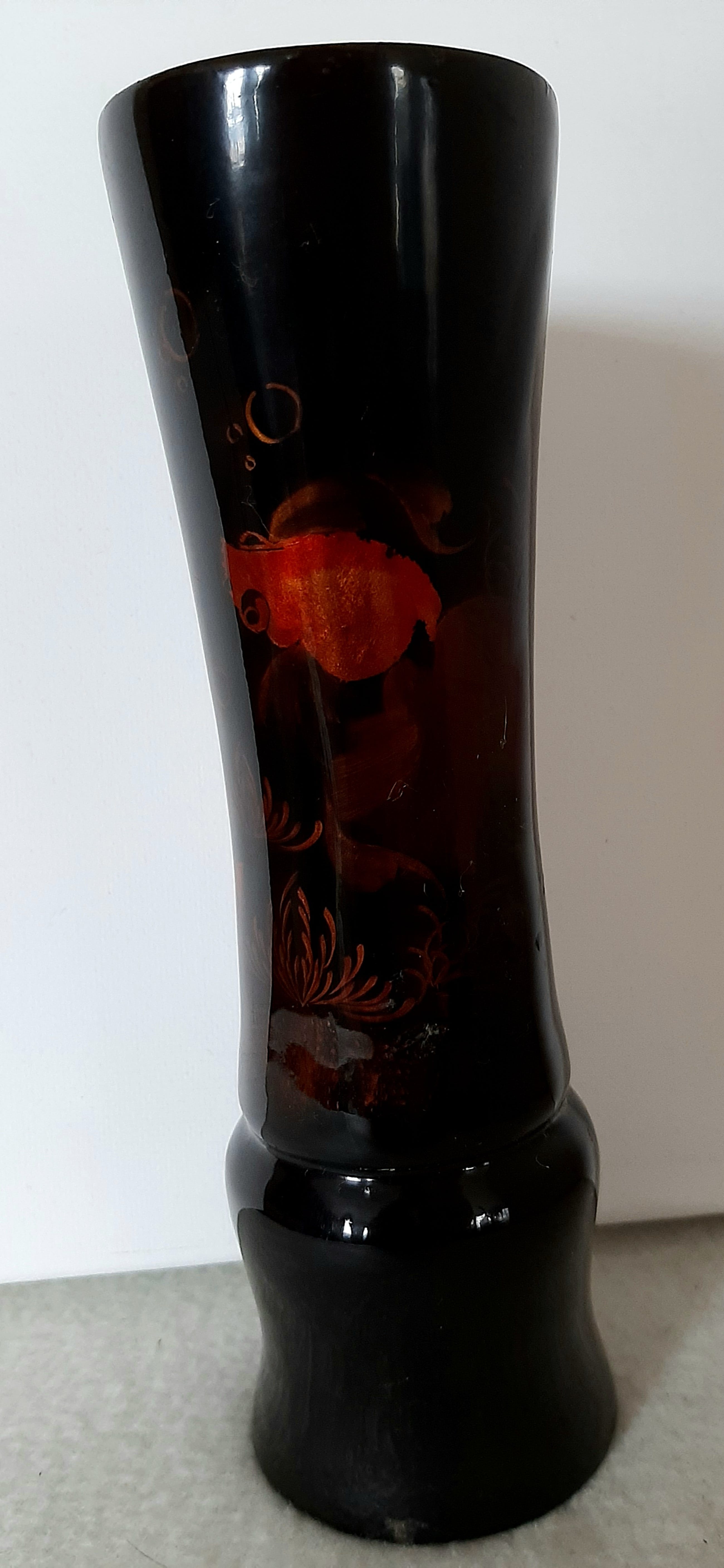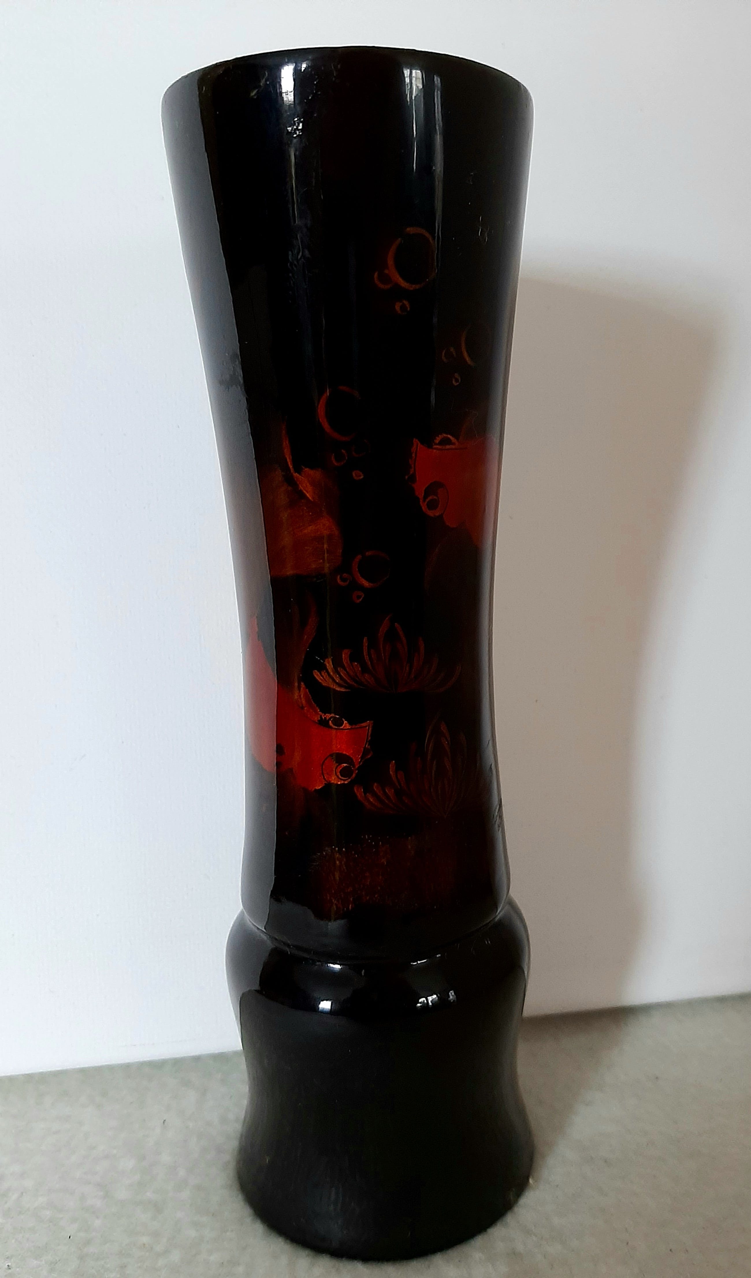 Prachtige vaas gemaakt van hout,handgeschildeerd met goudvissen. Komt uit Japan.