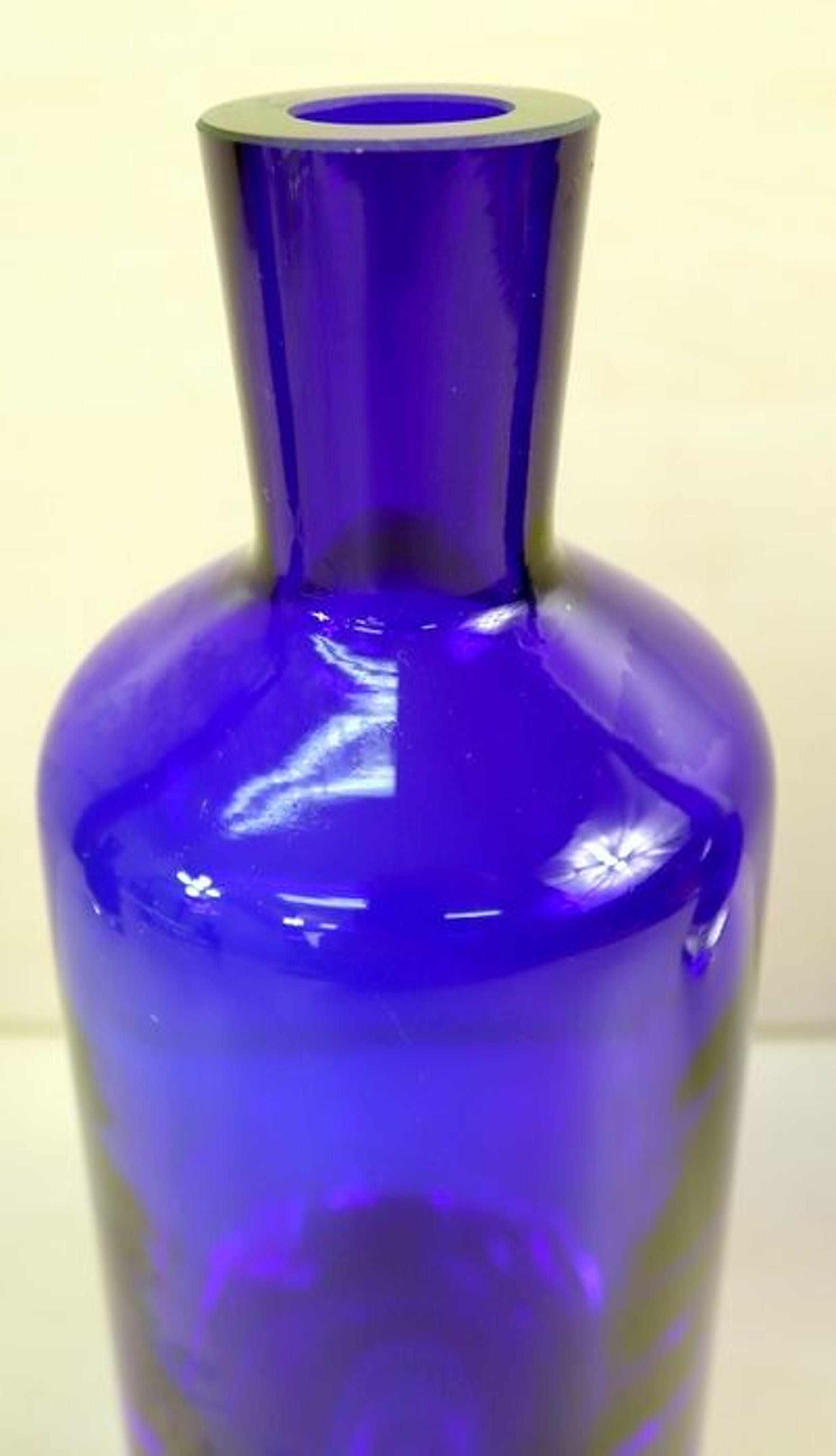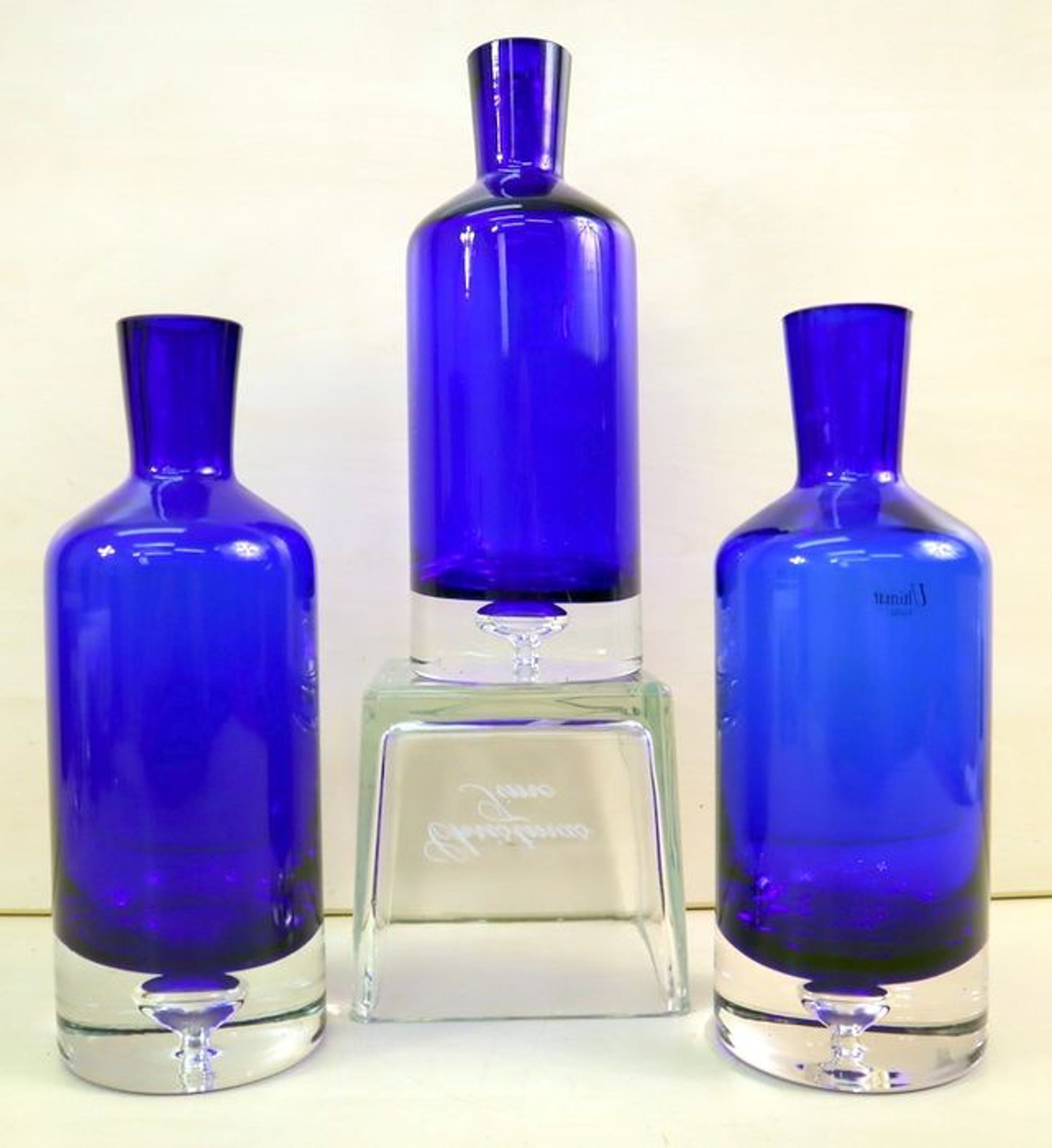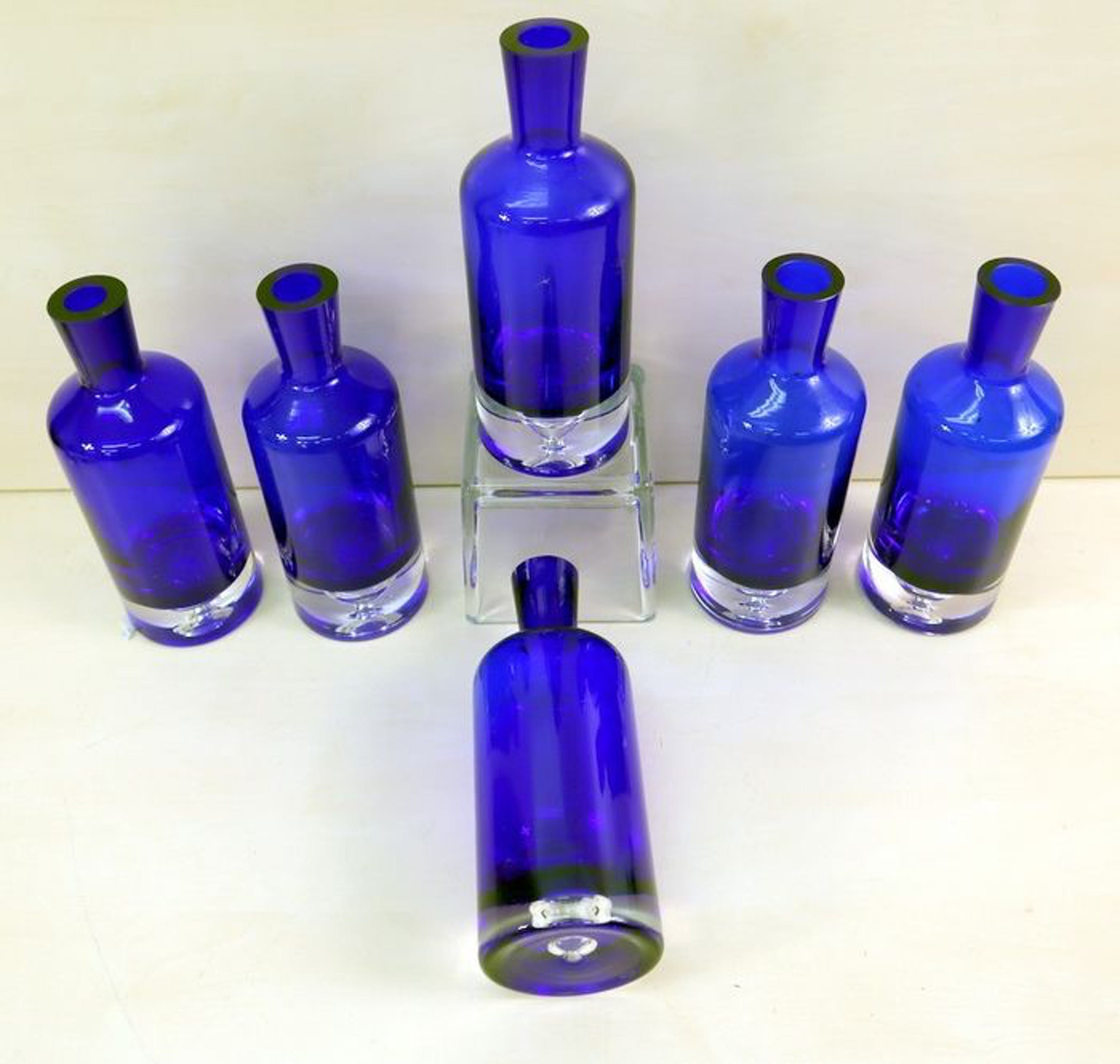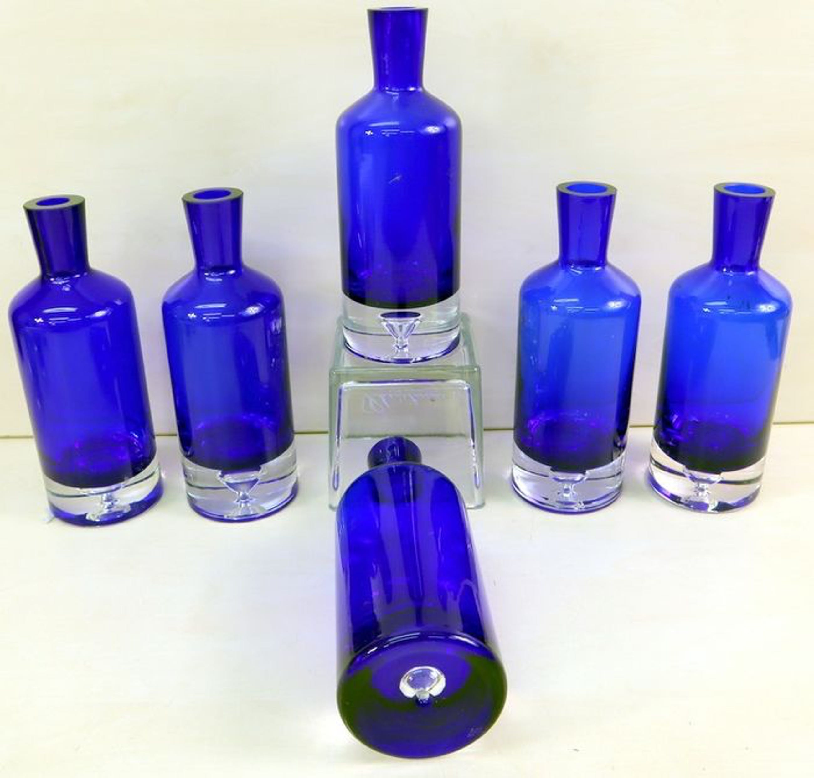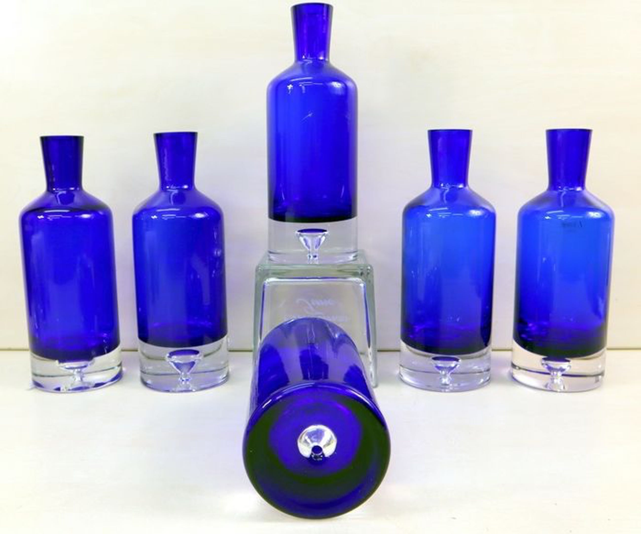 Zes decoratieve kobalt blauwe karaffen Heldere voet met een luchtbel in de bodem. Uitstekende kwaliteit zonder schade of gebreken. Geen dop Inhoud : 70cl.