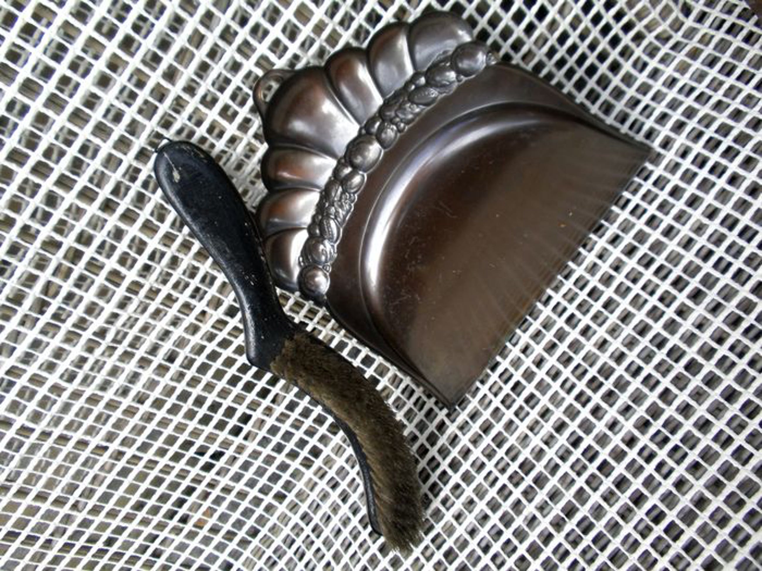 Het betreft hier een latoen koperen spiegel en een kleine koperen stoffer en blik.