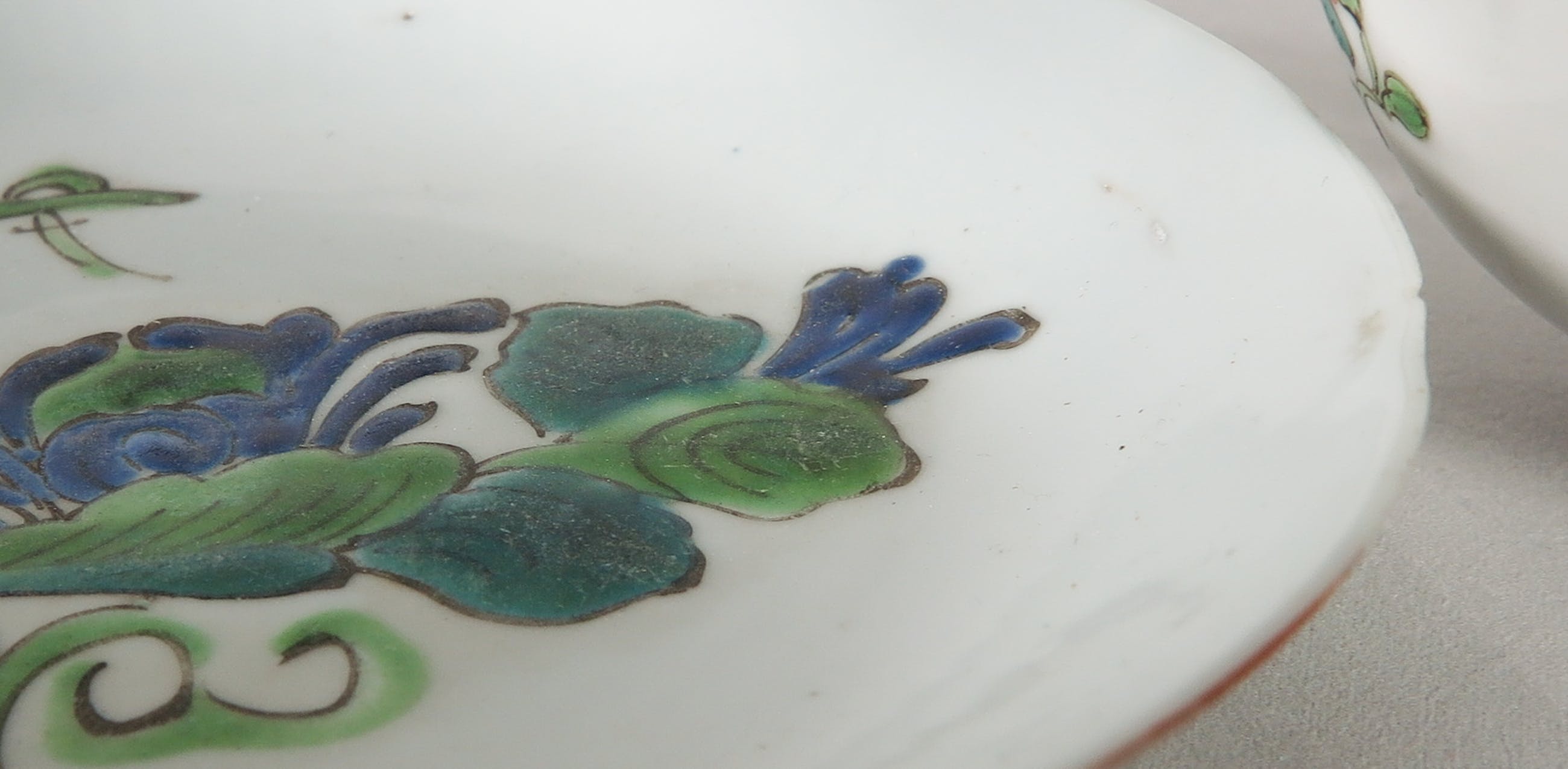 | Goede staat, met duidelijke gebruikssporen. Hier en daar een scherfje van de rand en meerdere krasjes/slijtplekjes in het decor. | |||||||||||