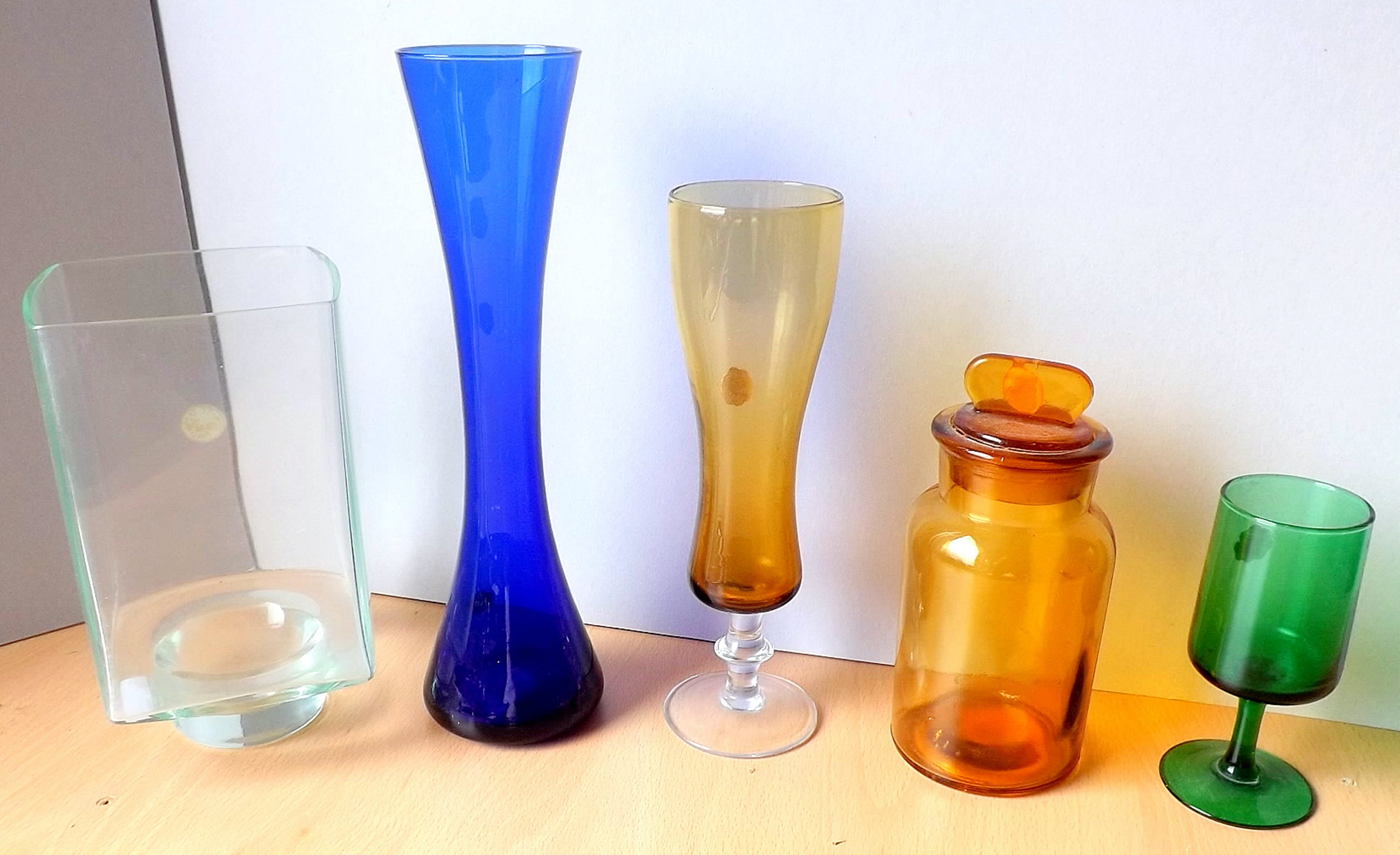 De 5 aangeboden glas-objecten verkeren in goede conditie; geen chips;