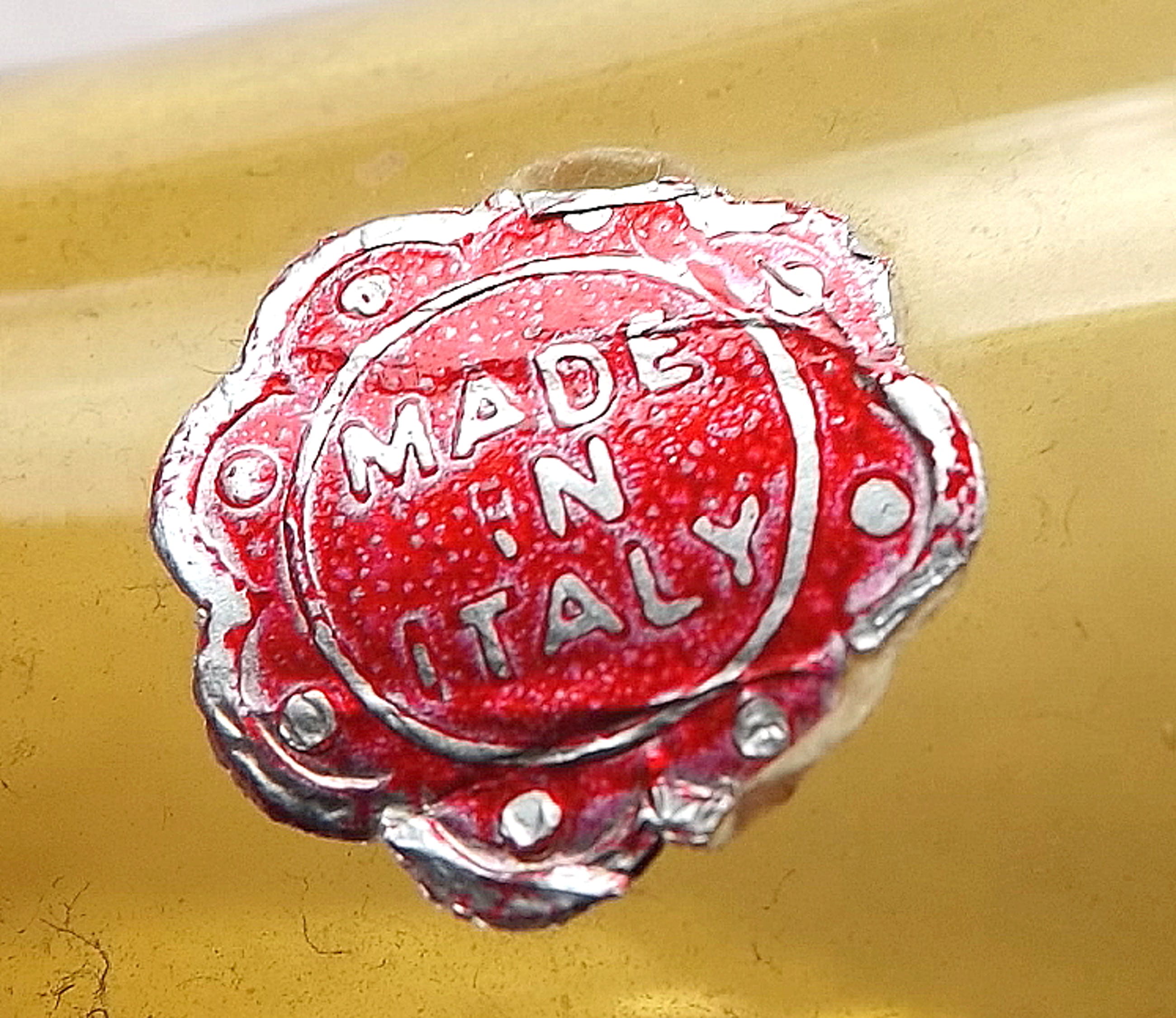 De 5 aangeboden objecten zijn voorzien van een label. Het windlicht heeft een specifiek Murano label, de anderen een zgn. "Italy" label.