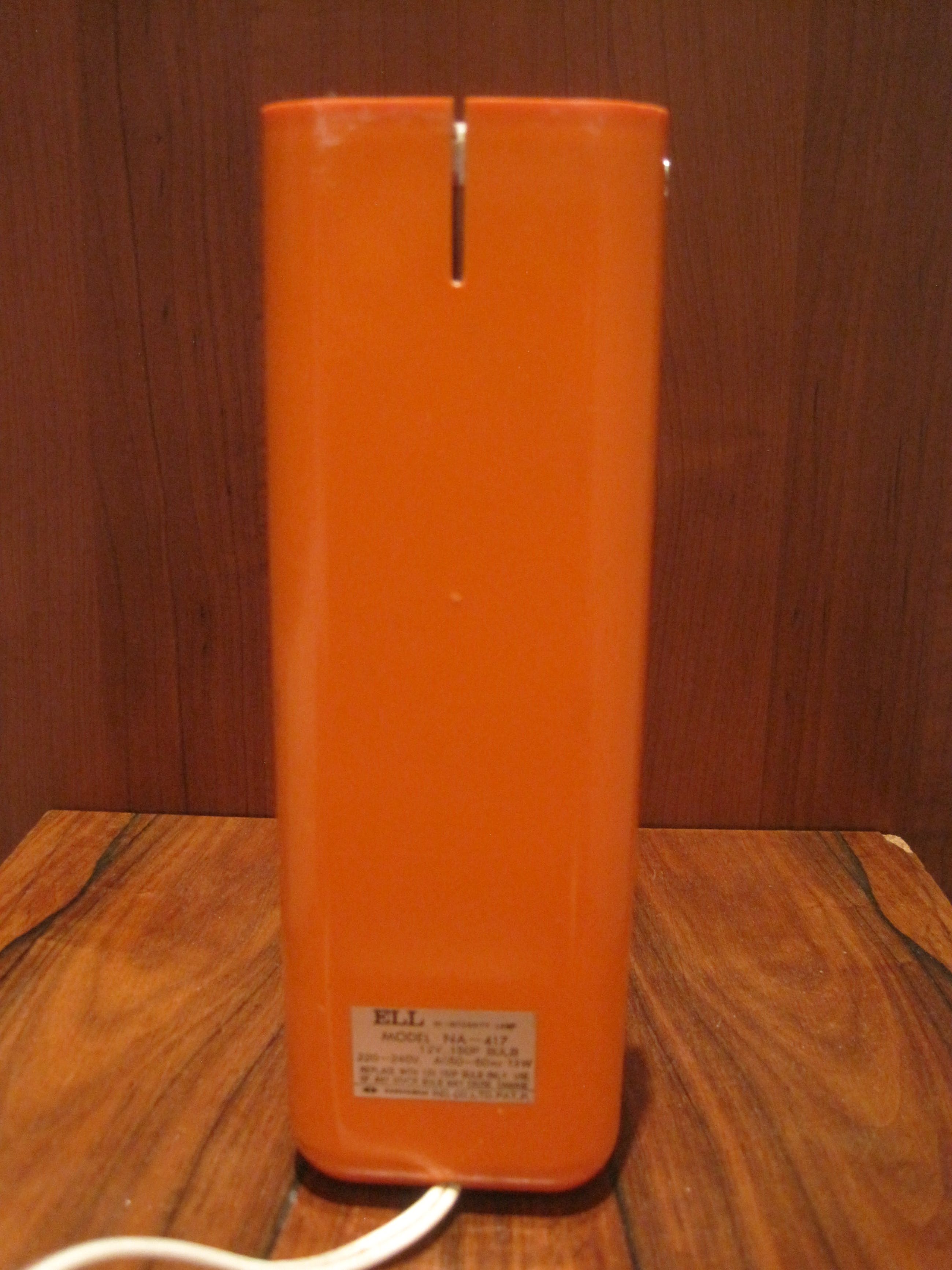 Strakke jaren 70 lamp uit Japan. Wit met oranje kunststofbehuizing. 12 volt-13 watt-220 volt. Schakelaar voor 2 standen: fel licht en zwak licht. Er zit een 12 volt bajonet autolampje in.