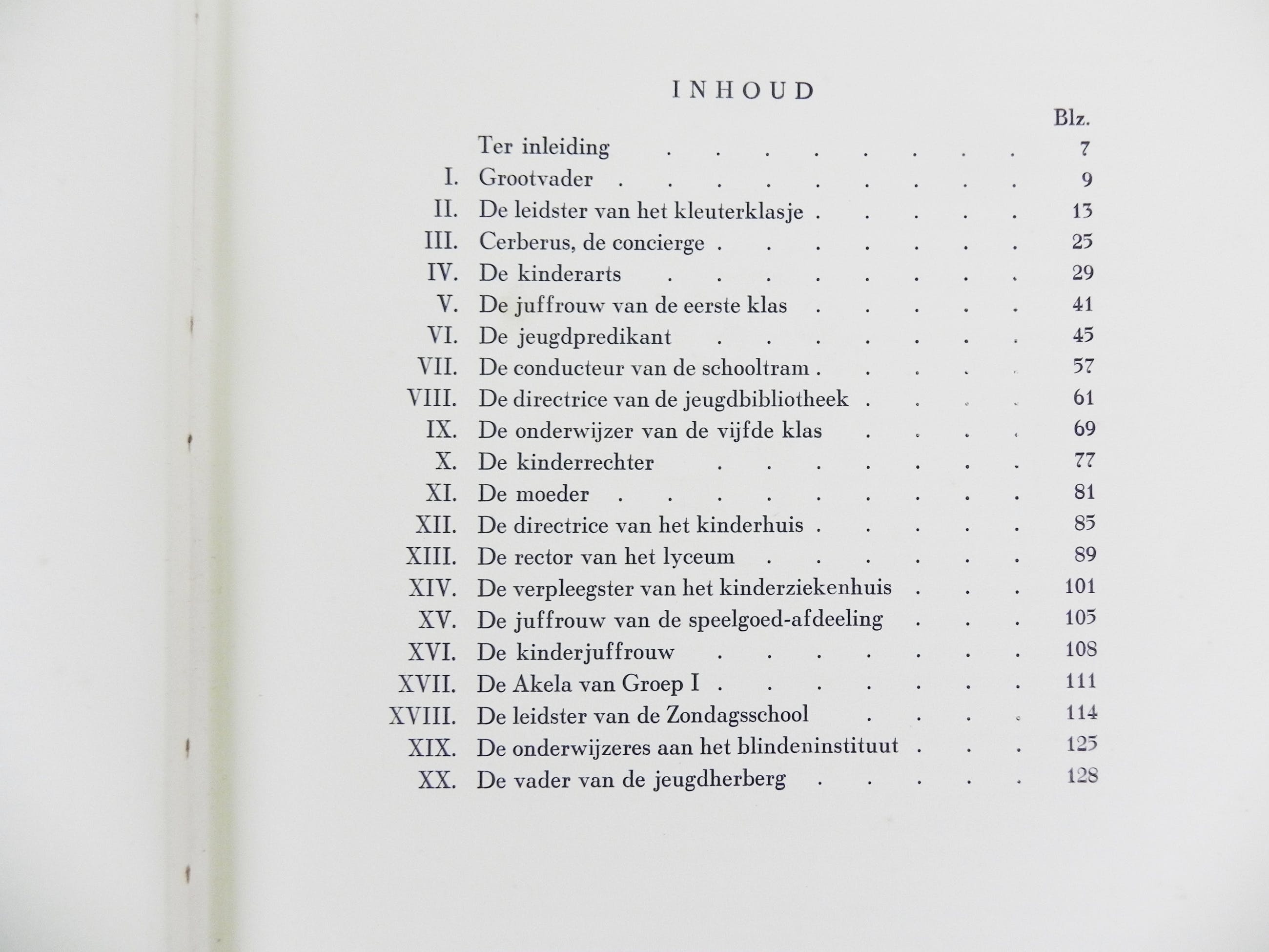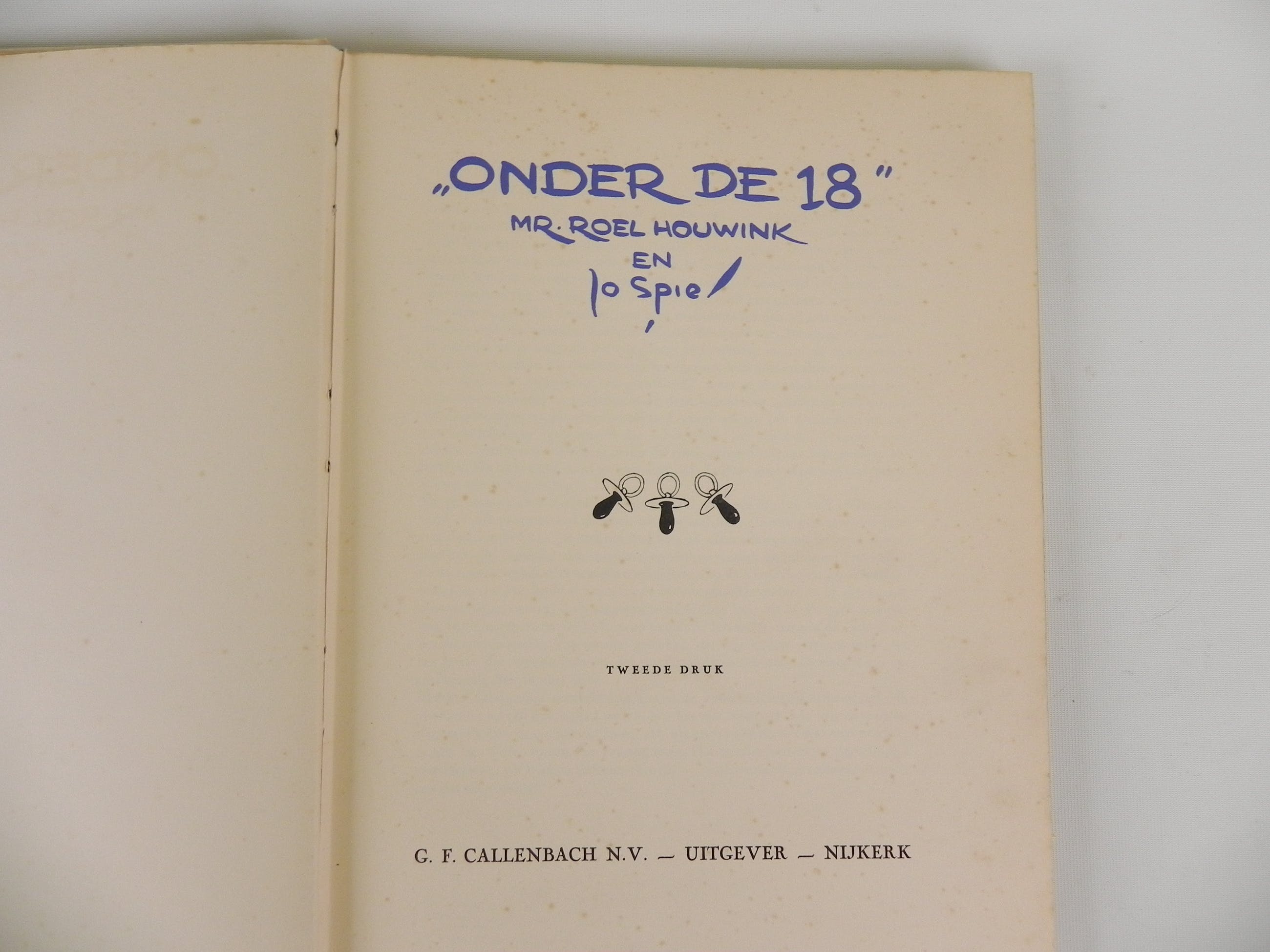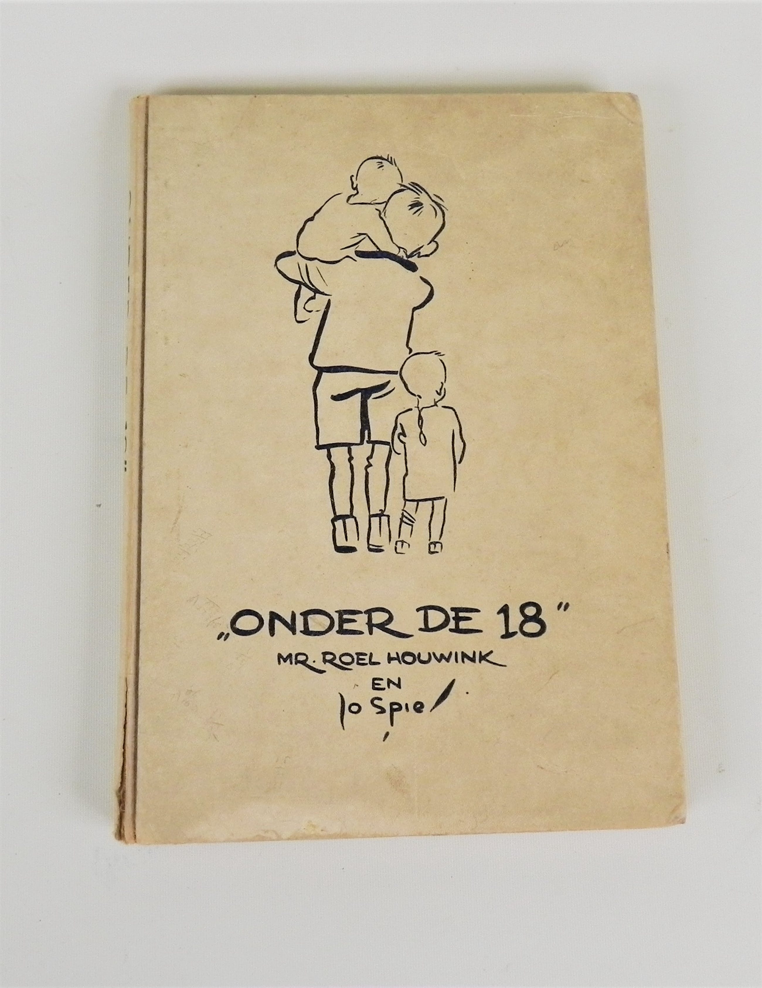 'Onder de 18' door mr. Roel Houwink en Jo Spier. Eerste druk, Uitg. Callenbach circa 1935, 130 blz. Groot, gebonden boek 25 x 34cm.Verzamelbundel van 20 korte verhalen van Roel Houwink, bijvoorbeeld de kinderarts, de juffrouw van de eerste klas, de jeugdpredikant, de kinderrechter, de Akela van Groep I, de vader van de jeugdherberg, dus allerhande mensen die een rol spelen in het leven van mensen onder de 18. Met 48 tekeningen van Jo Spier.Hardcover met linnen kaft, rug onderzijde licht sleets, verkleuring van rug en papier, verder in goede staat.