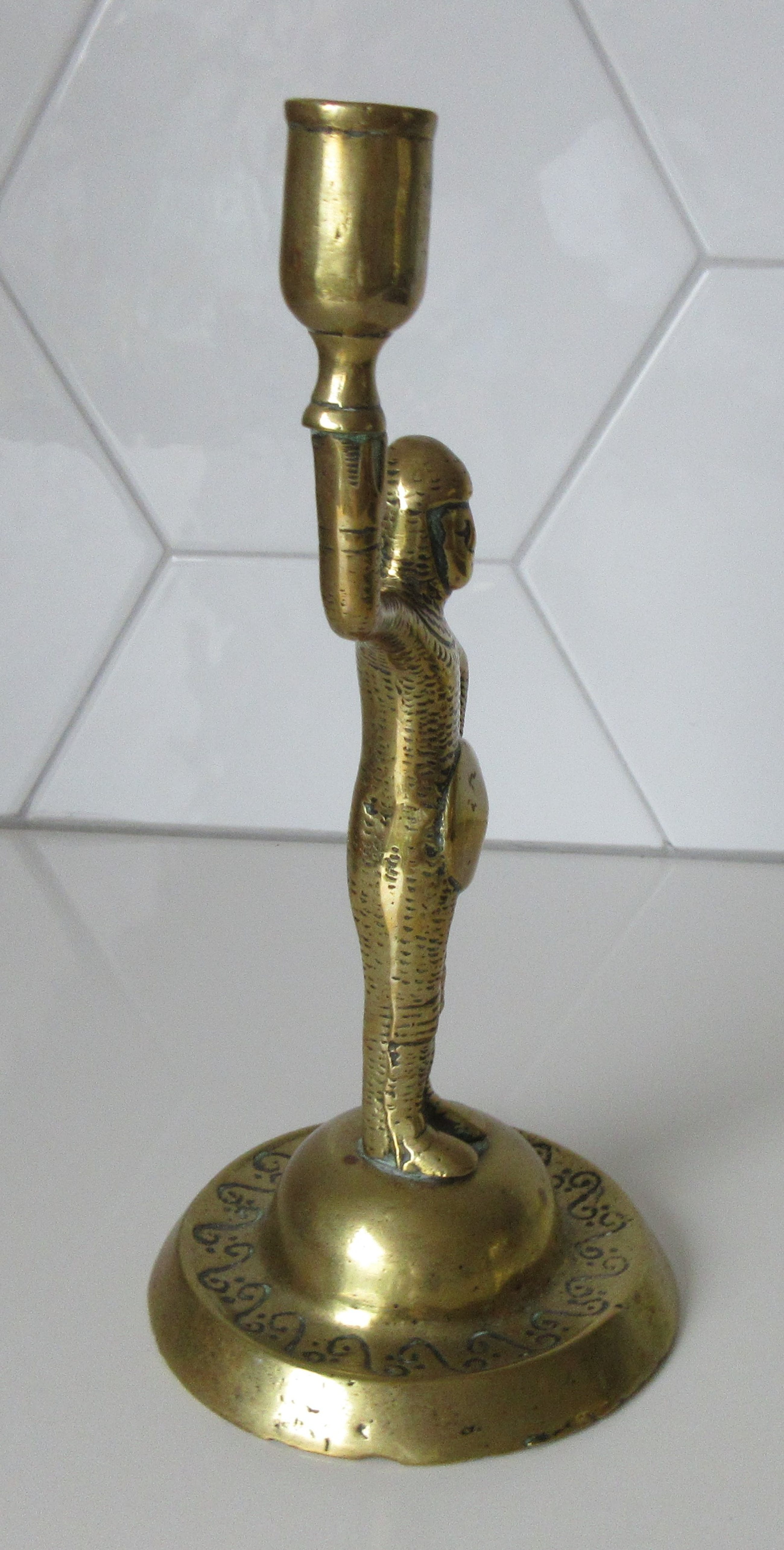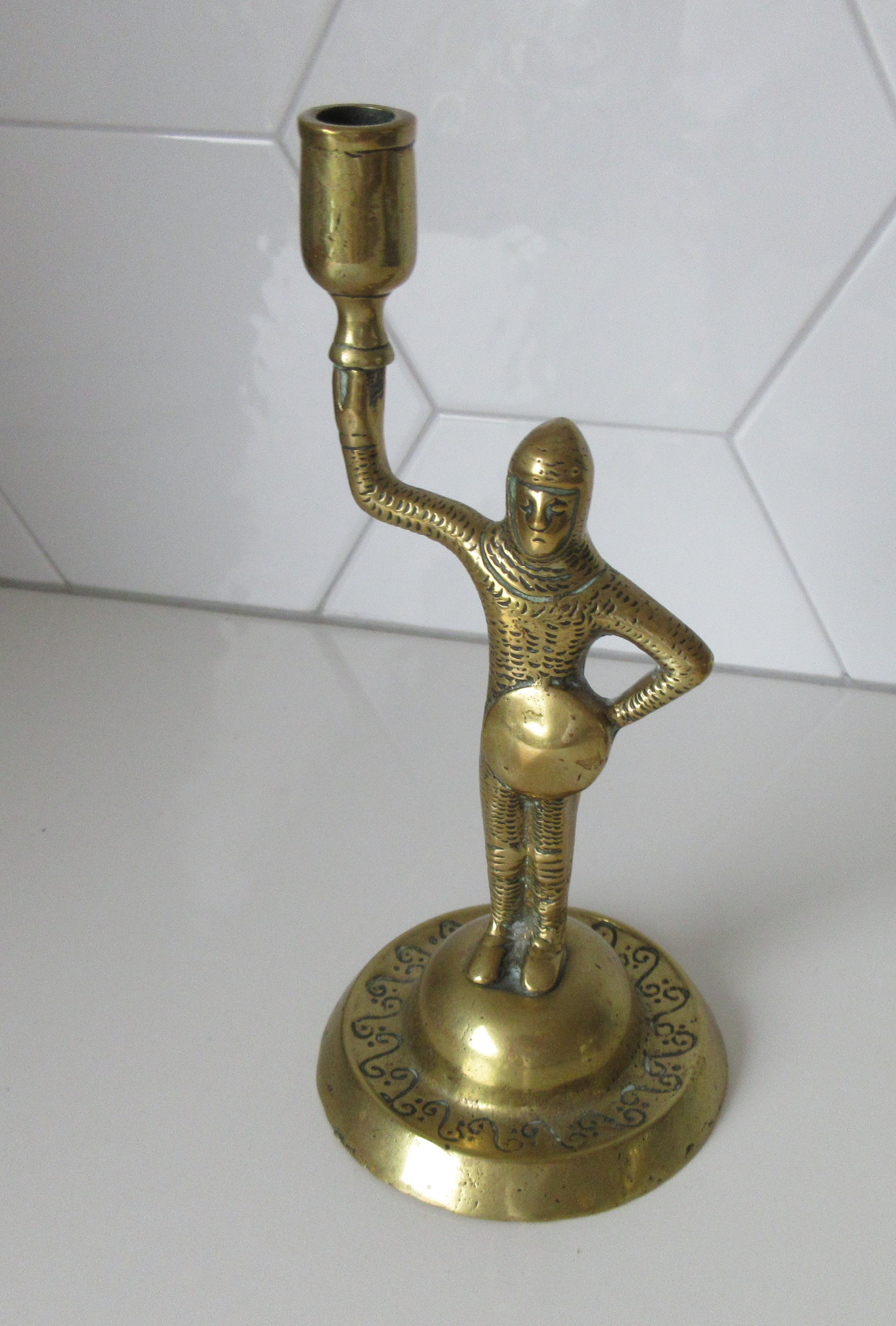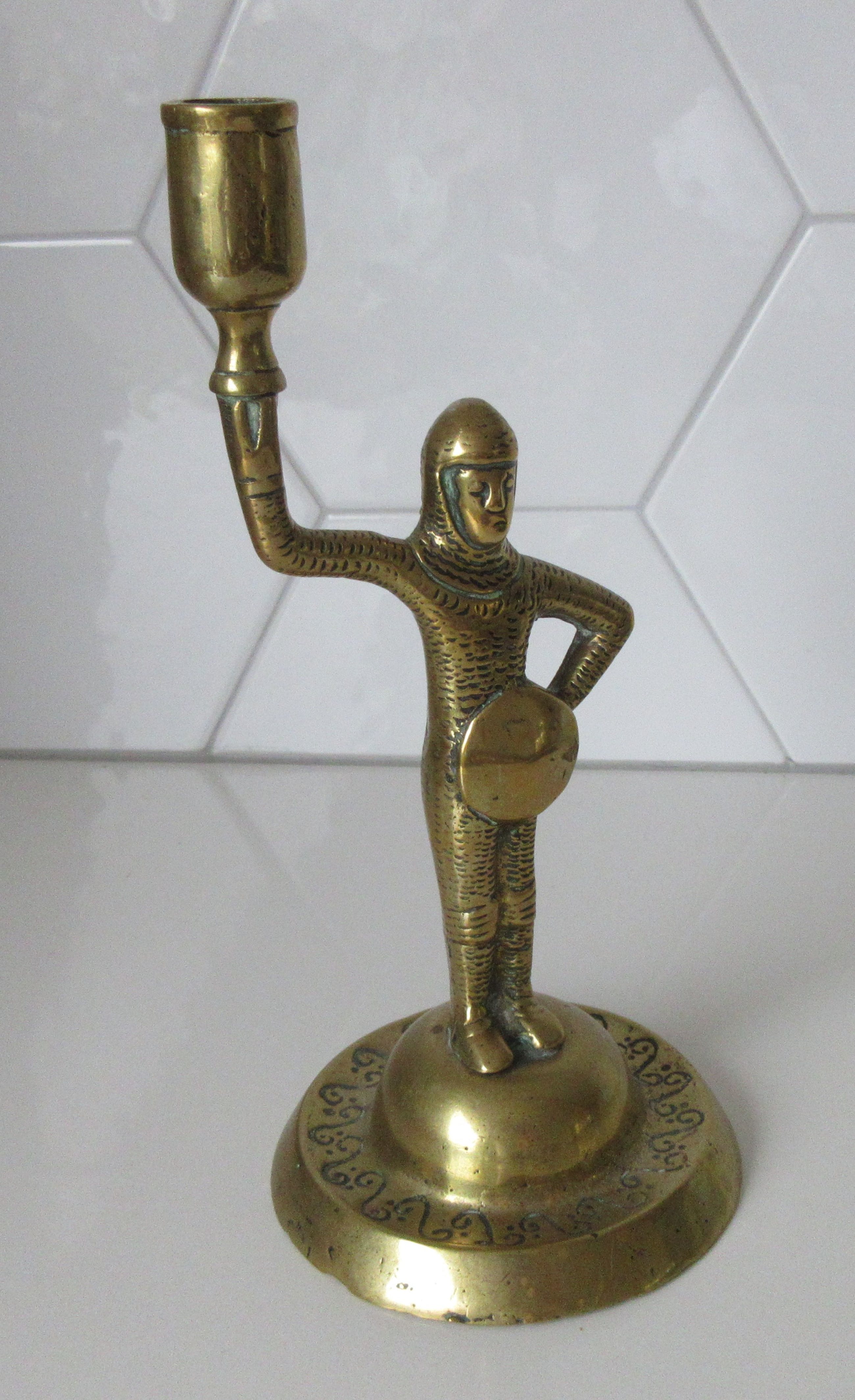 Prachtig koperen kandelaar, gedragen door middeleeuwse soldaat met schild, kandelaar is vrij zwaar en is in goede staat. Herkomst onbekend.