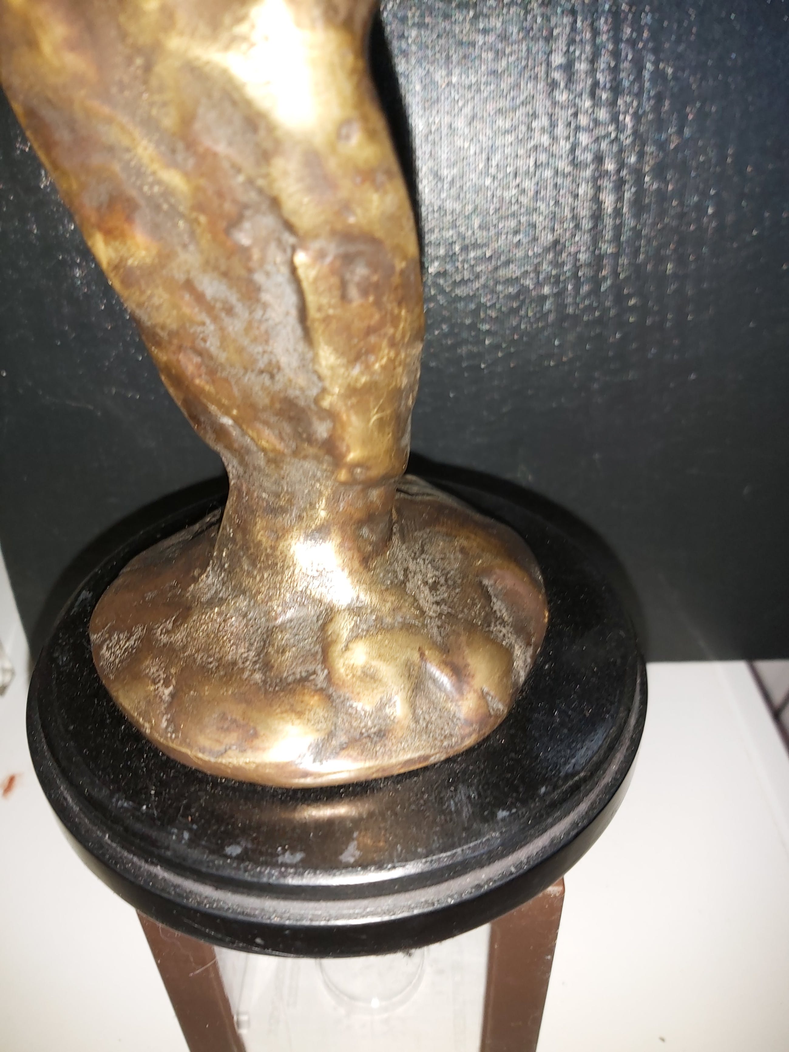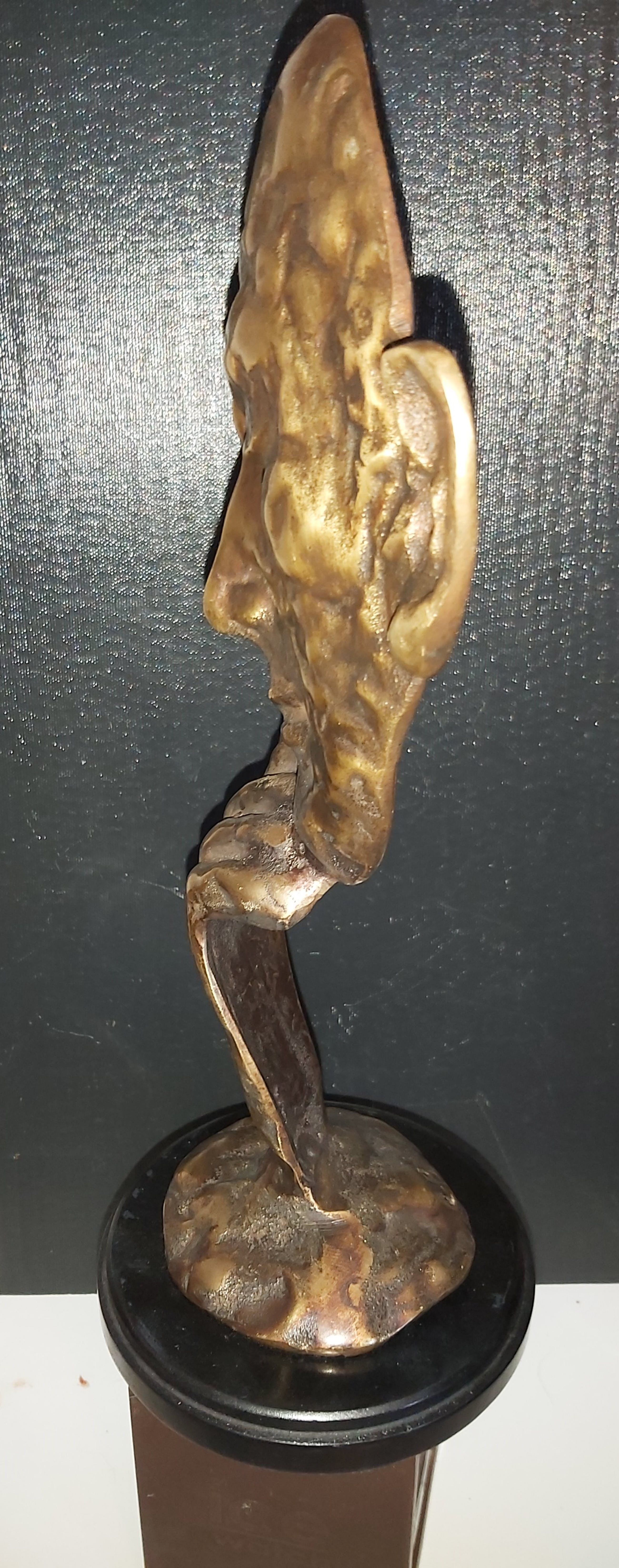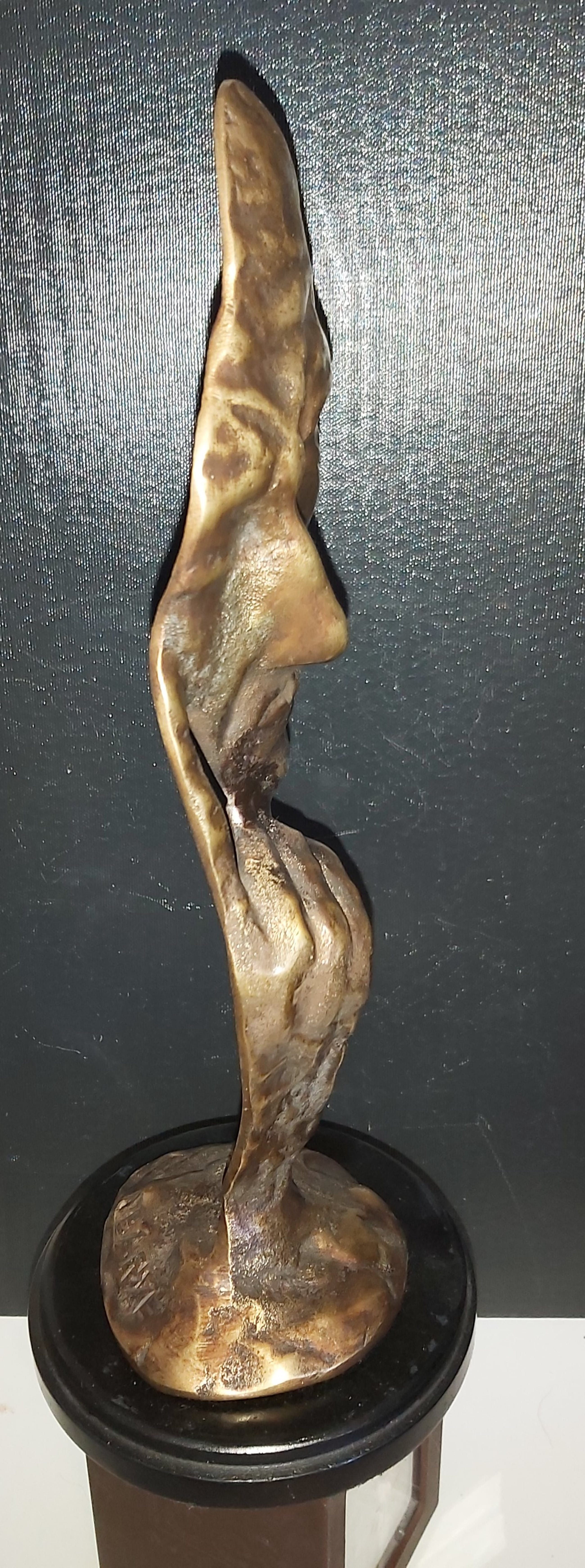 Een mooi abstract verbronsd koperen beeldje. Vastgemaakt op een houten sokkel met vilt onderaan ter bescherming van meubilair.