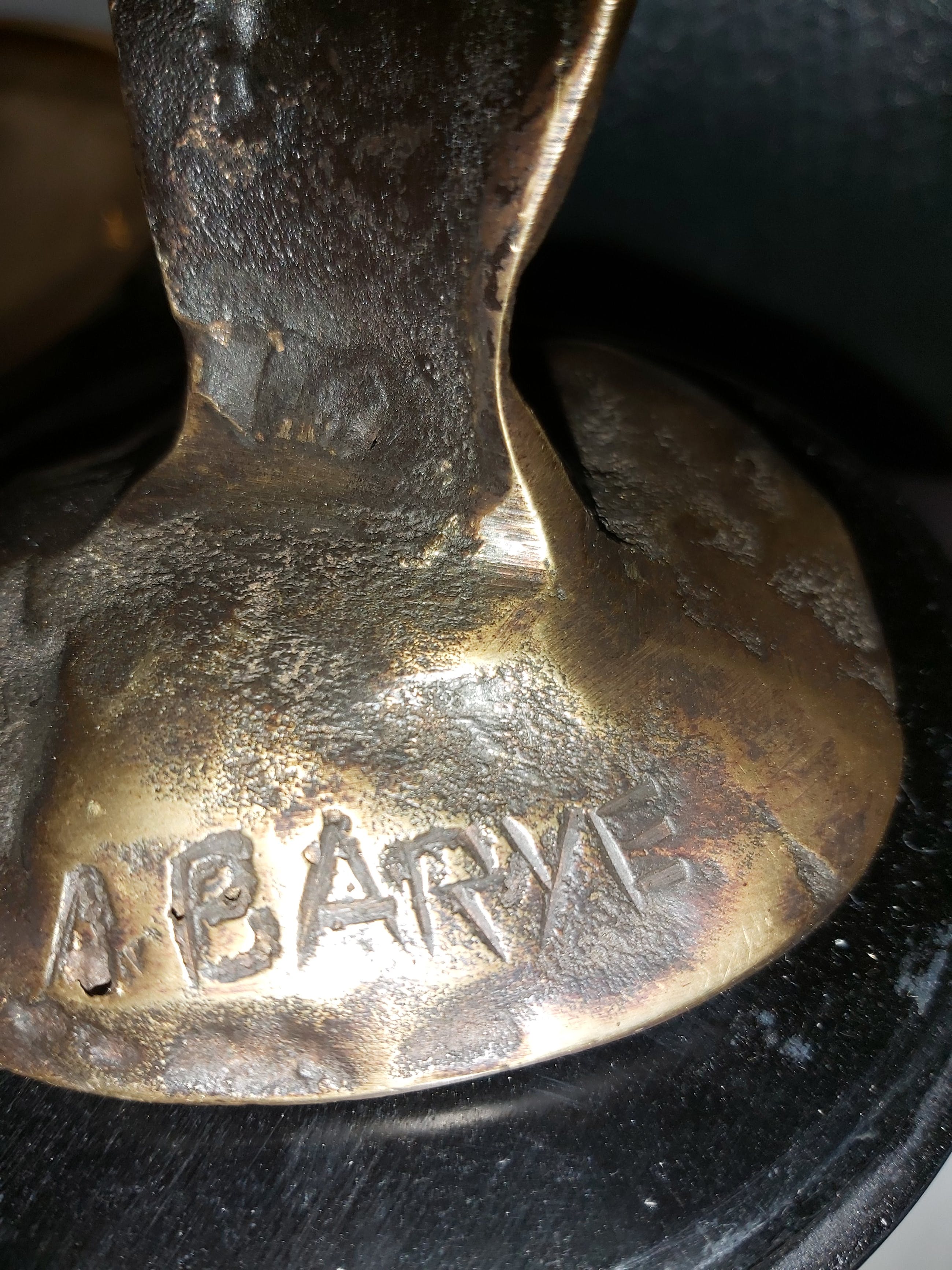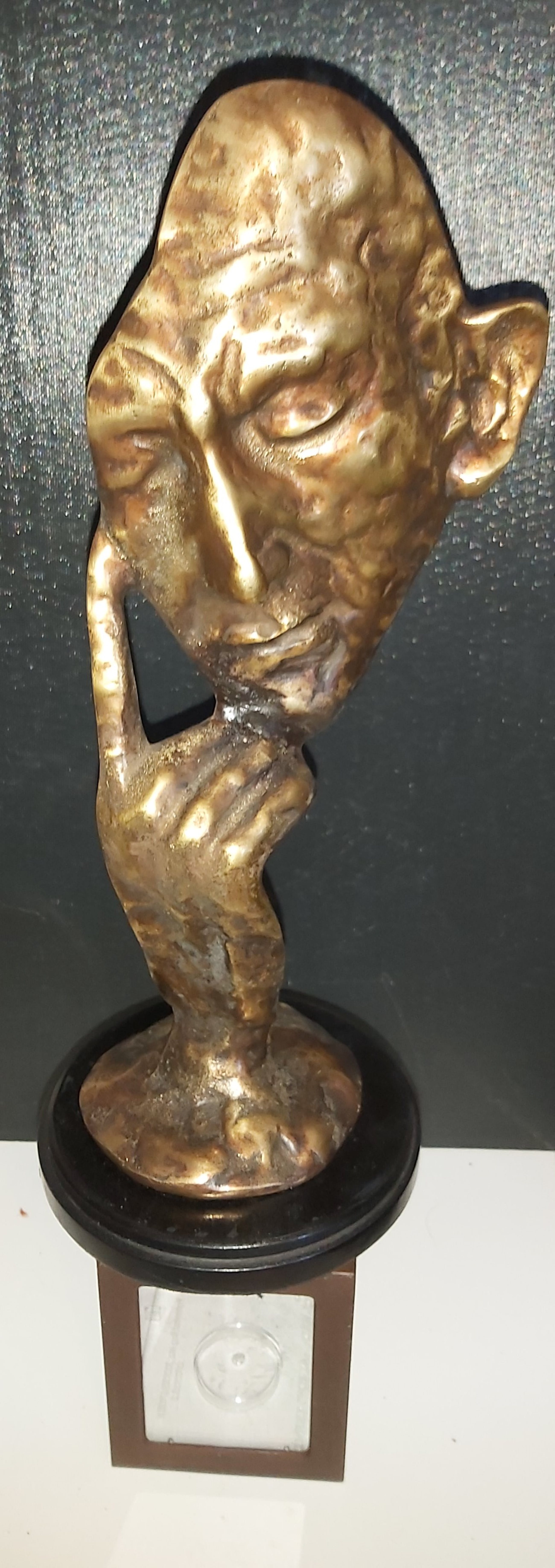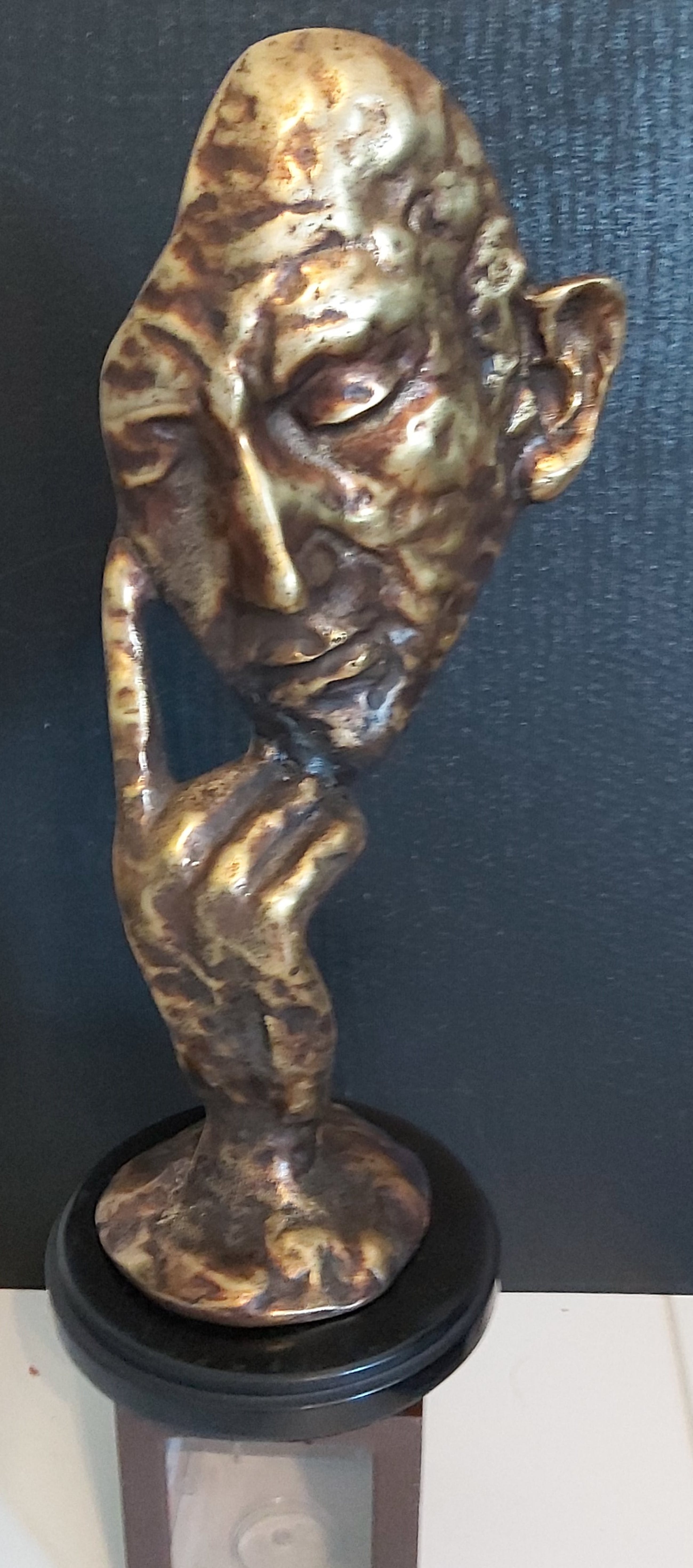 Een mooi abstract verbronsd koperen beeldje. Vastgemaakt op een houten sokkel met vilt onderaan ter bescherming van meubilair.