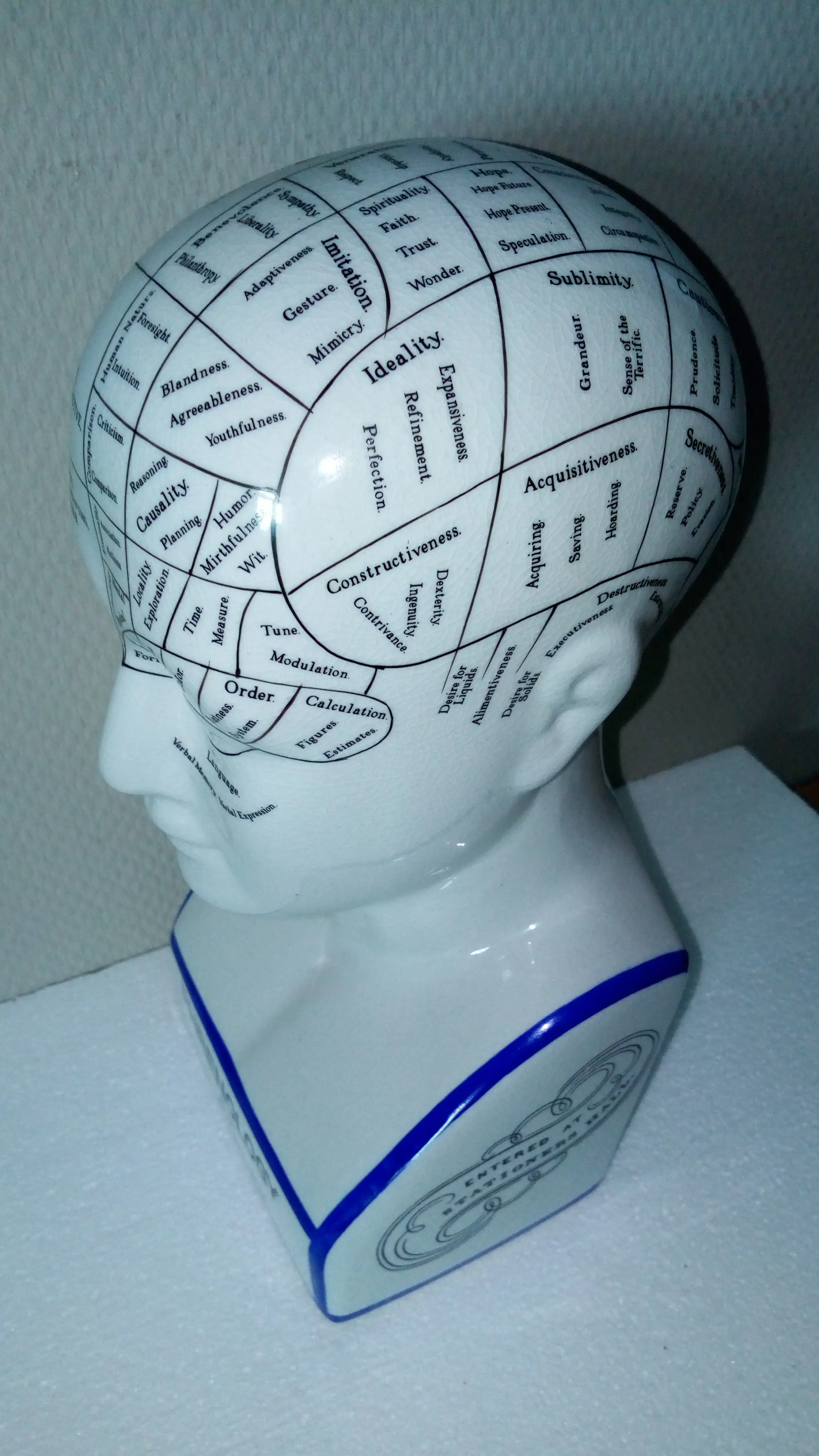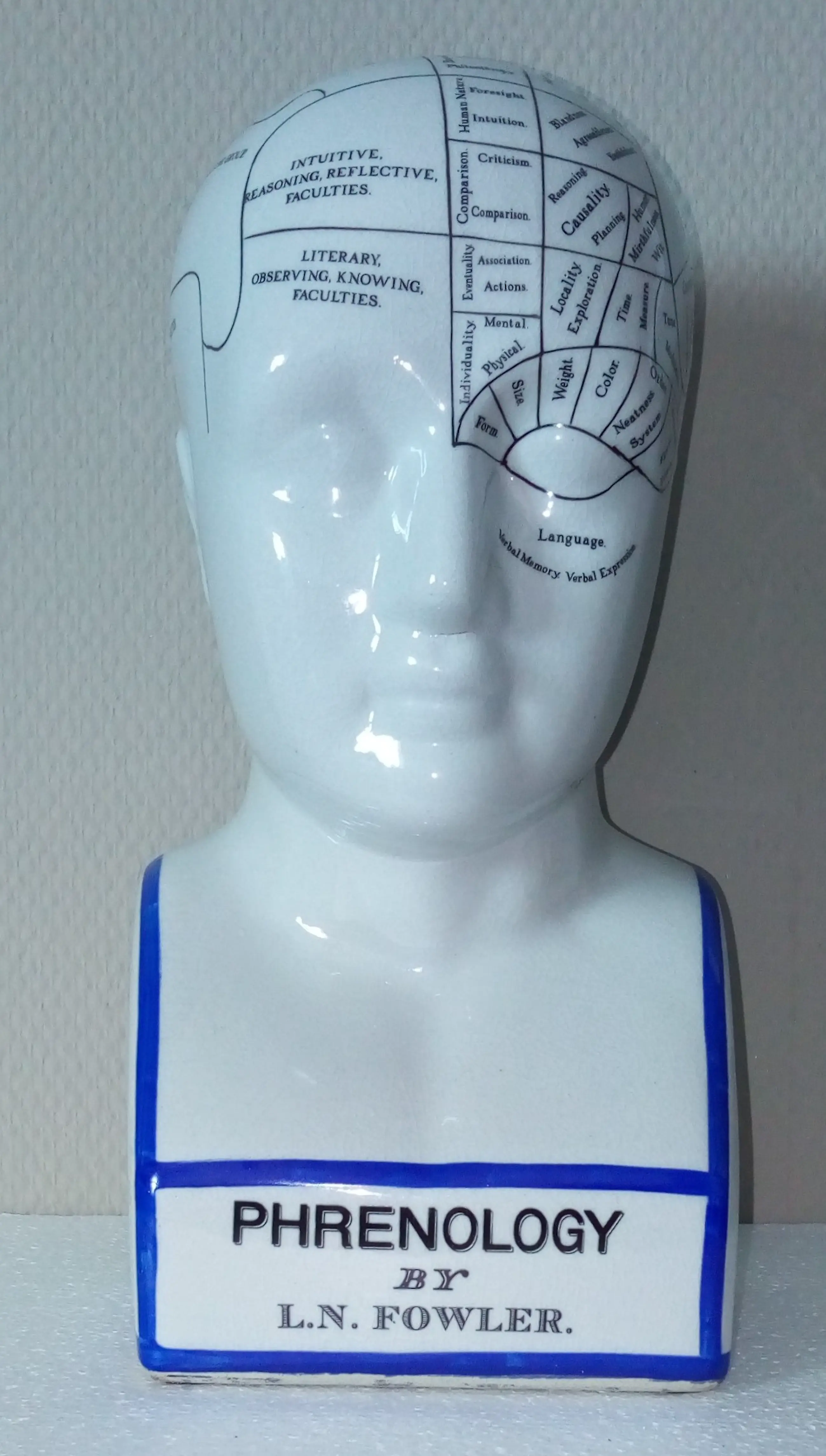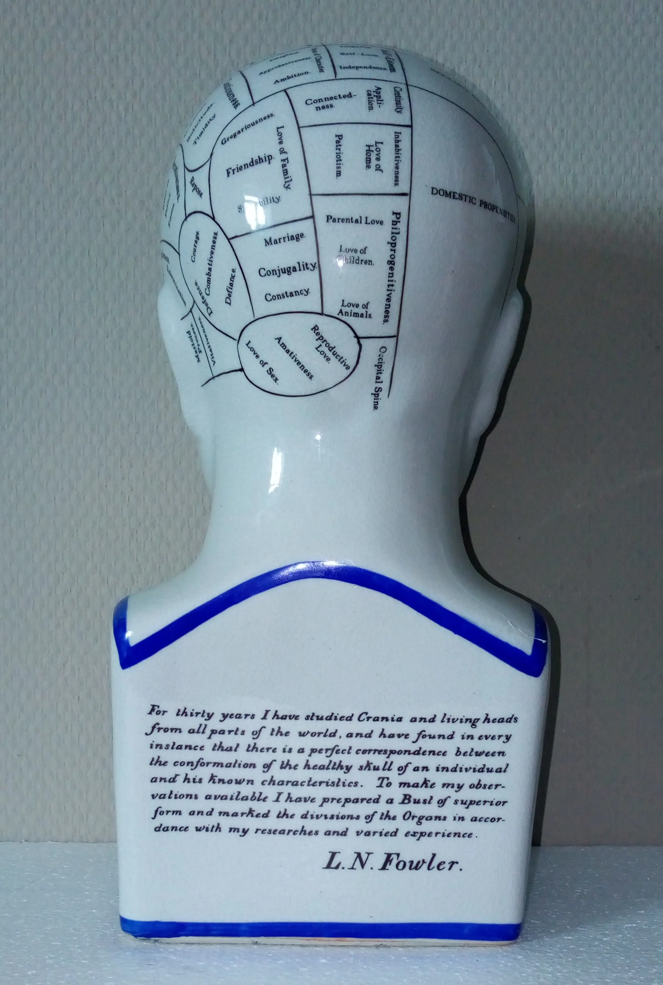 De Amerikaanse professor Lorenzo N.Fowler (1811-1896) ontwikkelde phrenologie. Nu is deze wetenschap achterhaald, maar dat maakt dit hoofd niet minder boeiend.