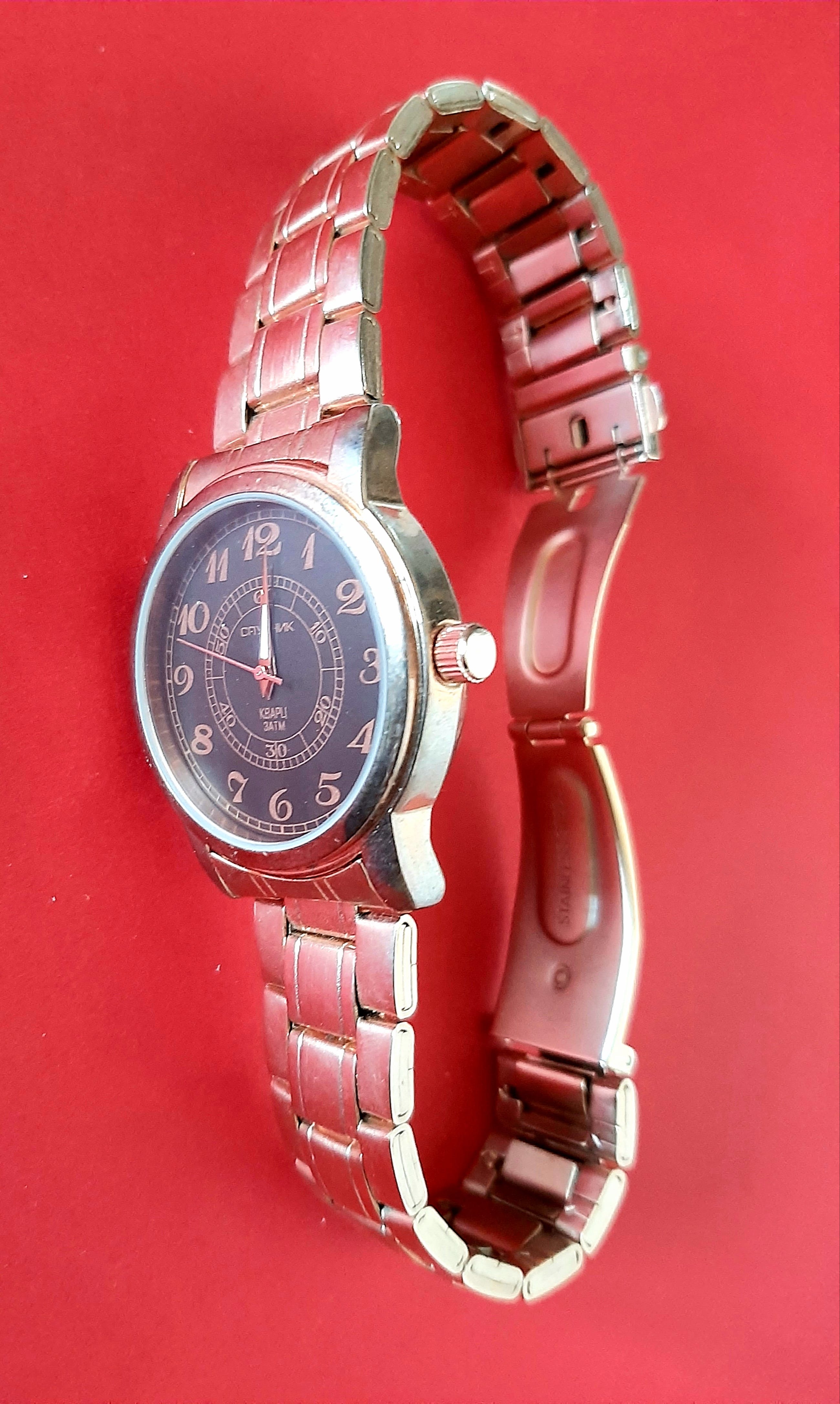 Herenpolshorloges zijn ook geschikt voor vrouwen. Spoetnik gebruikt een mechanisme dat in Japan is gemaakt. Zeer goede kwaliteit . Nooit breken. Armand 20cm(kan kleiner maken) Diametr 3,7 cm,1cm breed. Geweldig ontwerp. Kleur - zwart en brons . Gekocht in Saint Petersburg . NOOIT GEDRAGEN . WERKENDE BATERIJ .