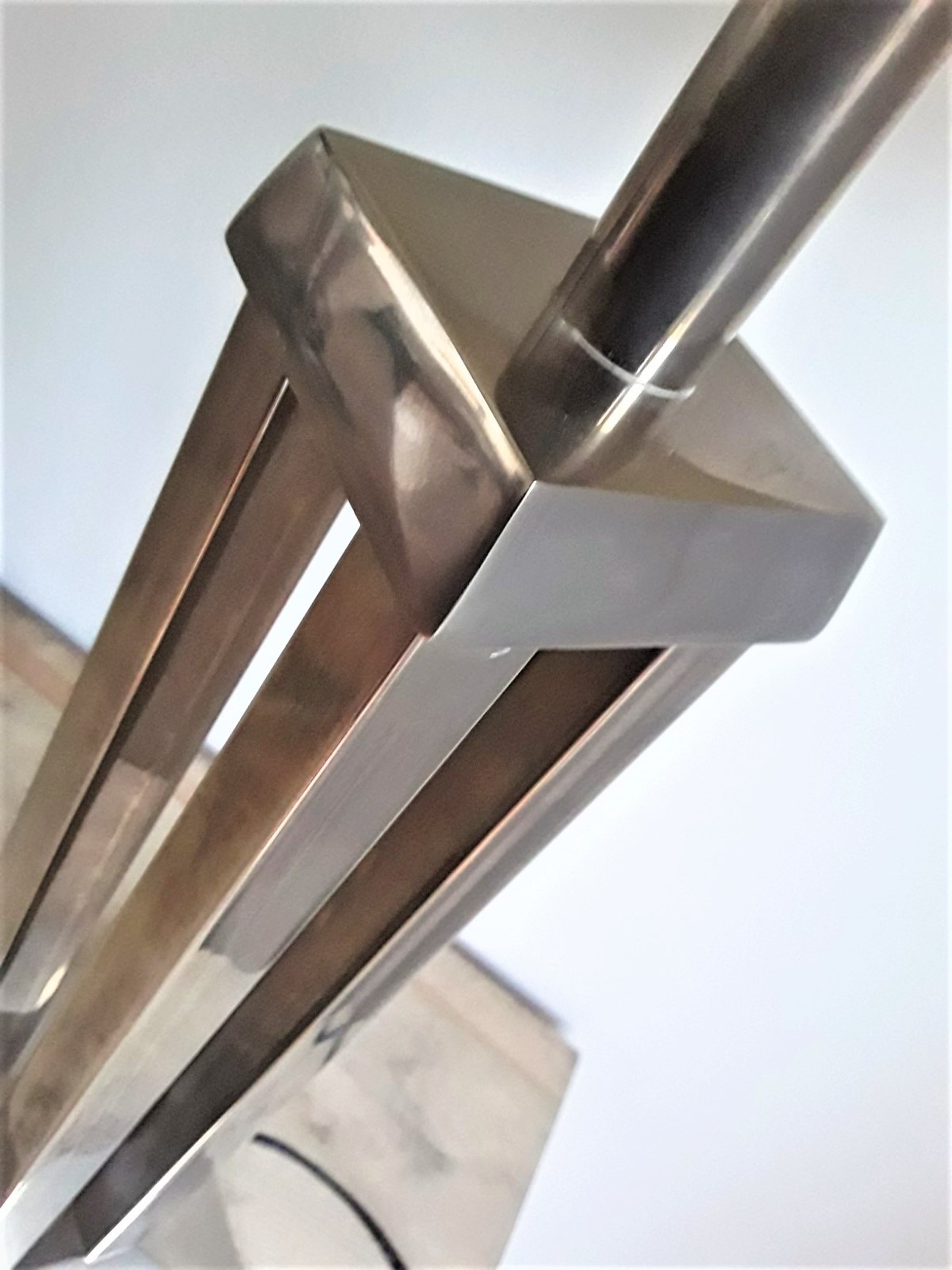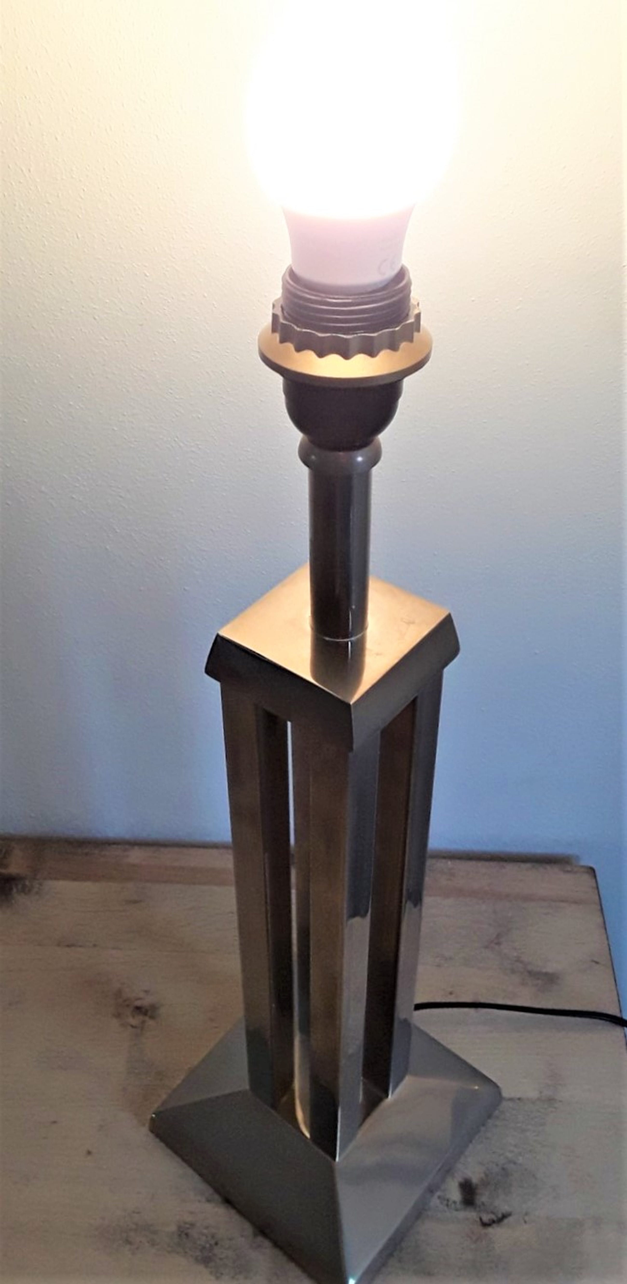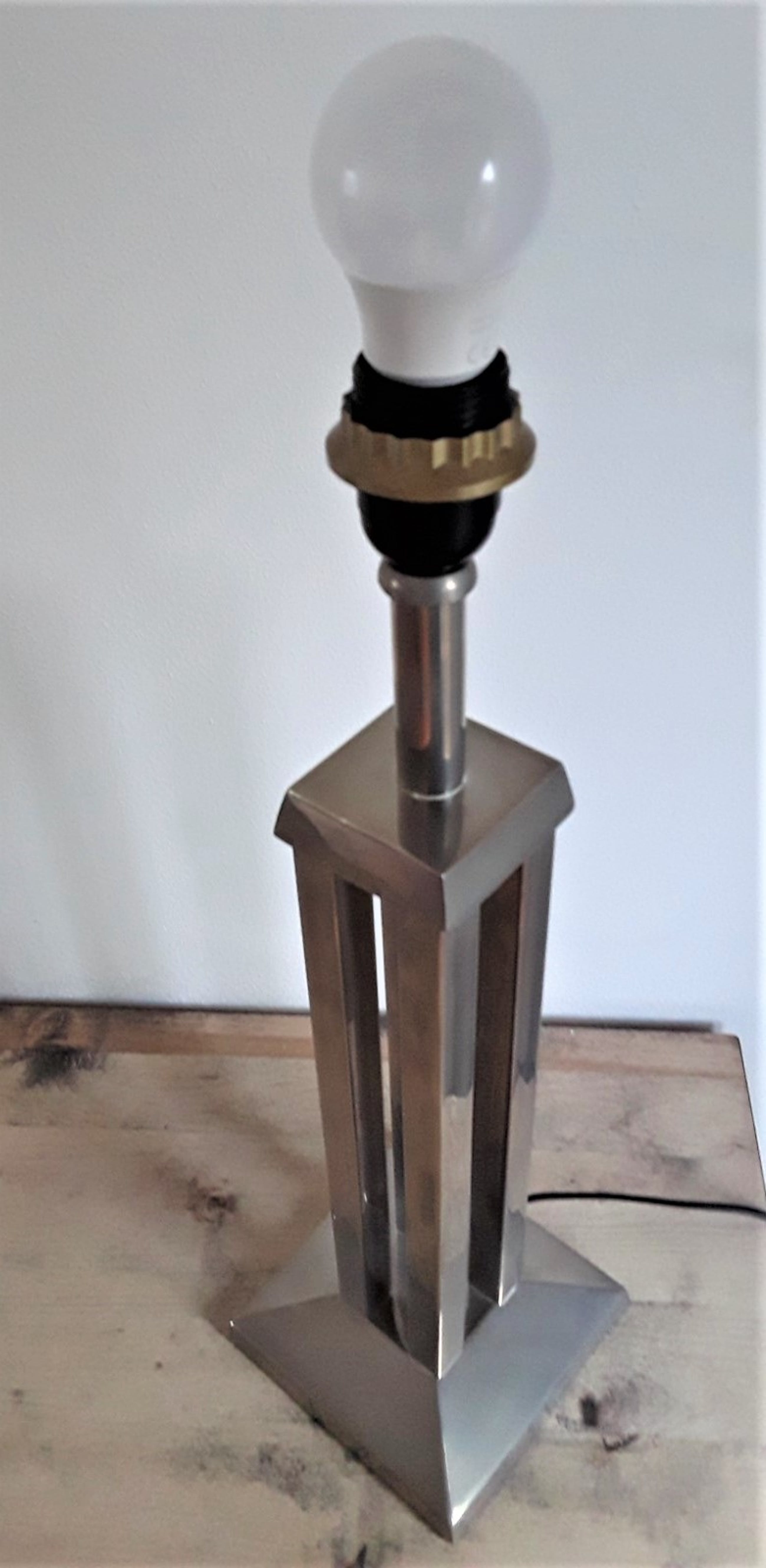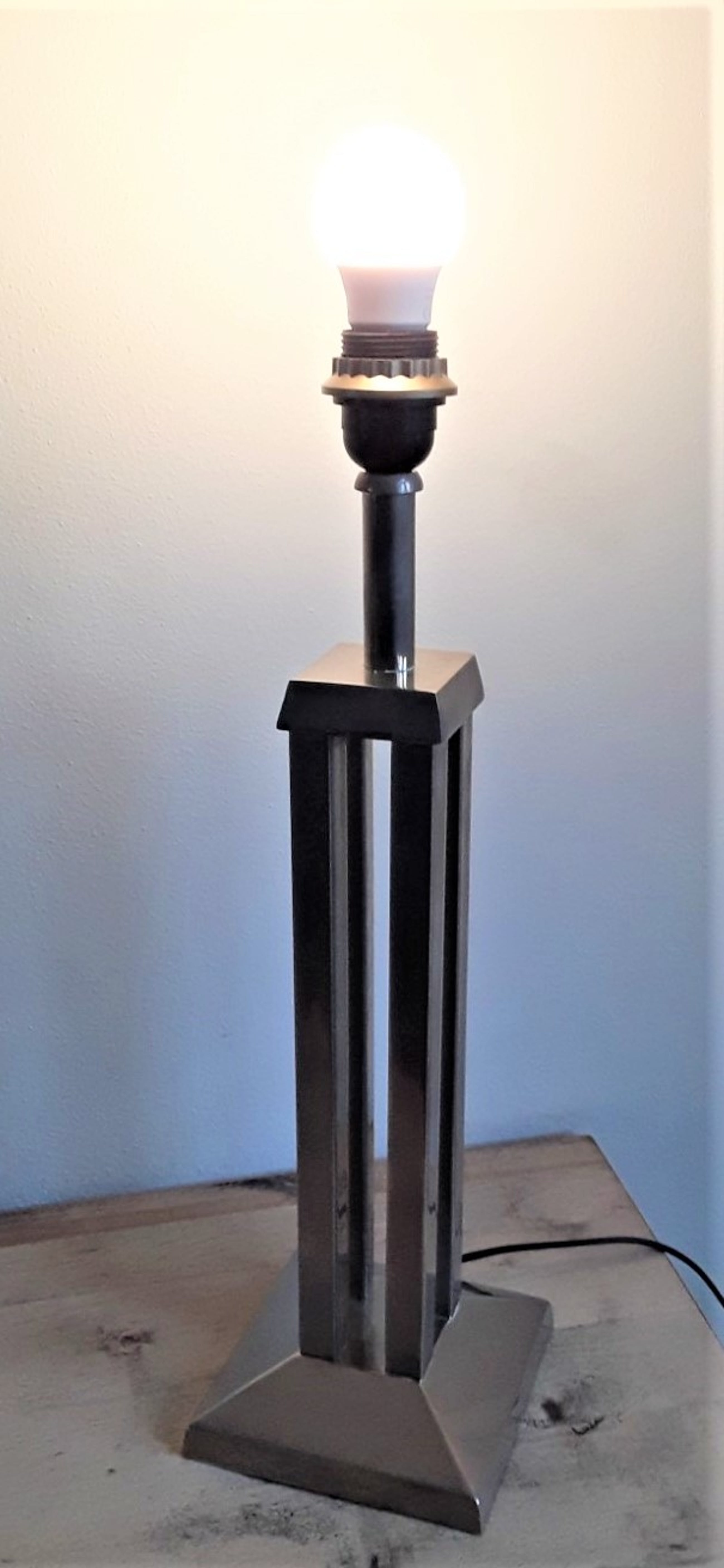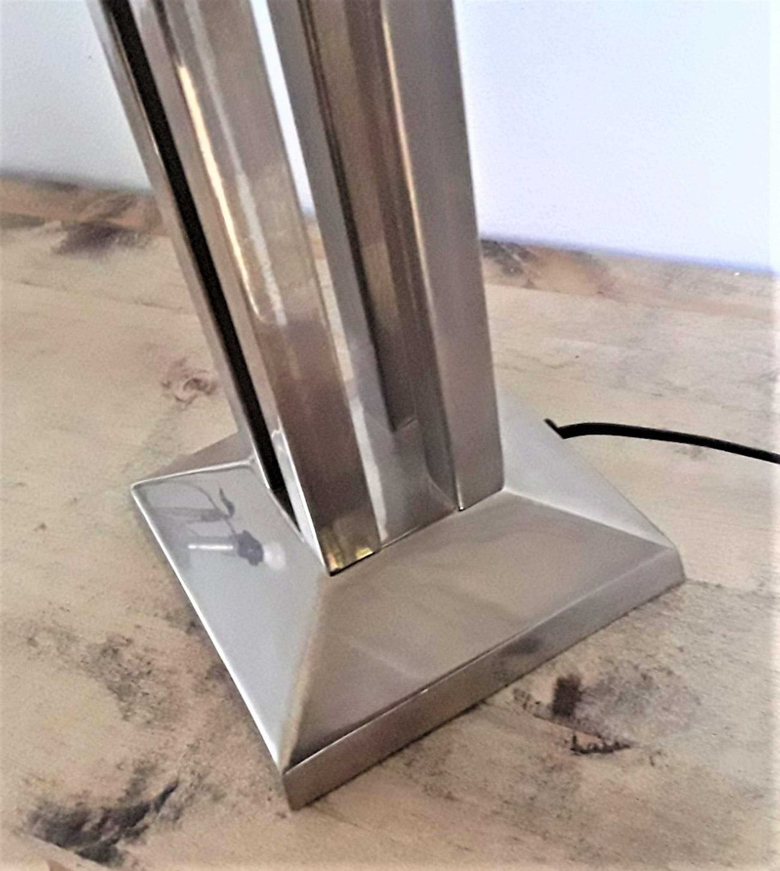 Robuust uitgevoerd in gemêleerd verchroomd staal en strak vormgegeven d.m.v. vierkanten kubistische standaard/poot, compleet met bijbehorende kap.