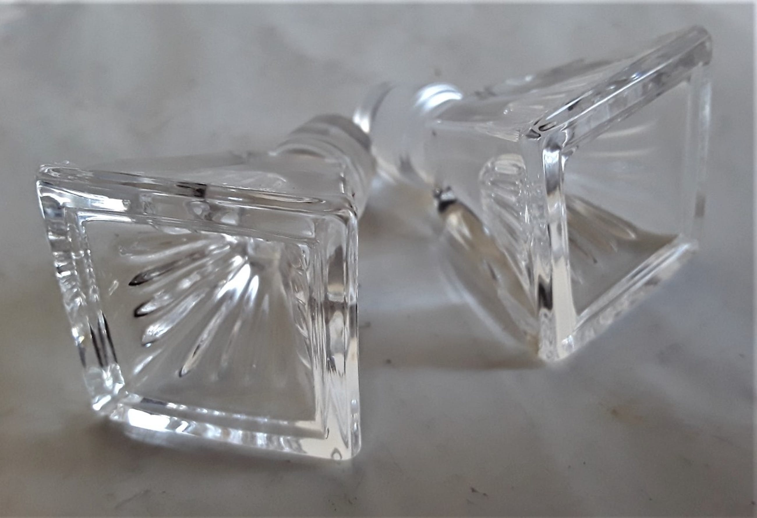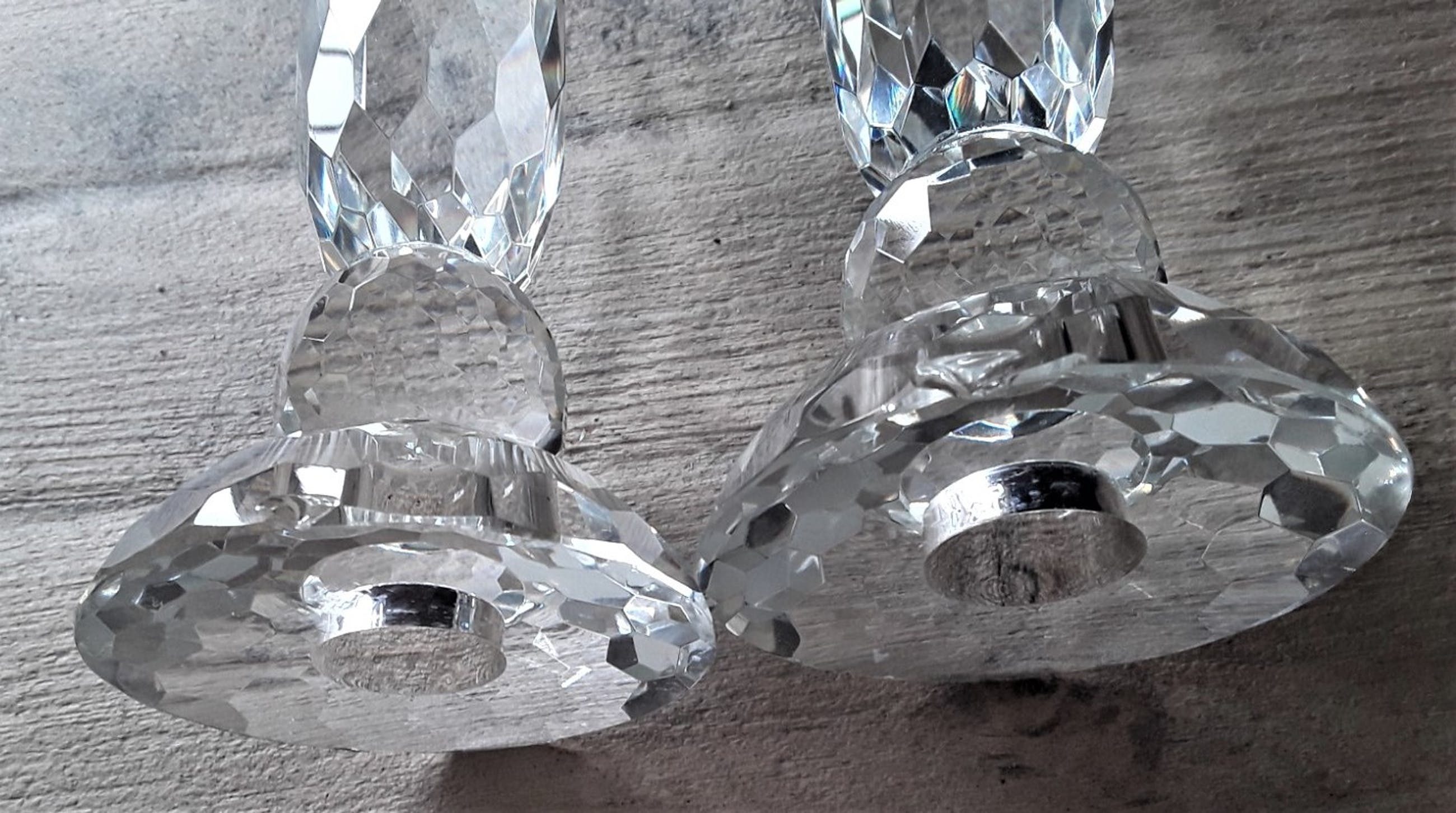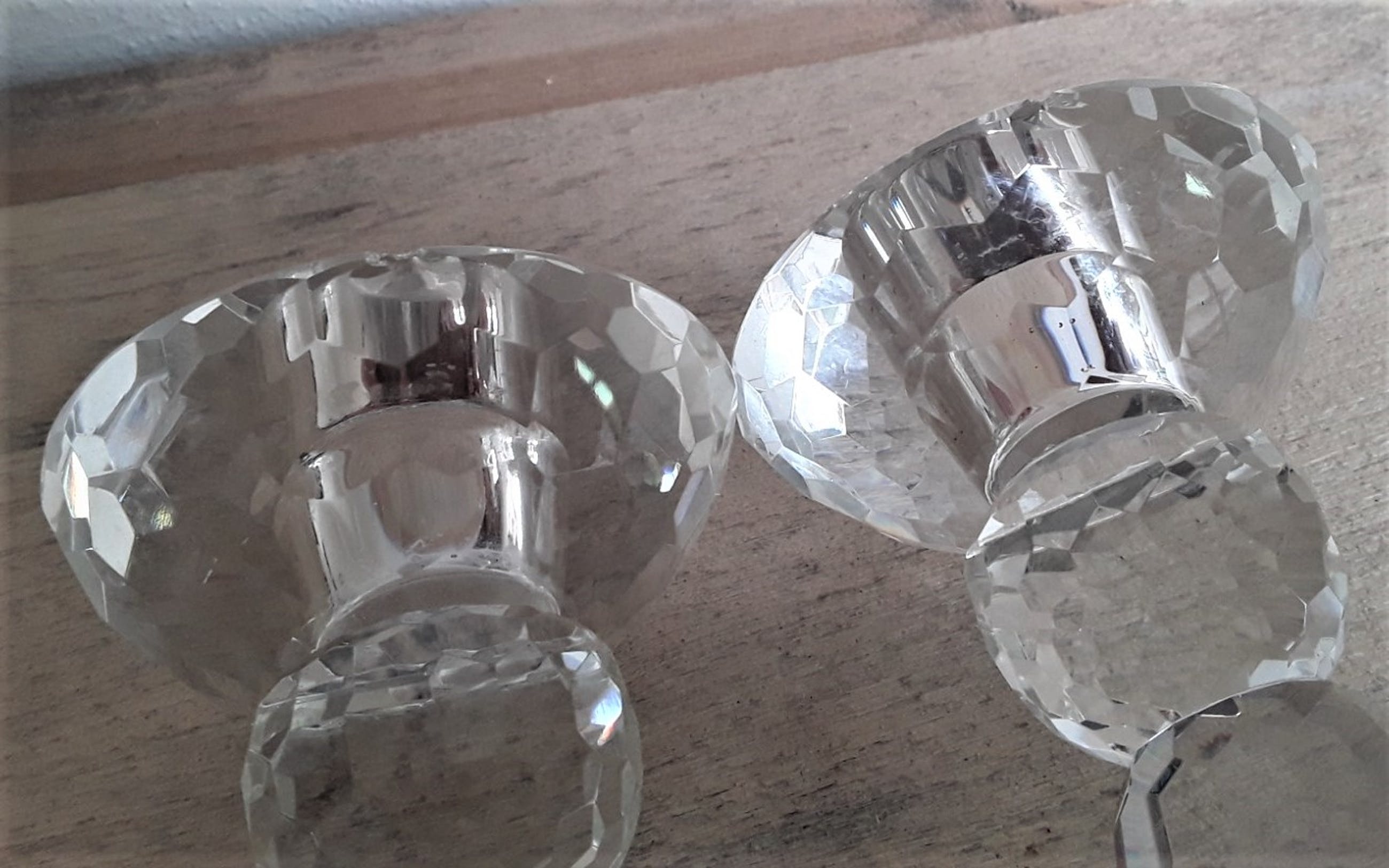 De Twee "ruitjes" kristallen kandelaars in redelijk goede staat, met helaas op elk een kleine beschadiging aan de rand van de kaarshouder.