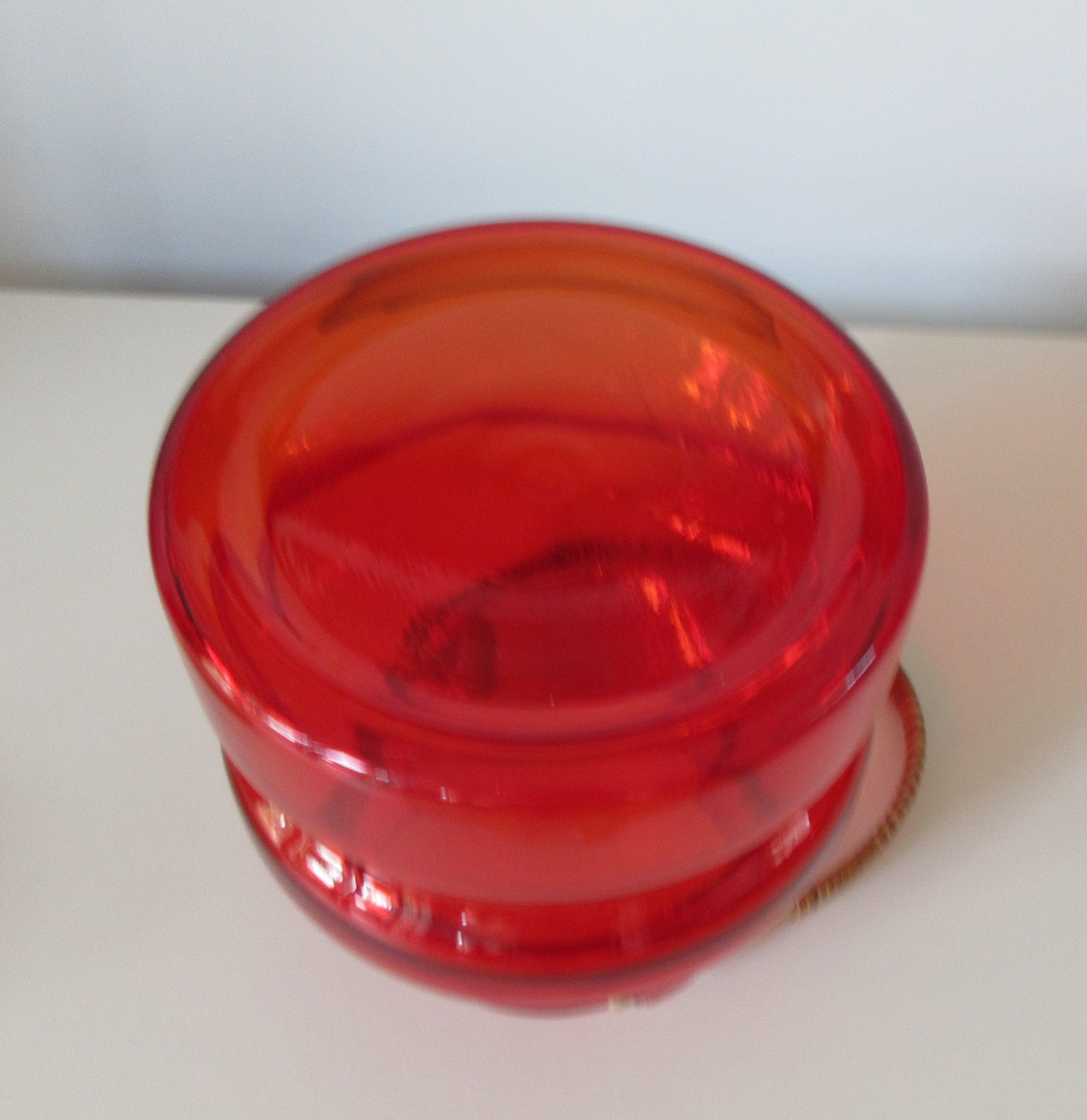 Seventies rode glazen koektrommel met bamboe handvat en kurken deksel. In prima onbeschadigde conditie. Niet gemerkt dus niet bekend war hij gemaakt is, kan in Noord - West Europa zijn maar evengoed Japan.