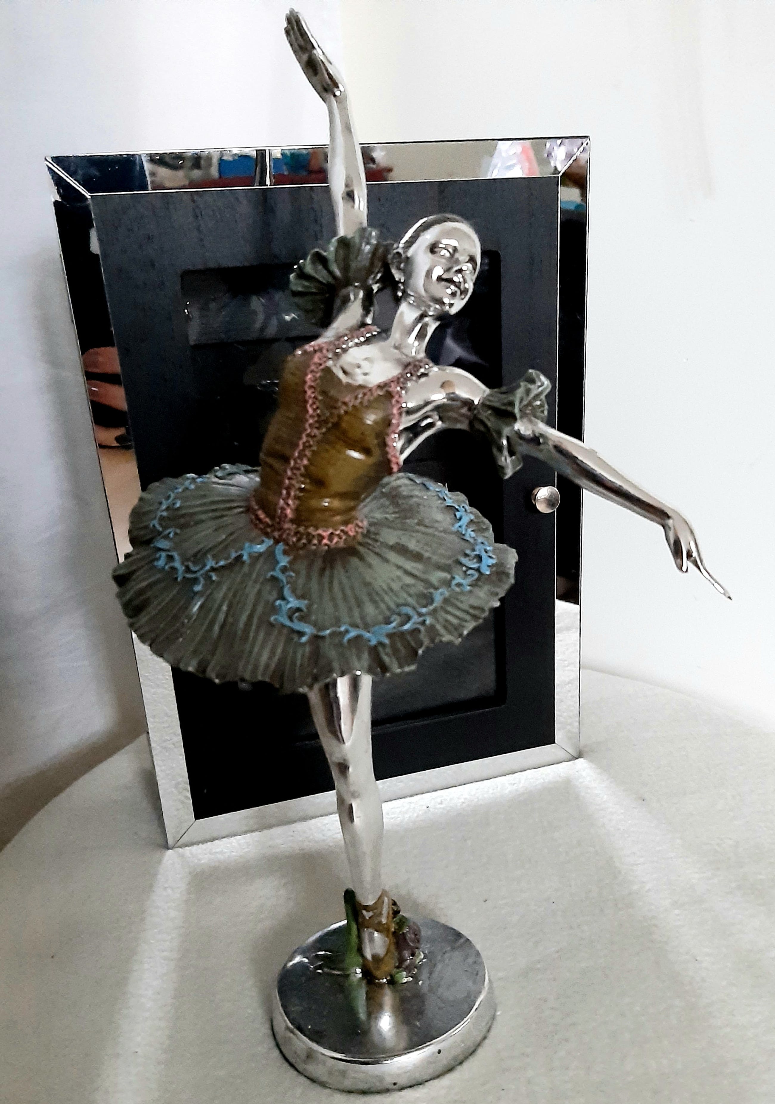 Perfecte vintage staat. Kast gemaakt van hout met spigel decor. Ballerina gemaakt vam polyresin ,handgekleurd. 33 cm hoog , 18 cm breed. Kan ter decoratie worden gebruikt-erg goede skulptor werk.
