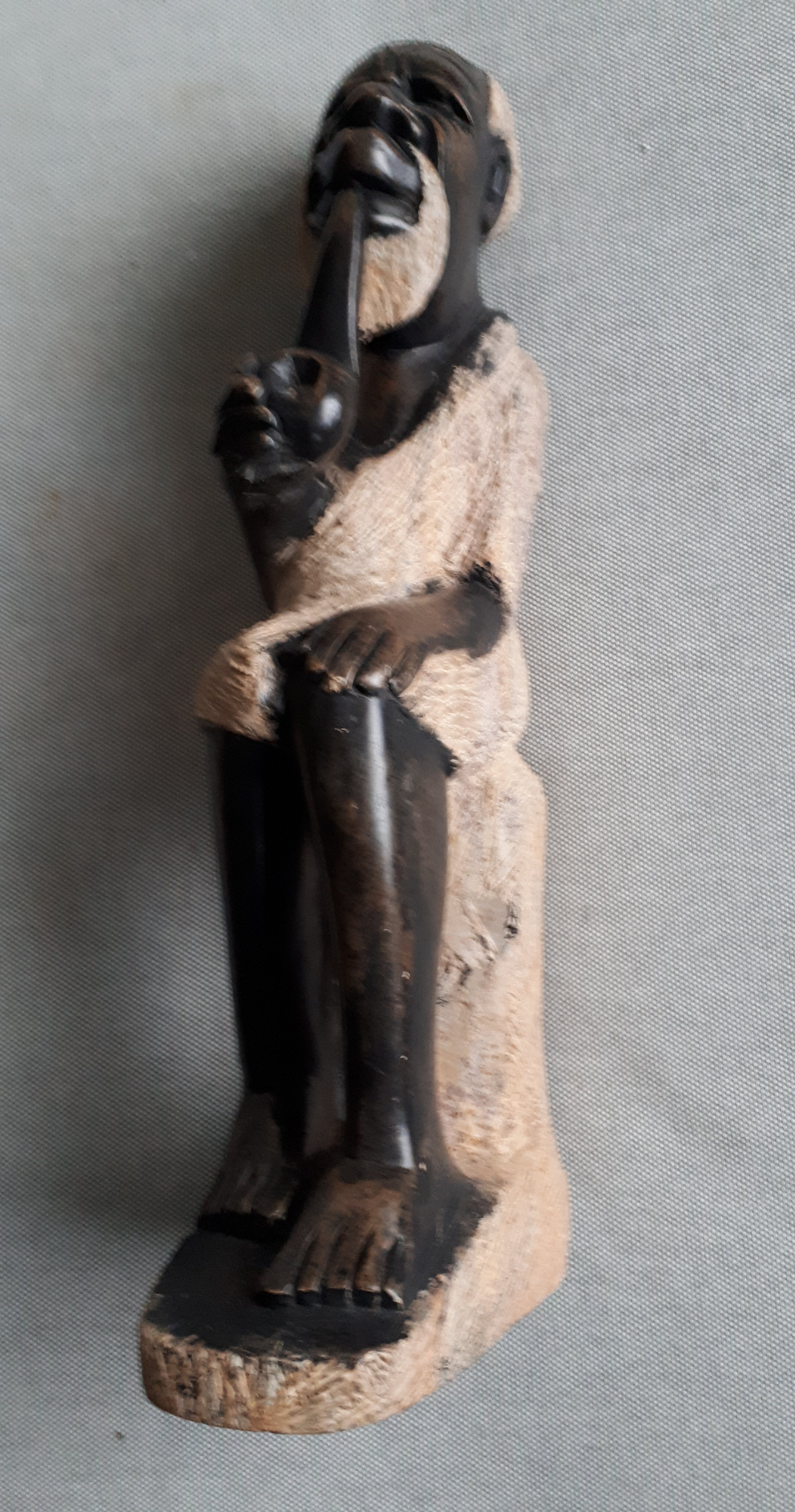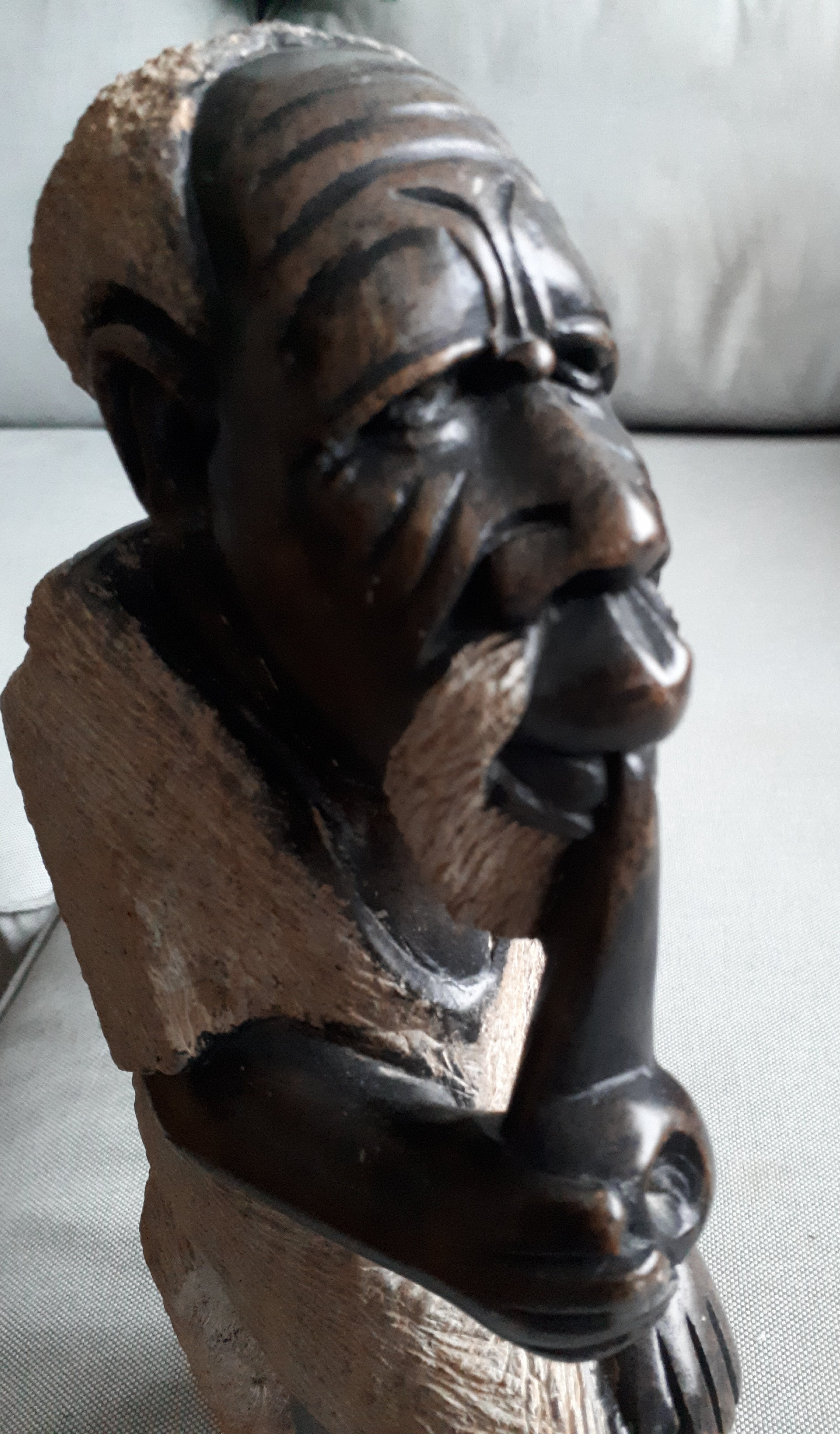 Handgesneden stenen beeld van een Afrikaanse grootouder met baard die een pijp rookt.