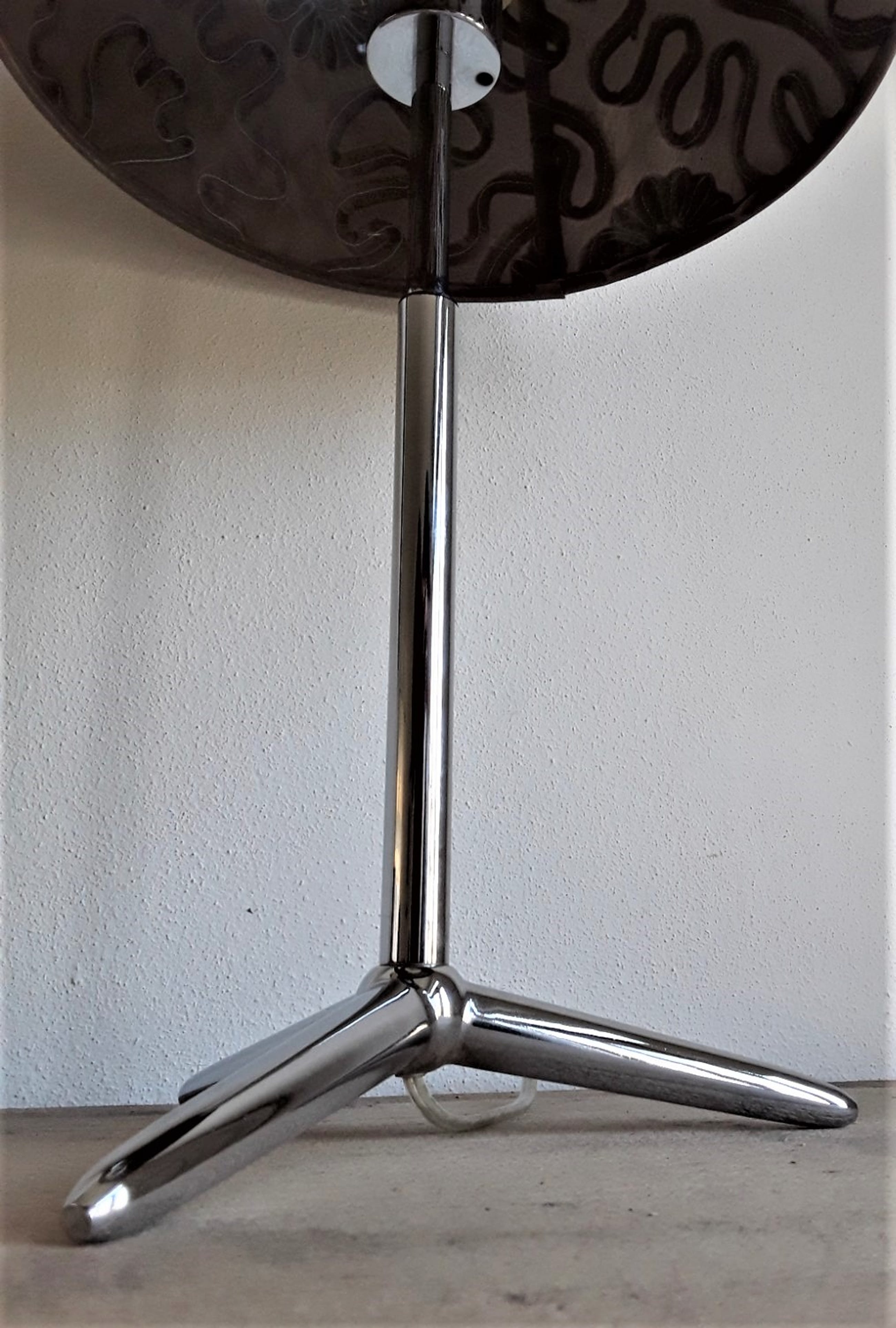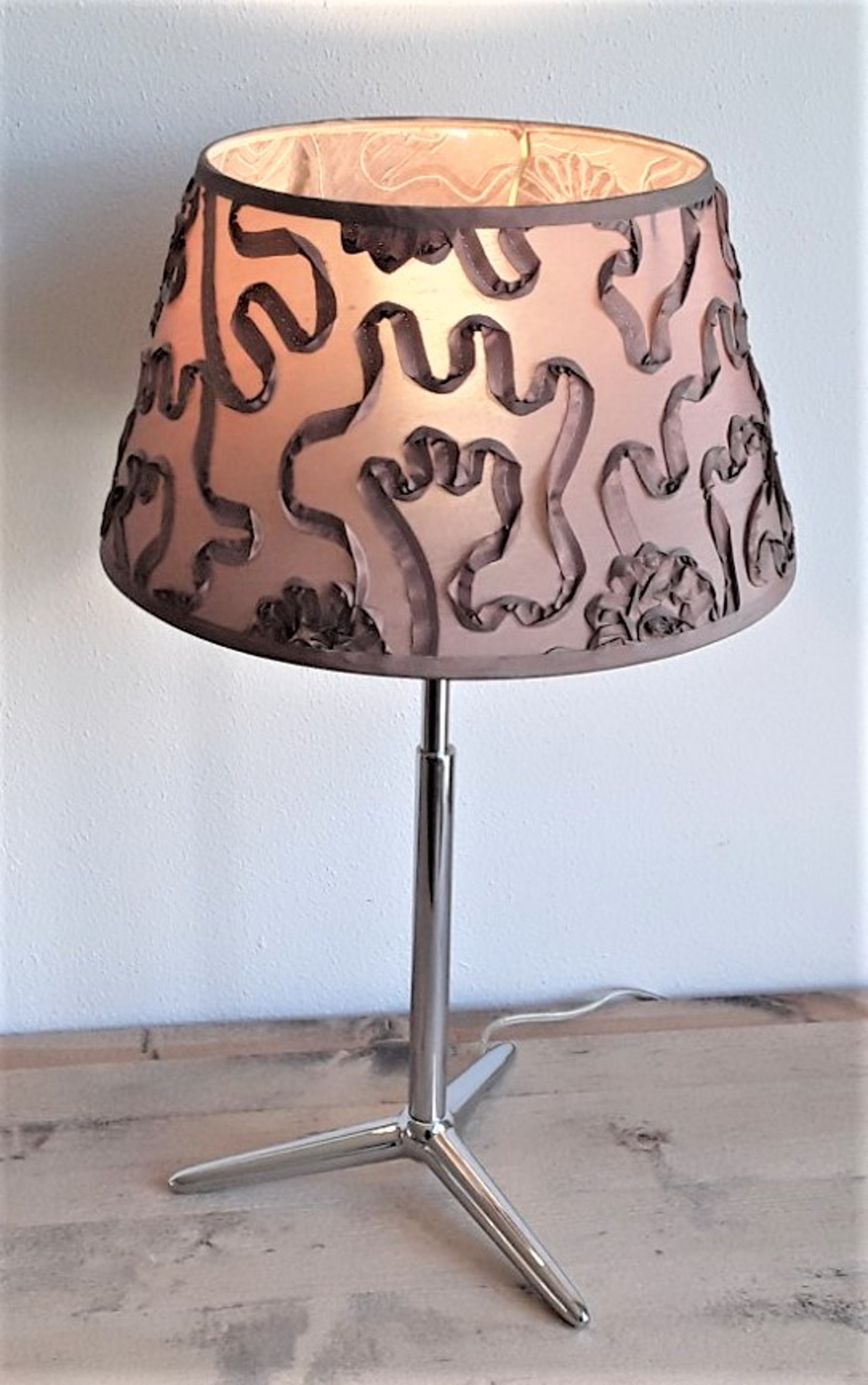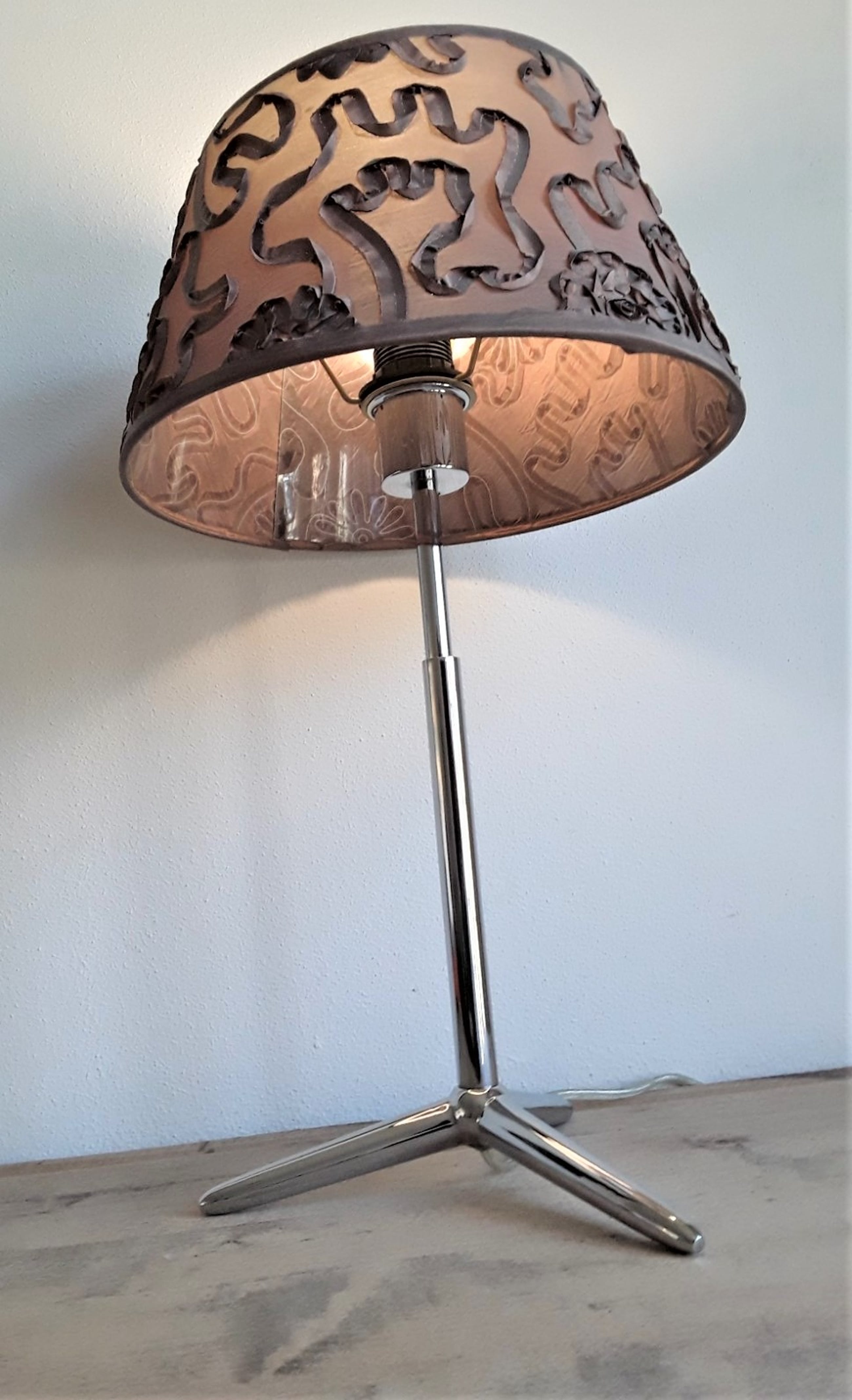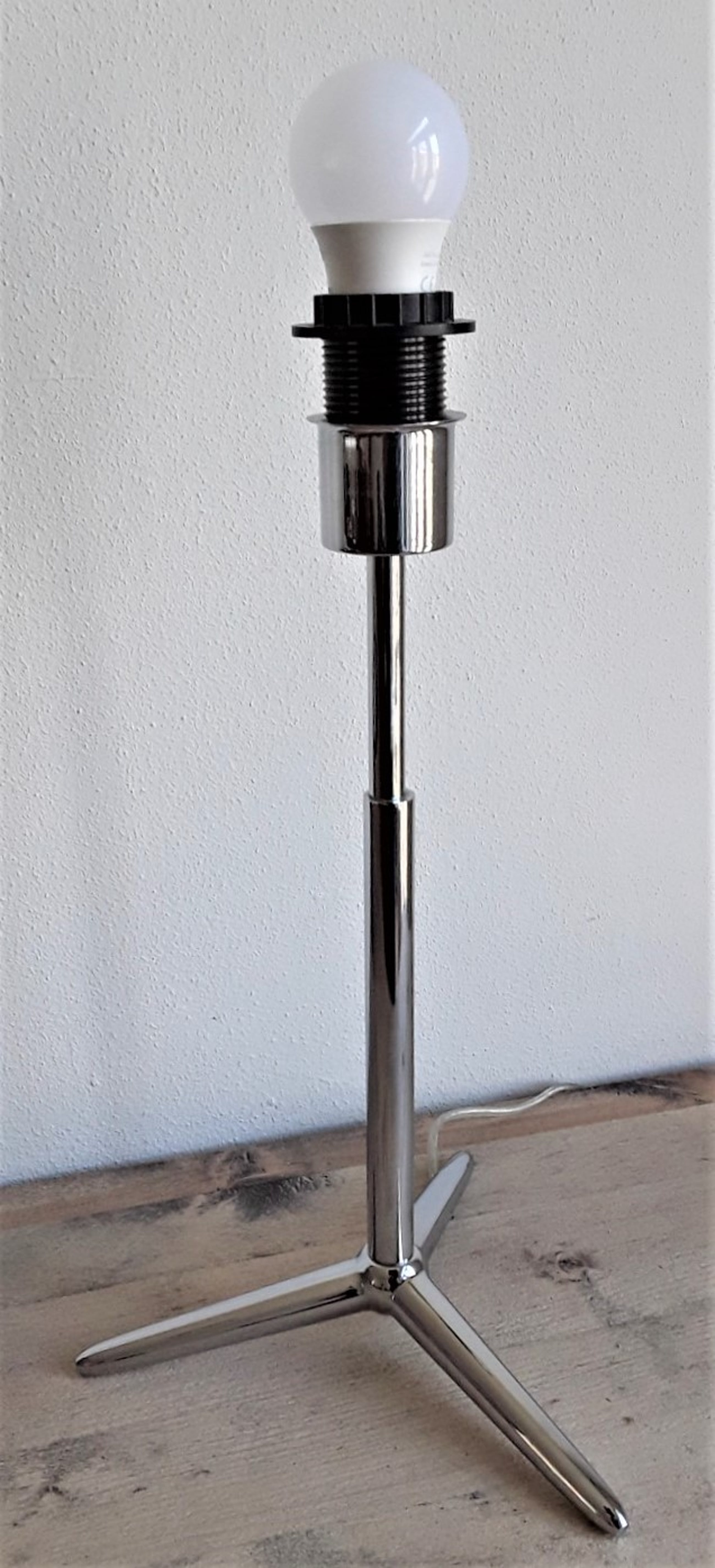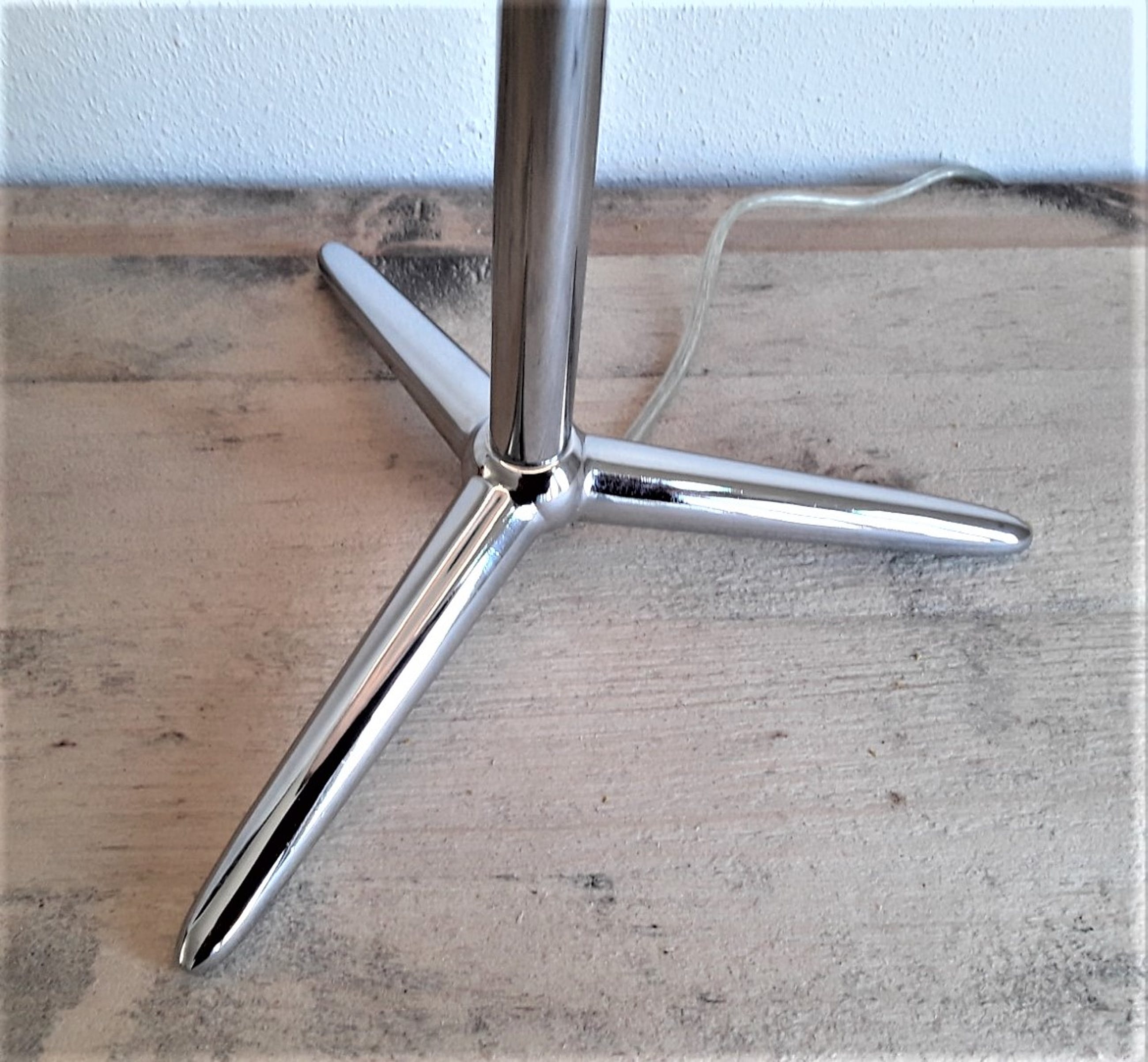 Stijlvolle strak vormgegeven verchroomd metalen tafellamp met artistieke kap. Bijzonder uniek vormgegeven driepotige voet (meestal rond of vier/meerkantig). Model: "Free Flows"