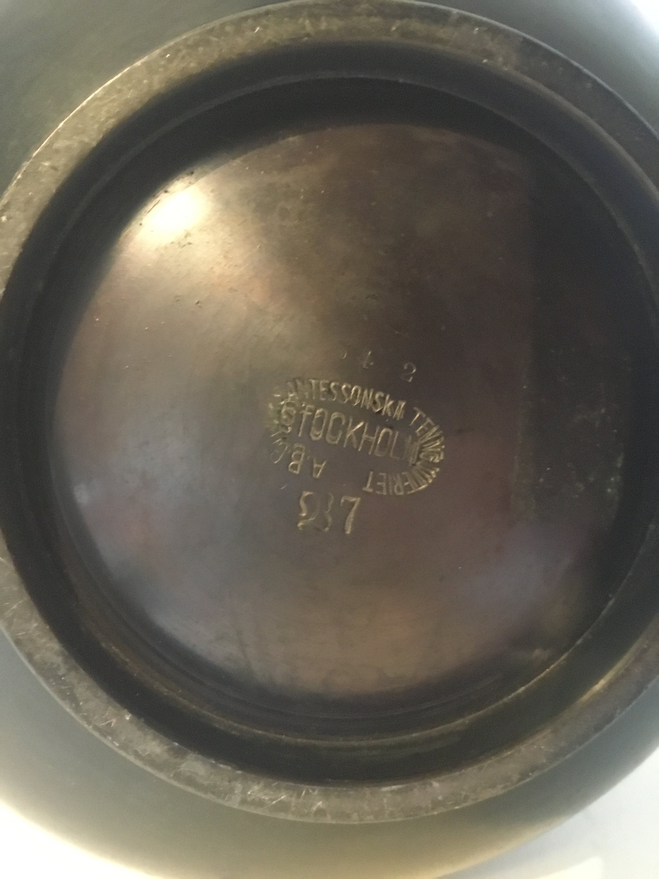 Tinnen vaas uit Zweden van de tingieterij Gambla Santessonska Tenngjuteriet. Deze bekende gieterij heeft bestaan van 1829 tot 1916. Deze vaas is waarschijnlijk het ontwerp van Frans Santesson.