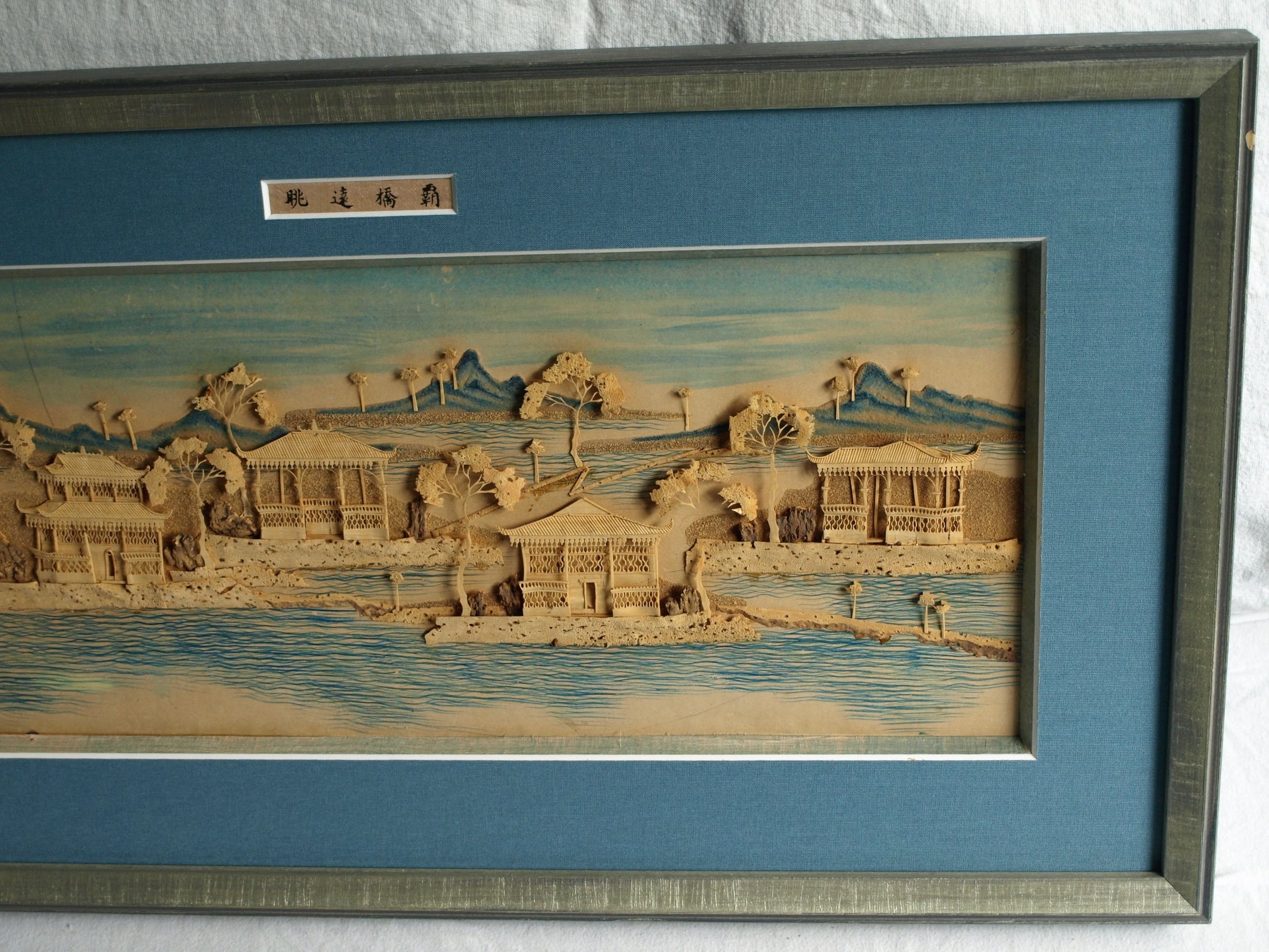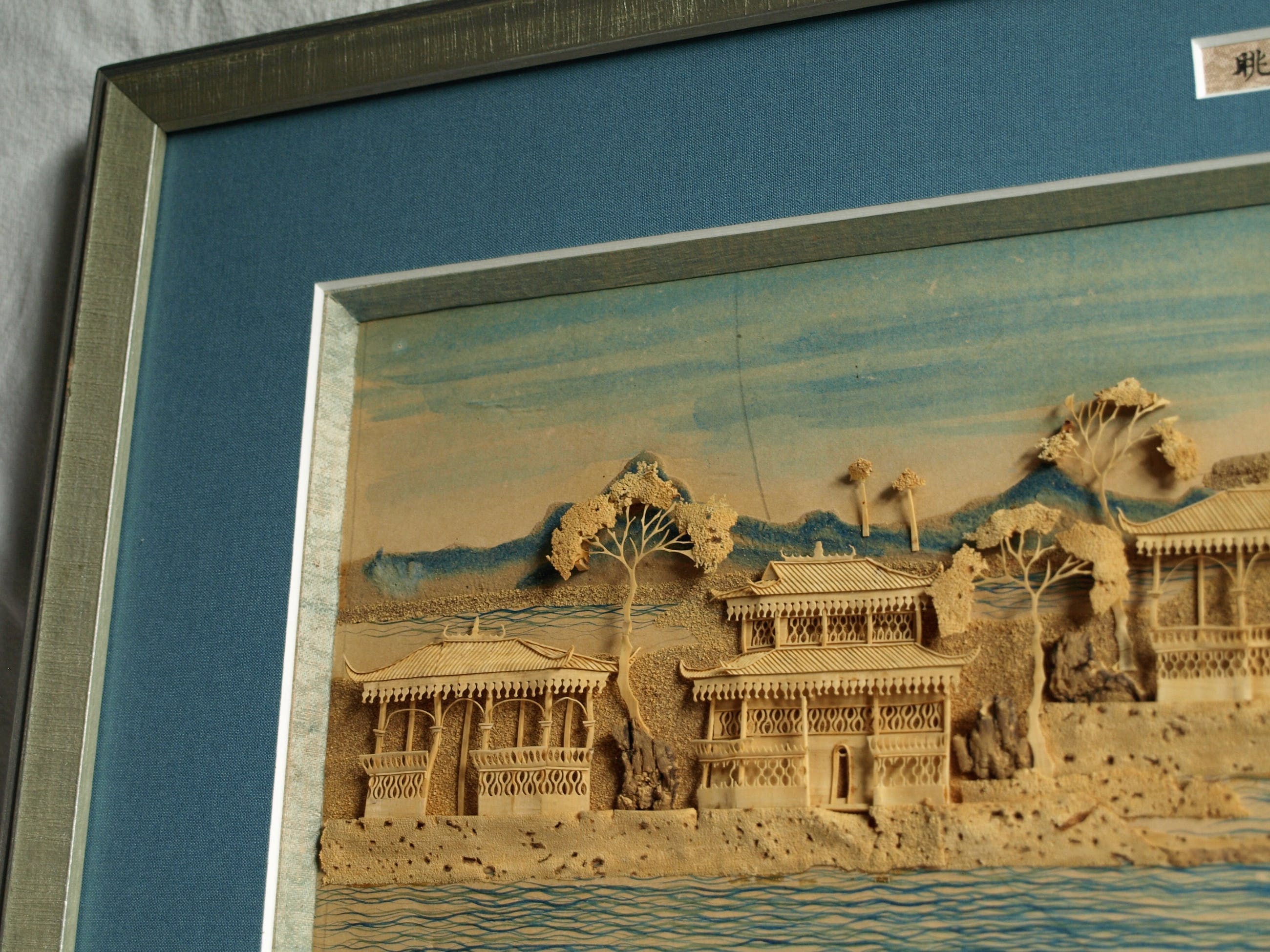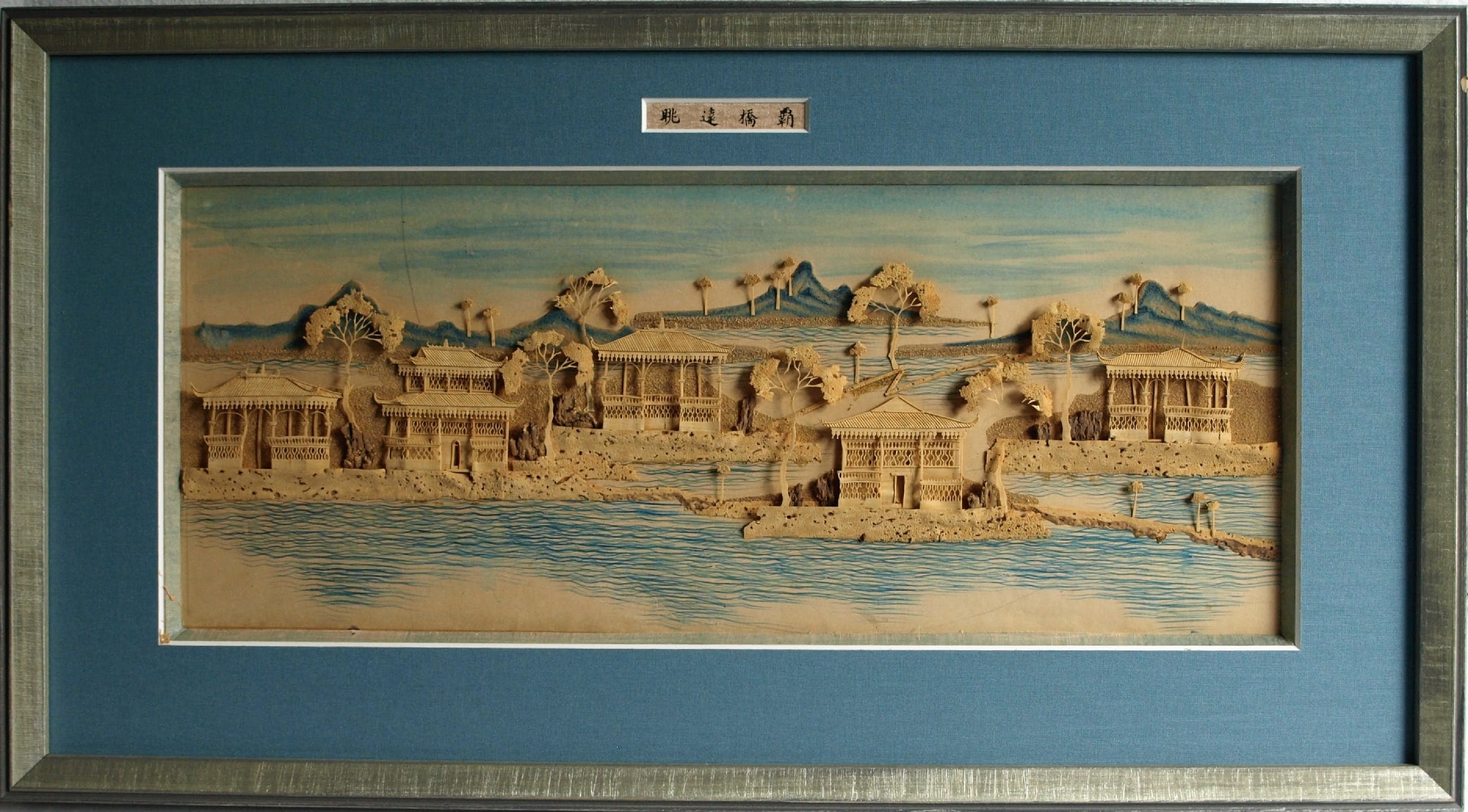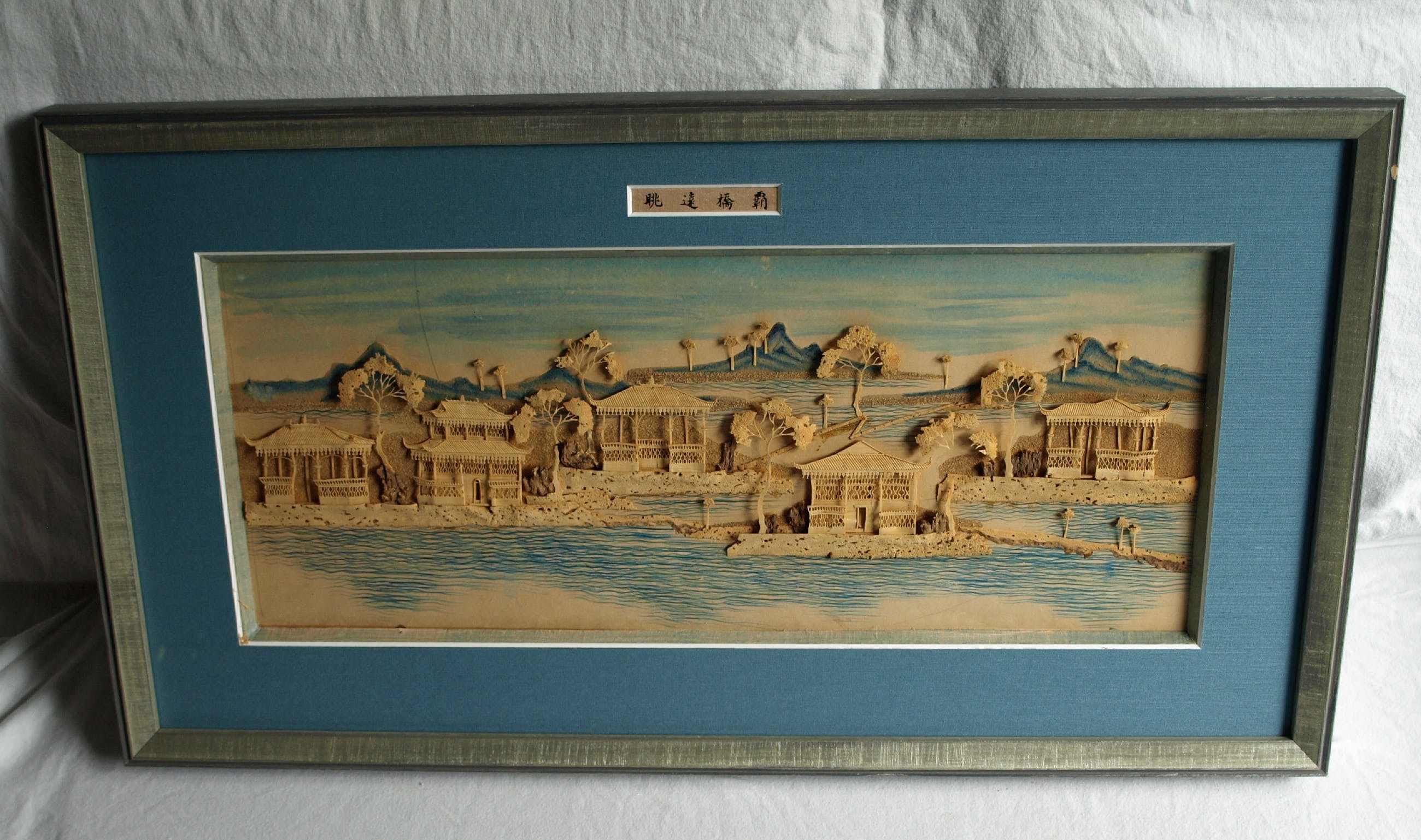 Een Oosterse voorstelling in 3D, uit kurk gesneden, met een geschilderde achtergrond en goed ingelijst door ‘J&L-Lijstenmakerij’ in een houten lijst met een dik passe-partout en een glasplaat van museumglas.