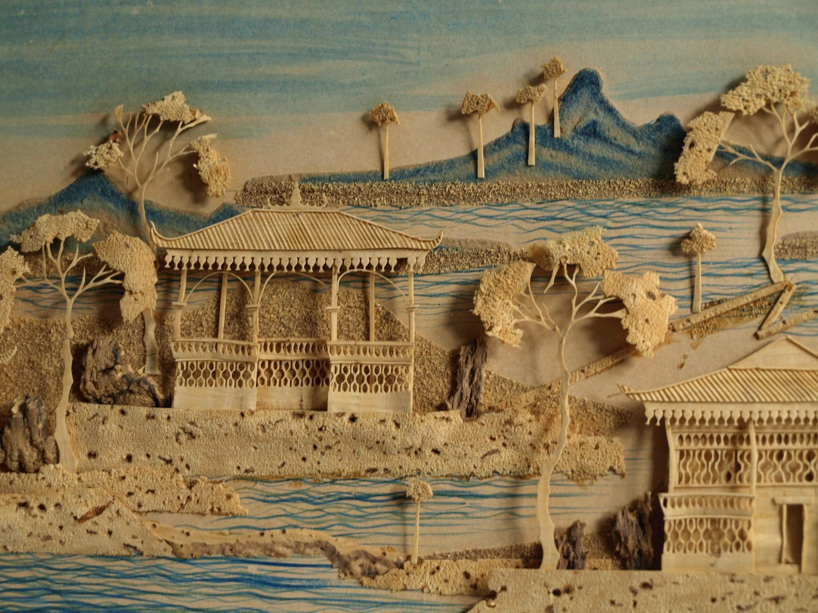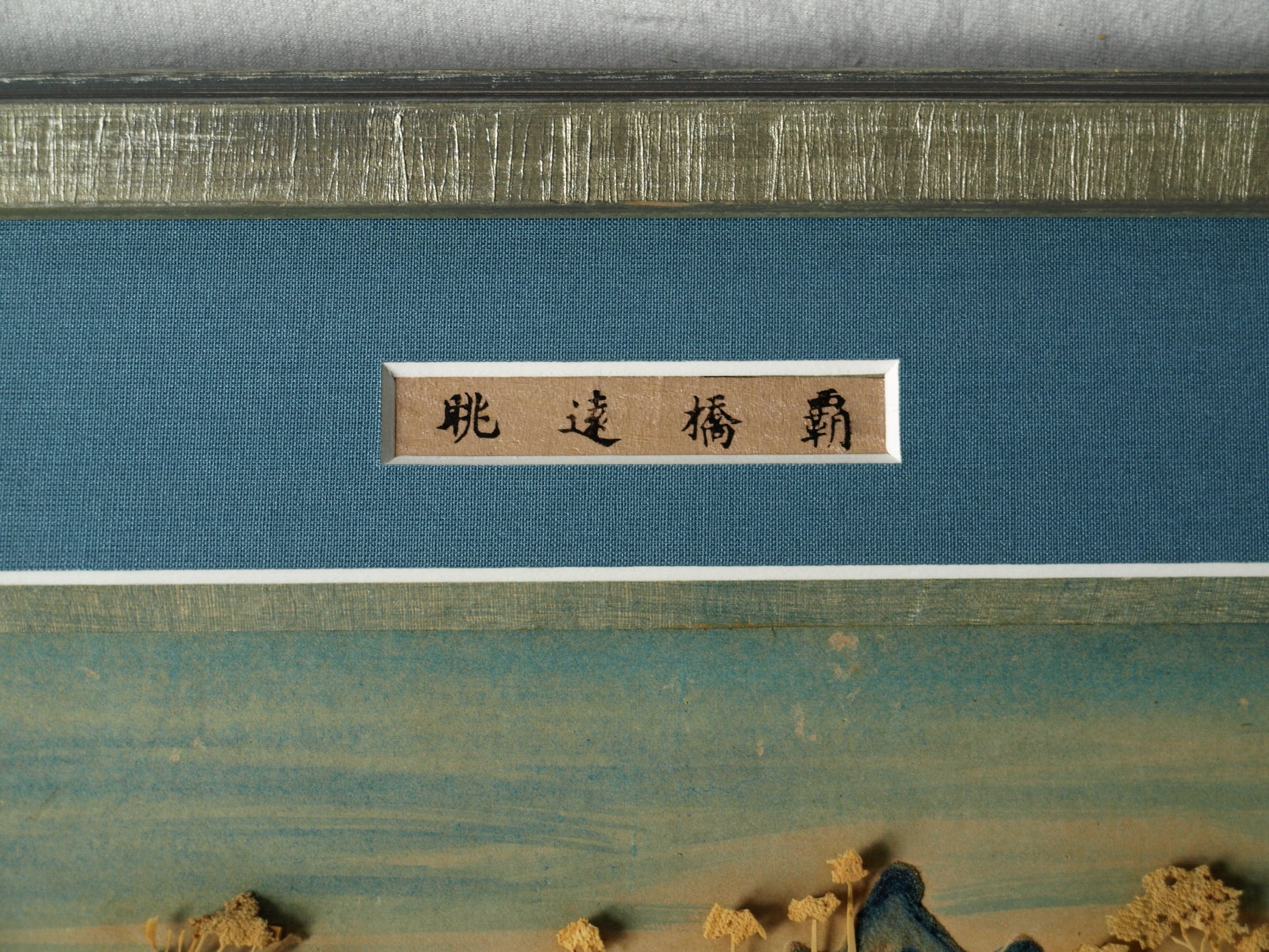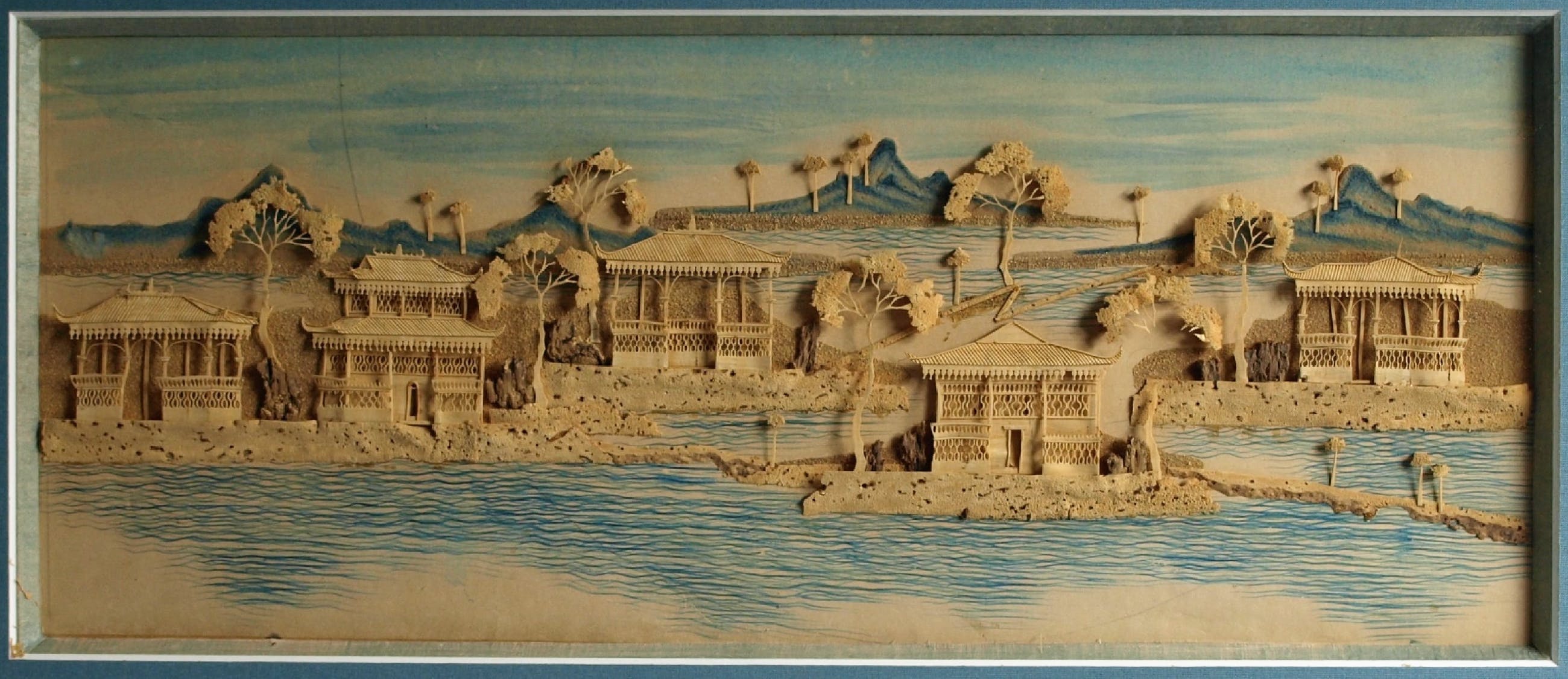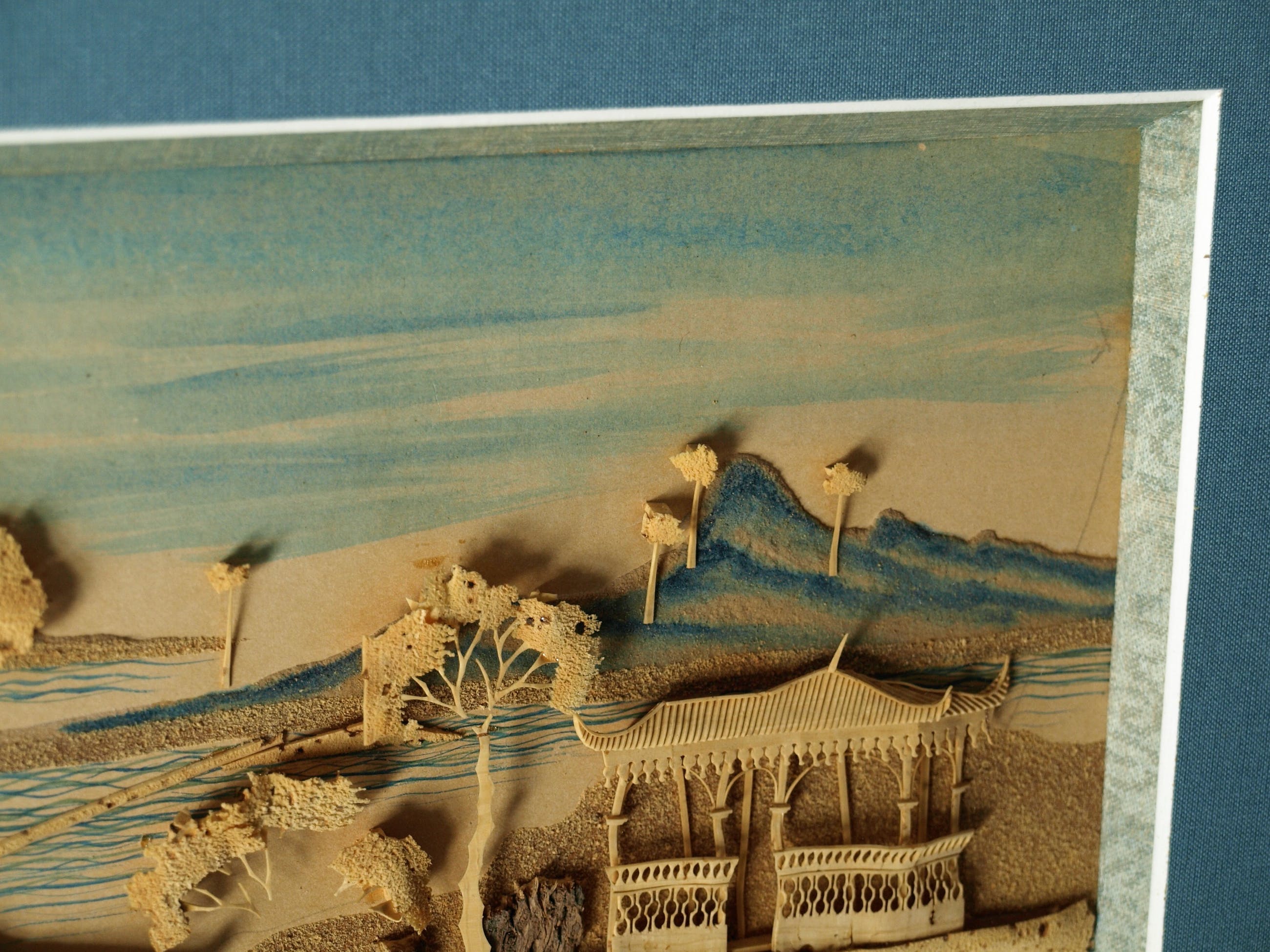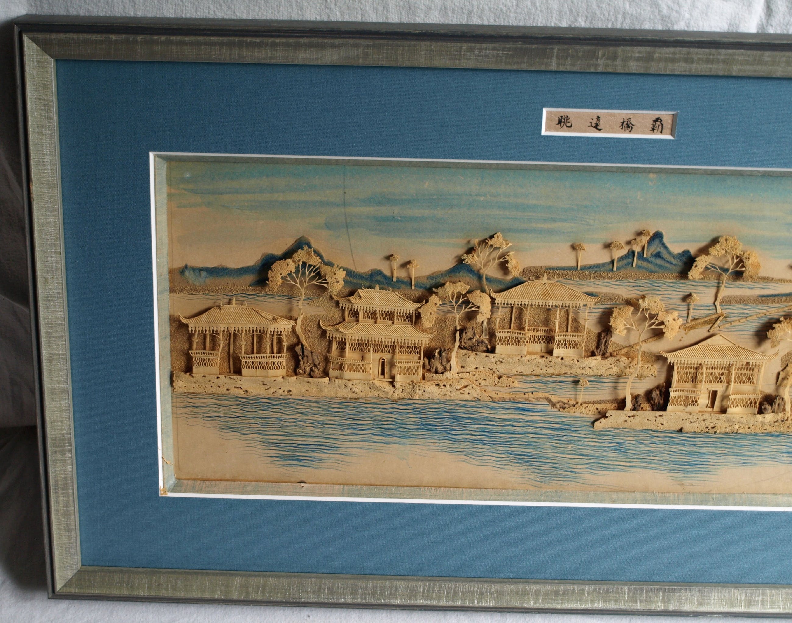 Een Oosterse voorstelling in 3D, uit kurk gesneden, met een geschilderde achtergrond en goed ingelijst door ‘J&L-Lijstenmakerij’ in een houten lijst met een dik passe-partout en een glasplaat van museumglas.