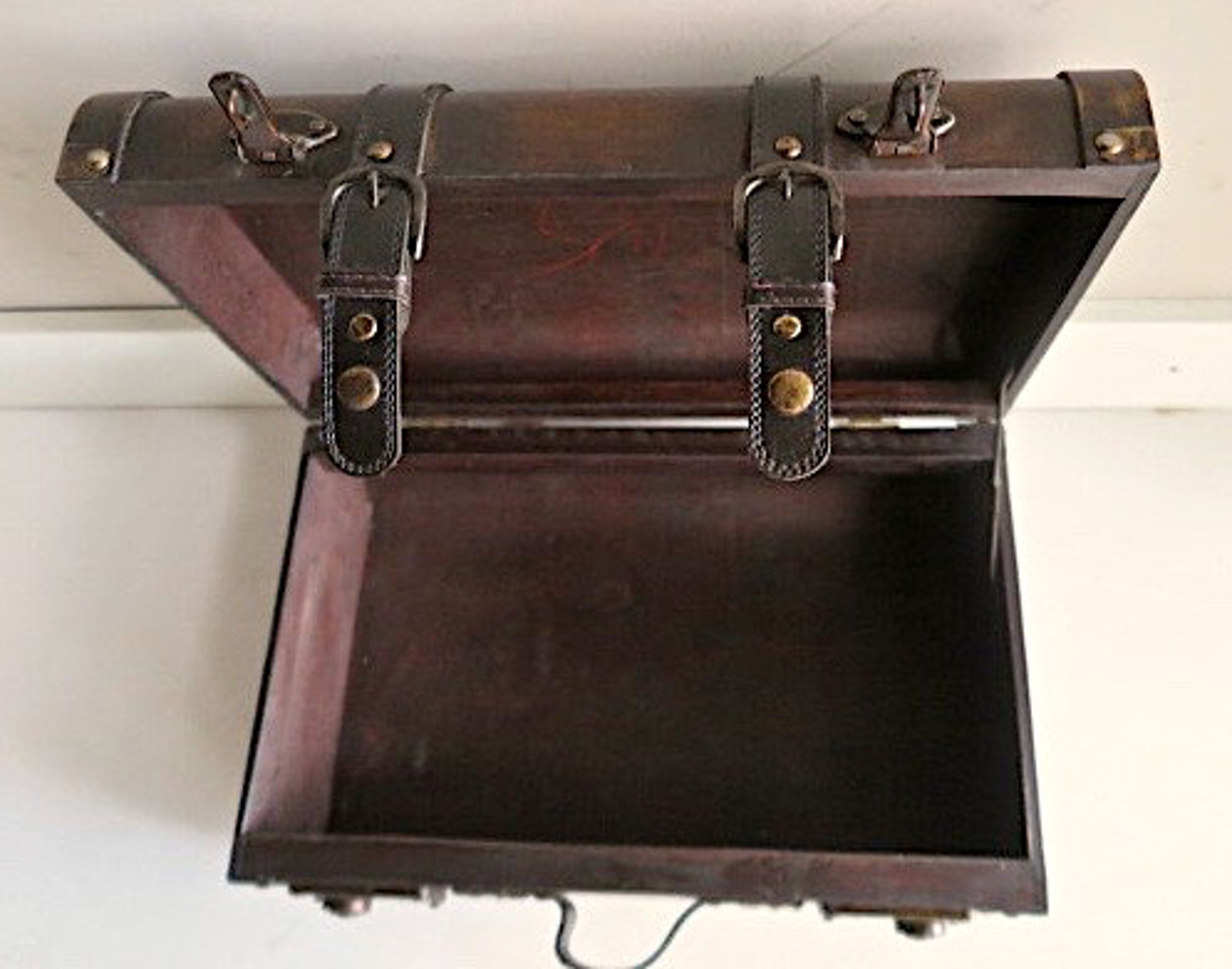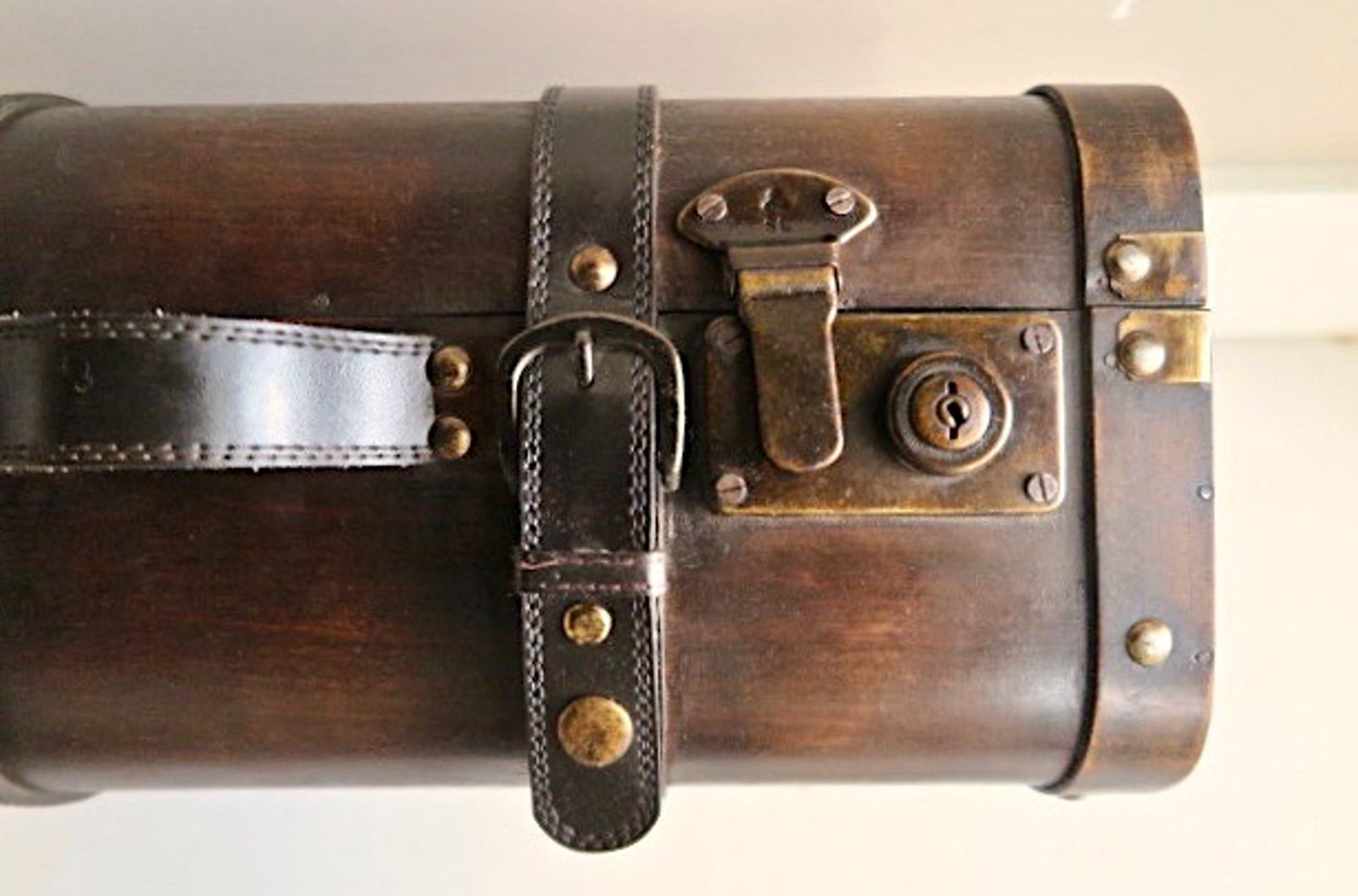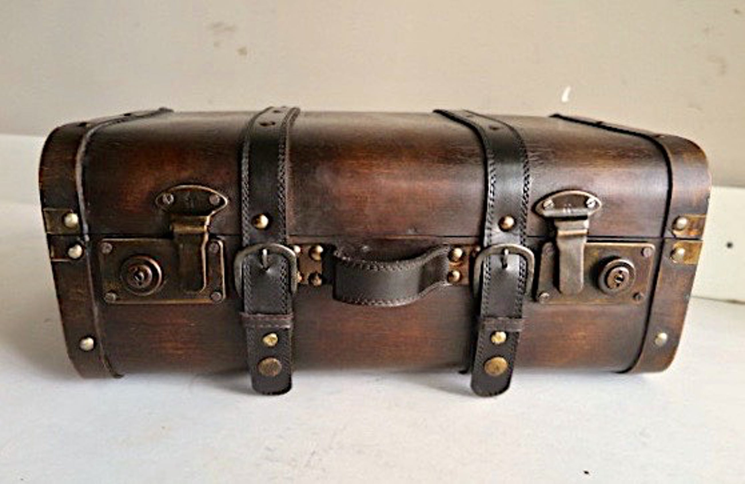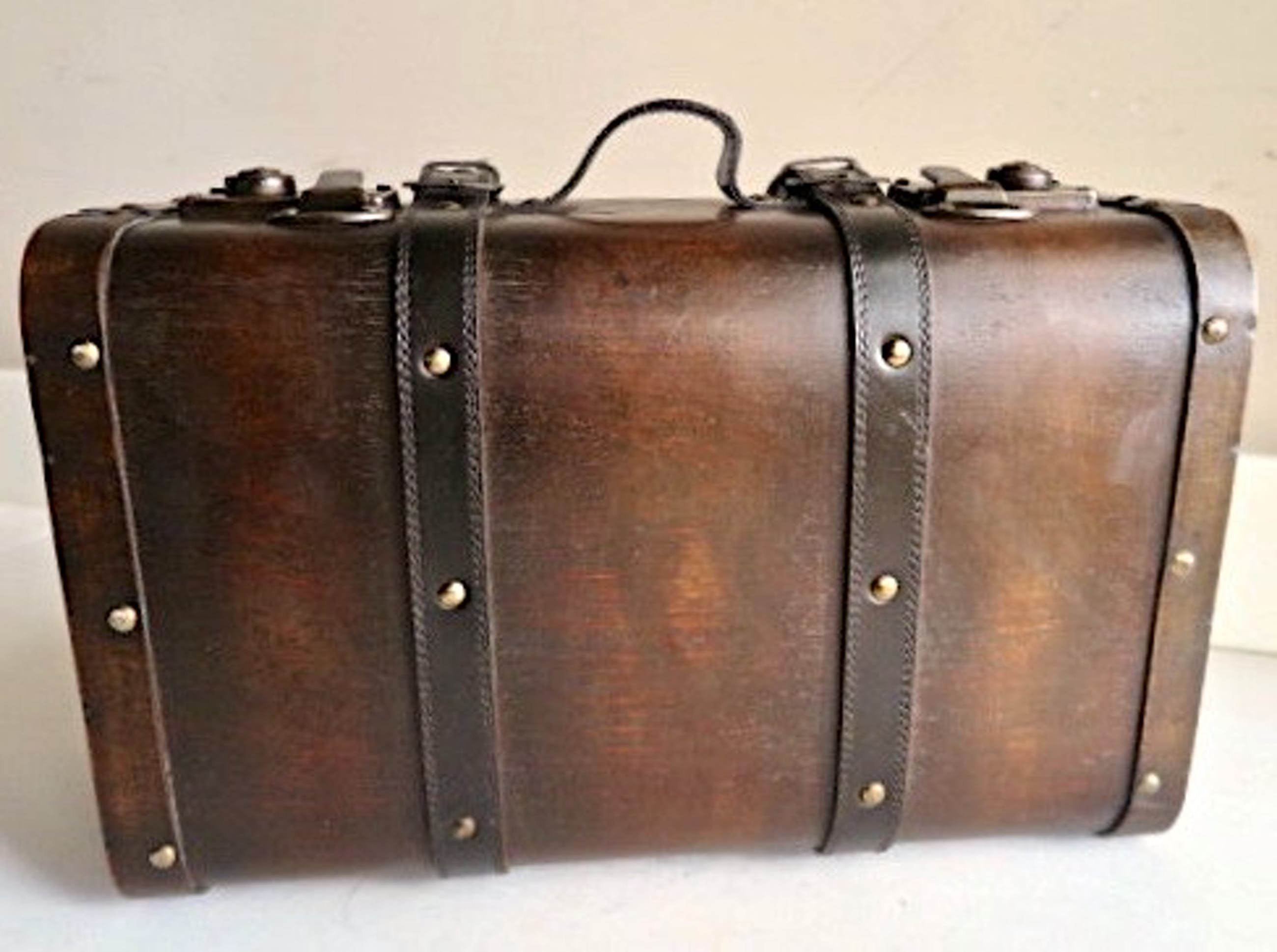 1 ) Reiskoffer, mooie bolle donker houten uitvoering - met originele goed werkende messing beslag en skai riemen met druksluitingen - messing sierpinnen - met messing openhoud stand - 41 x 26 x 18 cm - in fraaie nette vintage staat