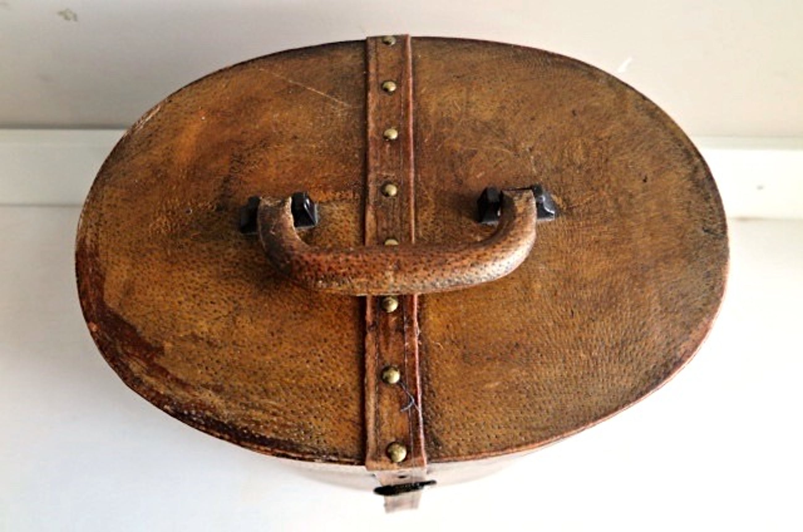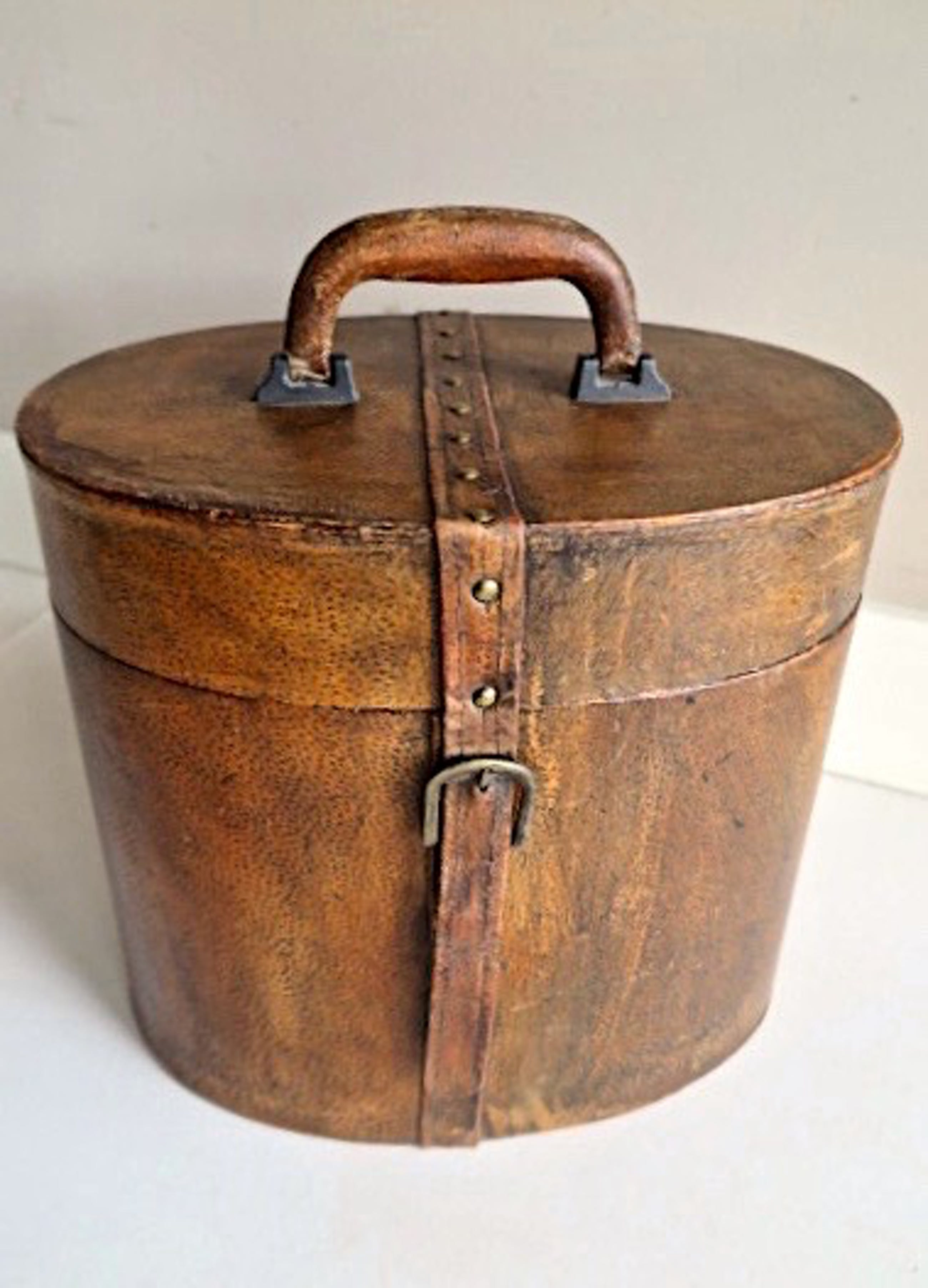 2 ) Grote ovale beautycase/opbergkist/hoedenkoffer - hoog ovaal model - hout net echt leer bekleed- stevige leder+houten greep - lederen riem met messing sierpinnen en druksluiting - binnenzijde is gevoerd met dunne zachte bordeauxrode velourstof - 34 x 29 x 25 cm - in fraaie vintage staat met doorleefde lederen uitstraling, kleine gebruikssporen