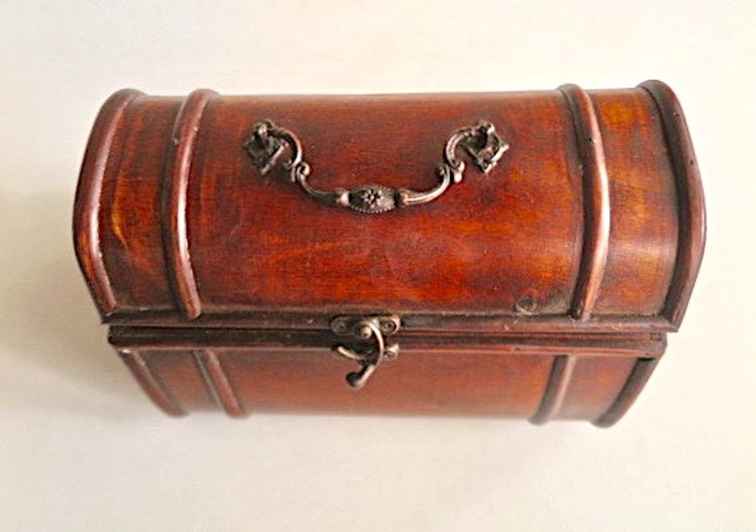5) Hutkoffertje - Hout - fraai reiskistje met fijn bewerkt messing handgreep - messing beslag en haaksluiting - 25 x 18 x 17 cm - in zeer goede vintage staat
