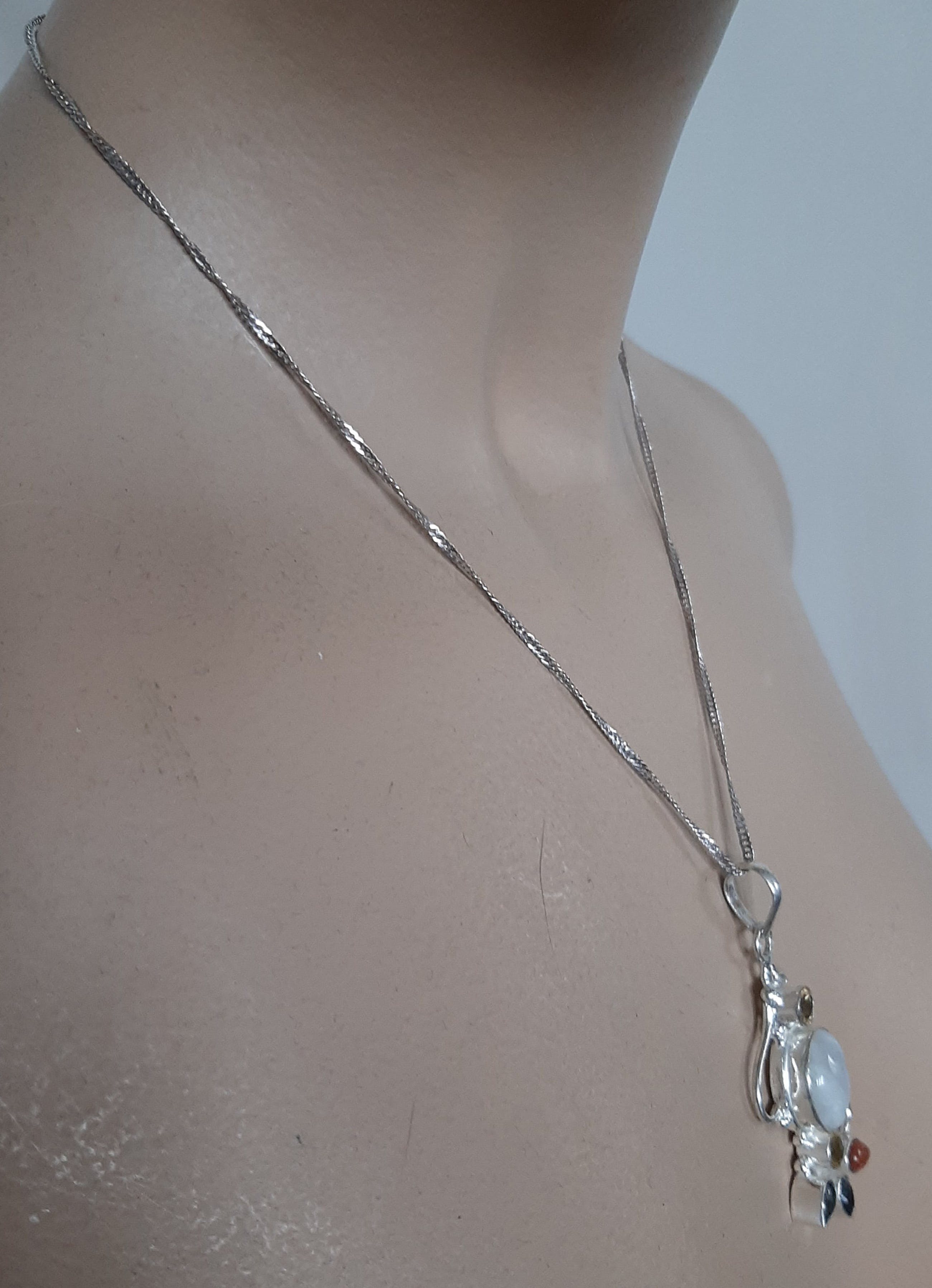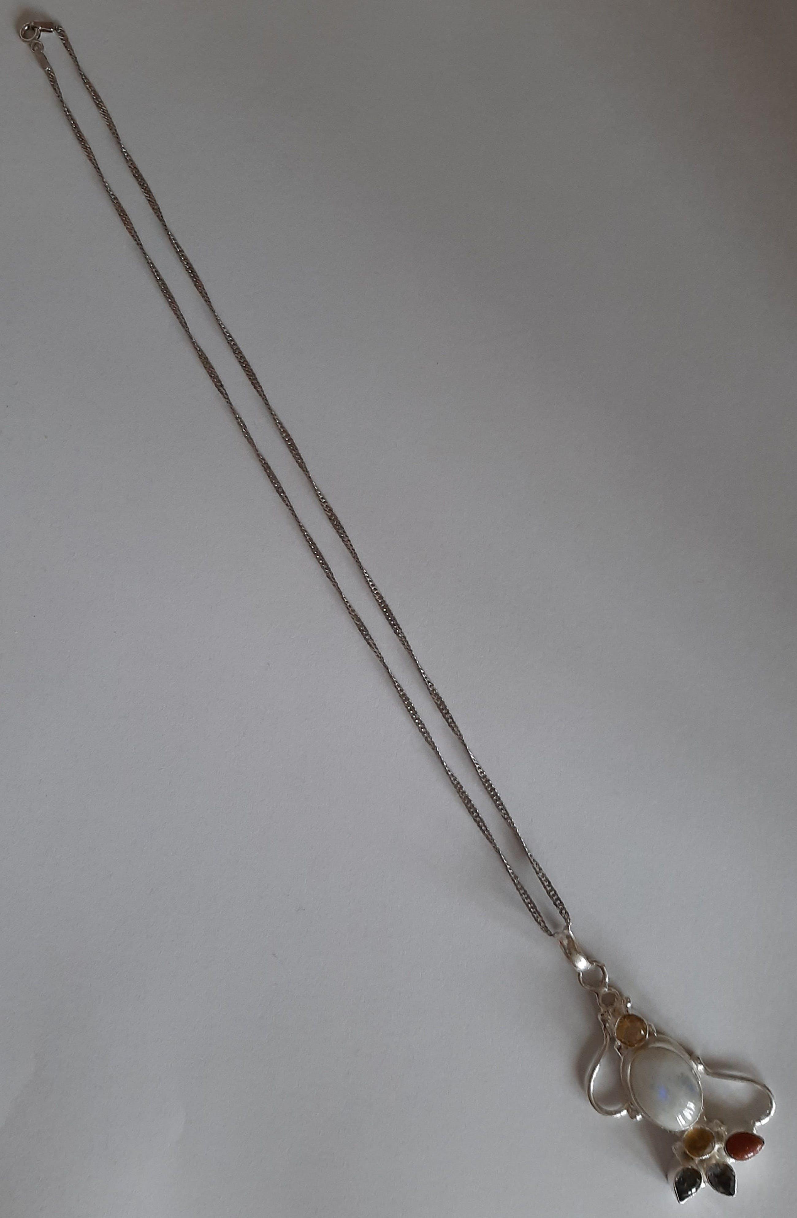 Ketting 59 cm lang en hanger 6 x 3 cm in perfecte staat. Ketting gemerkt 925, hanger gemerkt 925. Hanger met Regenboog Maansteen,toermalin en citrin Erg mooi zomerse stijl.