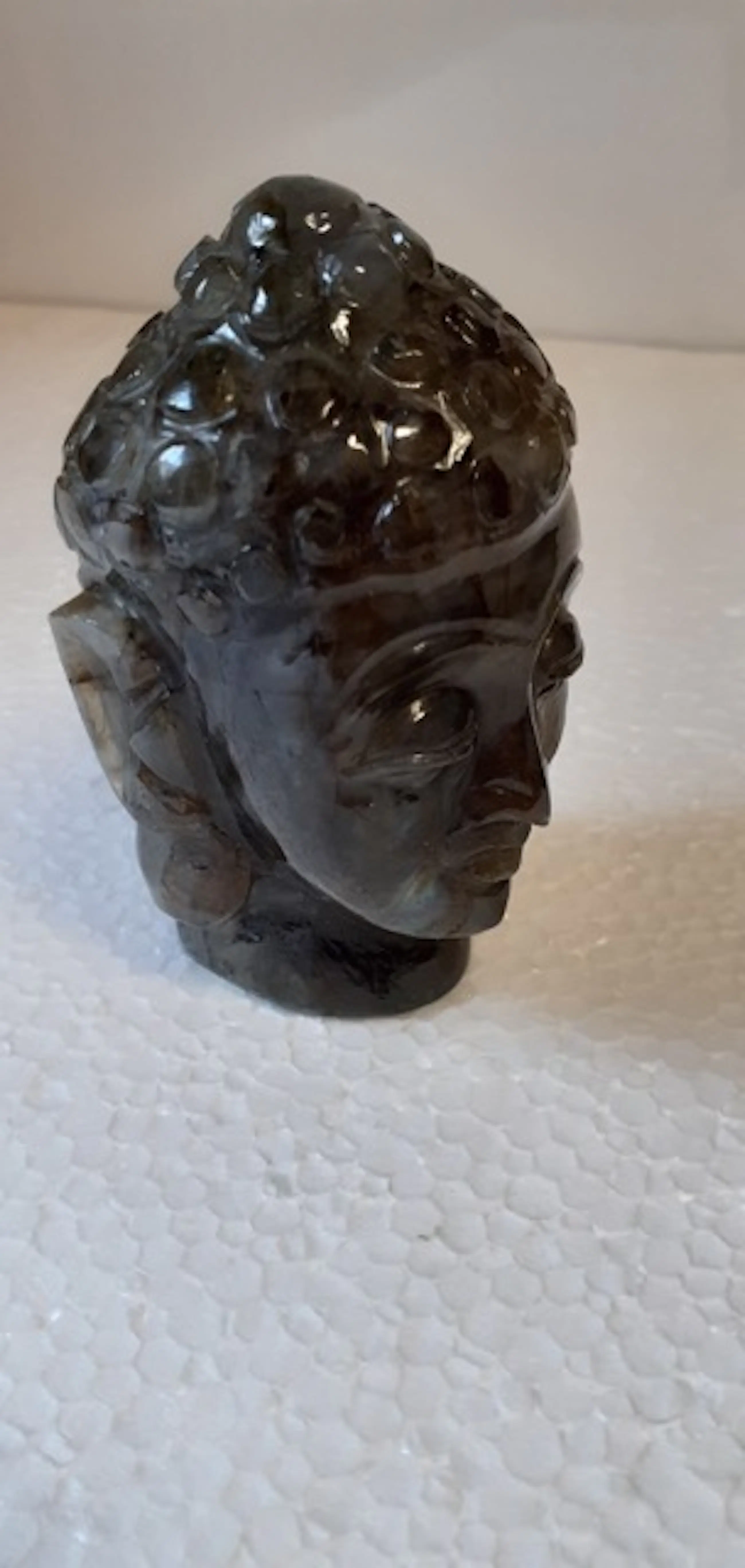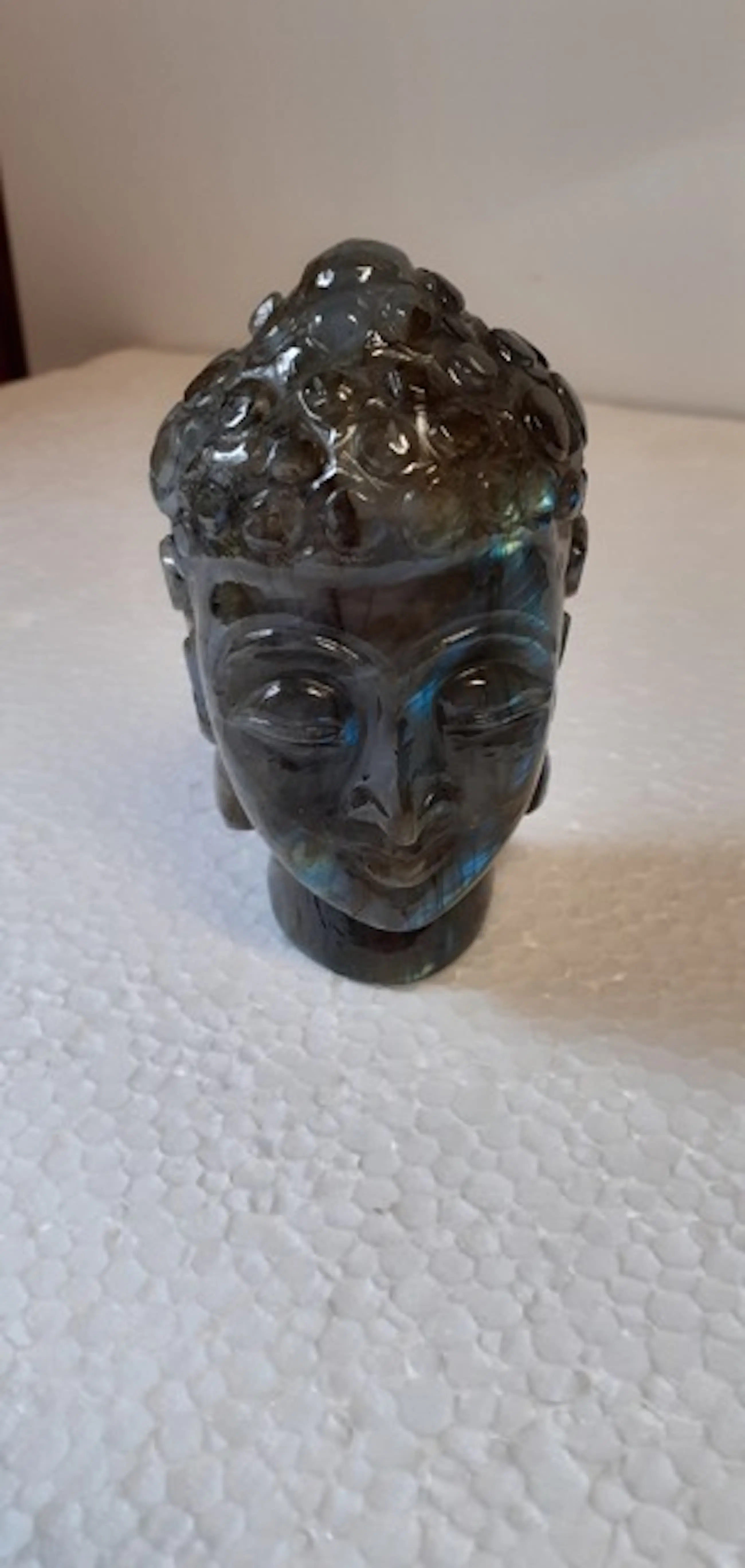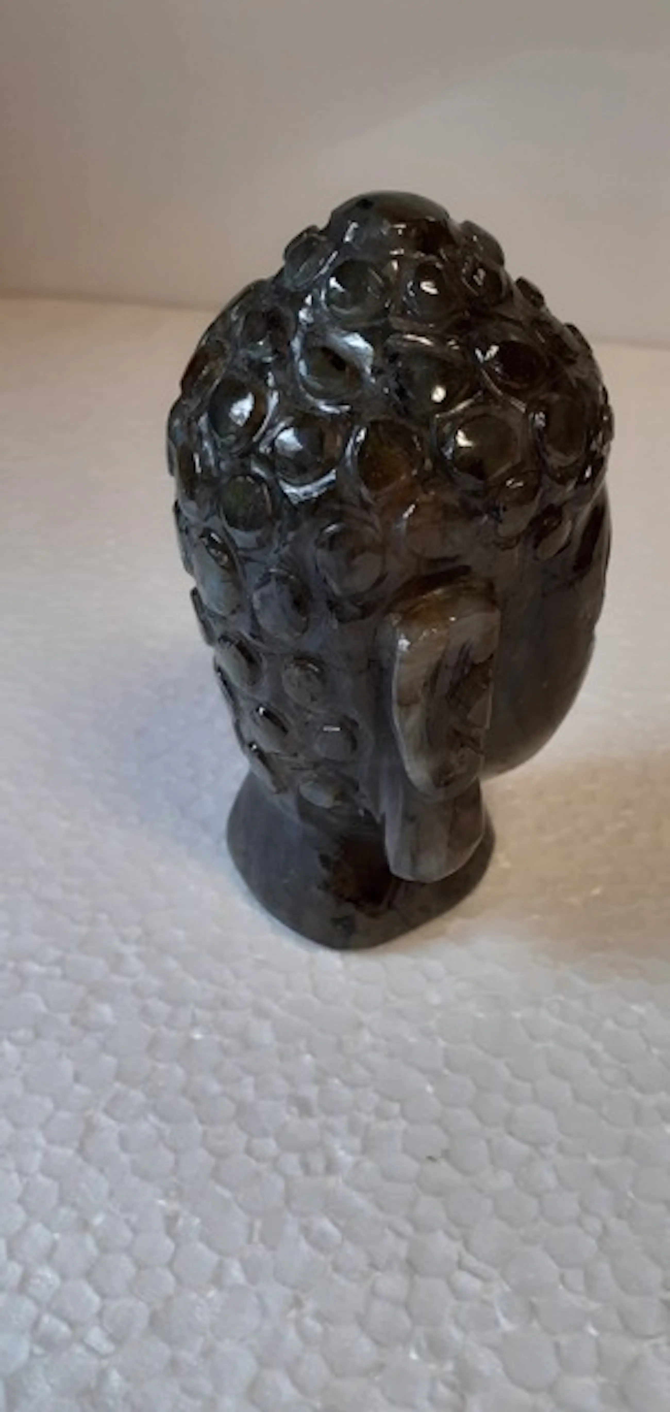 Afmetingen 11.6 x 7 x 7 cm Info Groot Vintage Handgemaakt Boedha Hoofd van Labradoriet uit India, 1970 430 gram