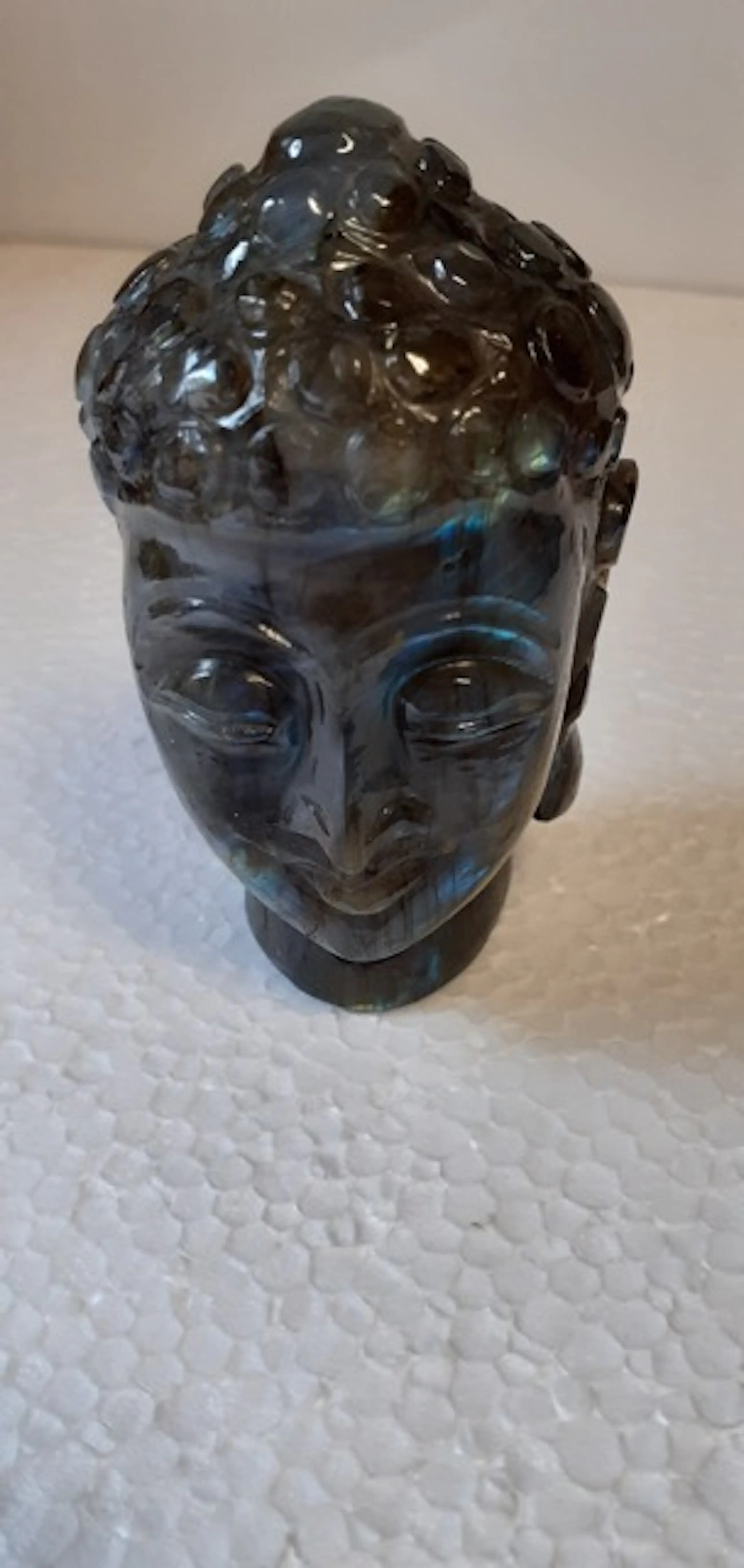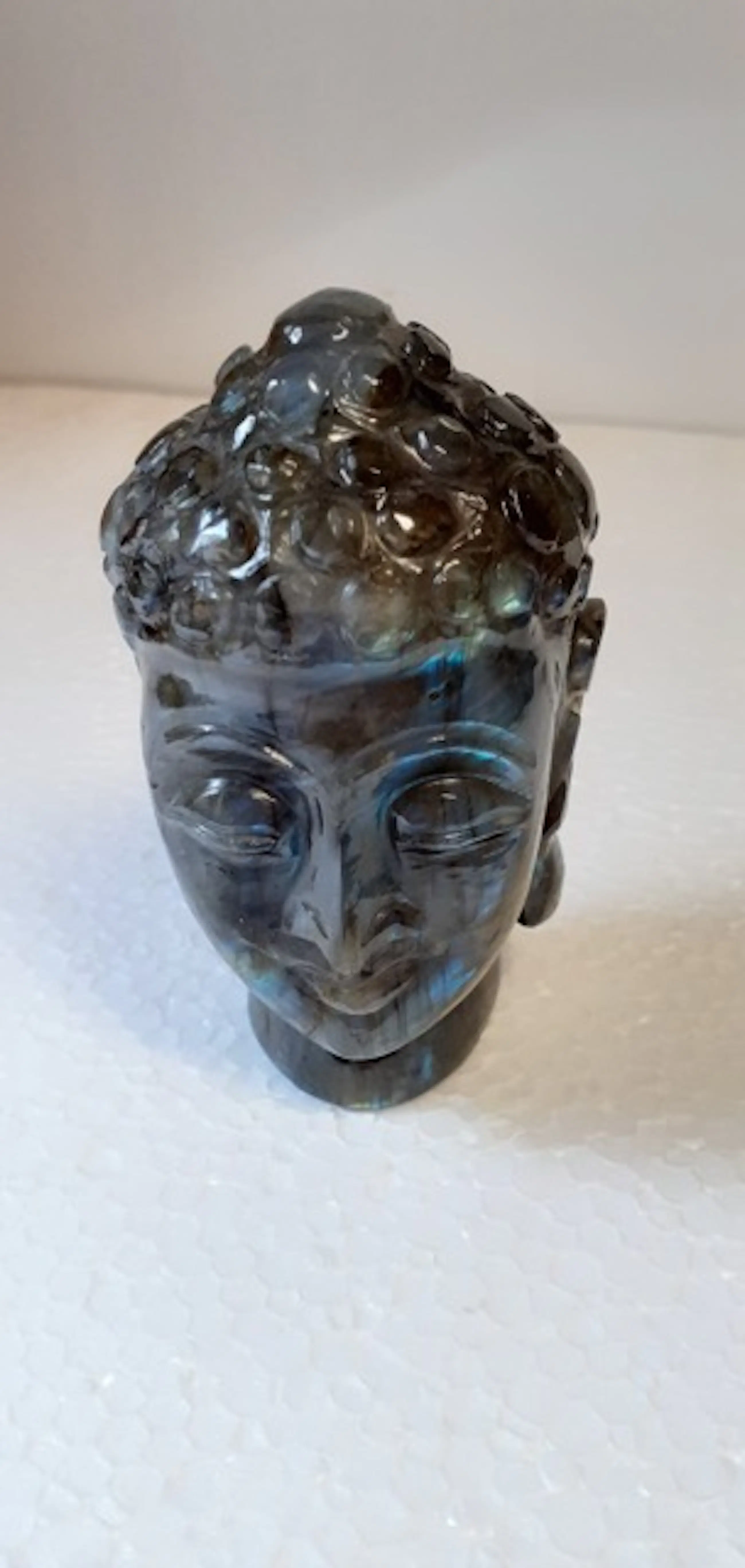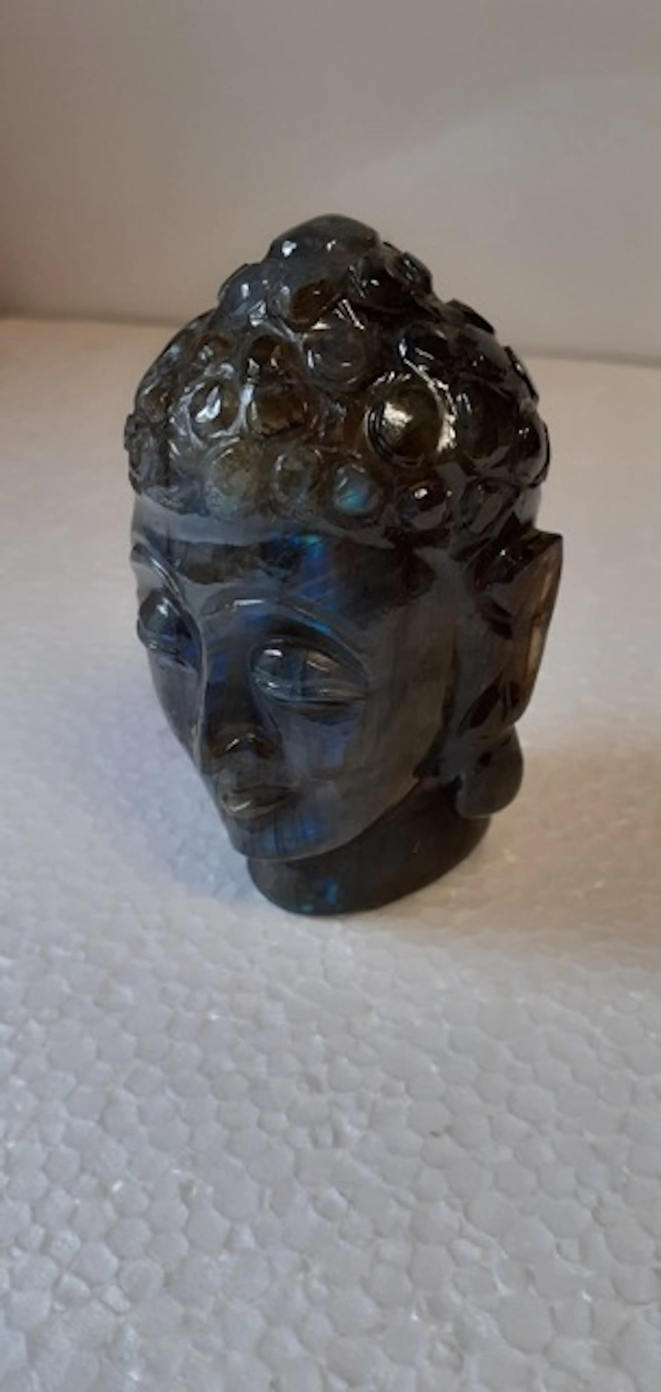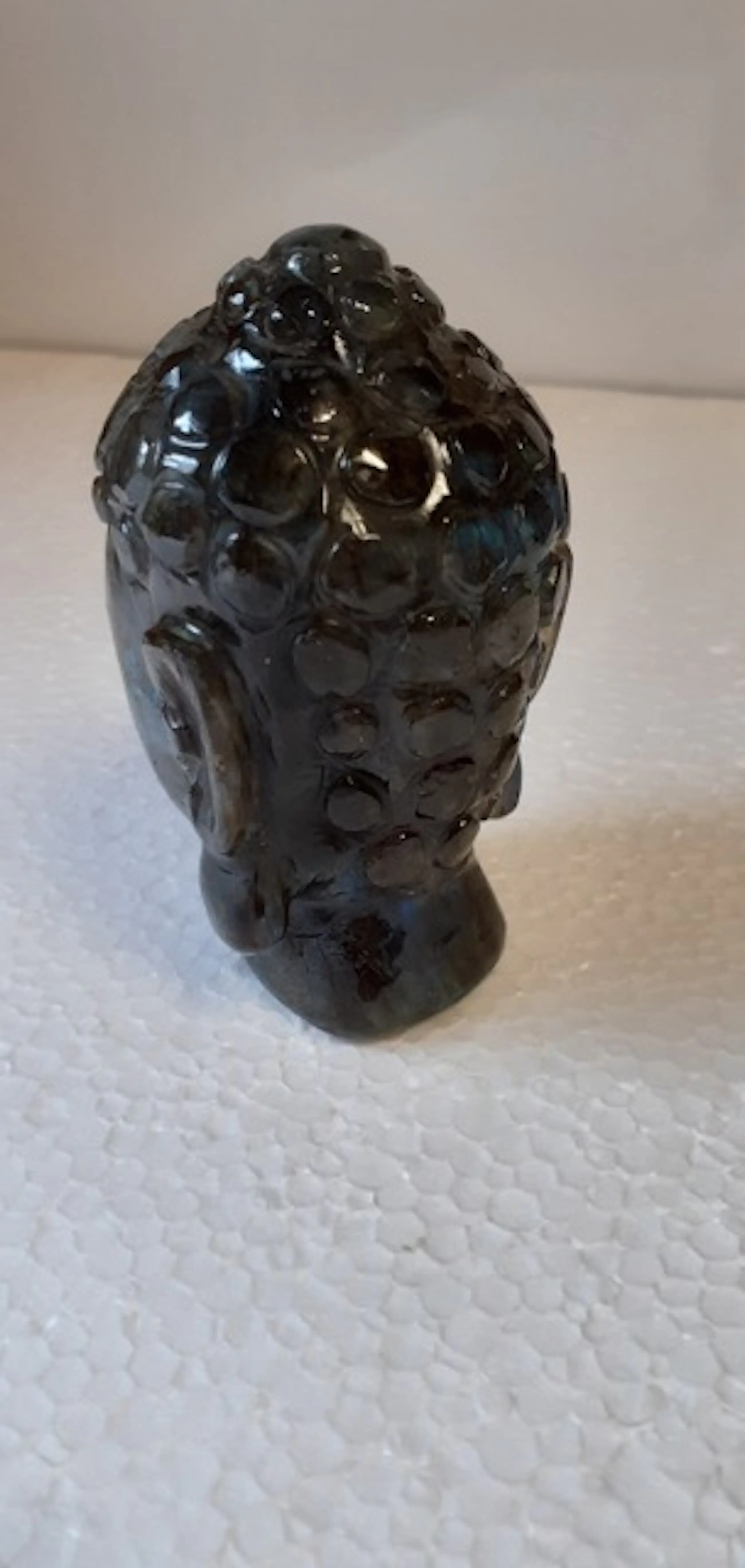 Afmetingen 11.6 x 7 x 7 cm Info Groot Vintage Handgemaakt Boedha Hoofd van Labradoriet uit India, 1970 430 gram