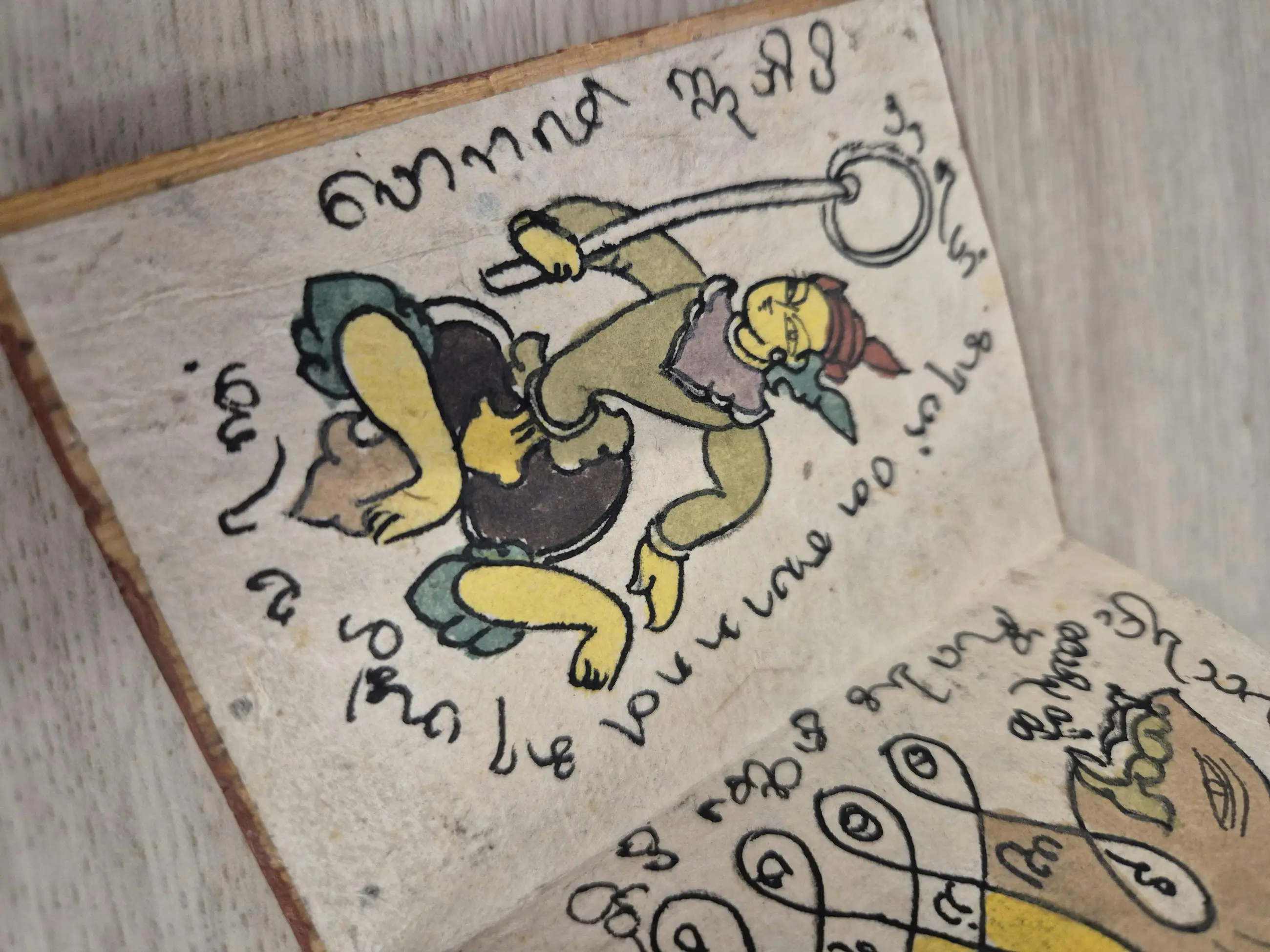 Een Burmese Tattoo Parabaik, een boekje vol met de mooiste tekeningen. Dat betekent niet per se dat het voor tatoeages werd gebruikt, maar het is een soort magisch boekje dat werd gebruikt voor rituele tatoeages (of beschilderingen op het lichaam) of bij begeleiding bij spirituele beschermingsrituelen.