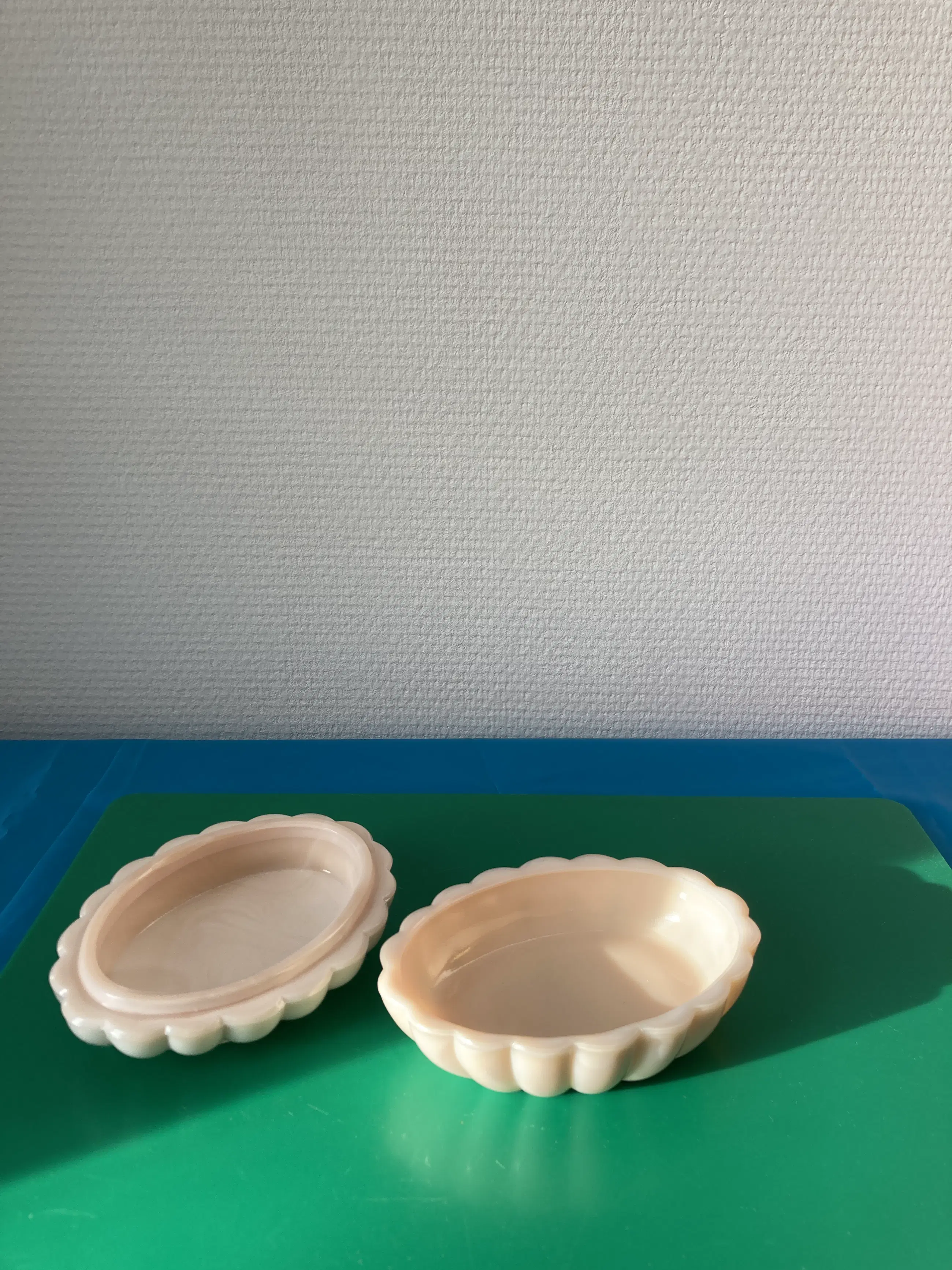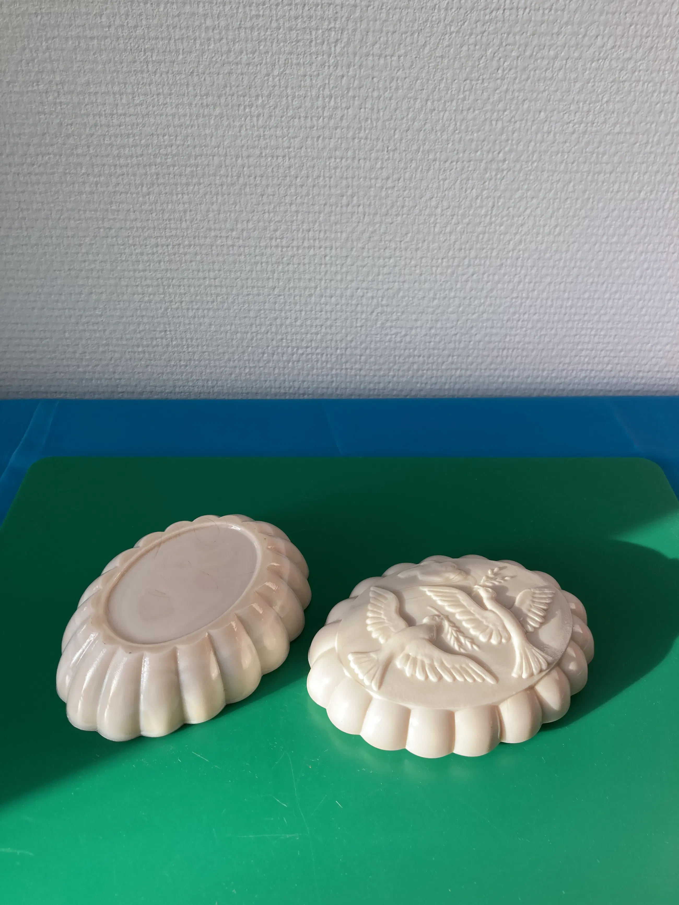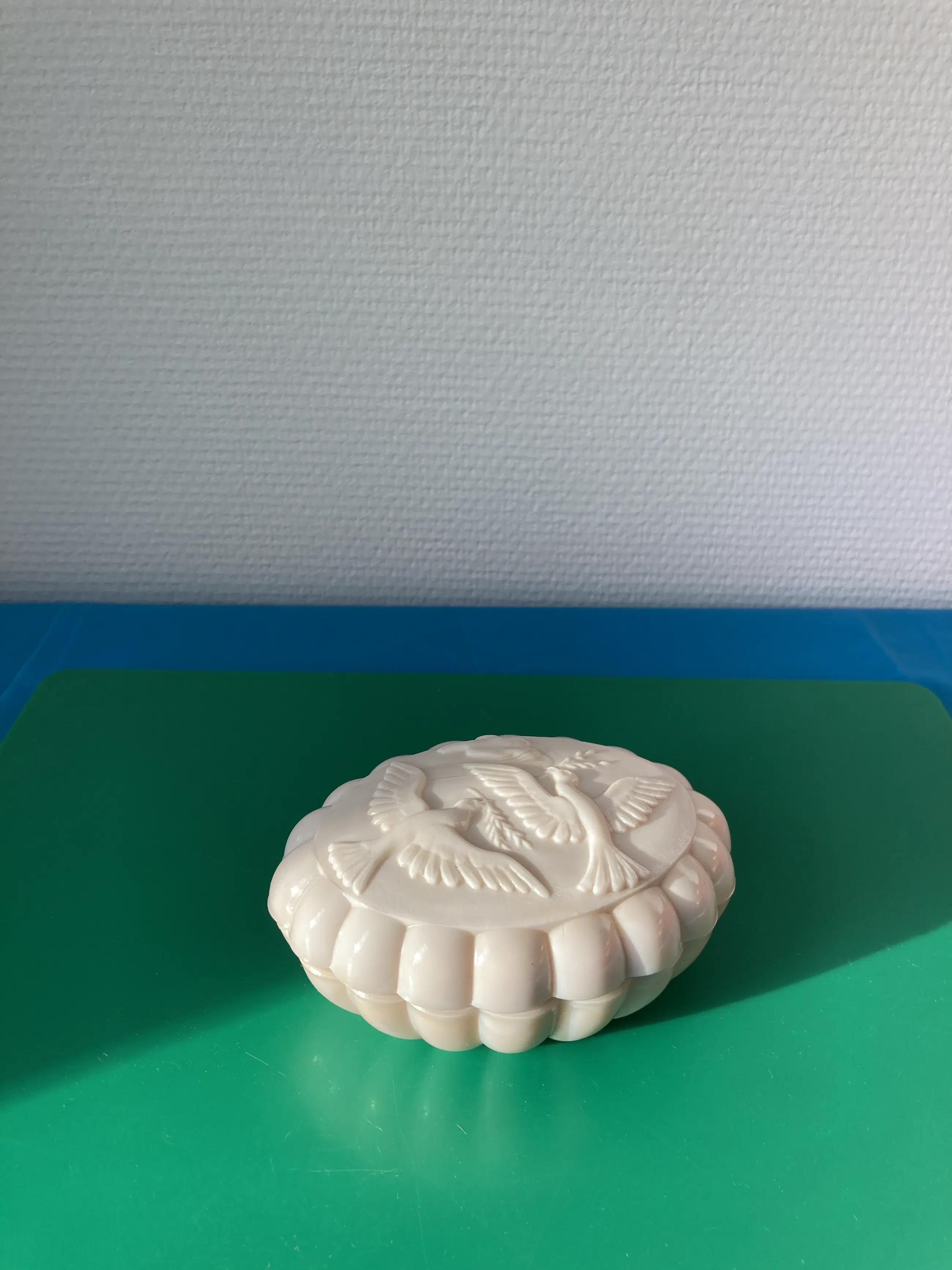 Een door Curt Schlevogt ontworpen zeepdoosje uit geperst glas/persglas/melkglas voor Nina Ricci. Geen enkele beschadiging. Art Deco-stijl.