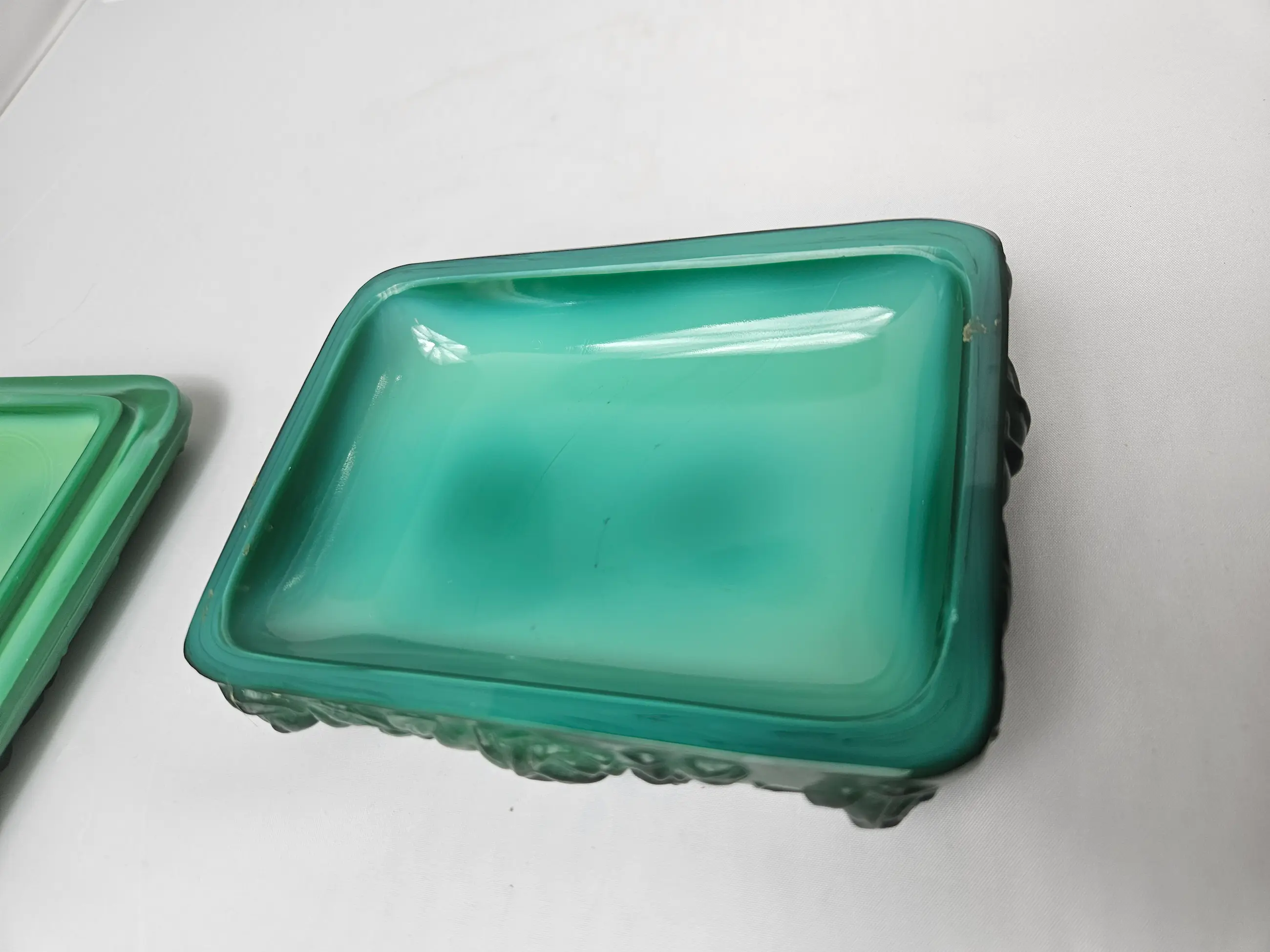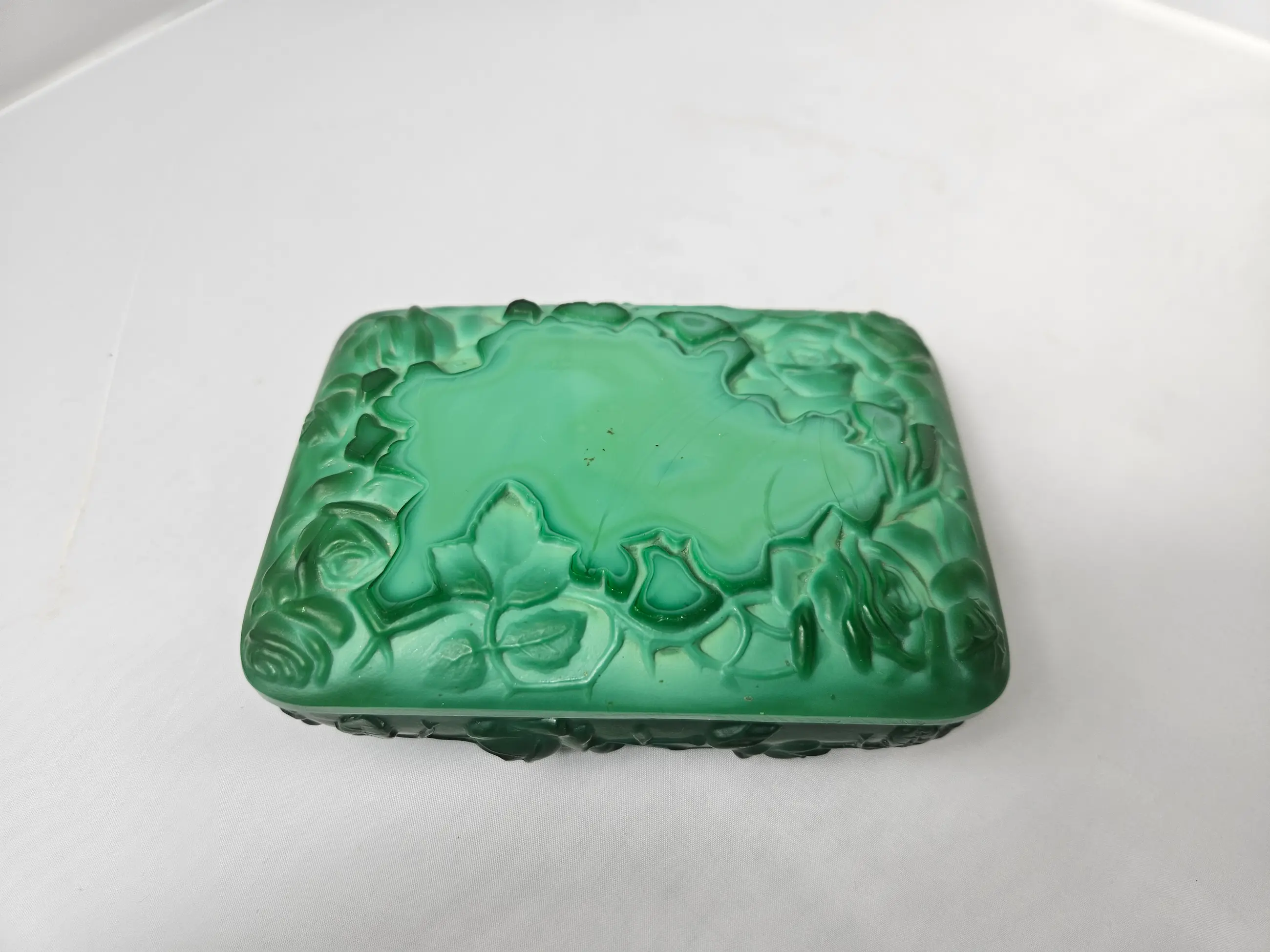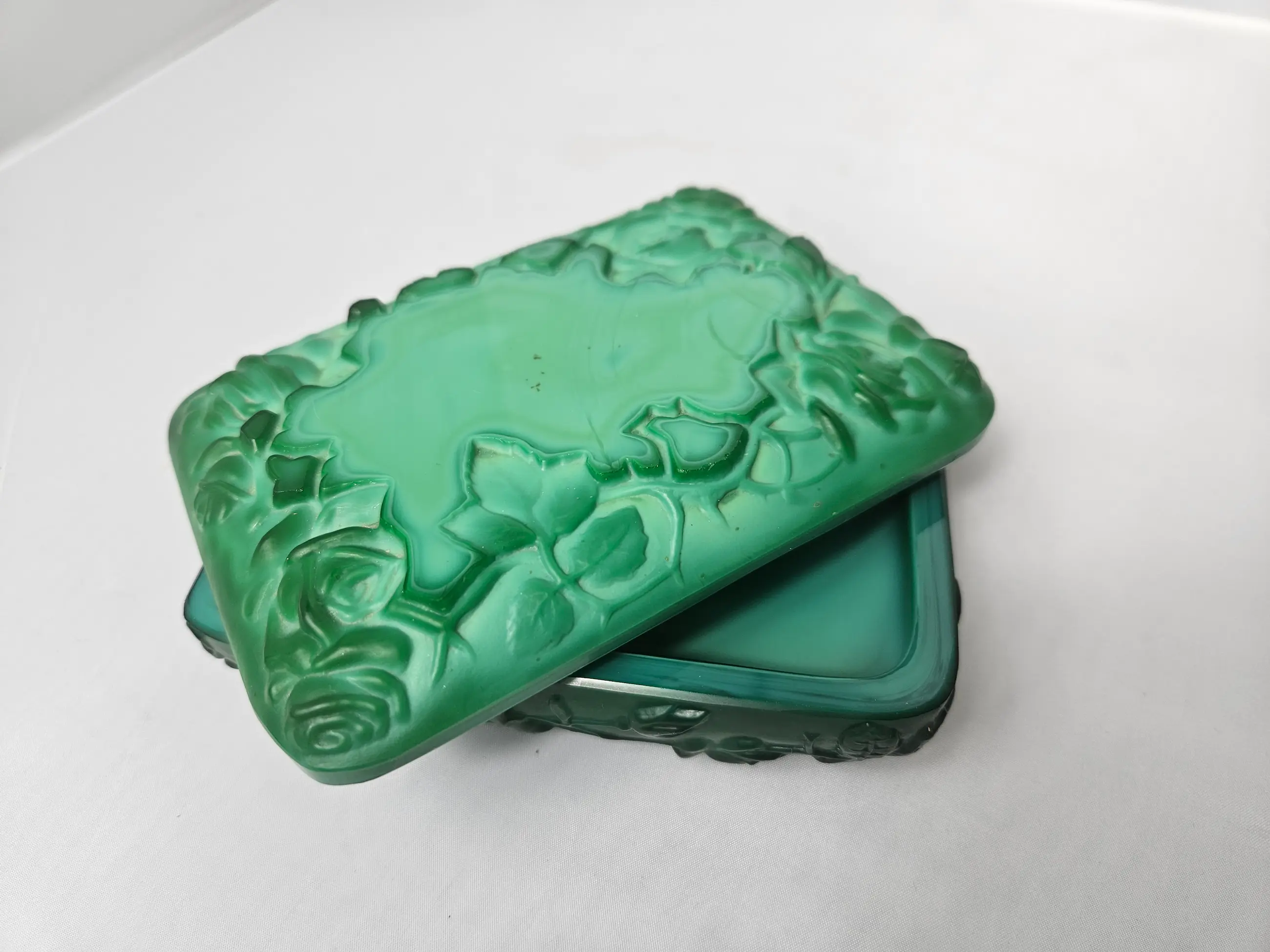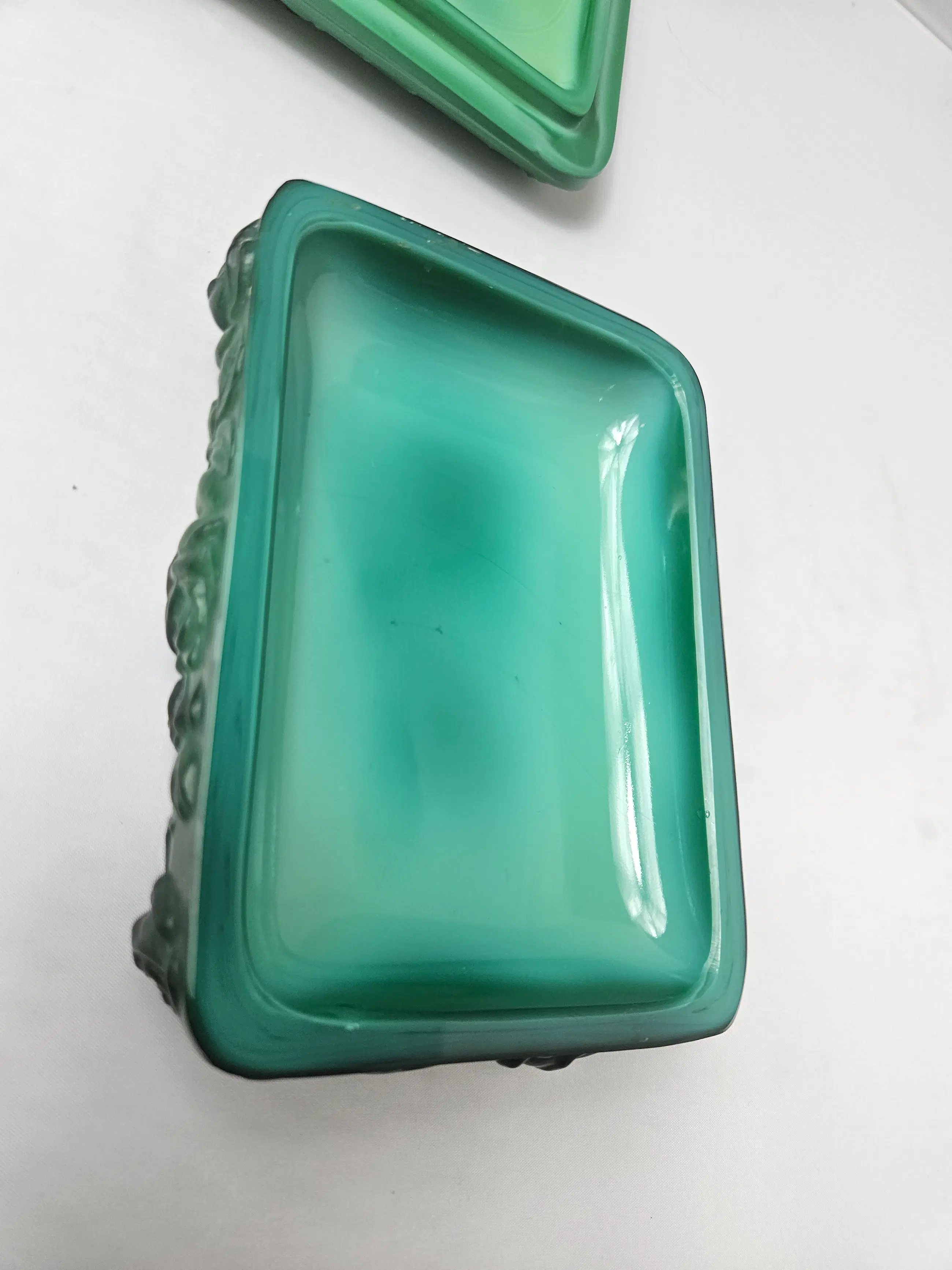 Mooie malachiet glazen doos met deksel van Schlevogt. Kleine chipje aan de binnenkant. Elk stuk malachietglas is uniek. De tint en tekeningen van dit glas zijn getekend door zaken als temperatuur, druk, vochtigheid tijdens het smeltproces.