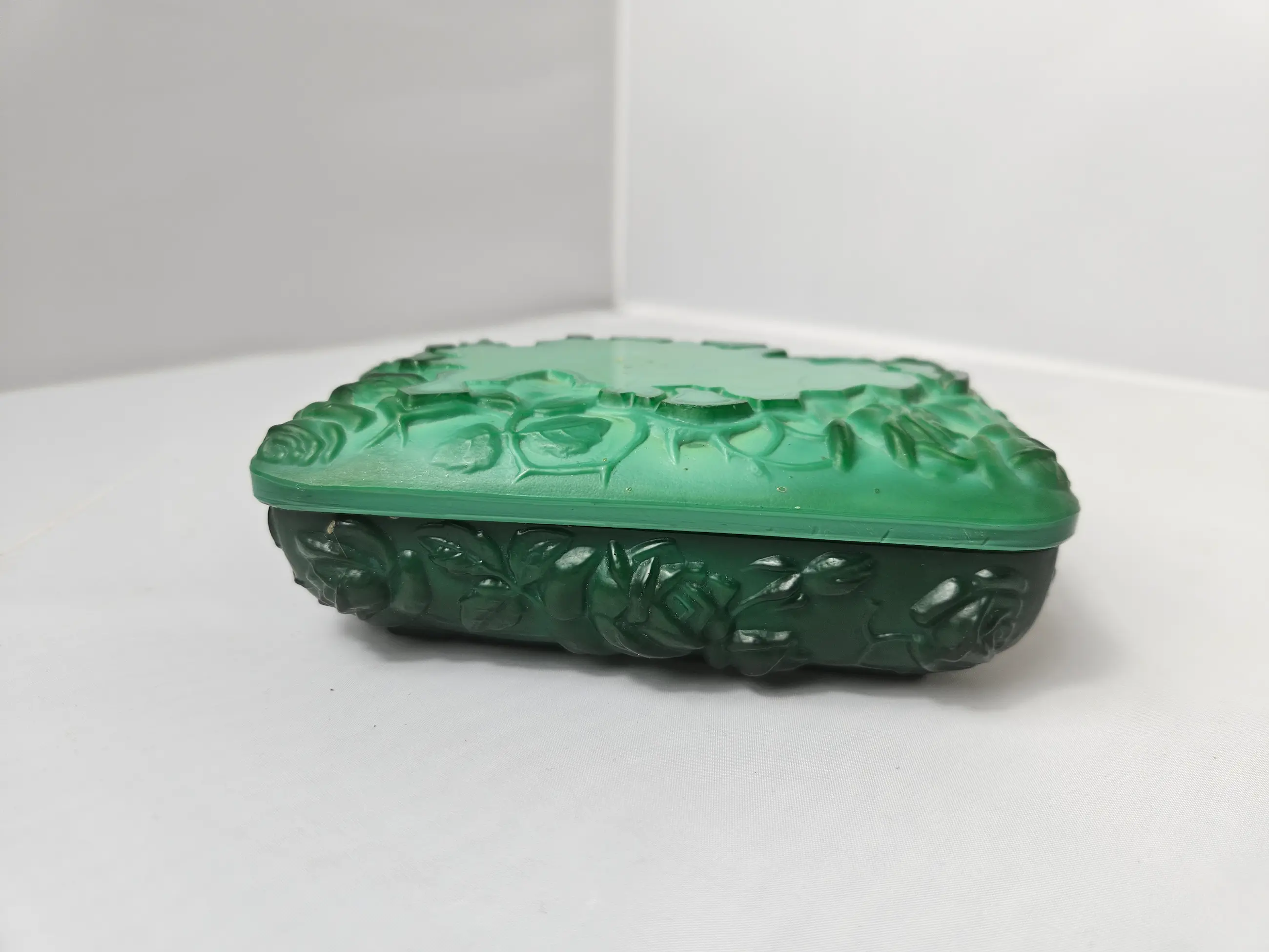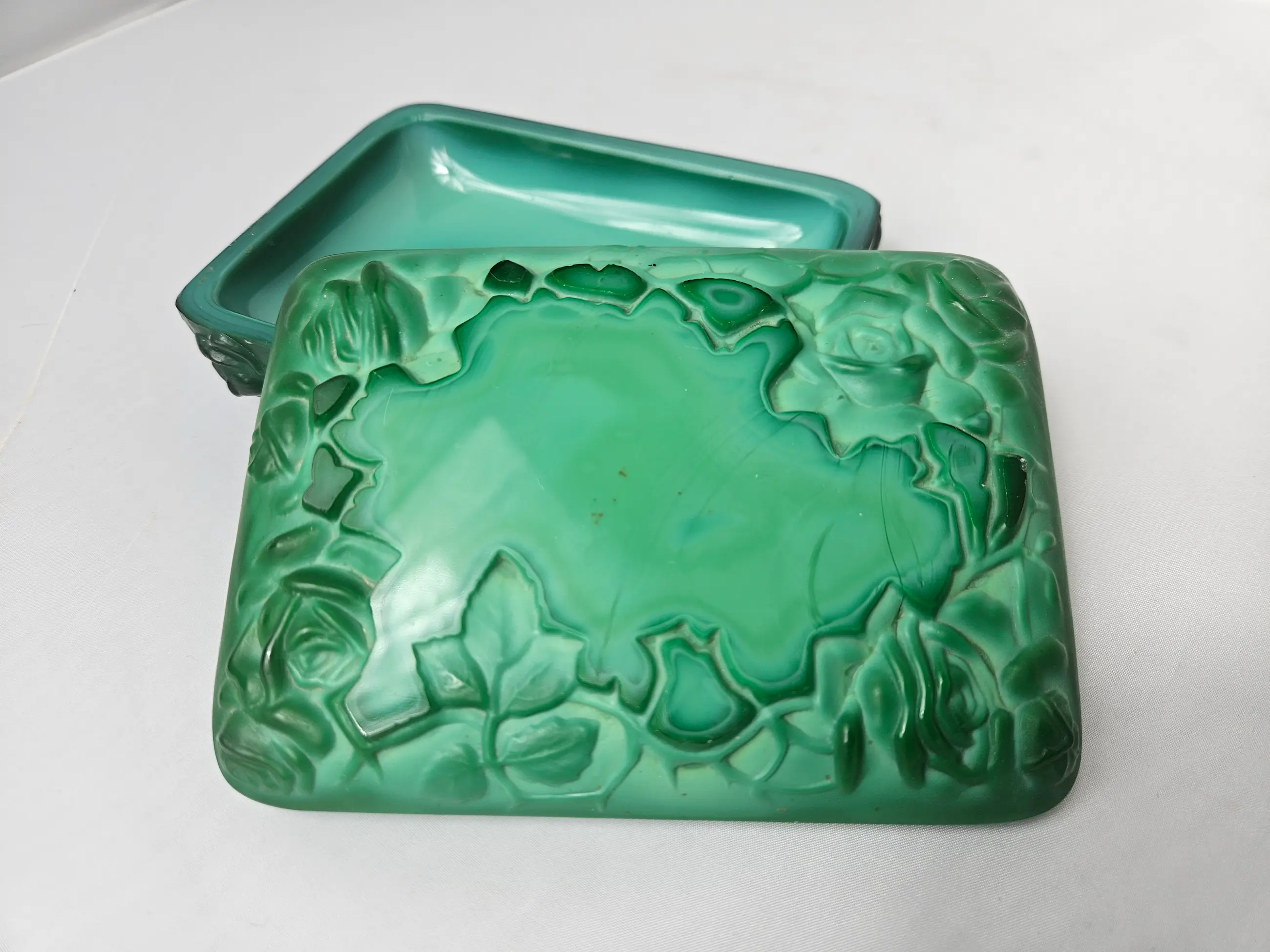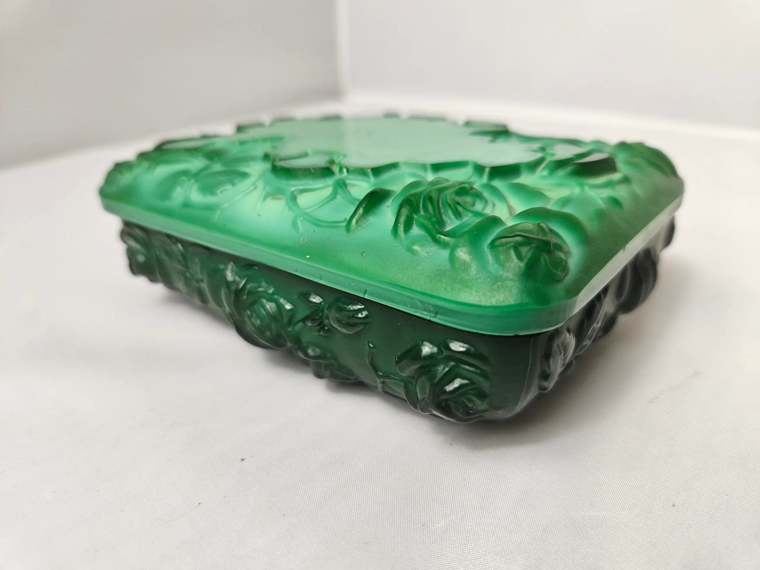 Mooie malachiet glazen doos met deksel van Schlevogt. Kleine chipje aan de binnenkant. Elk stuk malachietglas is uniek. De tint en tekeningen van dit glas zijn getekend door zaken als temperatuur, druk, vochtigheid tijdens het smeltproces.