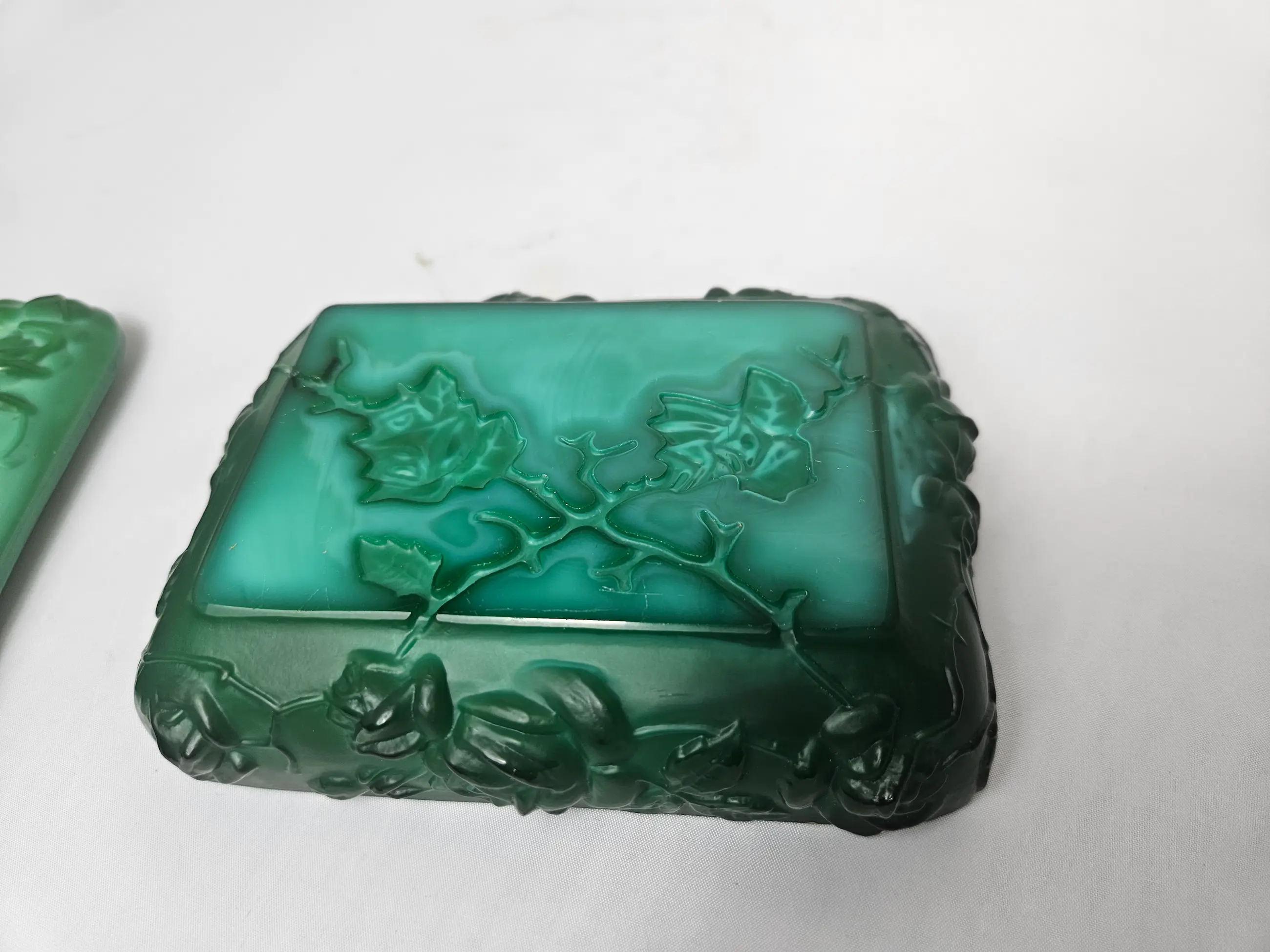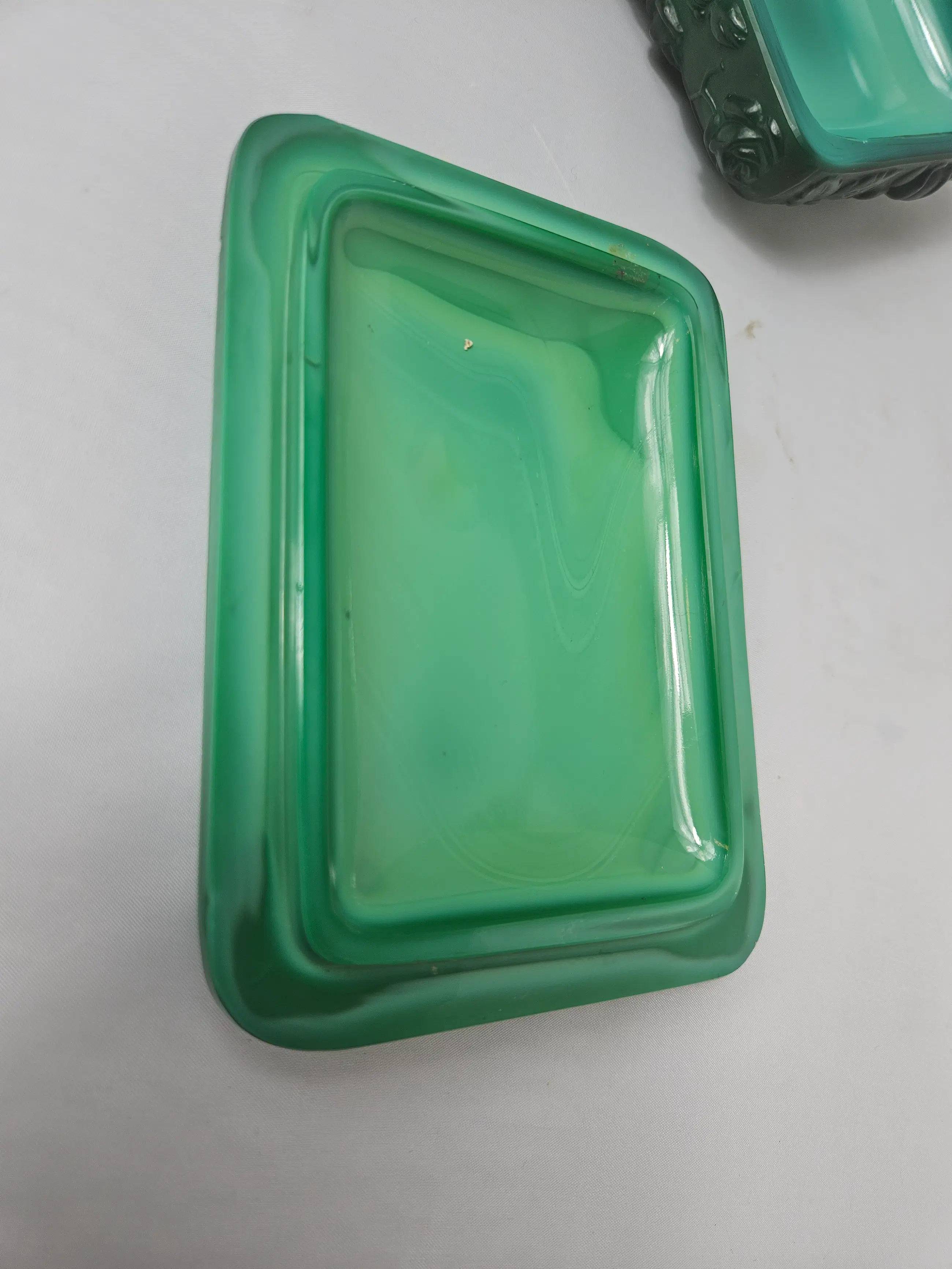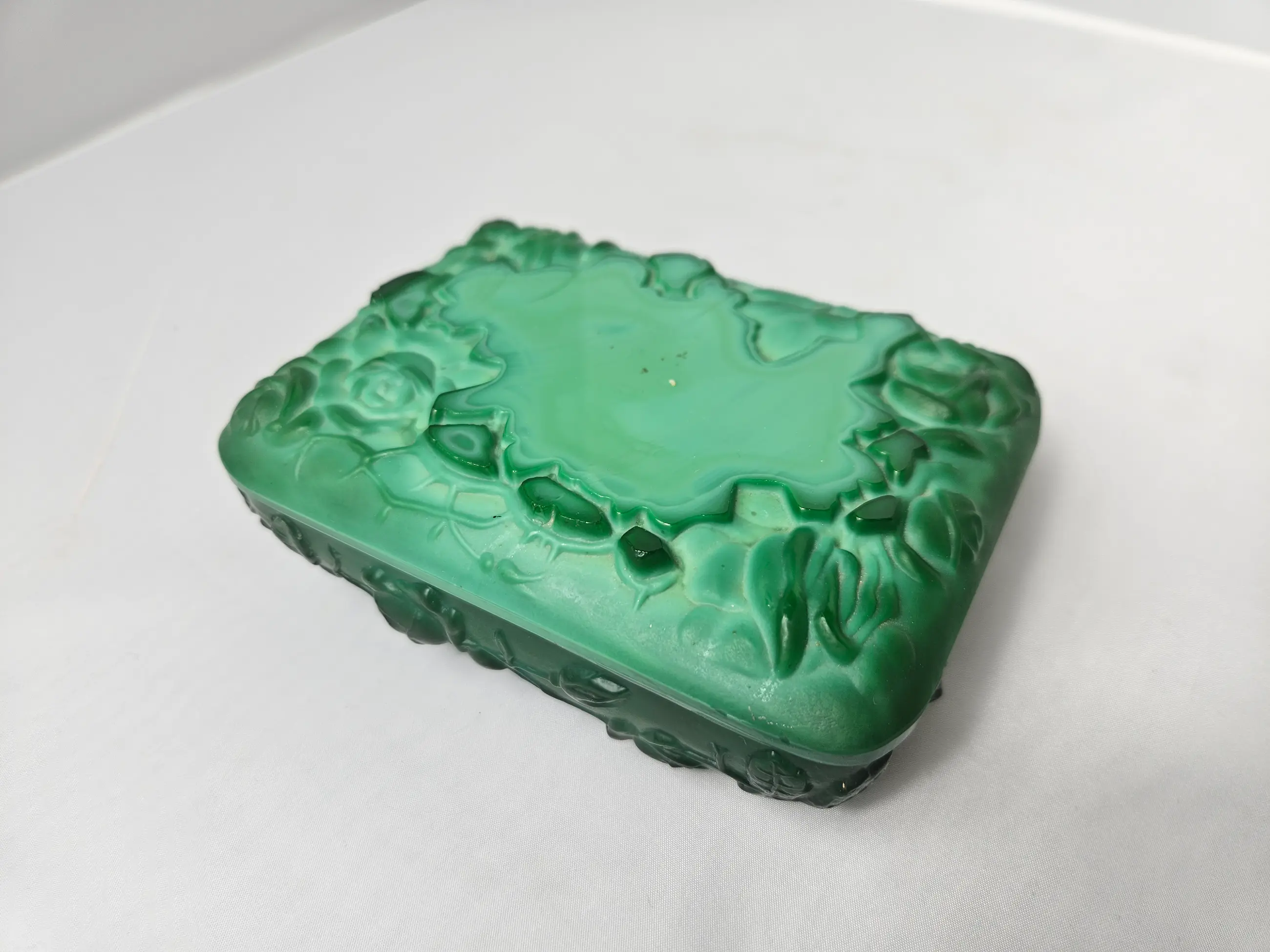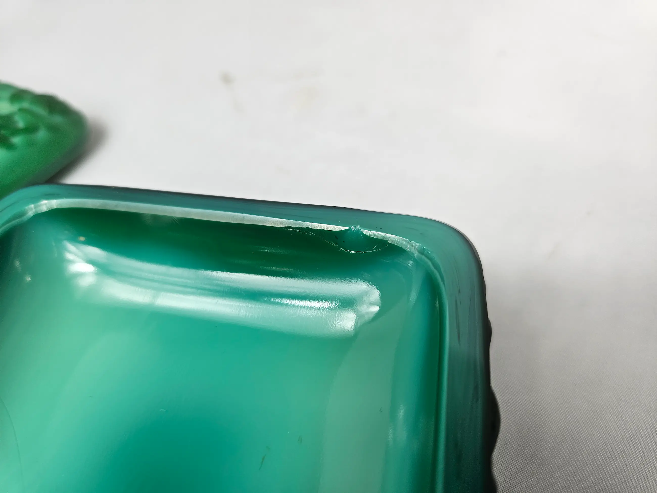 Mooie malachiet glazen doos met deksel van Schlevogt. Kleine chipje aan de binnenkant. Elk stuk malachietglas is uniek. De tint en tekeningen van dit glas zijn getekend door zaken als temperatuur, druk, vochtigheid tijdens het smeltproces.