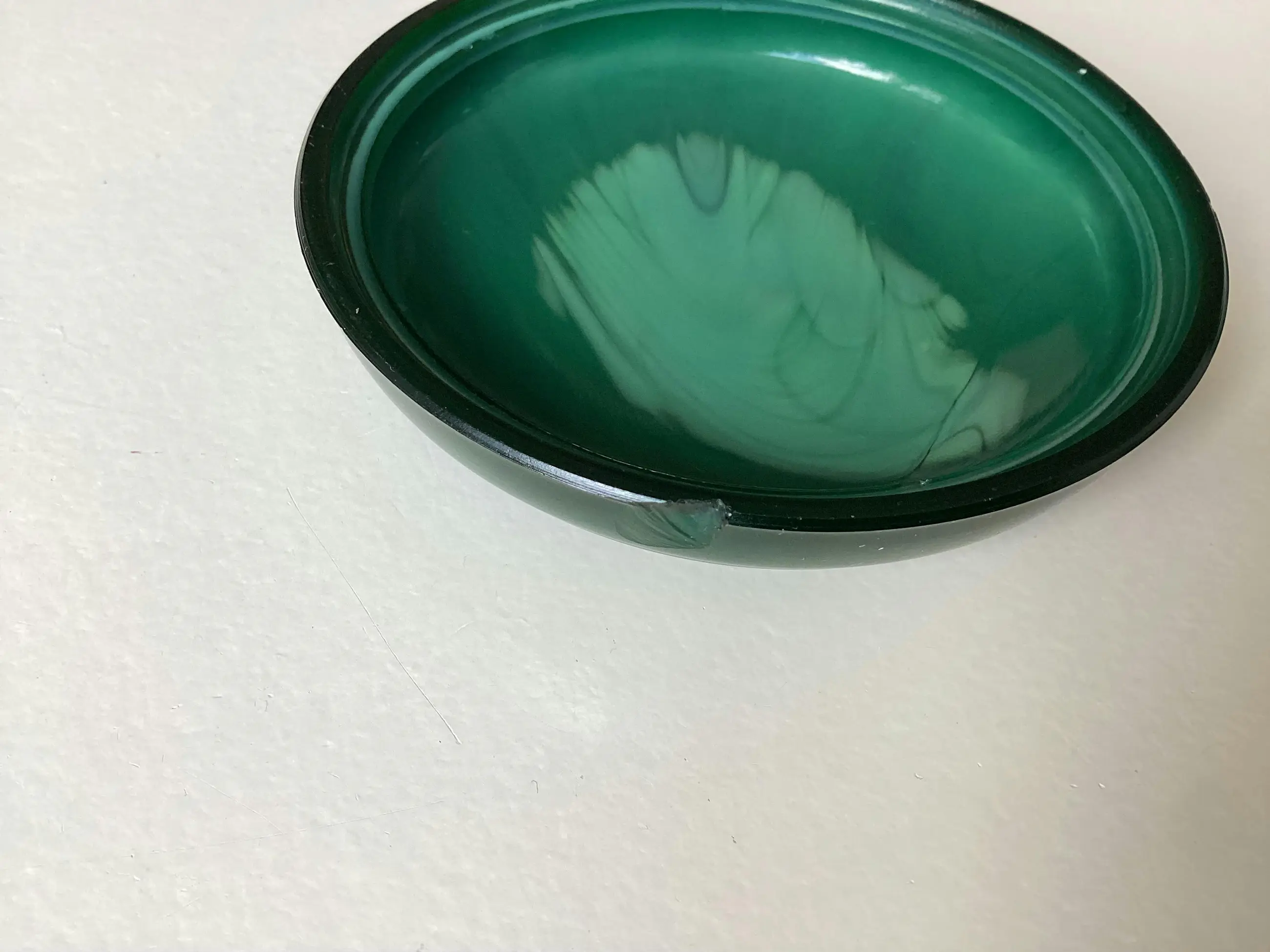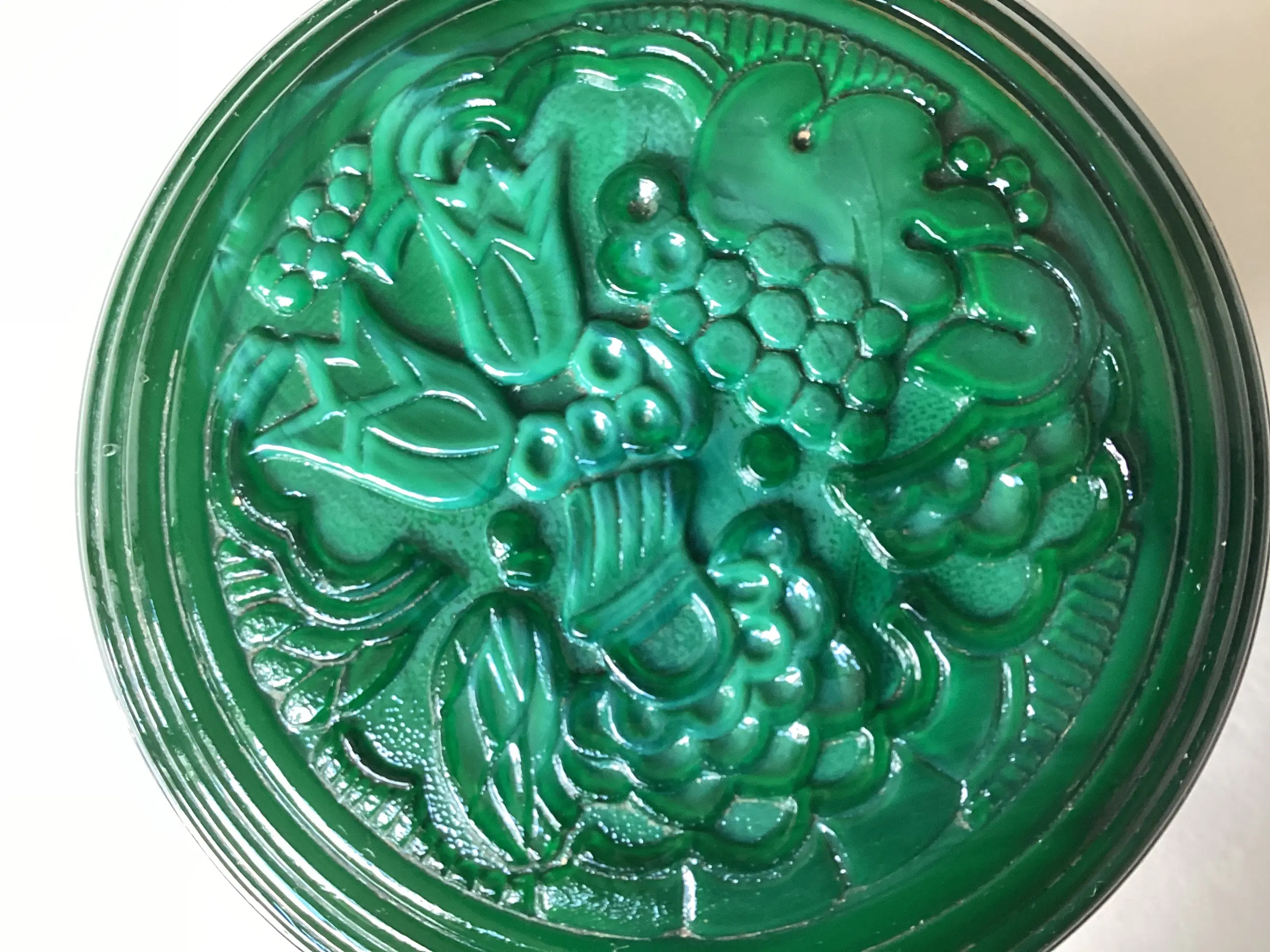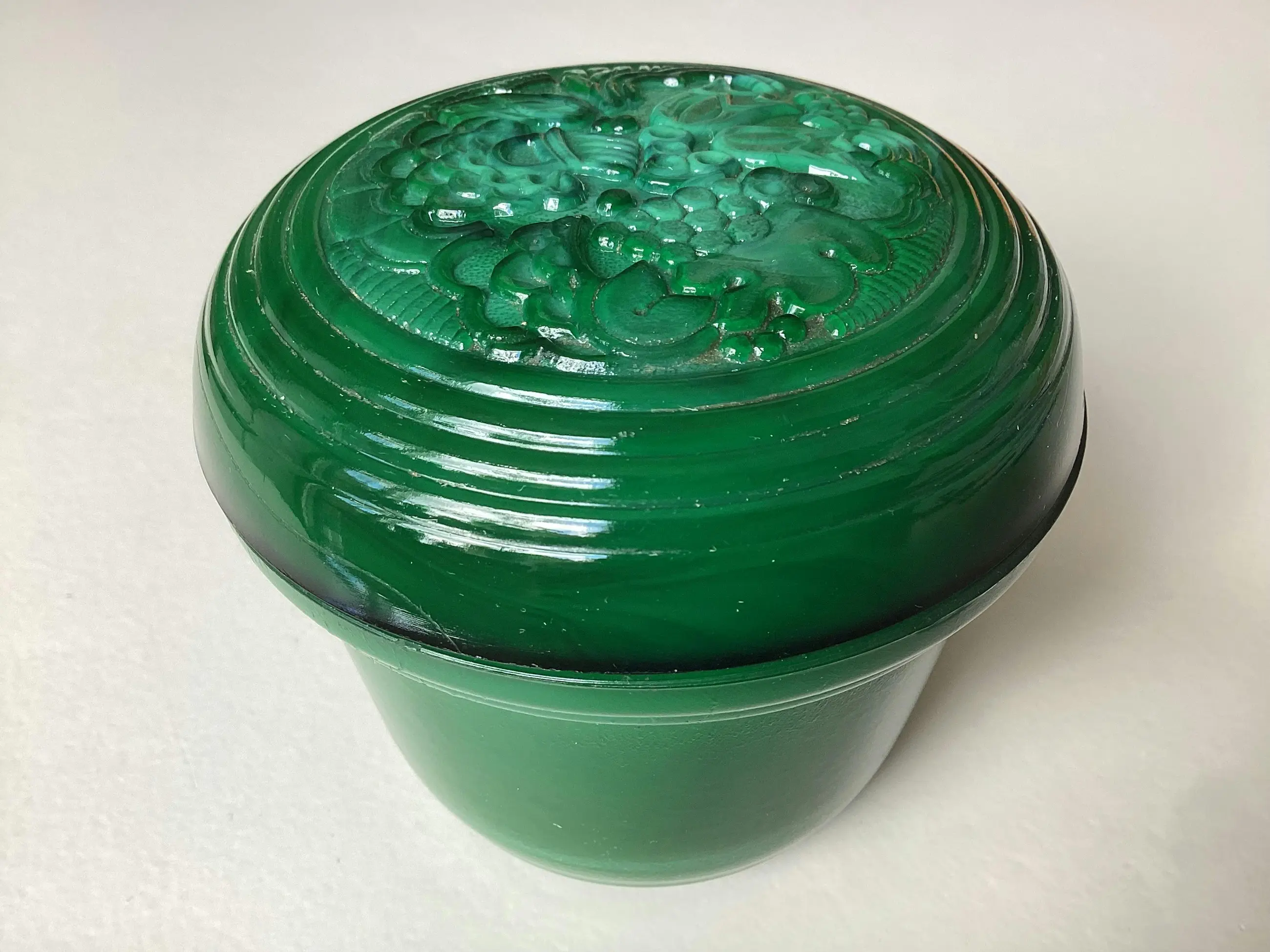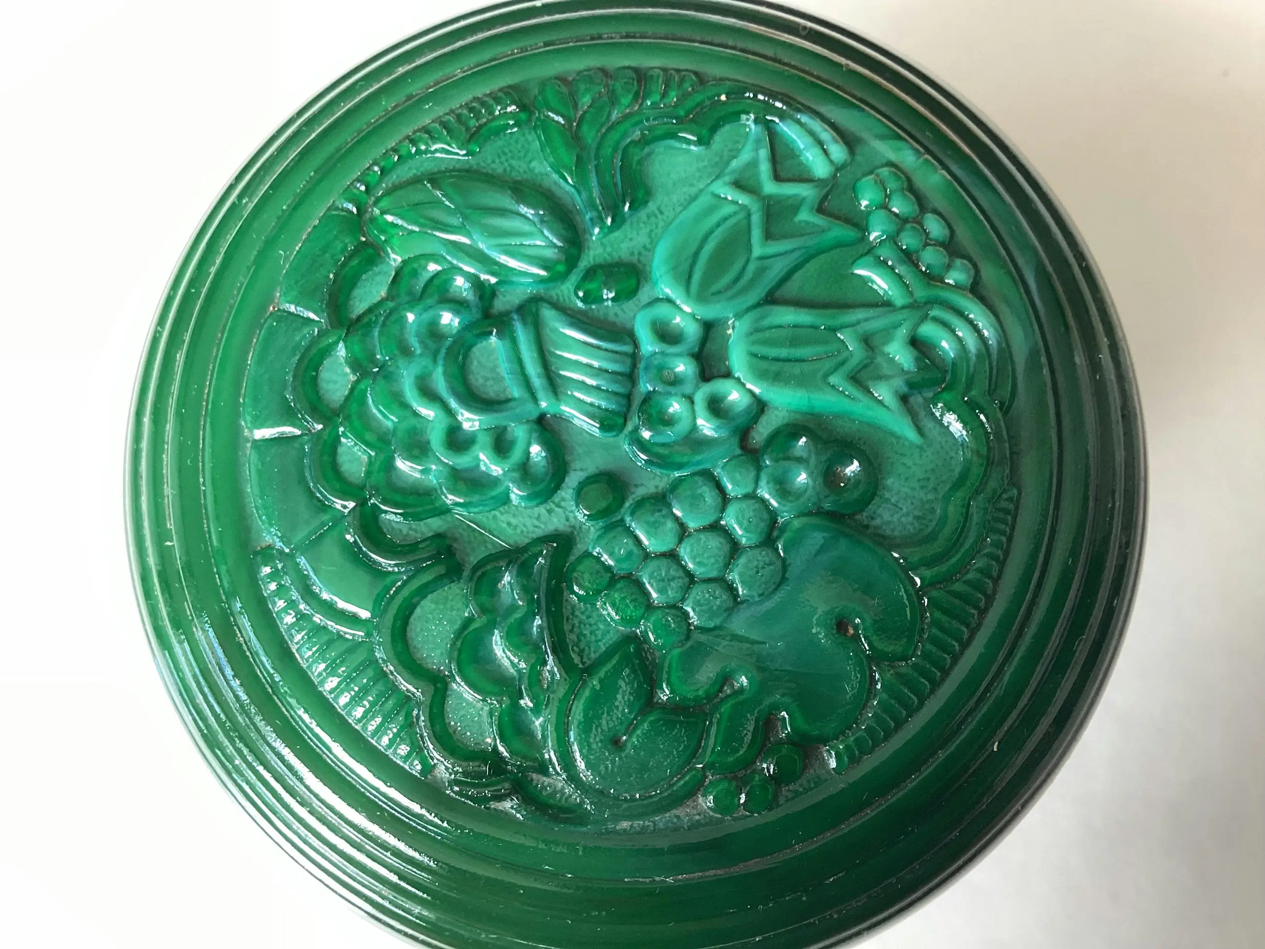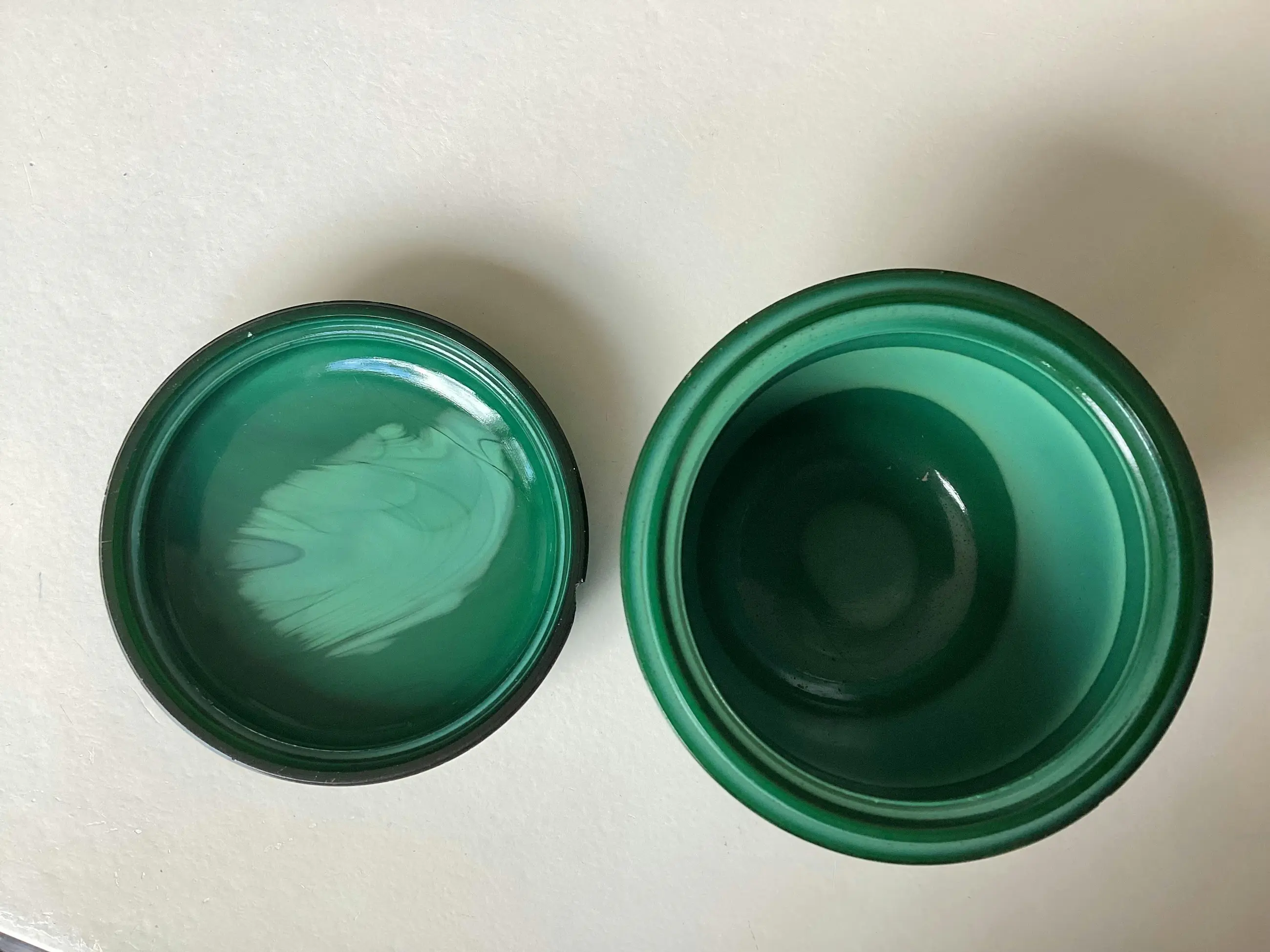 Groen Art Deco malachiet pot met deksel van Curt Schlevogt, rond 1940. Hoogte incl 9 cm. Deksel heeft schilvertje. (Zie voorlaatste foto)