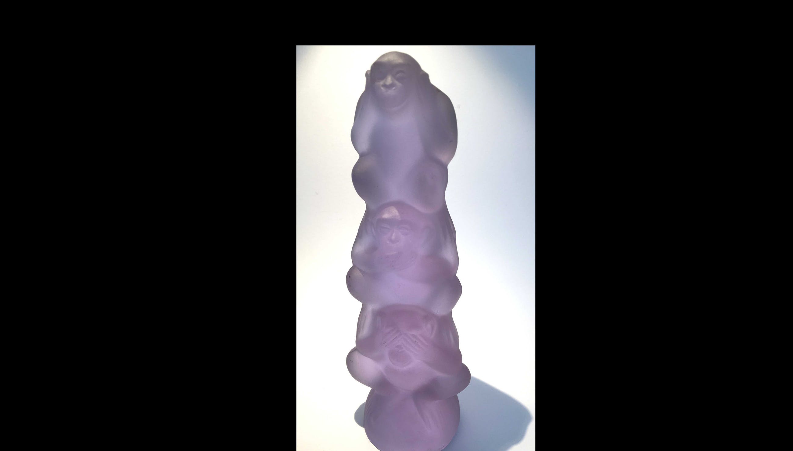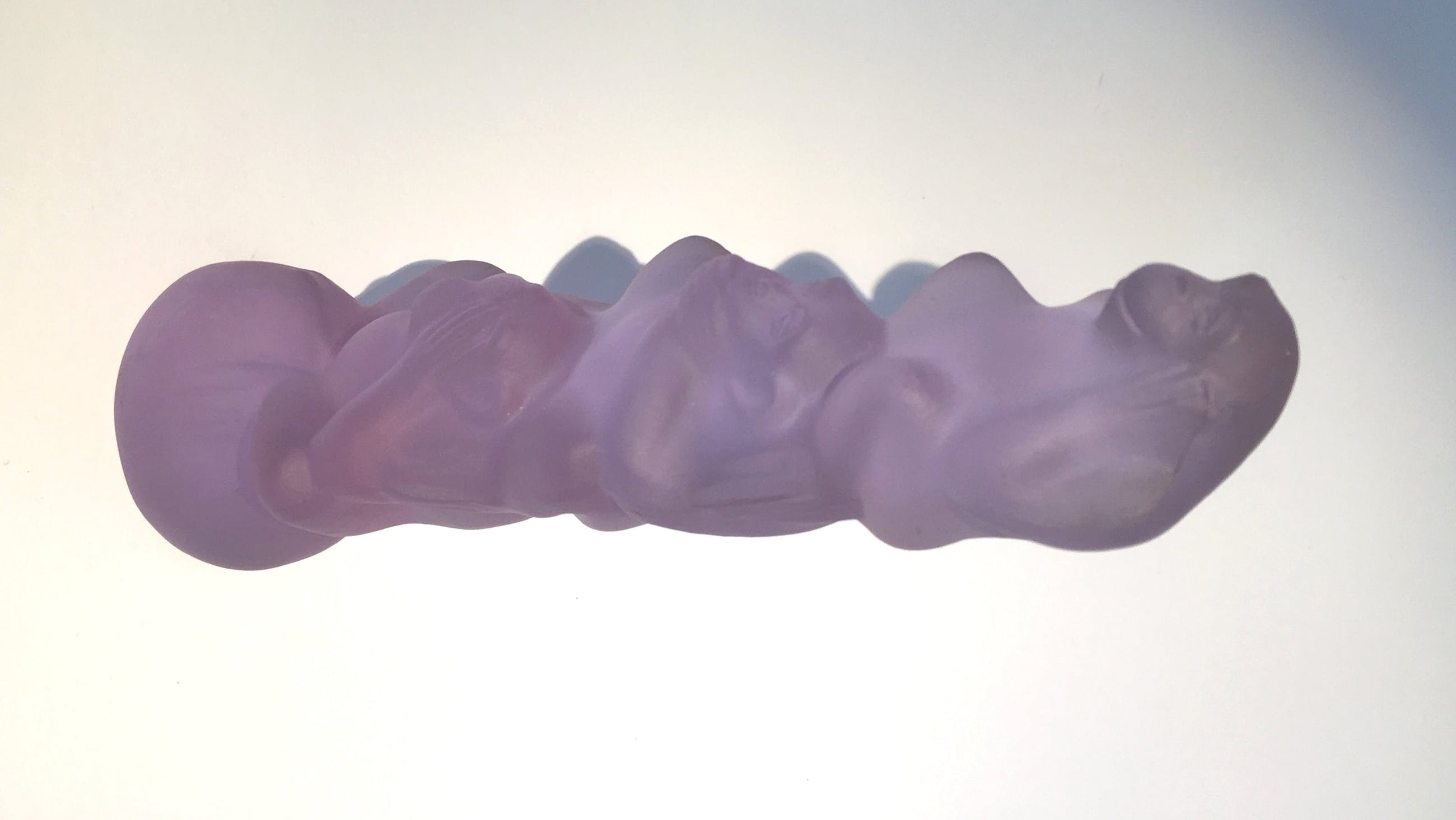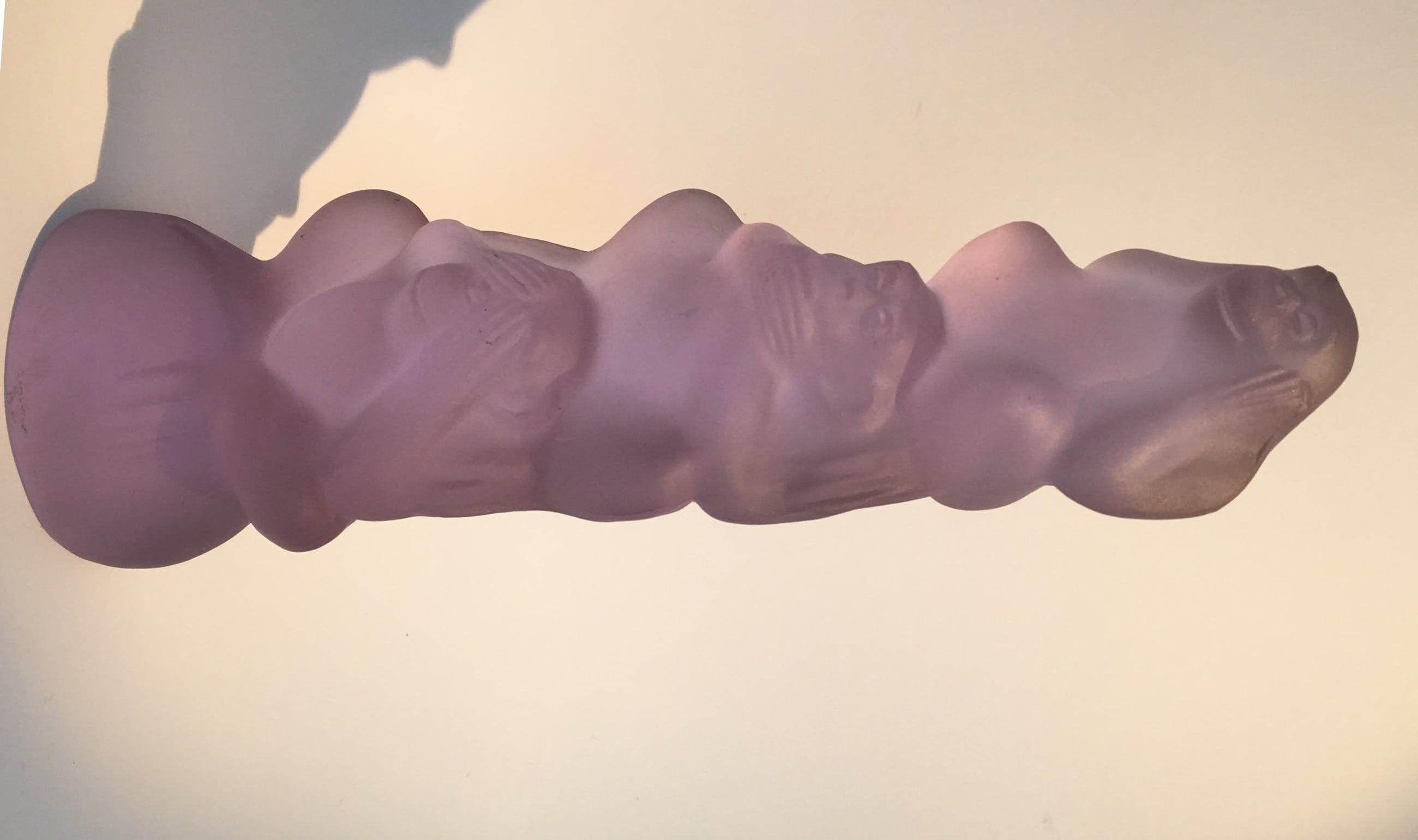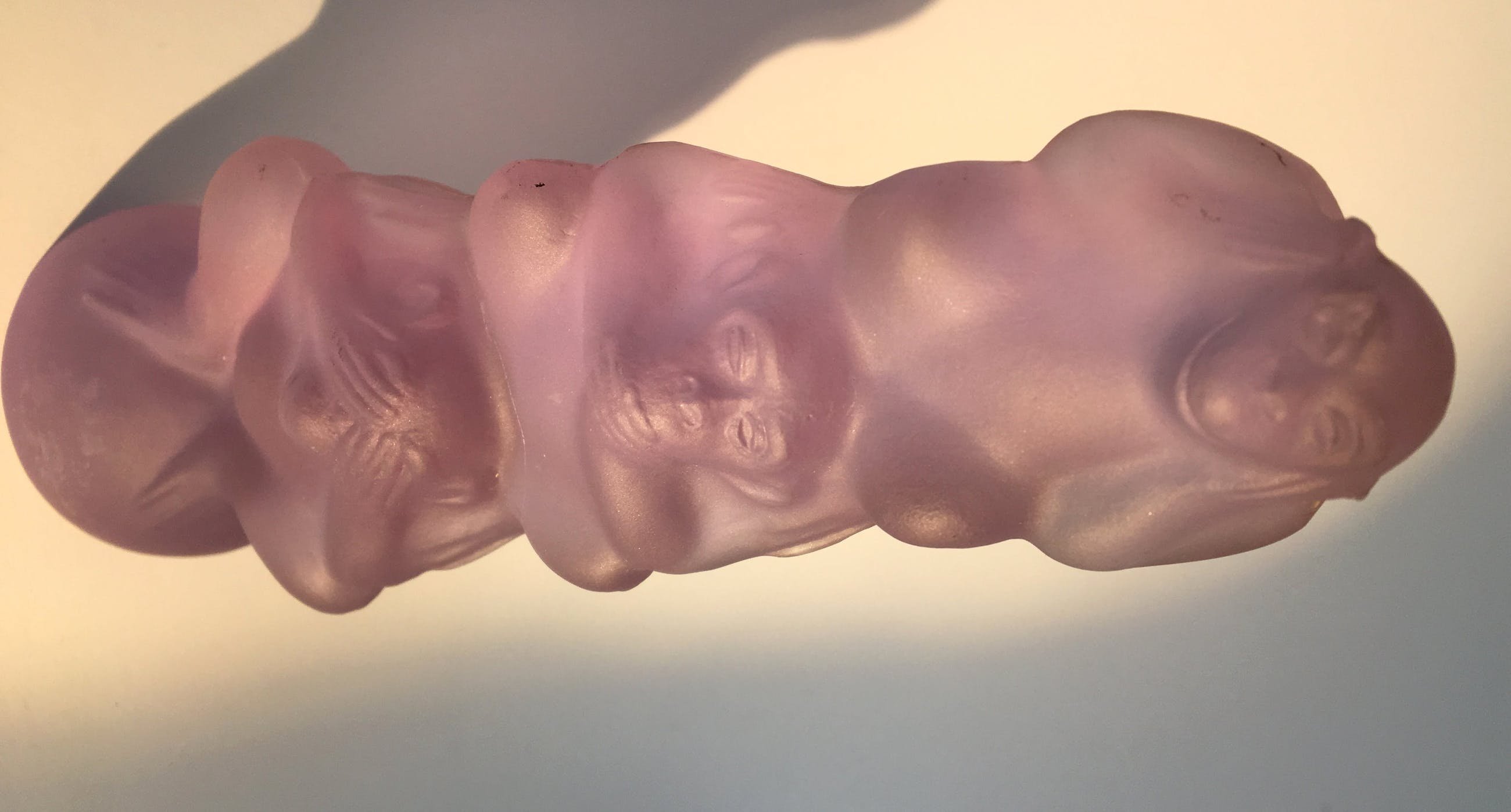 Deze aapjes zijn uitgevoerd in alexandrite glas, gesatineerd.Omdat dit glas bijzonder gevoelig is voor verkleuring in het licht van blauw naar roze-achtig, zijn de foto's ook verschillend van kleur. Omdat de belijning van de aapjes zo zacht is moest ik wel een lampje gebruiken, waardoor tevens de kleurverschillen ontstaan.
