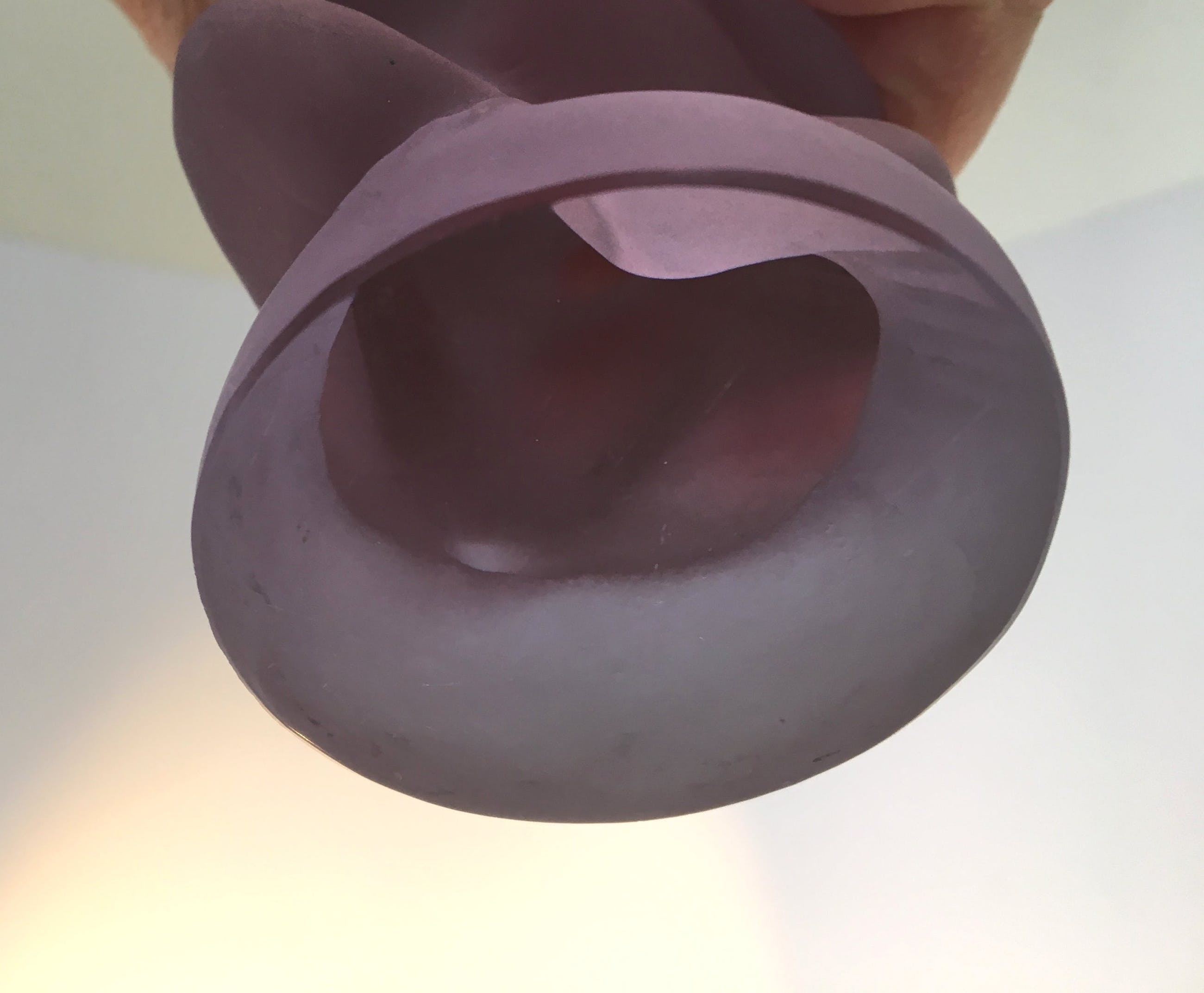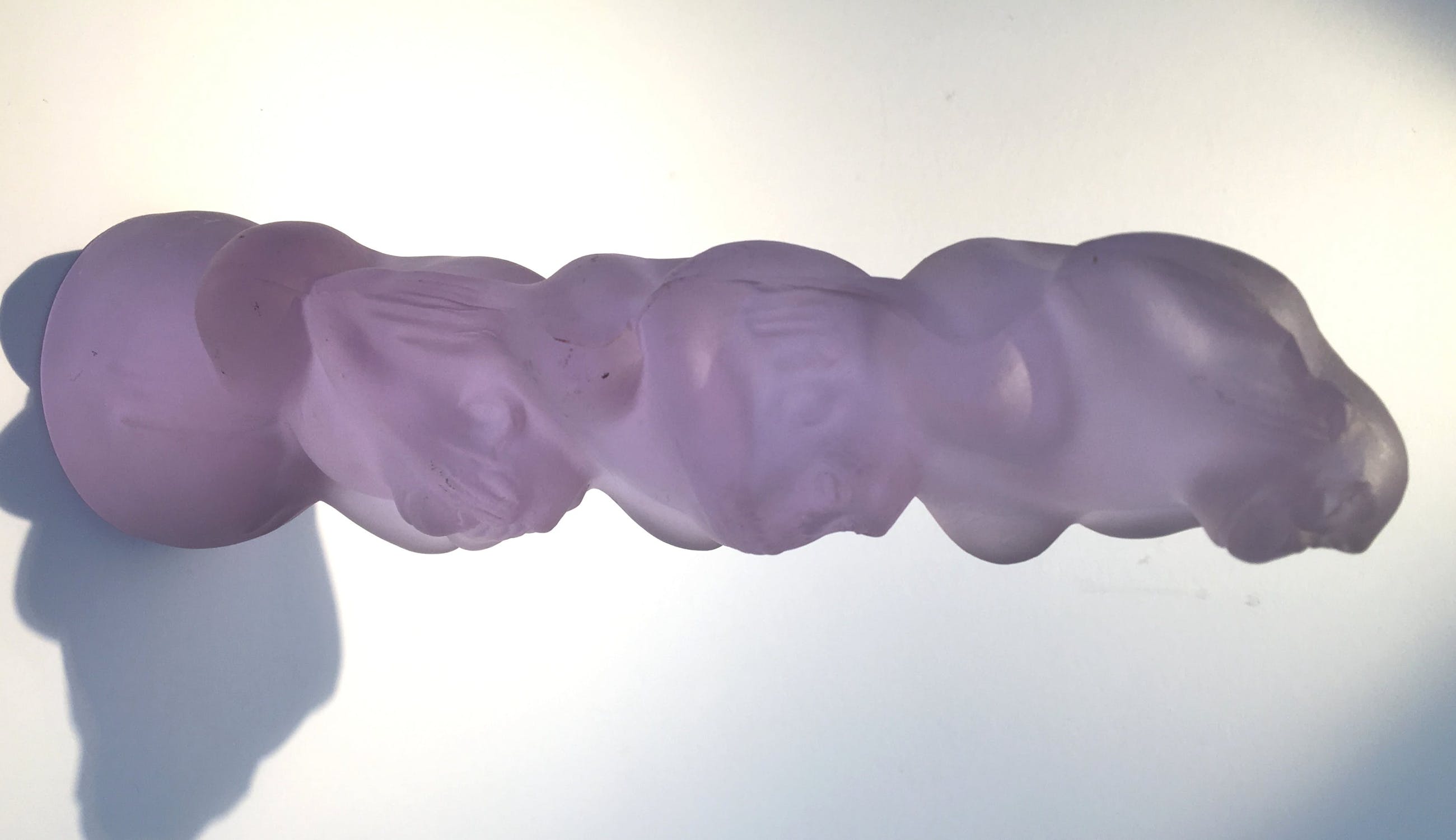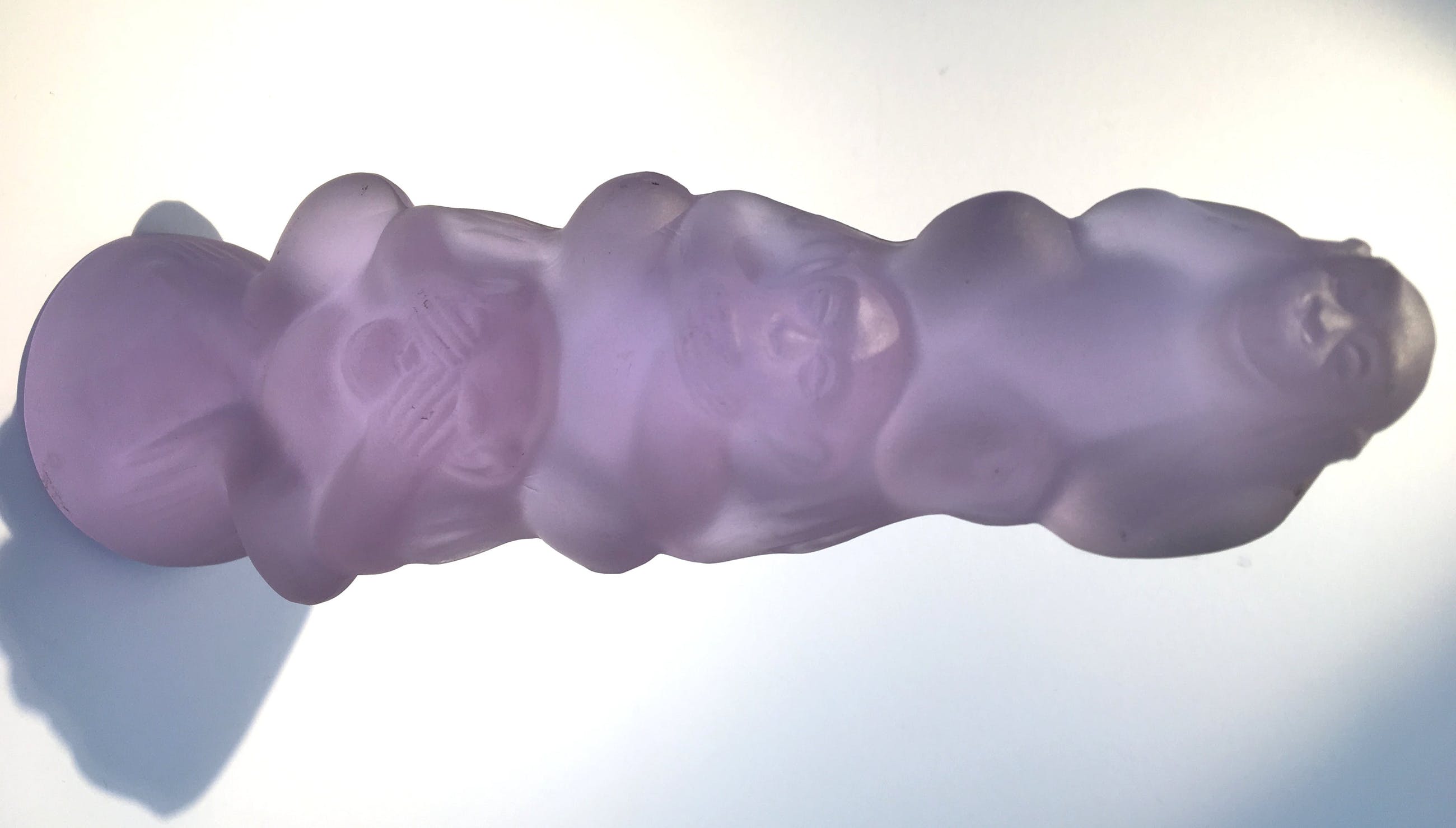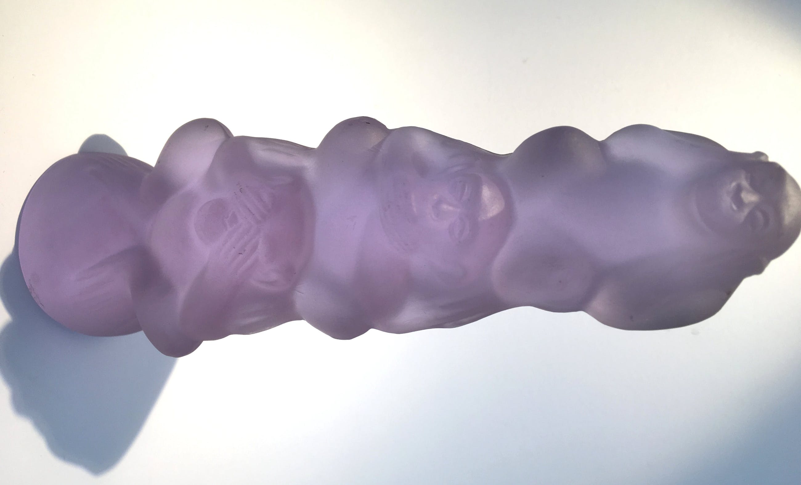 Deze aapjes zijn uitgevoerd in alexandrite glas, gesatineerd.Omdat dit glas bijzonder gevoelig is voor verkleuring in het licht van blauw naar roze-achtig, zijn de foto's ook verschillend van kleur. Omdat de belijning van de aapjes zo zacht is moest ik wel een lampje gebruiken, waardoor tevens de kleurverschillen ontstaan.