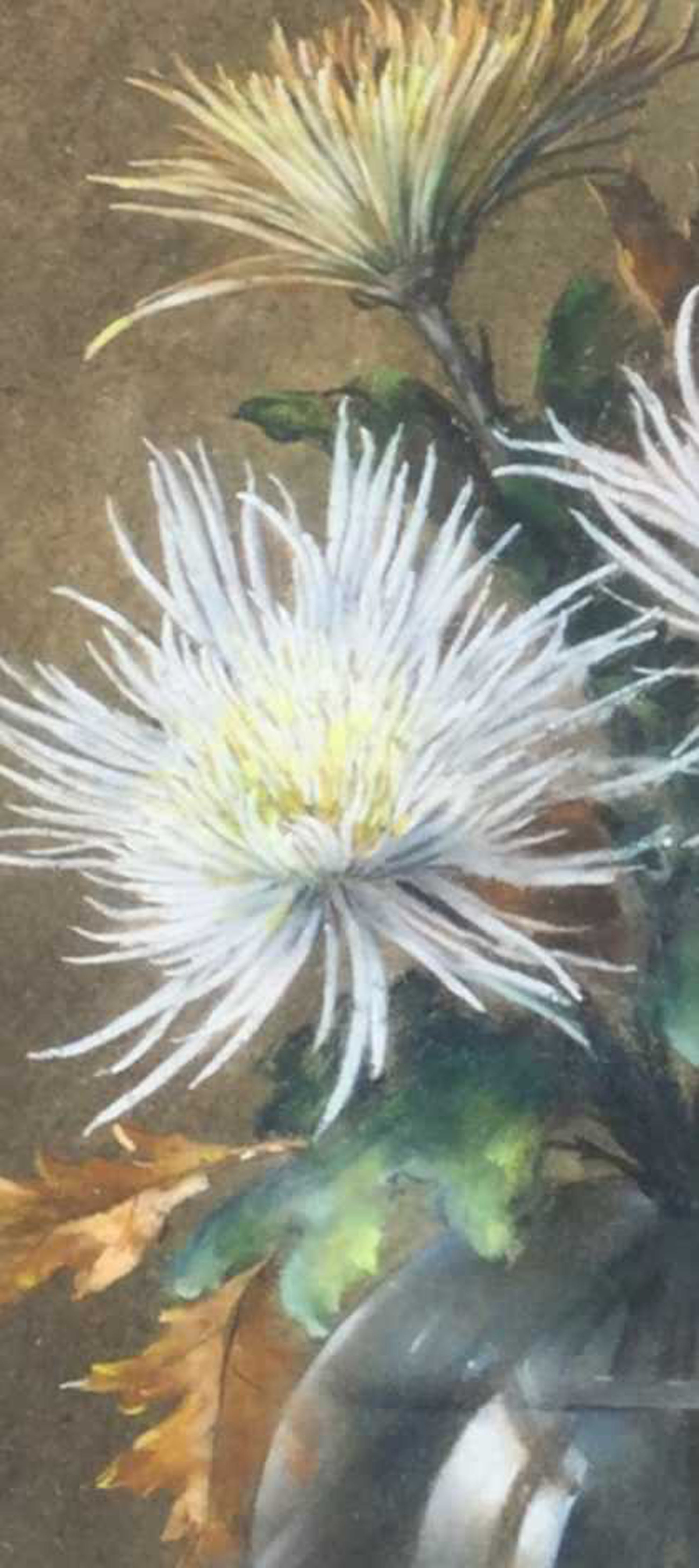 staat: glas vervuild door de tijd, papier verkleurd door de tijd, pastel geeft iets af op glas, zonder lijst, wel met passe partout en glasplaat