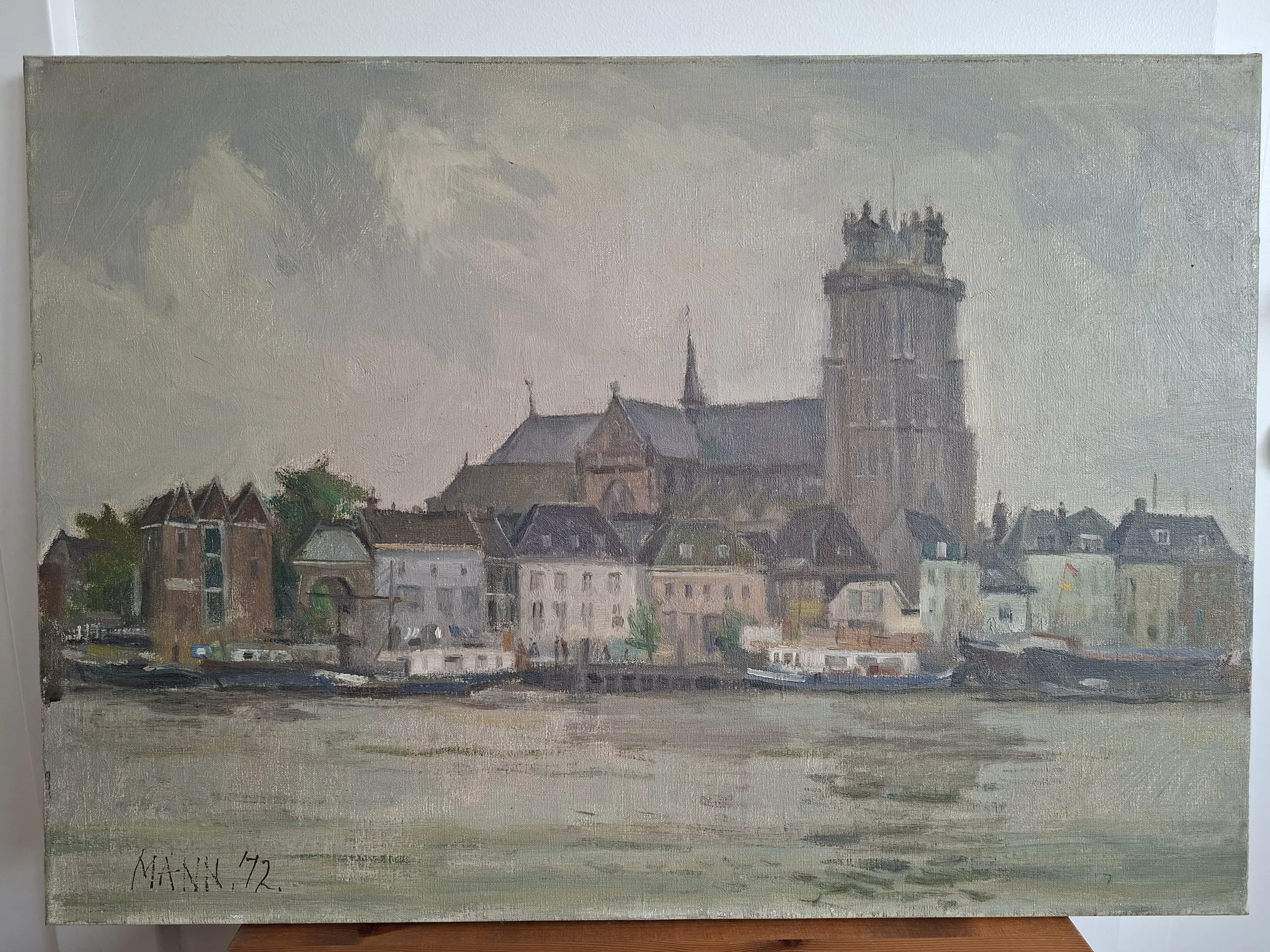 Gezicht op haven van Dordrecht. Helaas is het schilderij een beetje beschadigd aan de bovenkant waar het in de lijst zat (bovenste 5 mm)