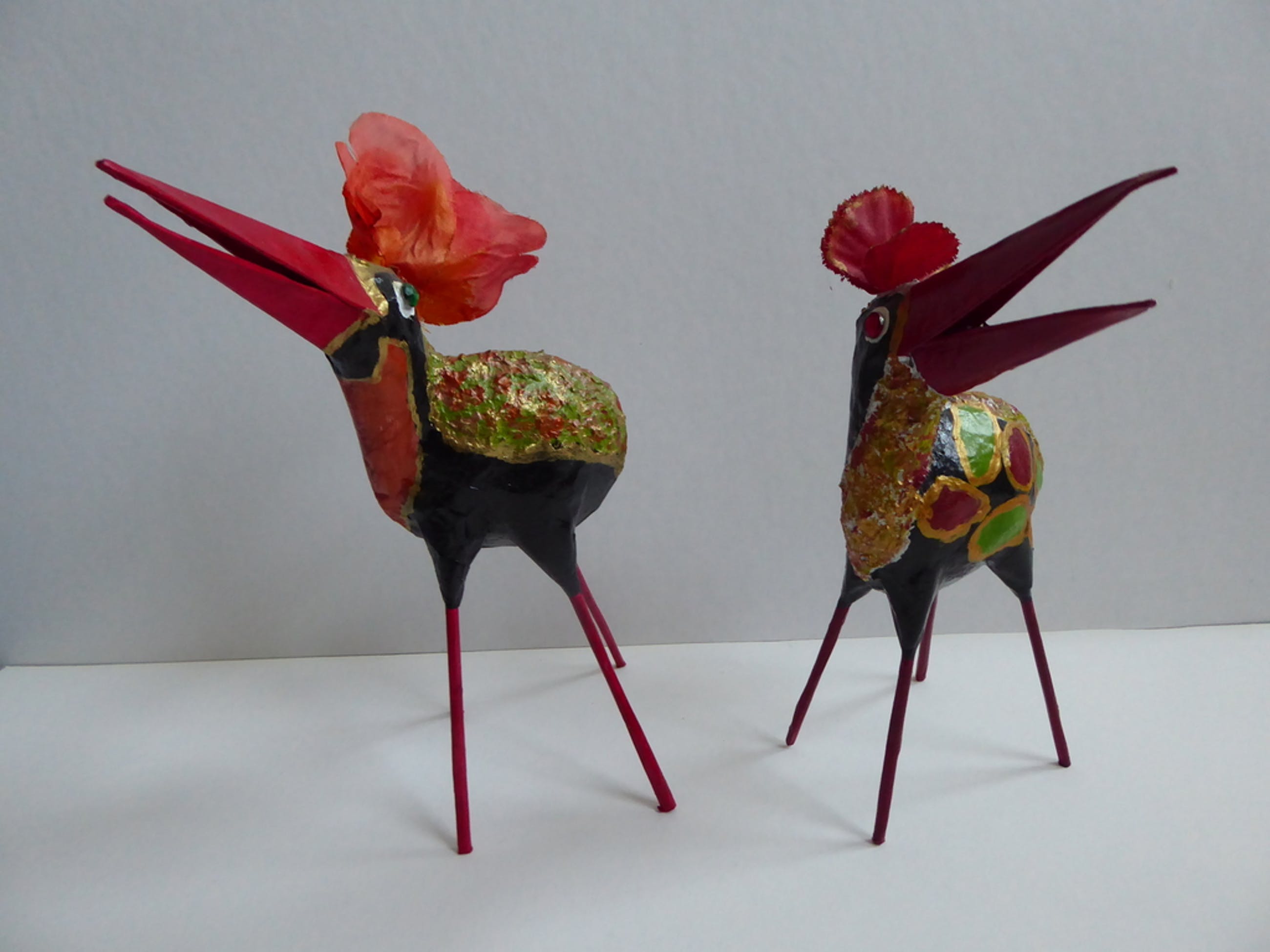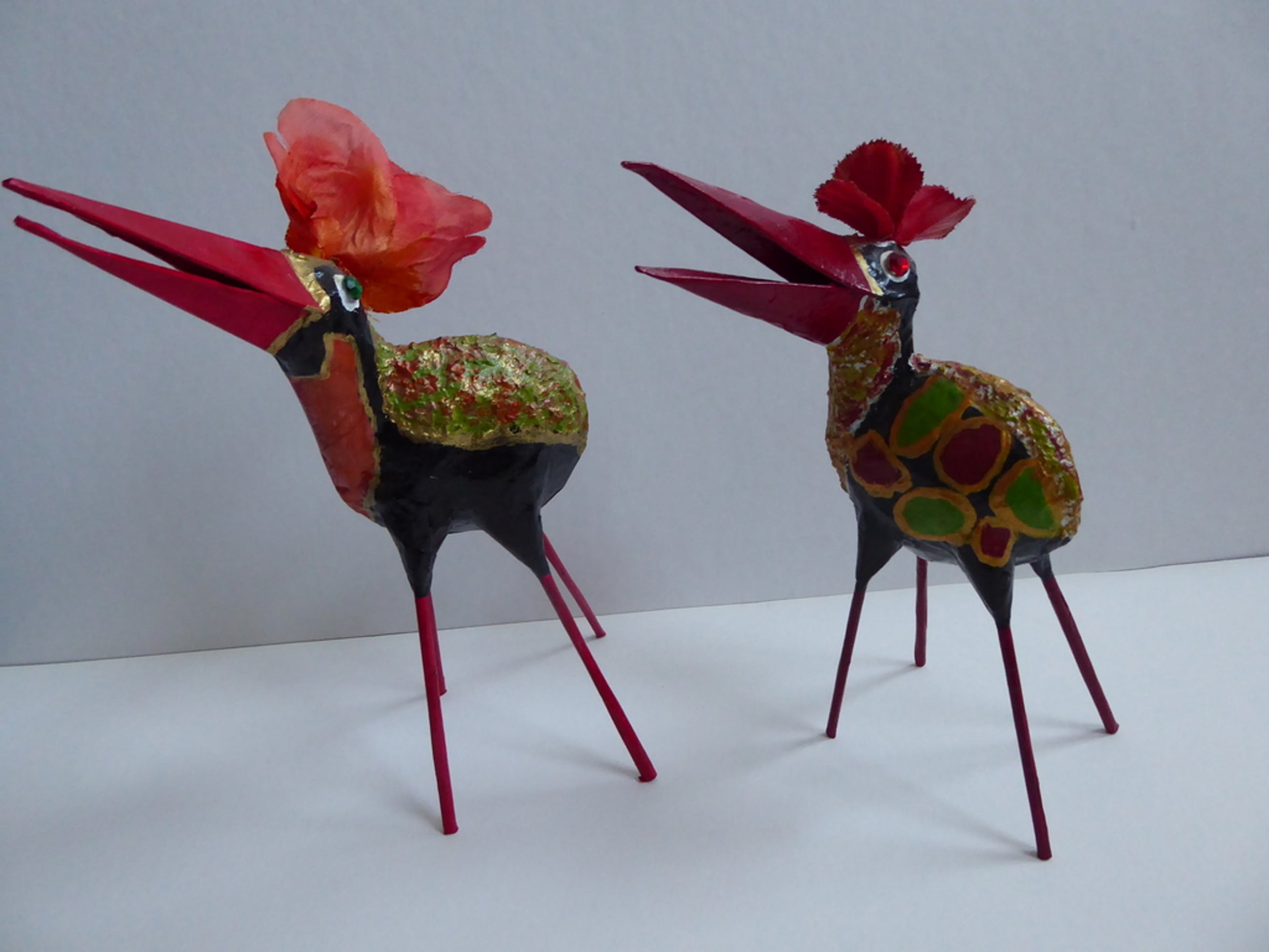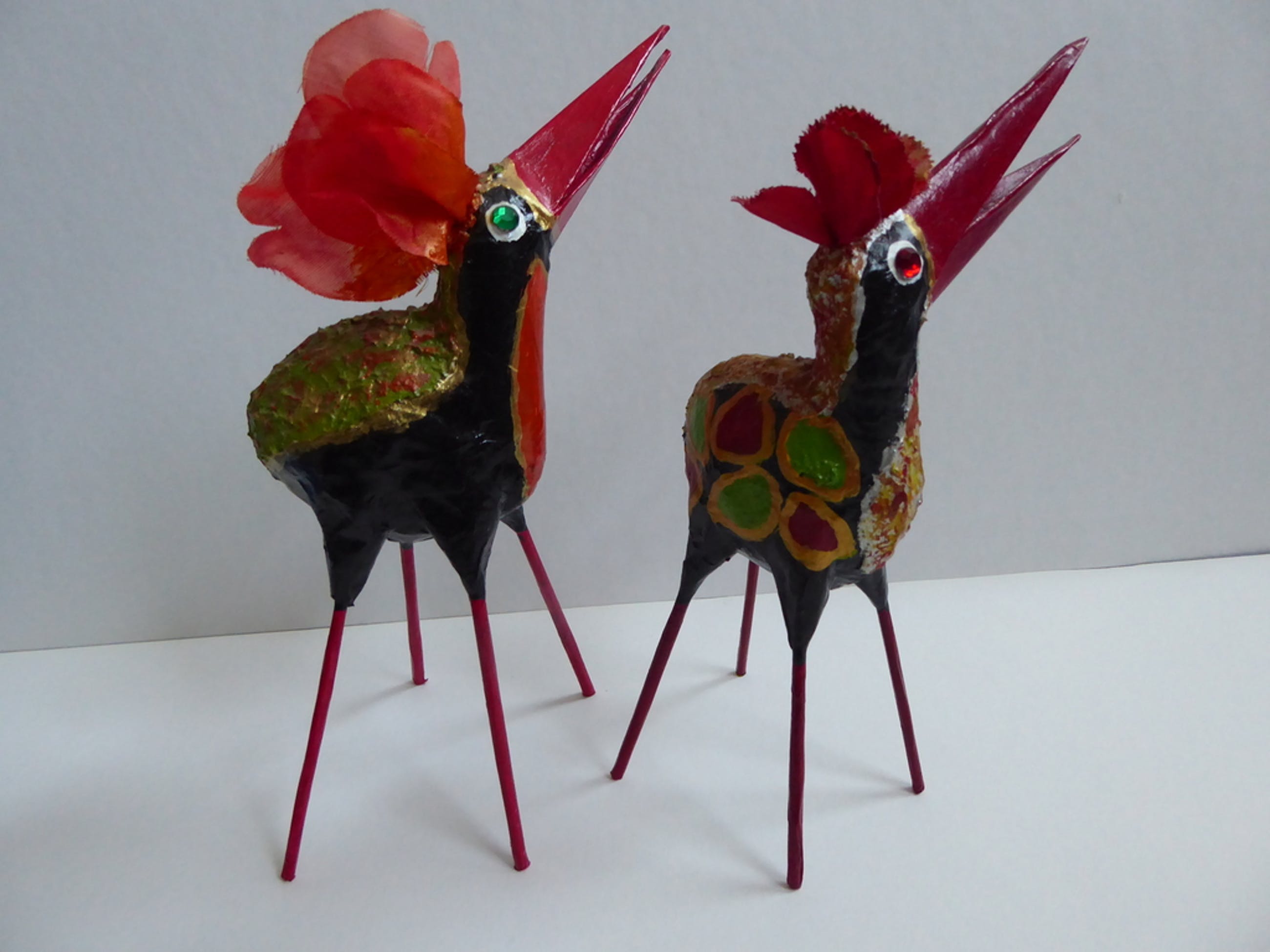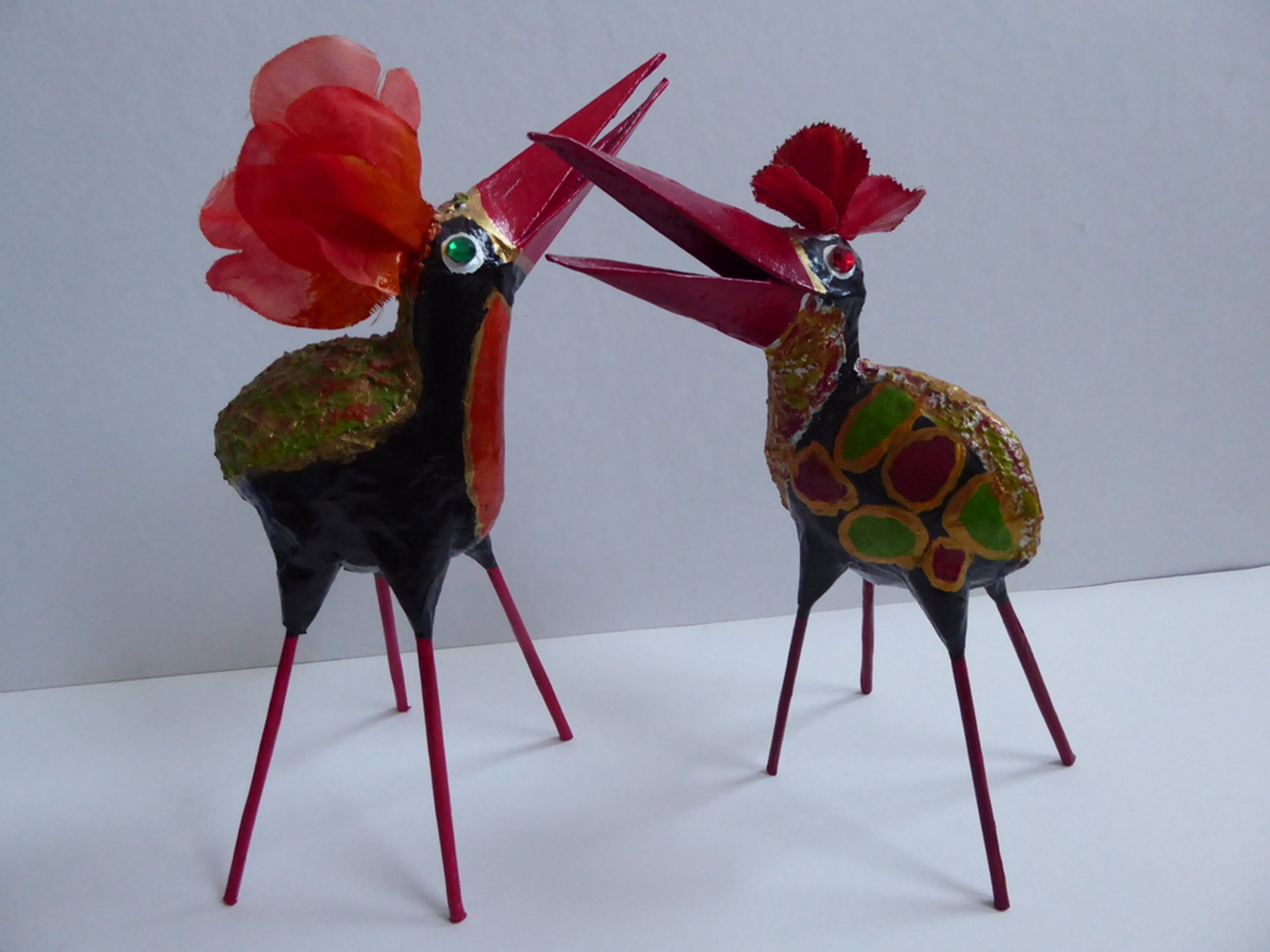De twee kleurige vogels van Doetje Kok zijn 25 cm hoog.