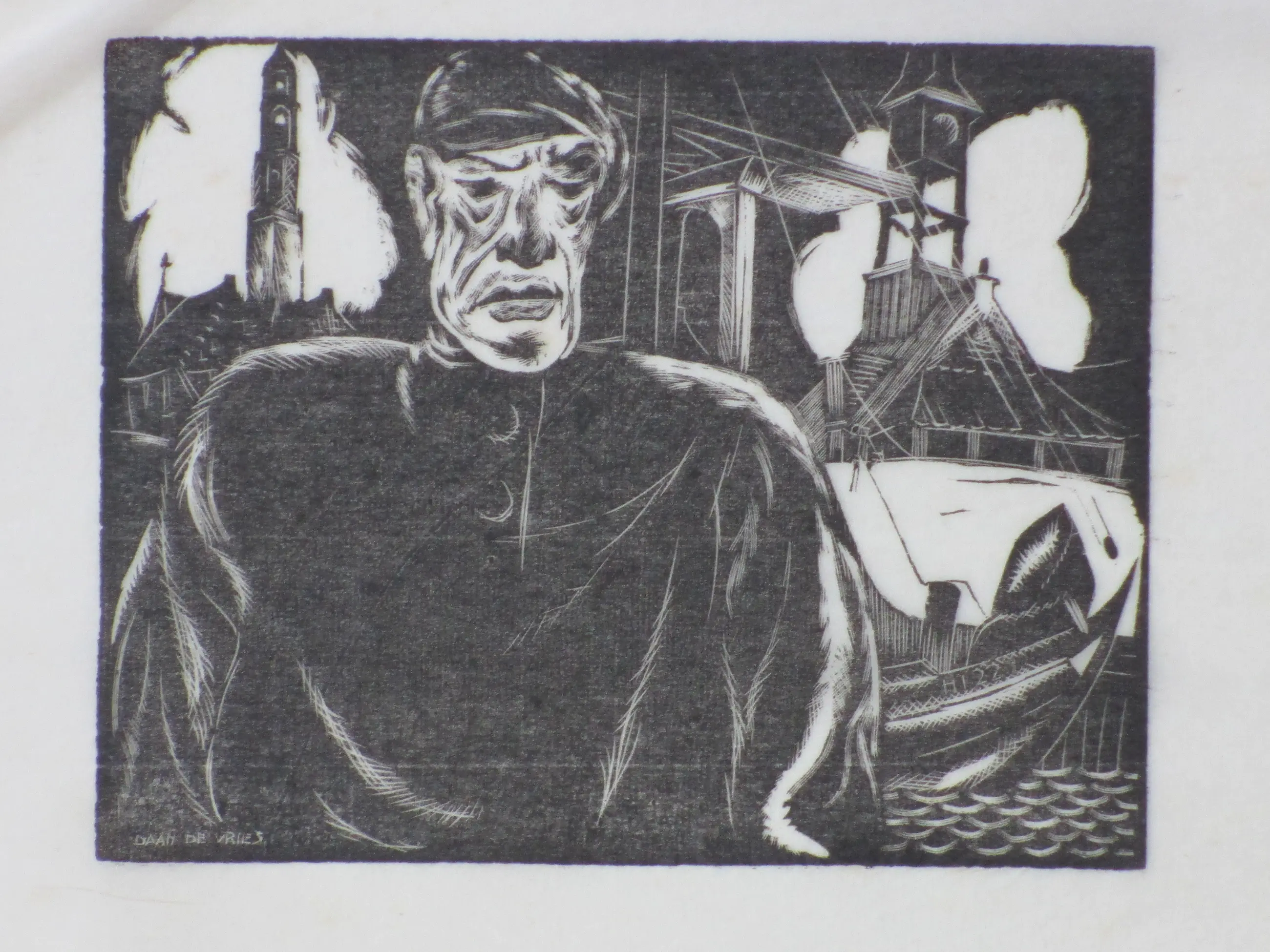 Houtsnede door Daan de Vries Voorstelling van de haven van Hindeloopen, met visser, boot en stadsbeeld Losbladig, beeldmaat 10.5x13, bladmaat 14x22 Gesigneerd l.o. in de druk: 'Daan de Vries' Authenticiteit volledig gegarandeerd