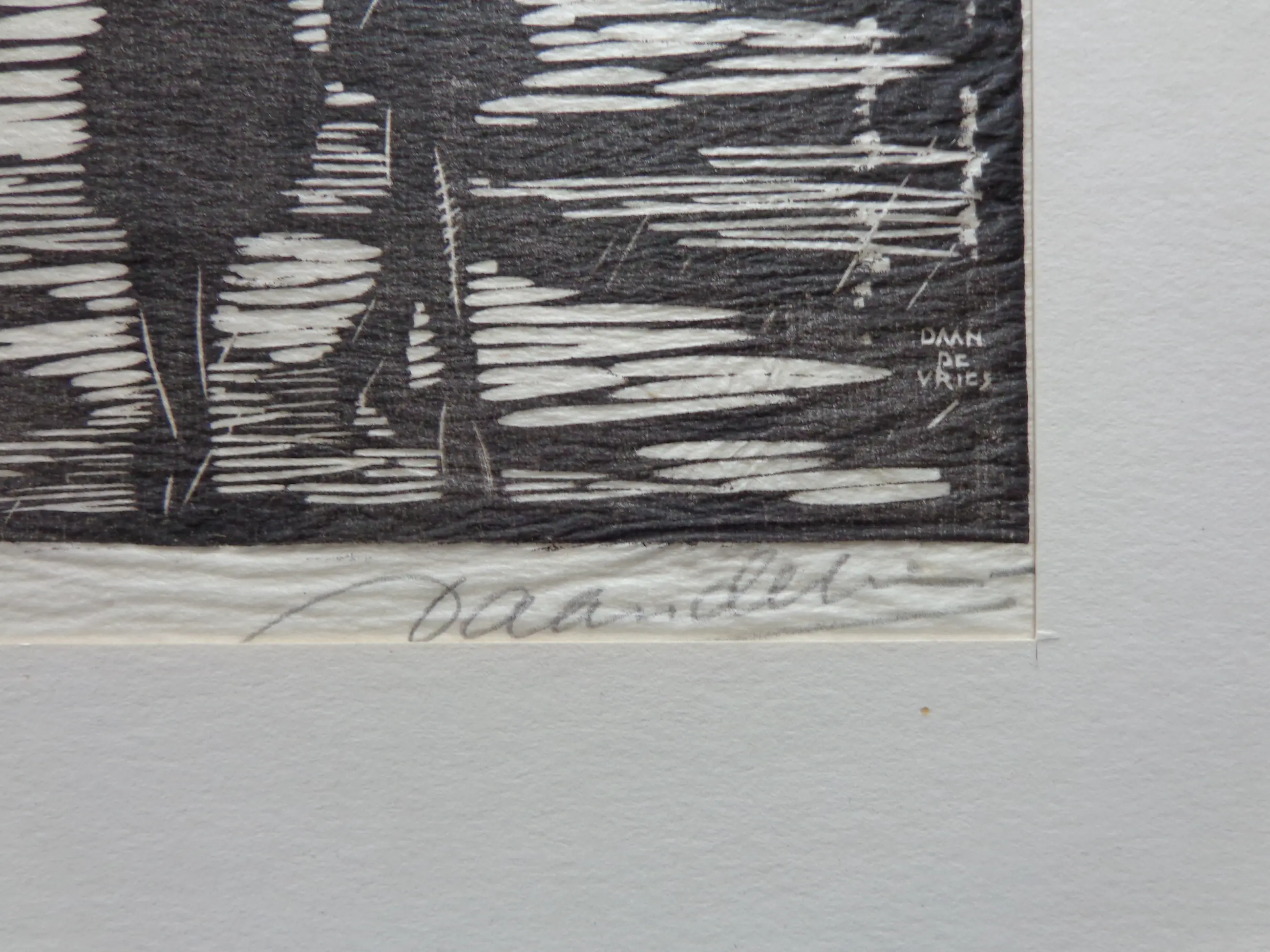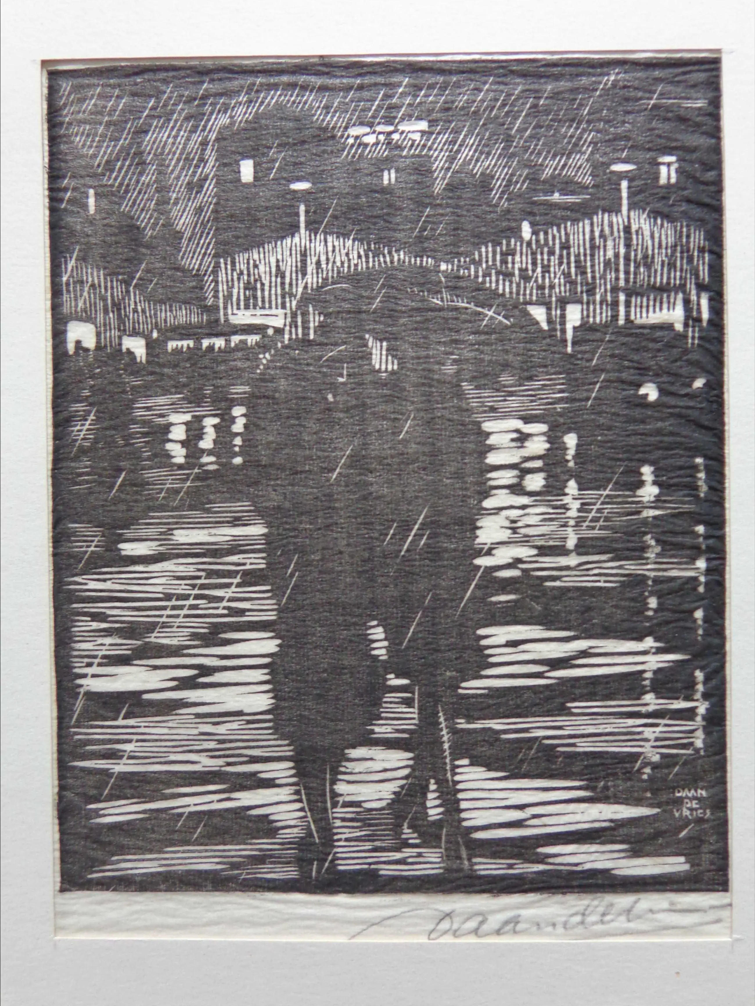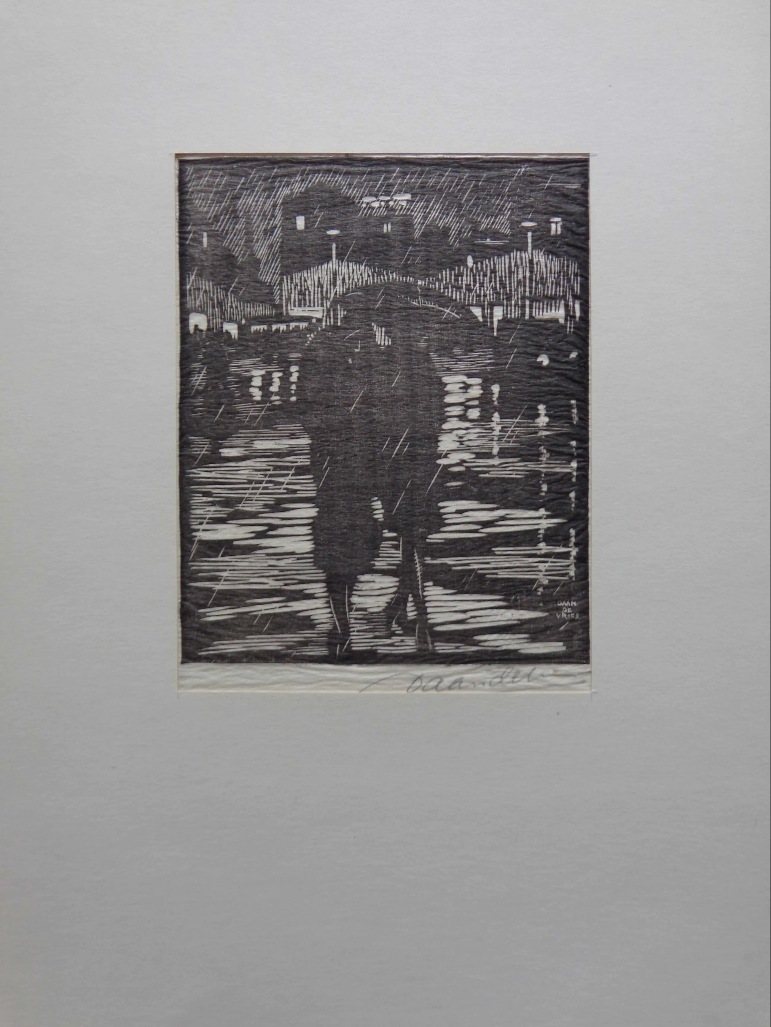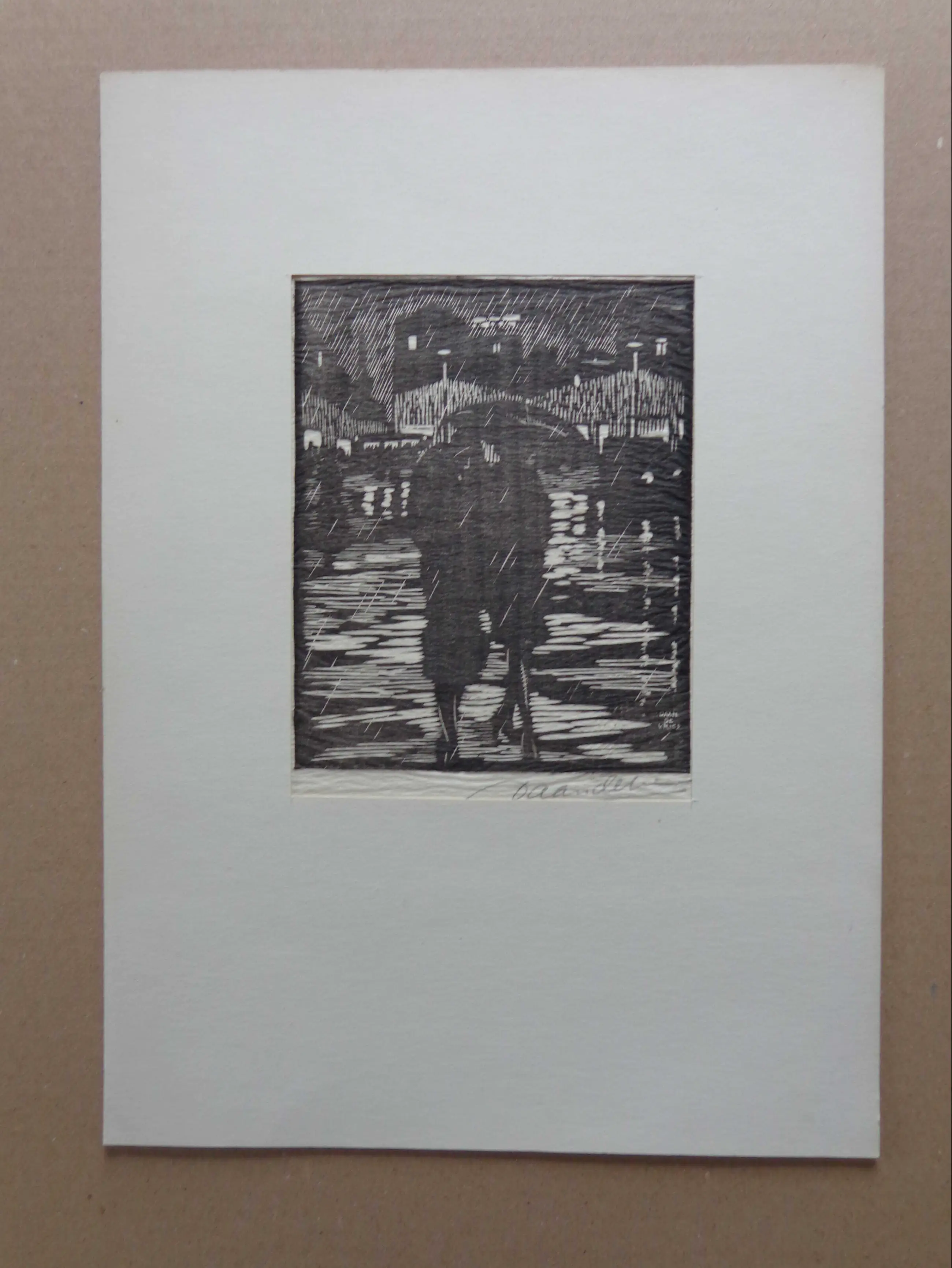 1. Wandelend koppel in de regen. Zwart-wit houtsnede op Chinees papier. Gesigneerd met potlood + extra signatuur in de plaat. Geen nummering. Blad: 17x13cm. Passe-partout: 35x25cm. Proper blad.