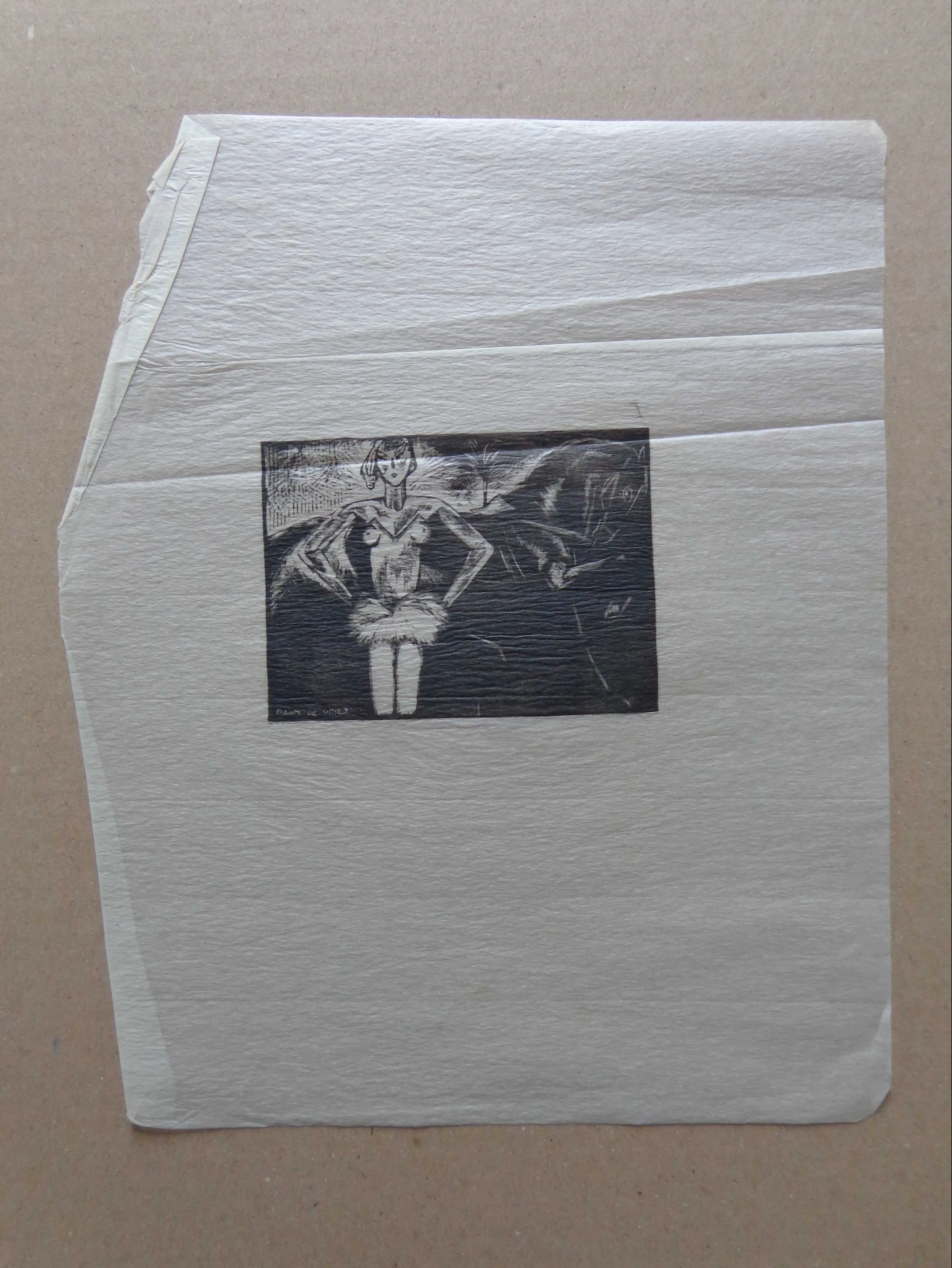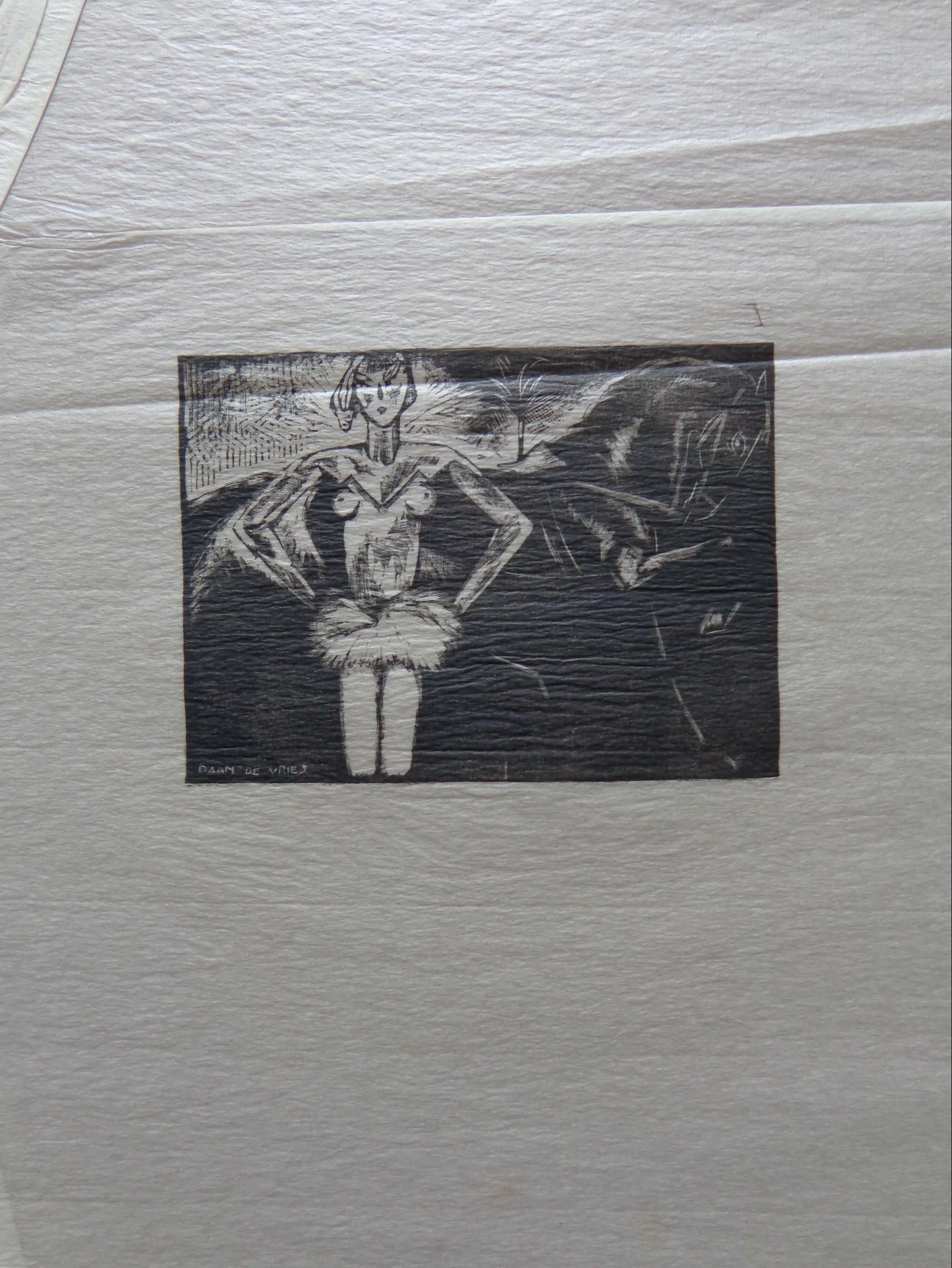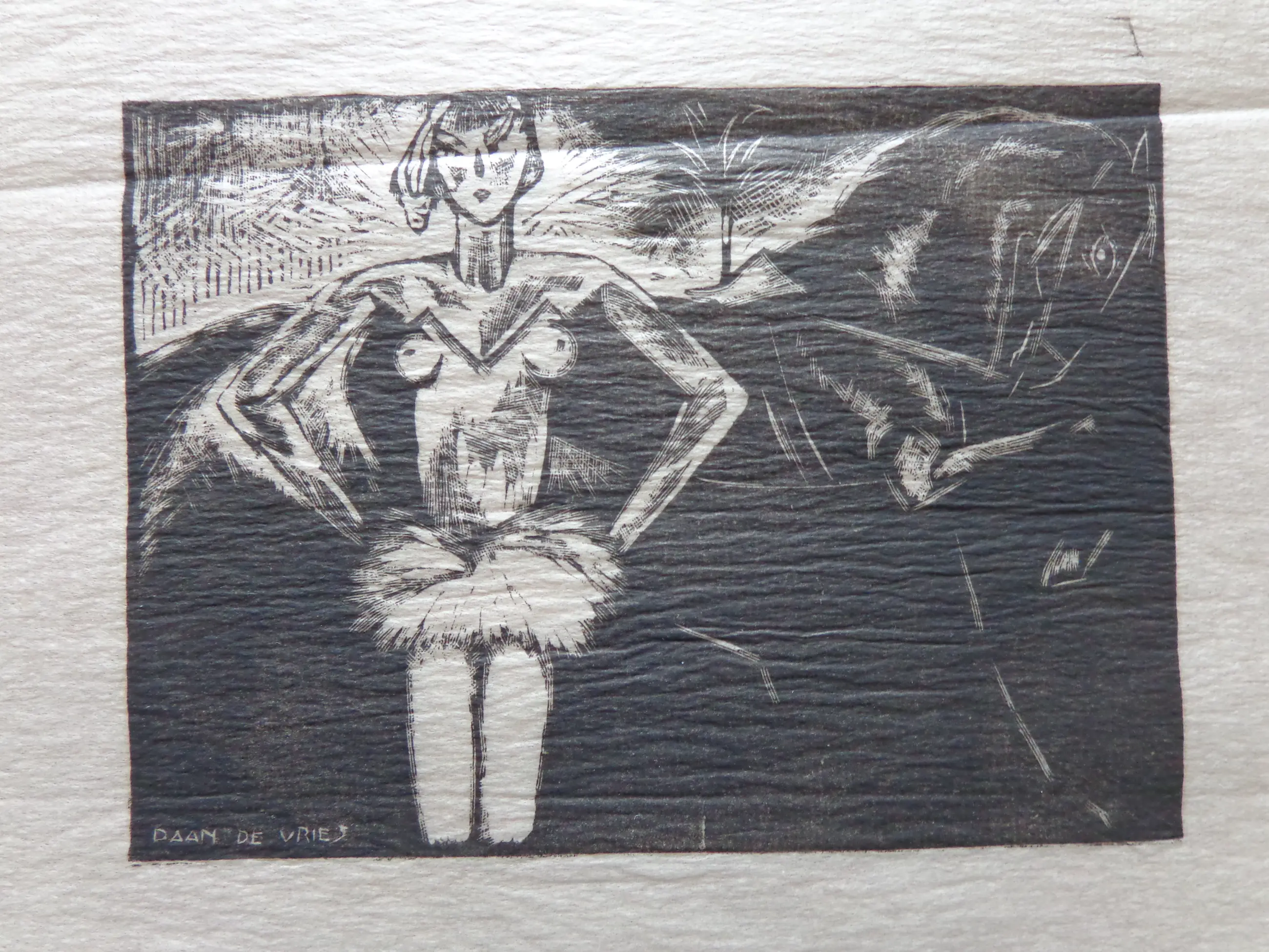 3. Circusartieste. Zwart-wit houtsnede op Chinees papier. Signatuur in de plaat. Geen nummering. Blad: 27x22cm. Proper blad. Horizontale vouw.