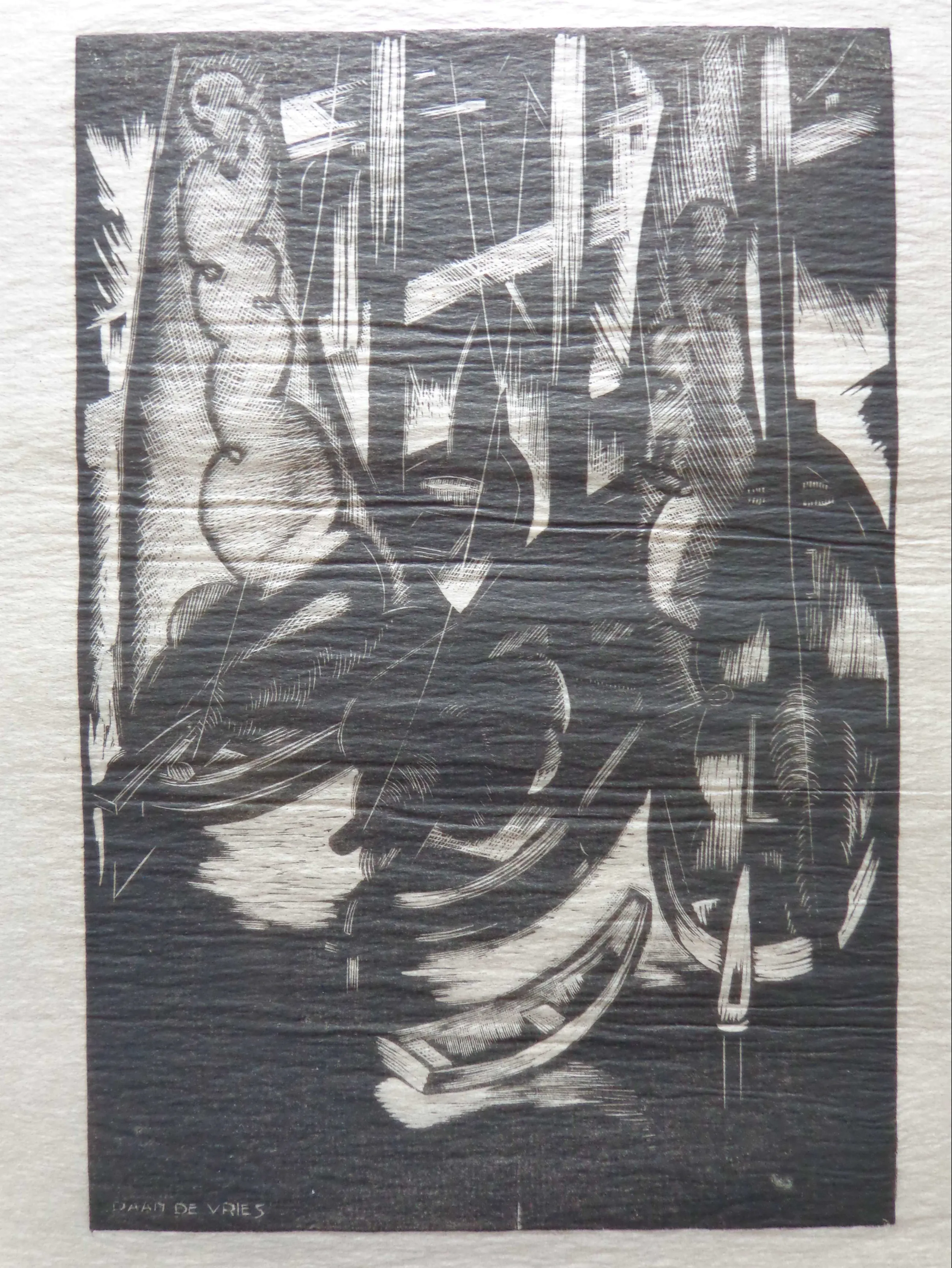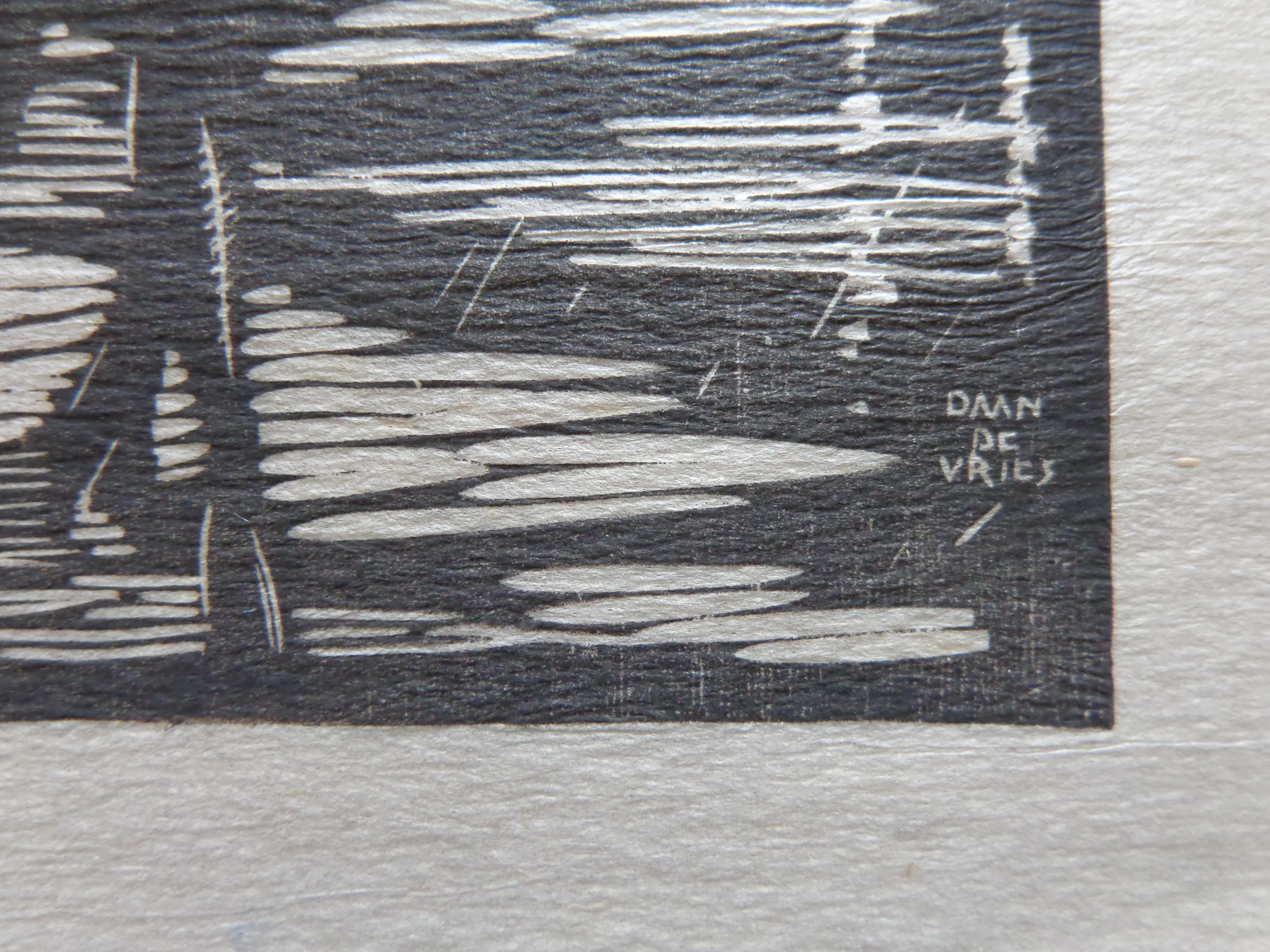 3. Zeilschepen. Zwart-wit houtsnede op Chinees papier. Signatuur in de plaat. Geen nummering. Blad: 27x22cm. Proper blad. Hoek rechts boven.