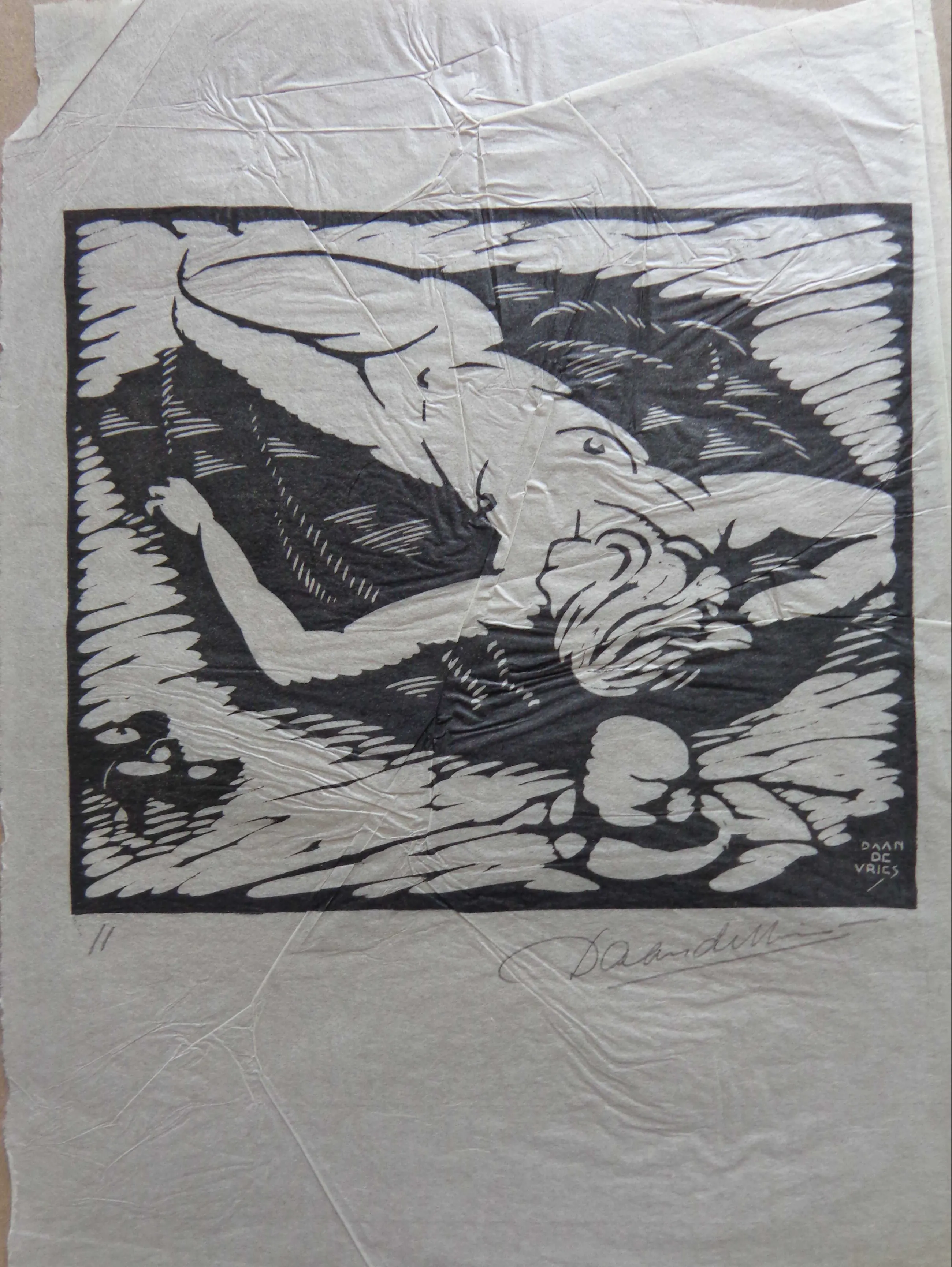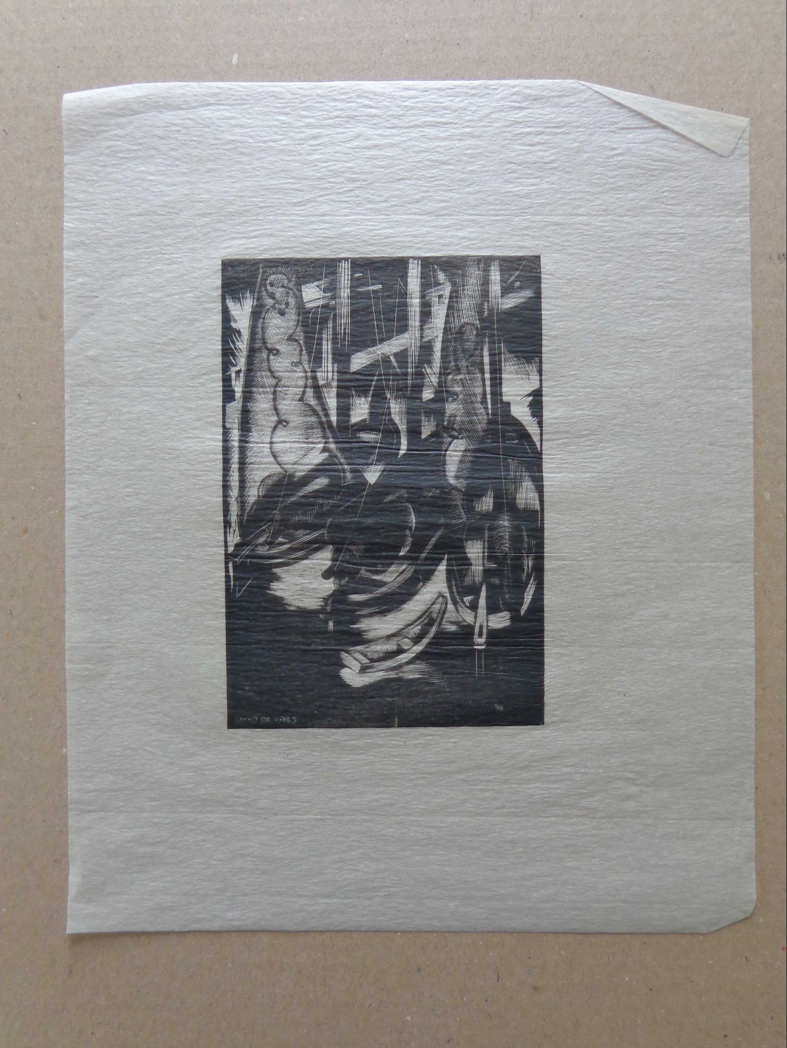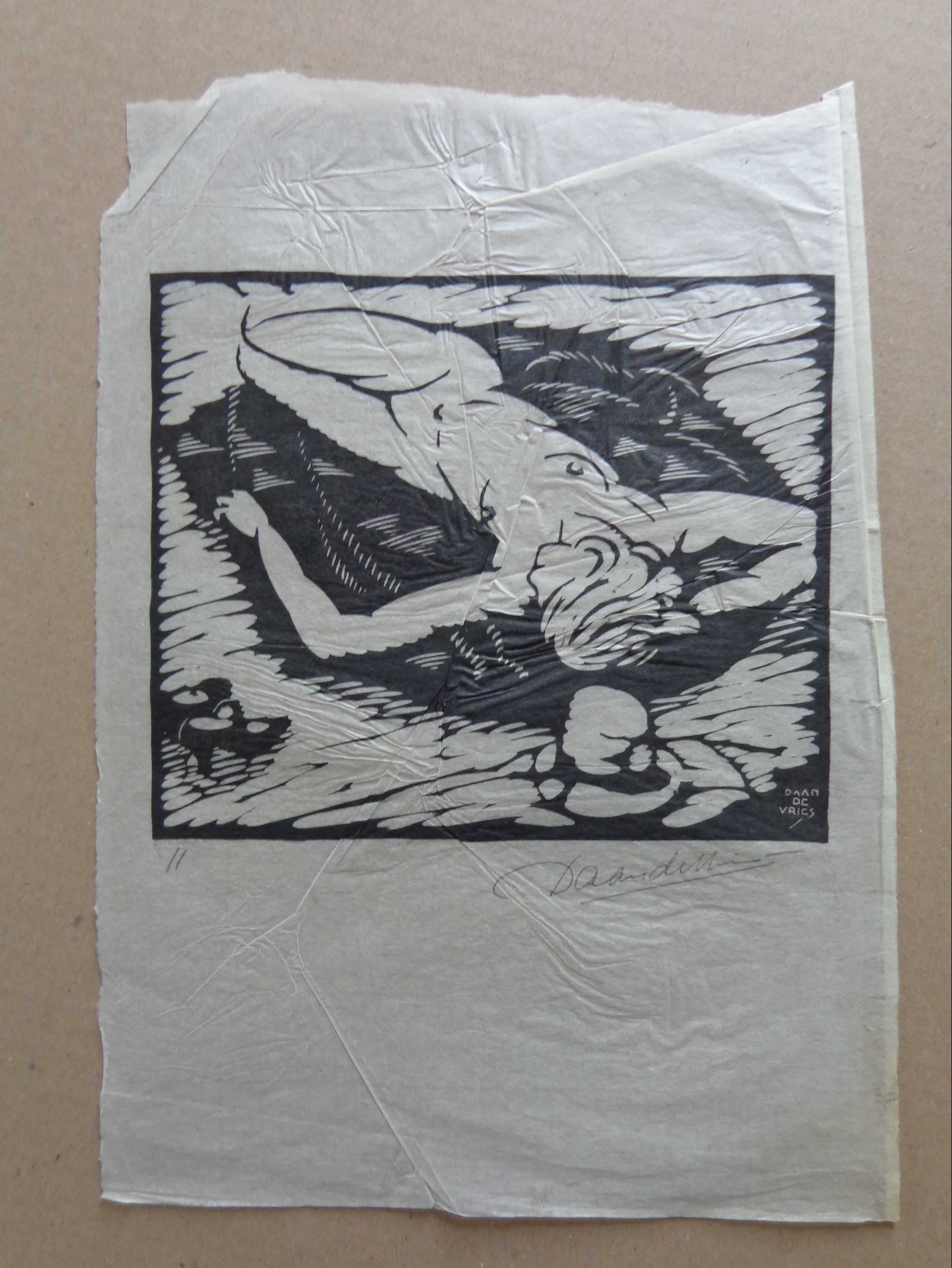 1. Liggende naakte vrouw (Art-Deco Stijl). Zwart-wit houtsnede op Chinees papier. Gesigneerd met potlood + extra signatuur in de plaat. Geen nummering. Blad: 31x22cm. Proper blad. Erg gevouwen.