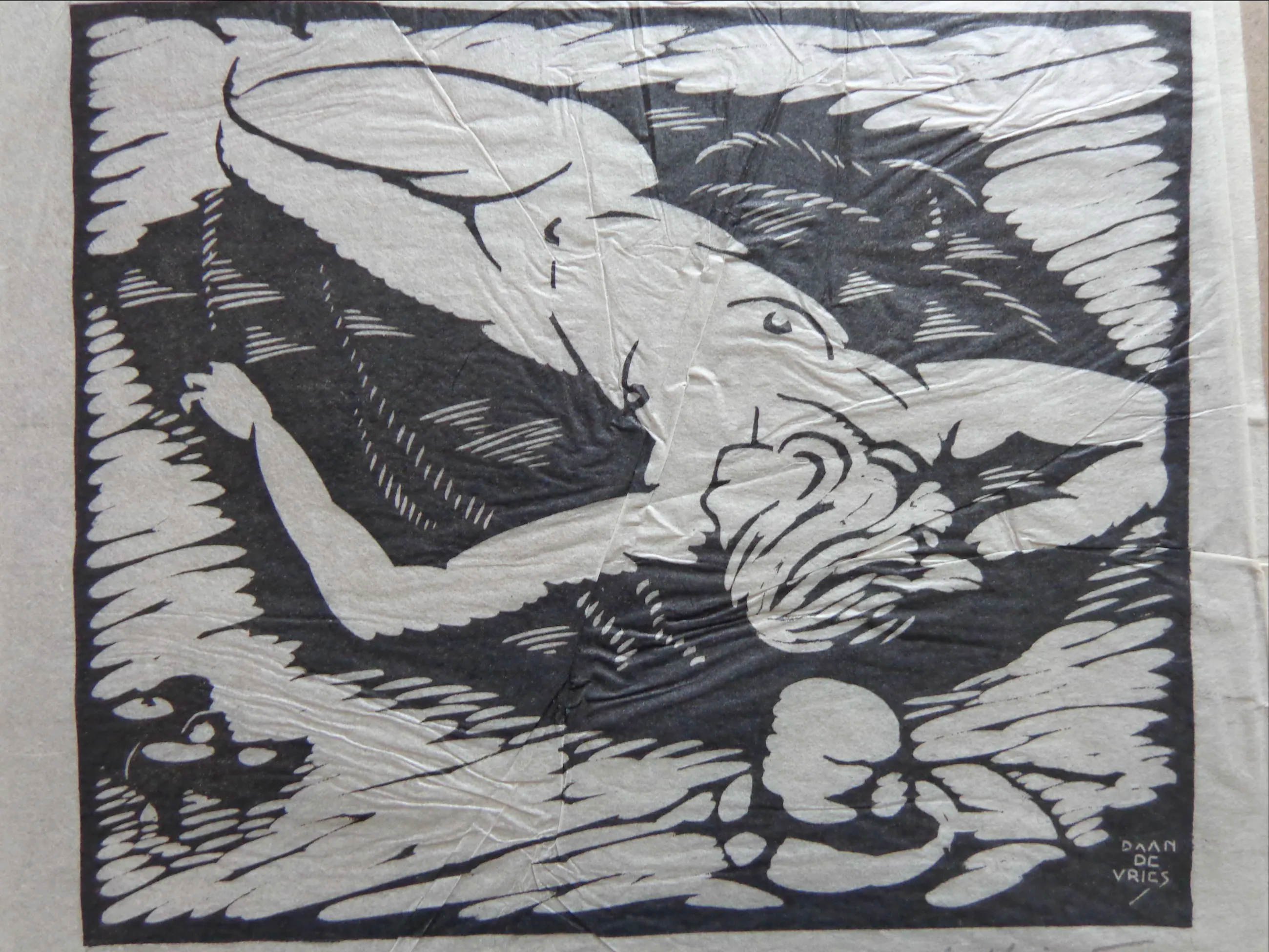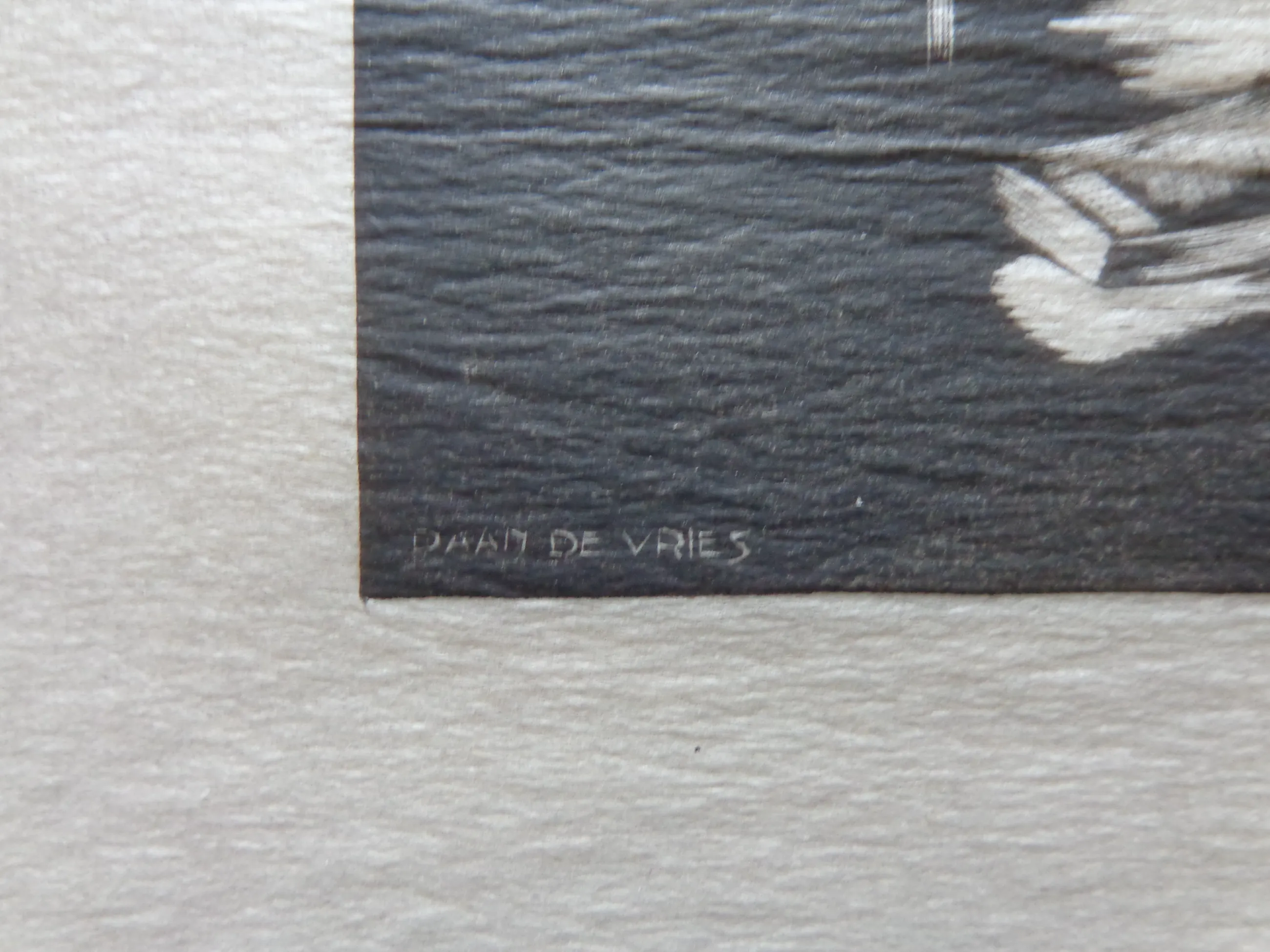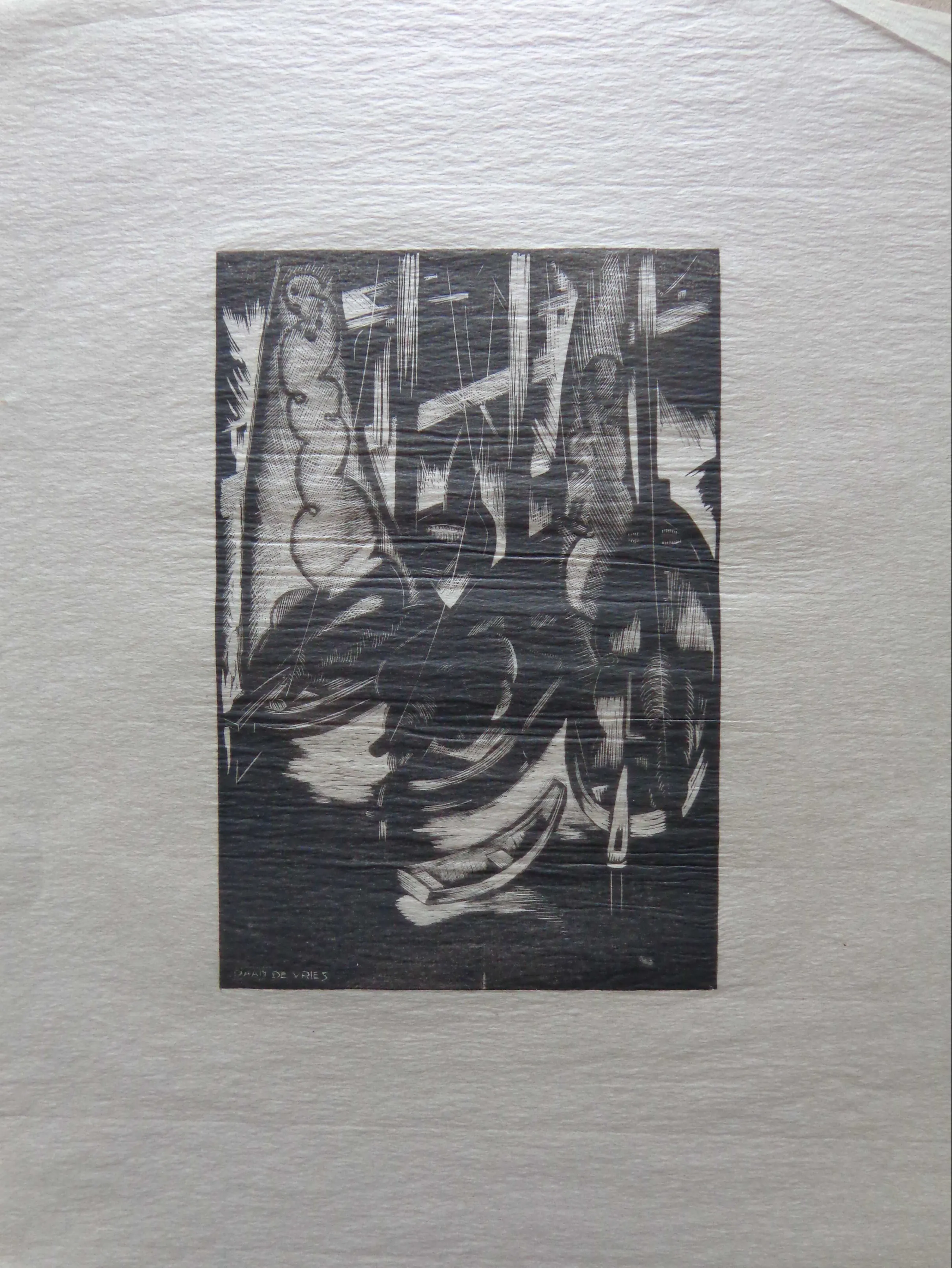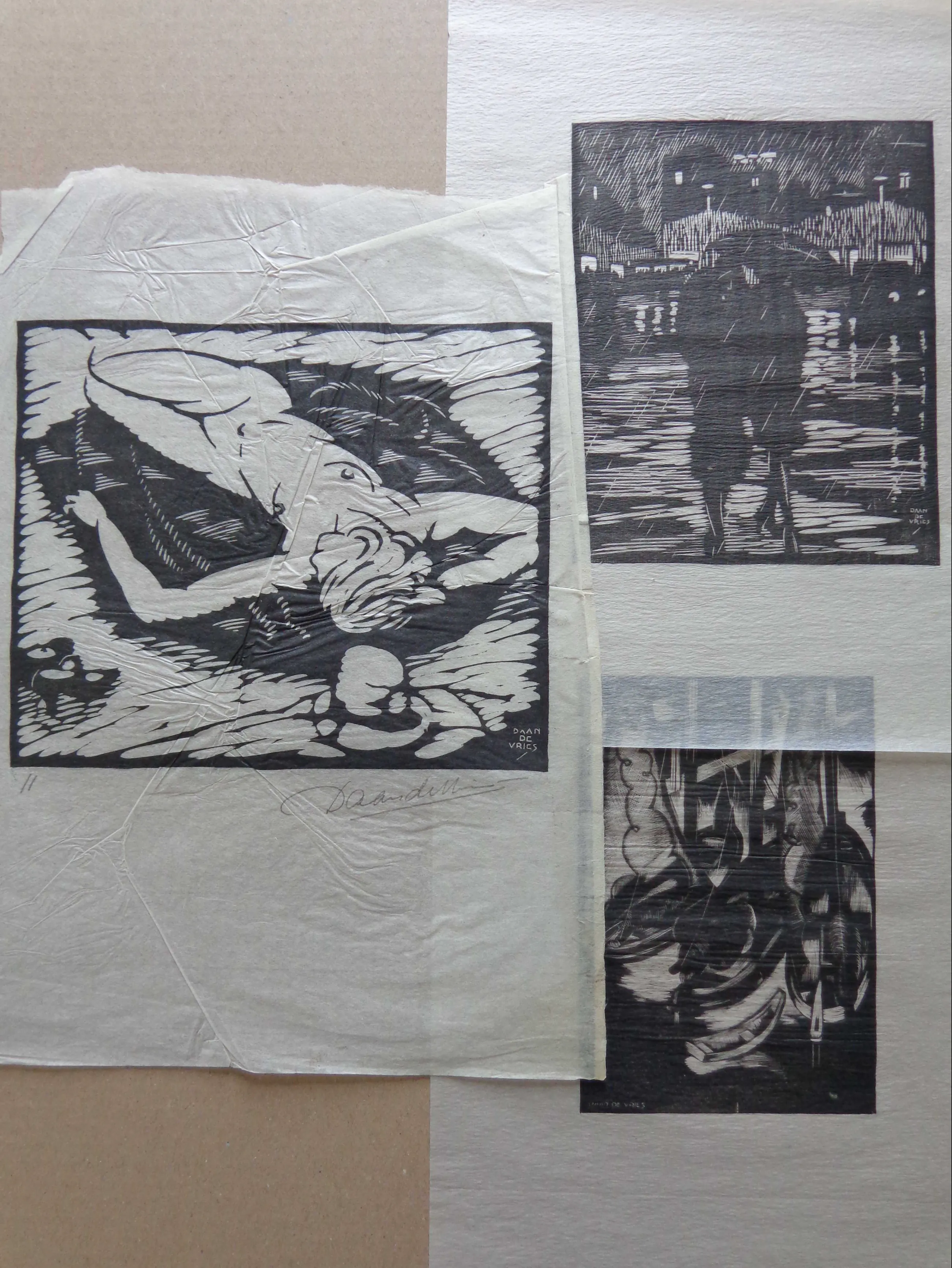 1. Liggende naakte vrouw (Art-Deco Stijl). Zwart-wit houtsnede op Chinees papier. Gesigneerd met potlood + extra signatuur in de plaat. Geen nummering. Blad: 31x22cm. Proper blad. Erg gevouwen.